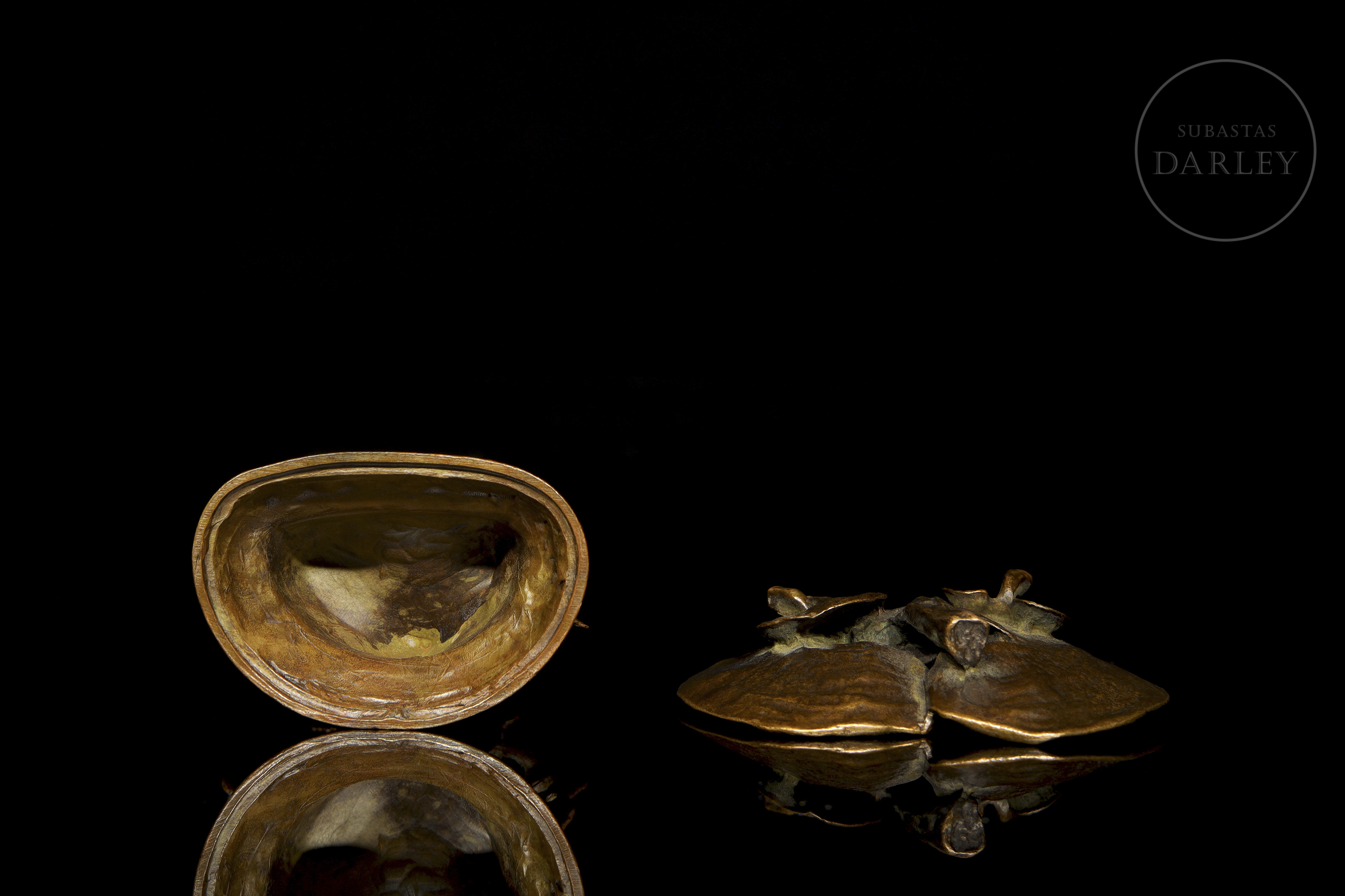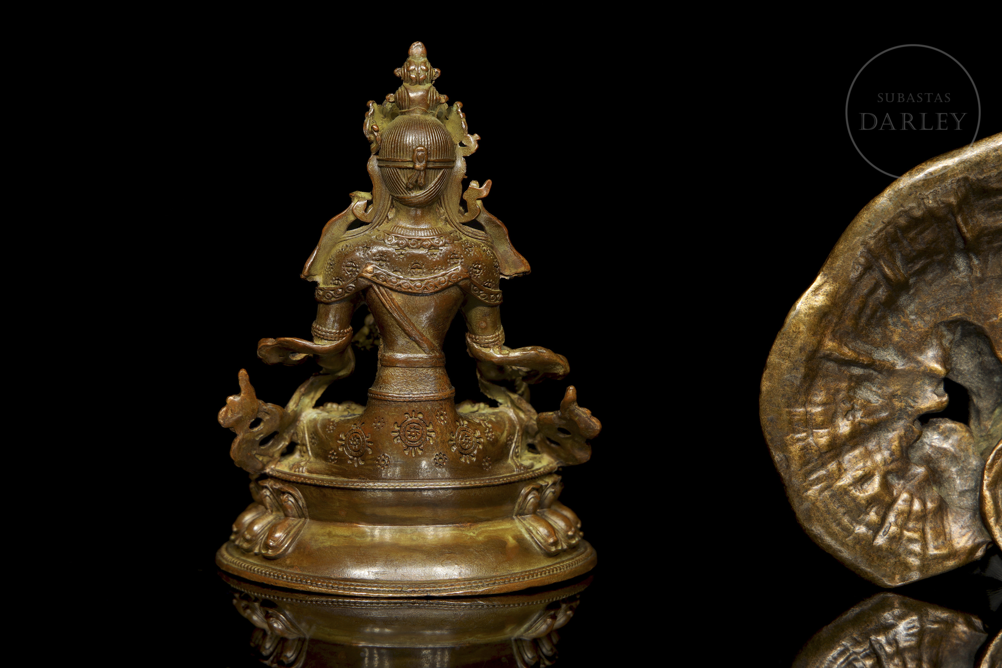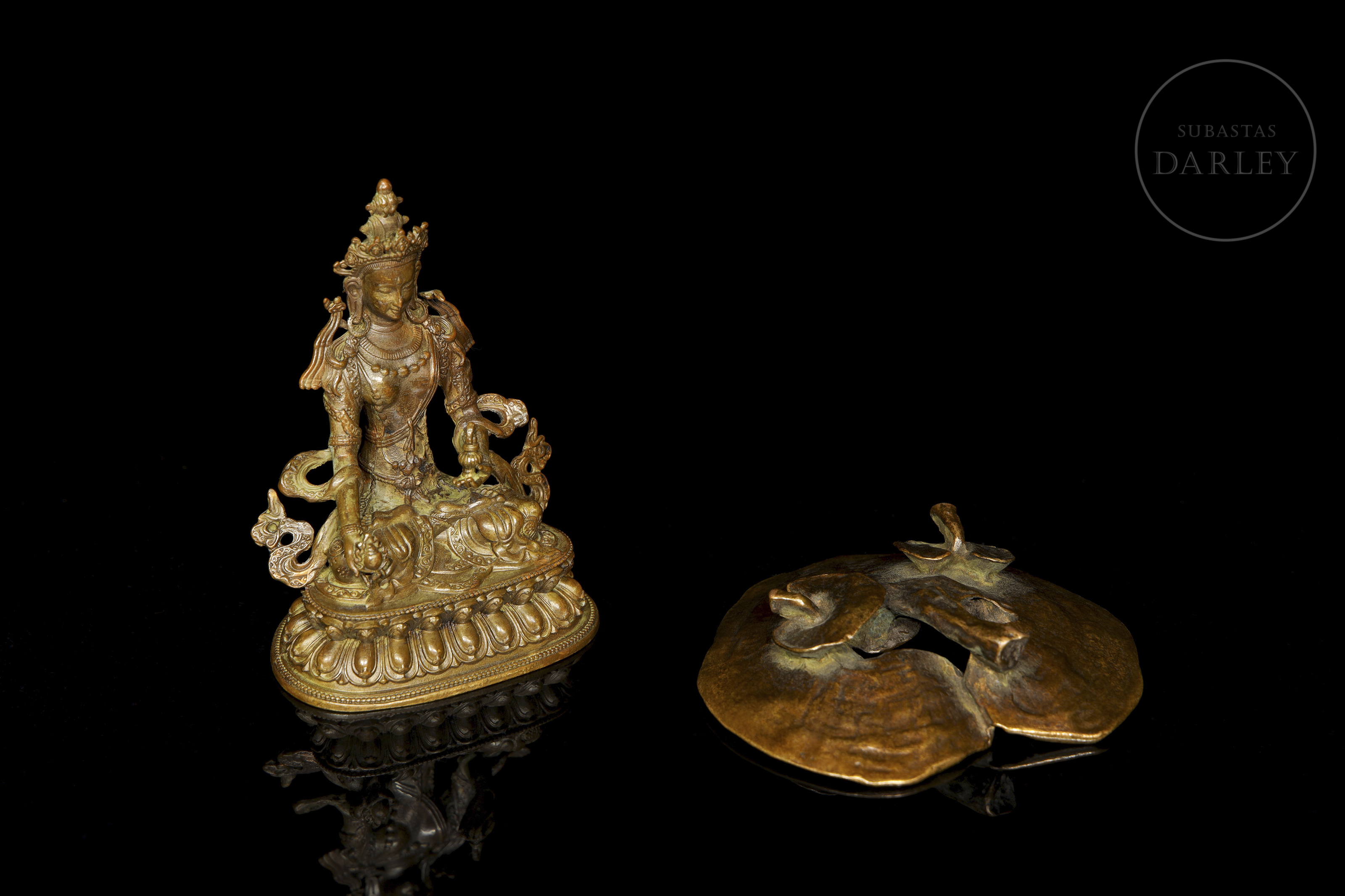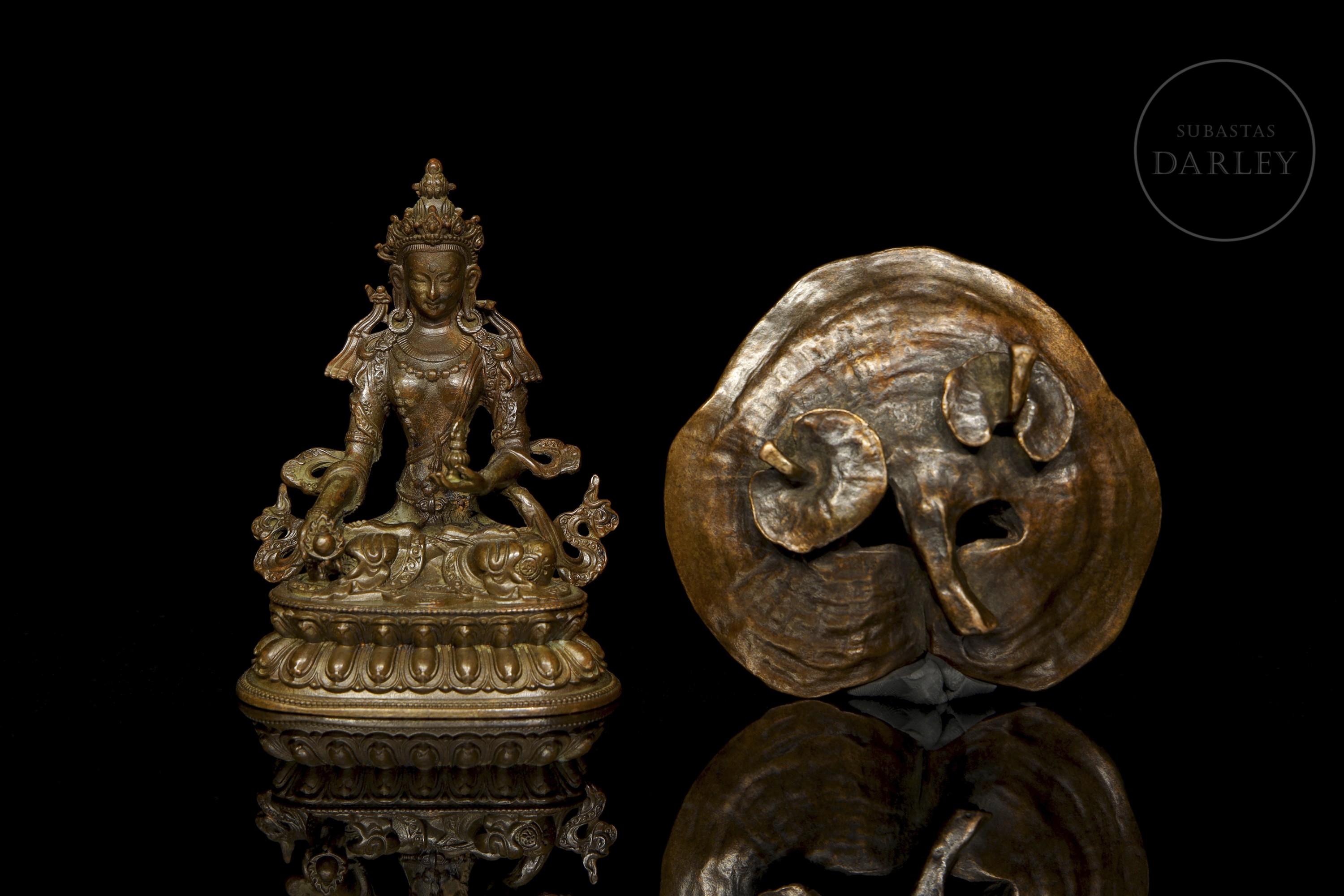 Dos figuras de bronce con pátina. La primera muestra la figura de una deidad, posiblemente "Tara" en posición sedente, con las manos en gesto de meditación (dhyana mudra). La segunda pieza es una escultura que representa un gran hongo Lingzhi junto a otros dos más pequeños brotando.