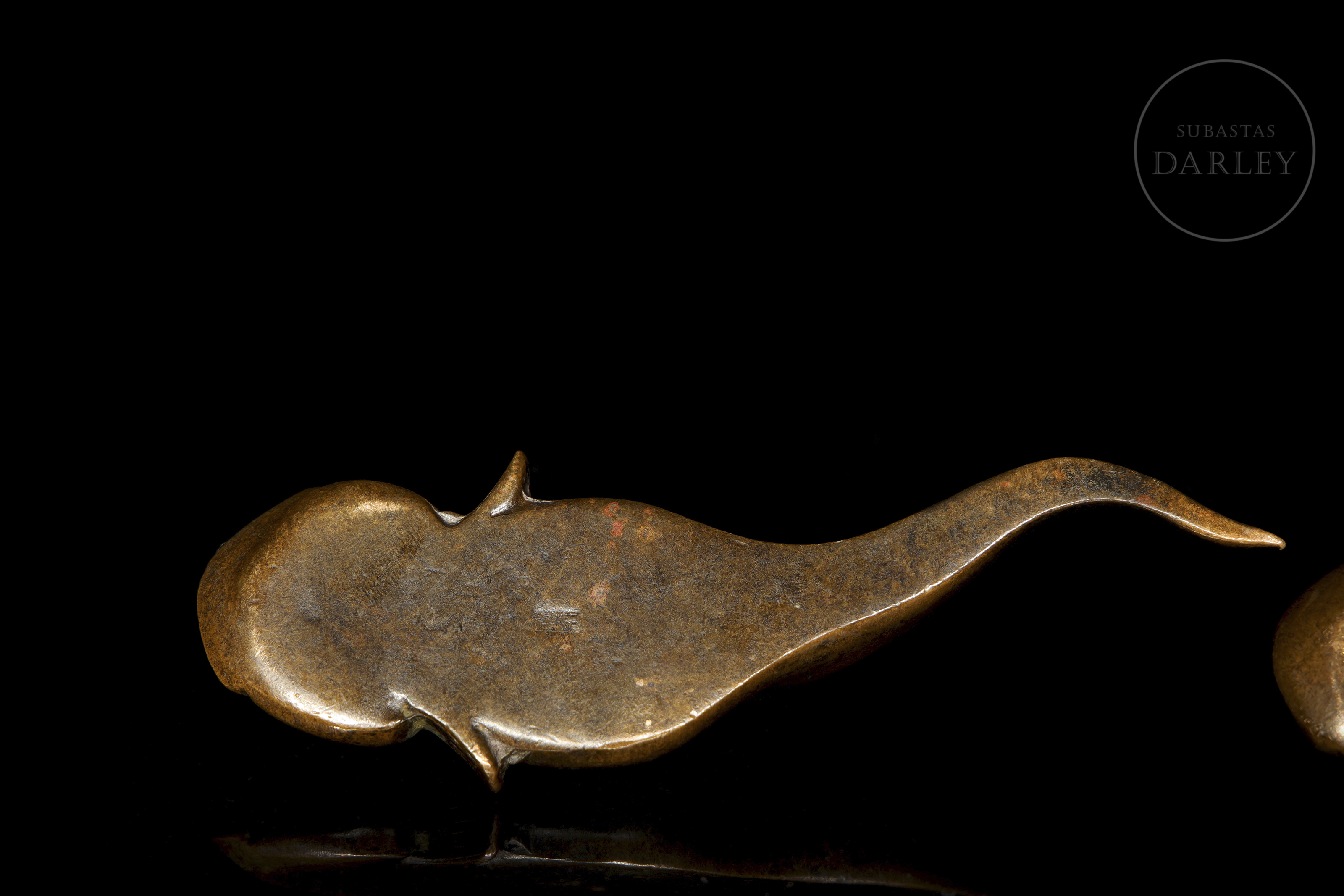 Pareja de esculturas de bronce que representan dos peces gato, con sus largos bigotes y cuerpos sinuosos. Las piezas presentan una pátina oscura. En la simbología asiática, el pez gato es símbolo de prosperidad.
