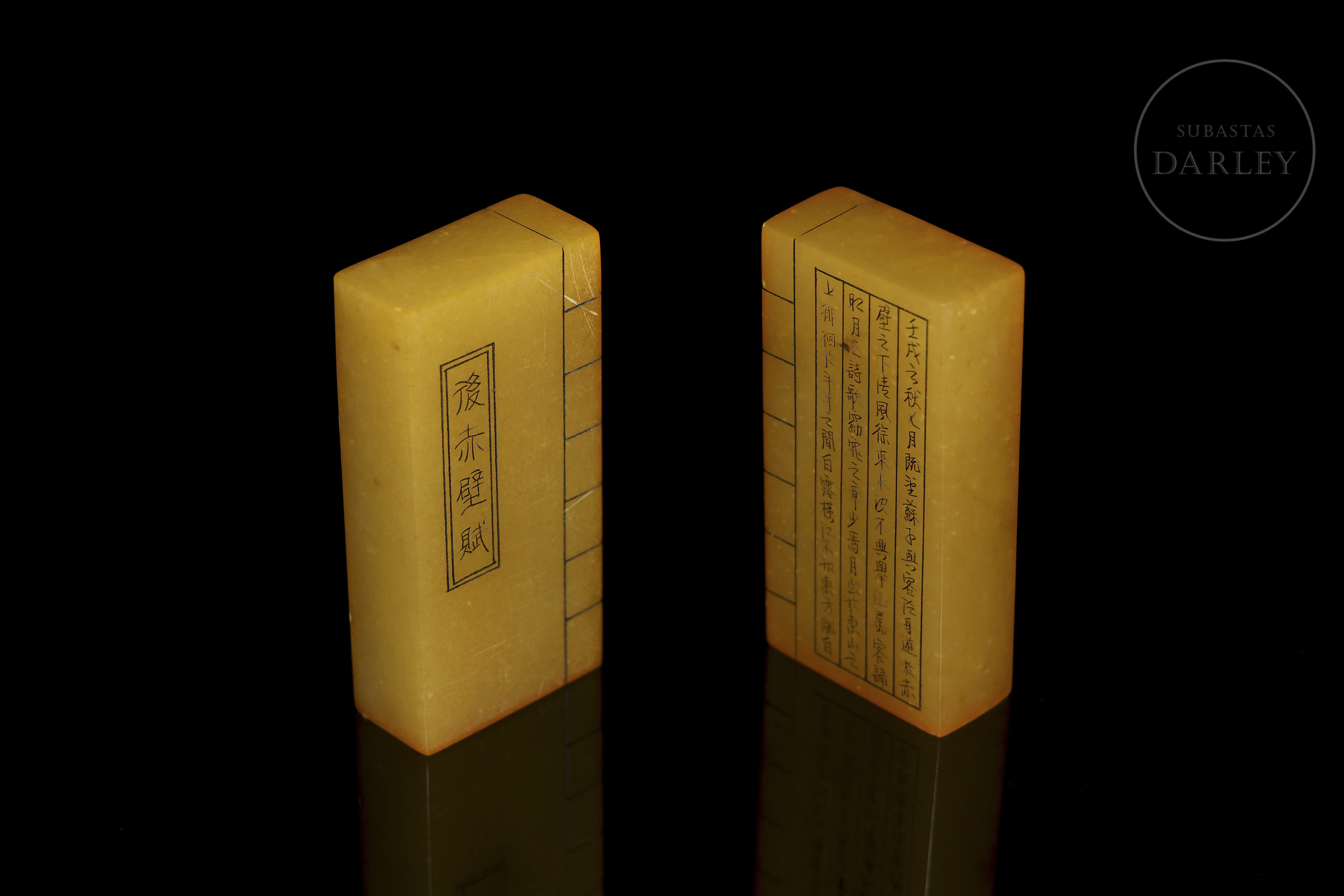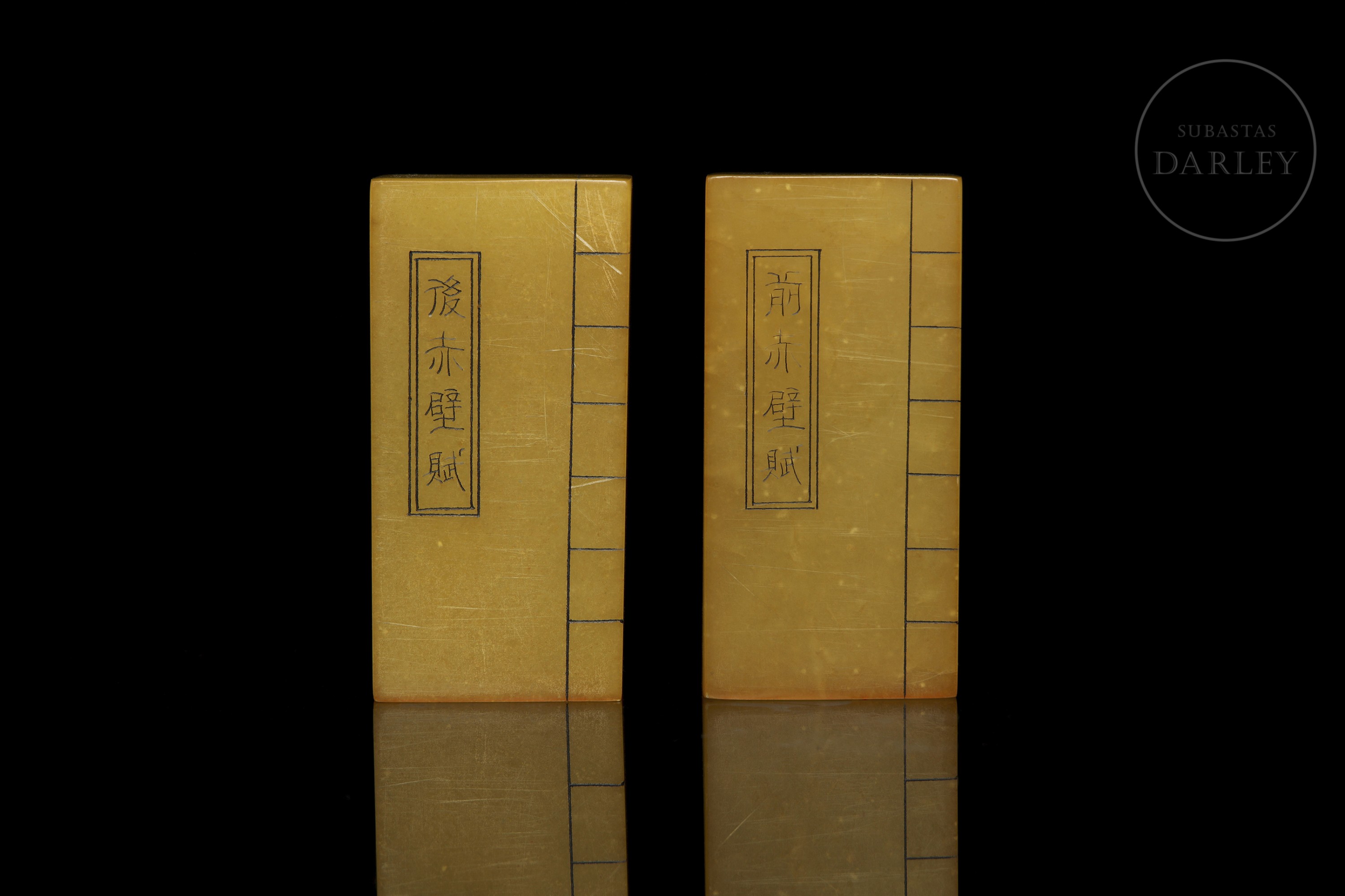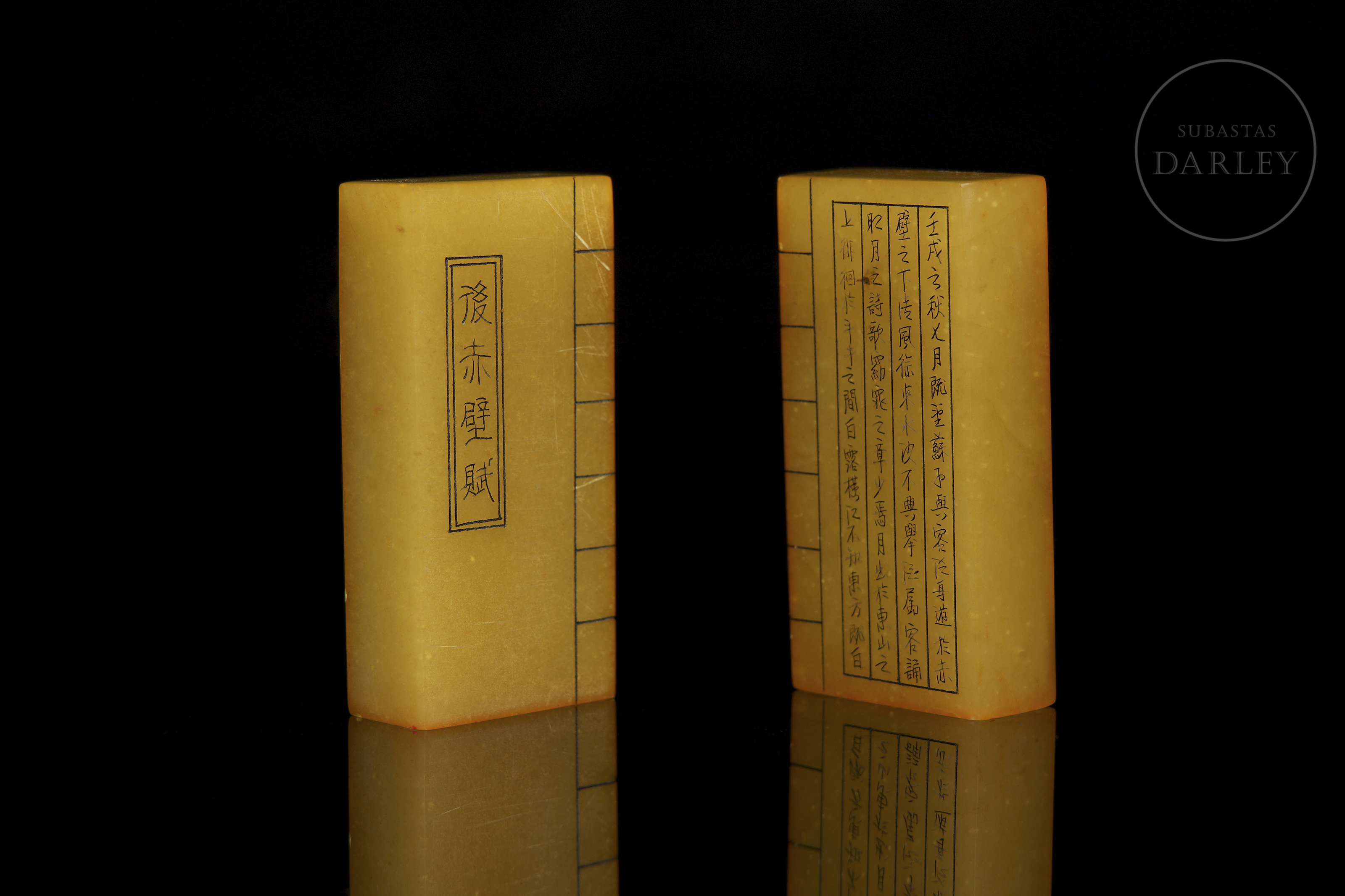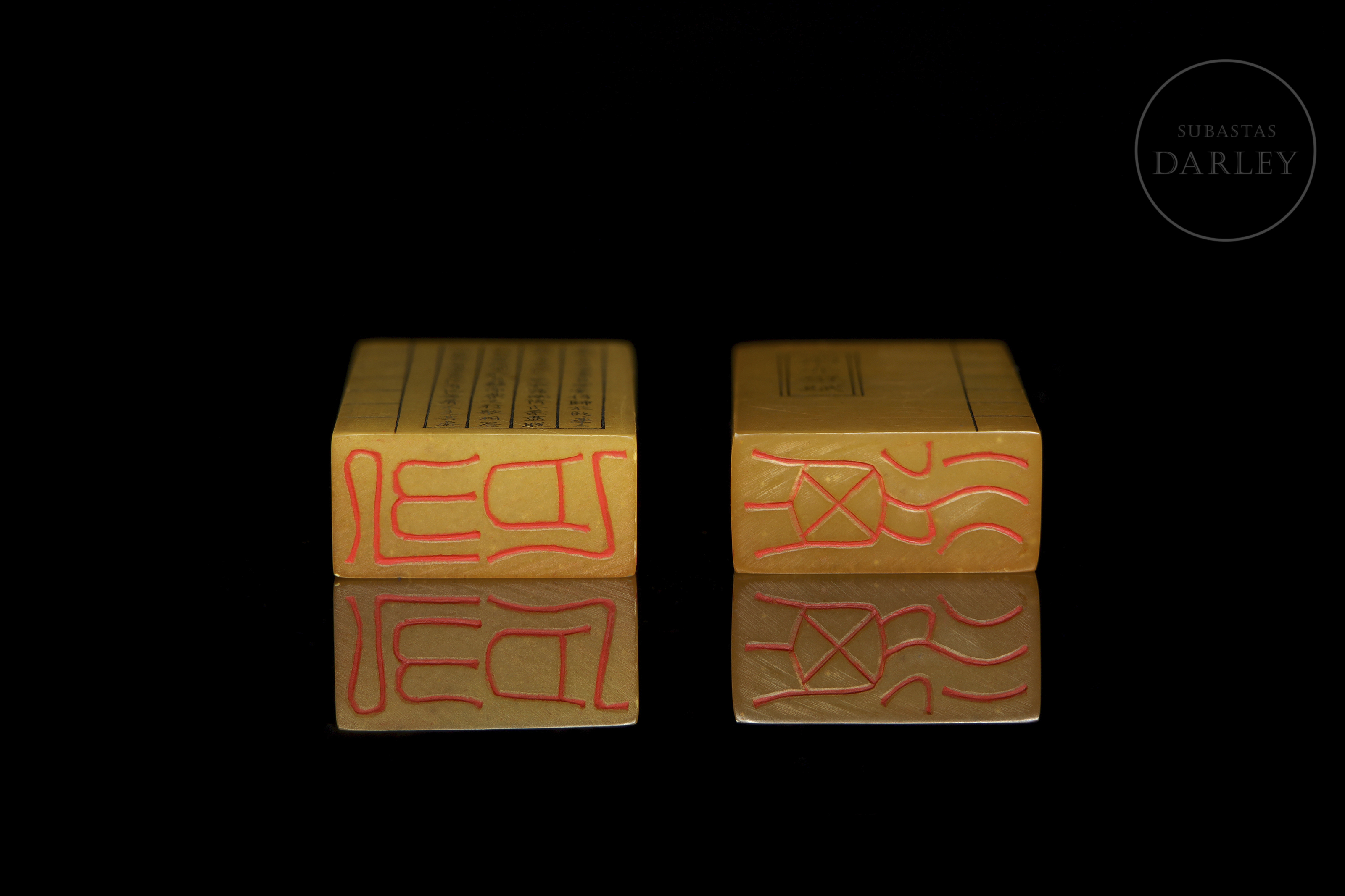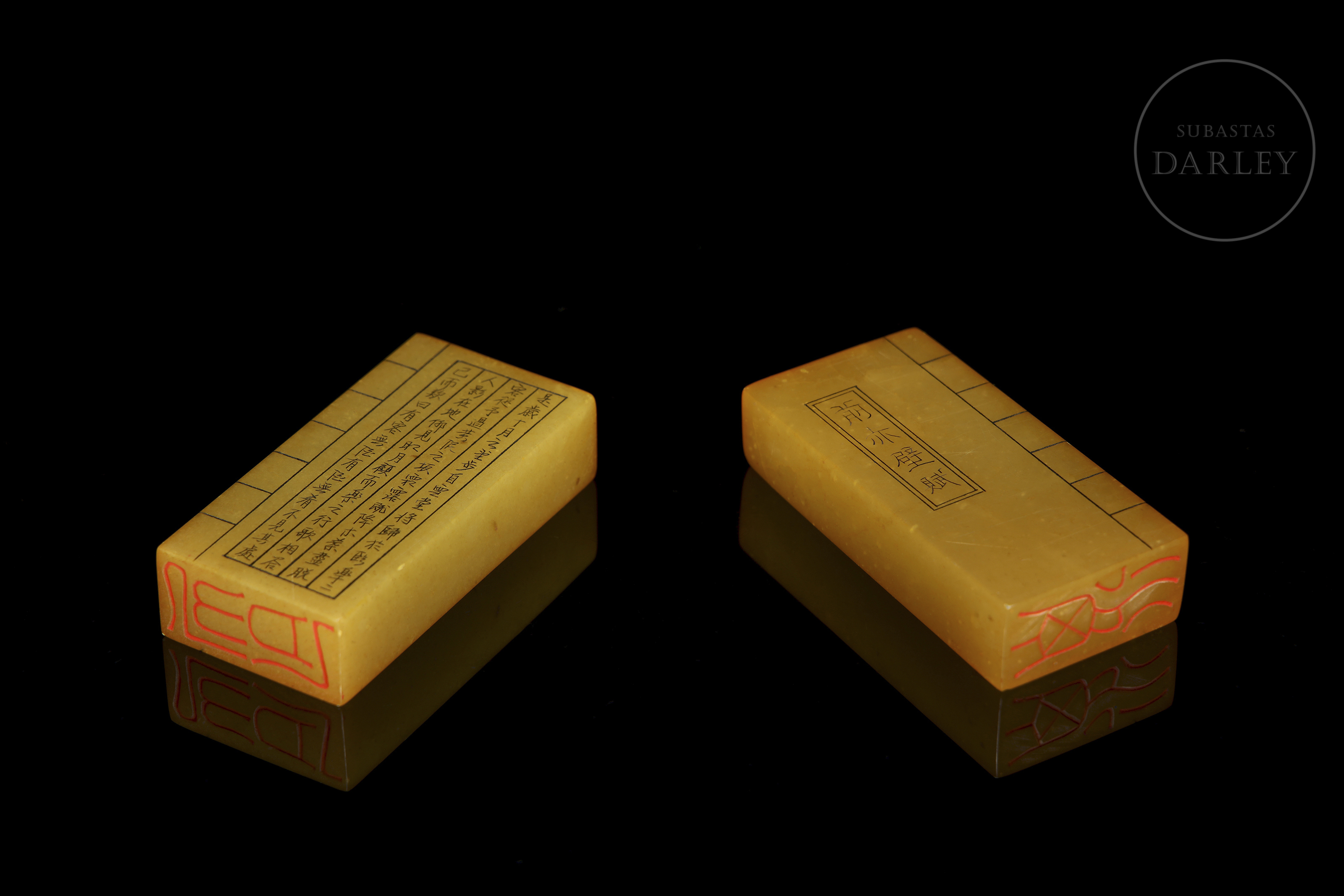 Pareja de sellos, de formato rectangular, cuyo diseño conjunto asemeja a un libro. Ambas están talladas en una piedra pulida de tono ámbar. Cada una presenta inscripciones caligráficas grabadas. Las bases de ambas piedras presentan un sello grabado con restos de lacre rojo.