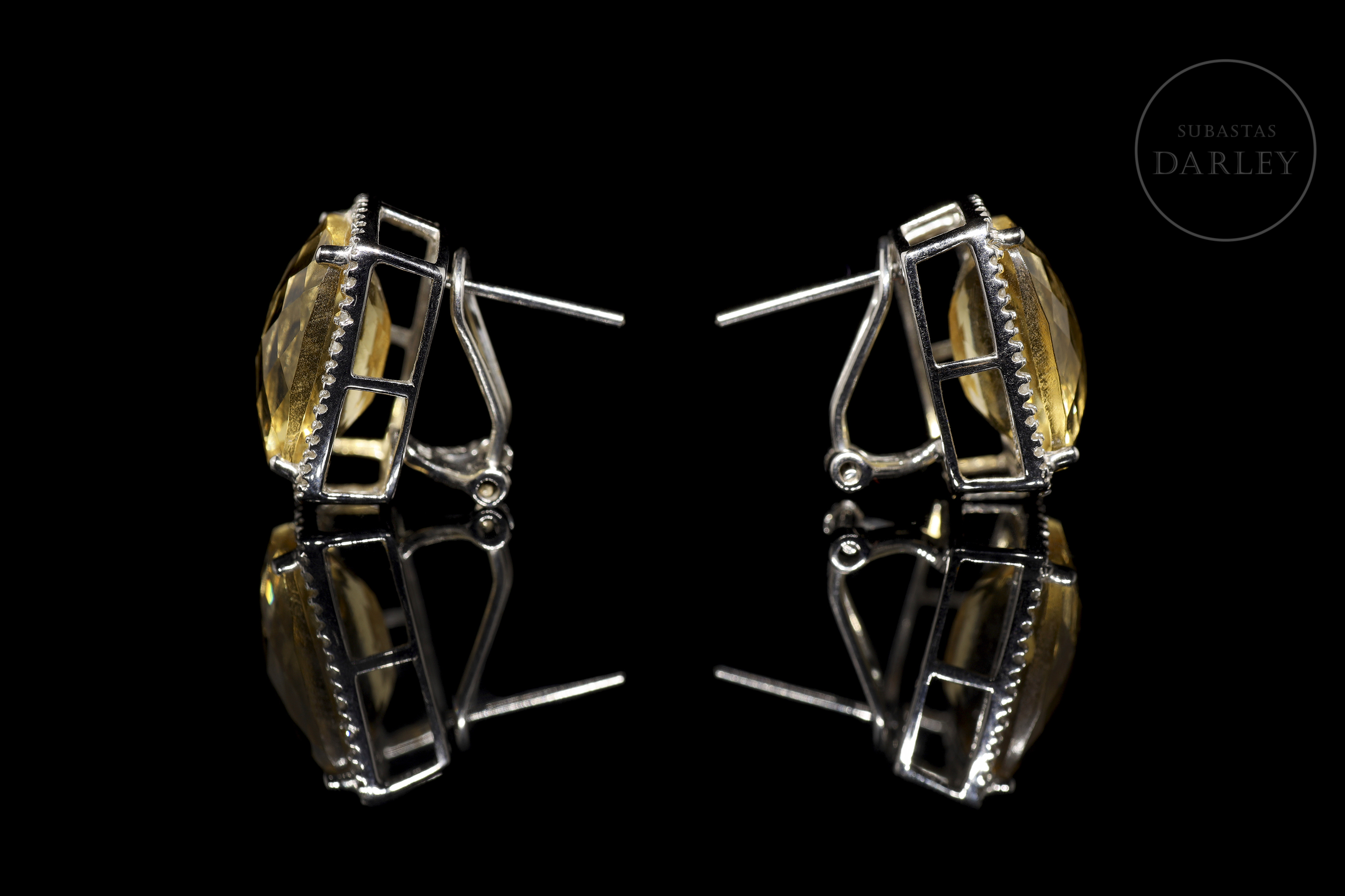 Pendientes en oro blanco 18 kt y cierre tipo pala Omega. Destacan un total de dos piezas de citrino, talla cojín, y un peso total de 12,16 ct. Se encuentra orlado por un bisel de diamantes, con un peso total de 0,15 ct, de talla brillante.