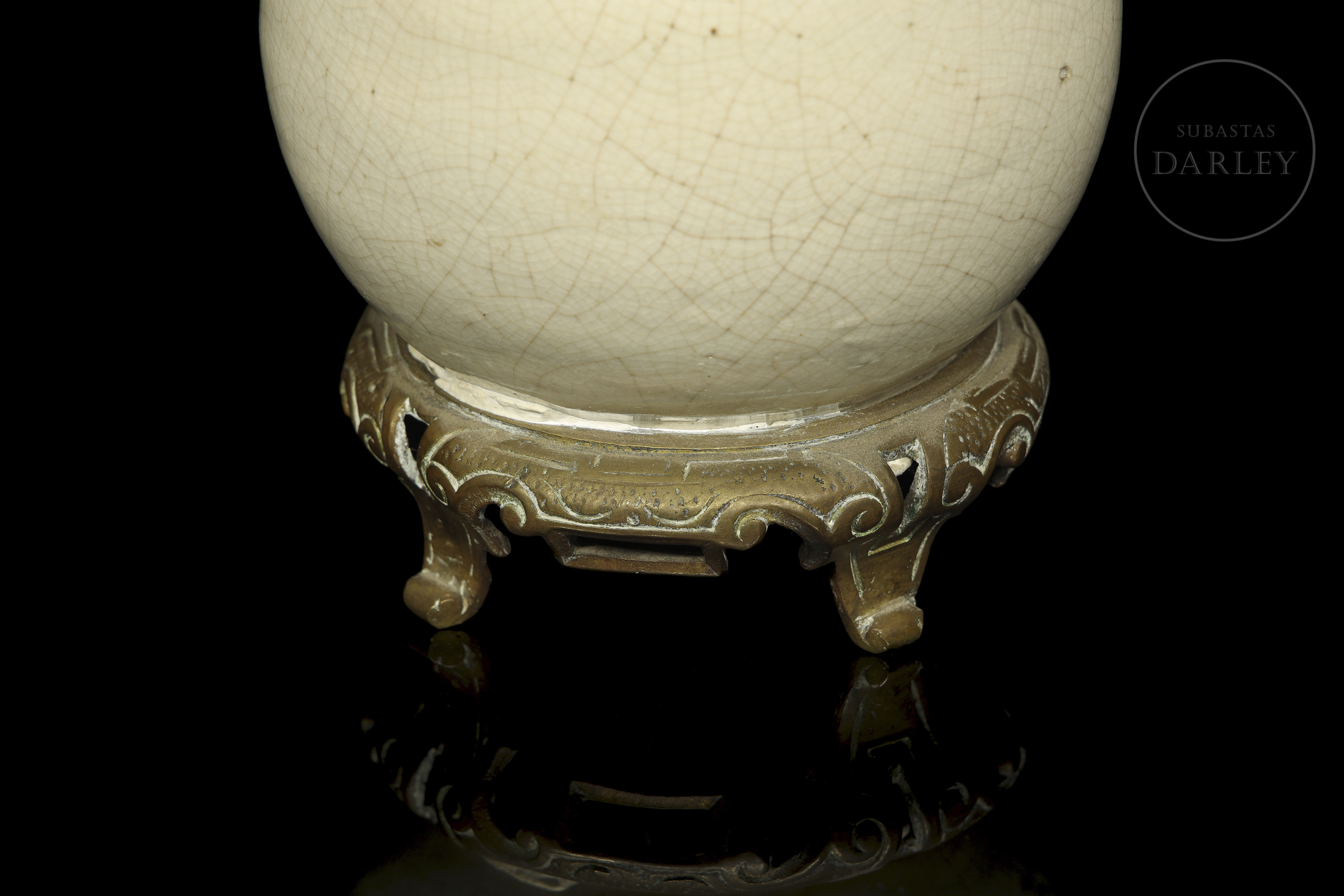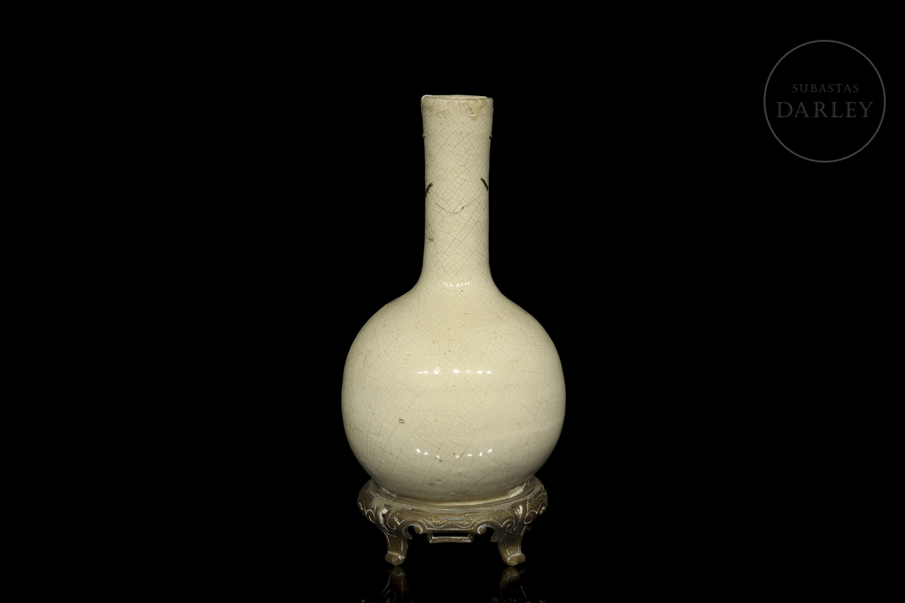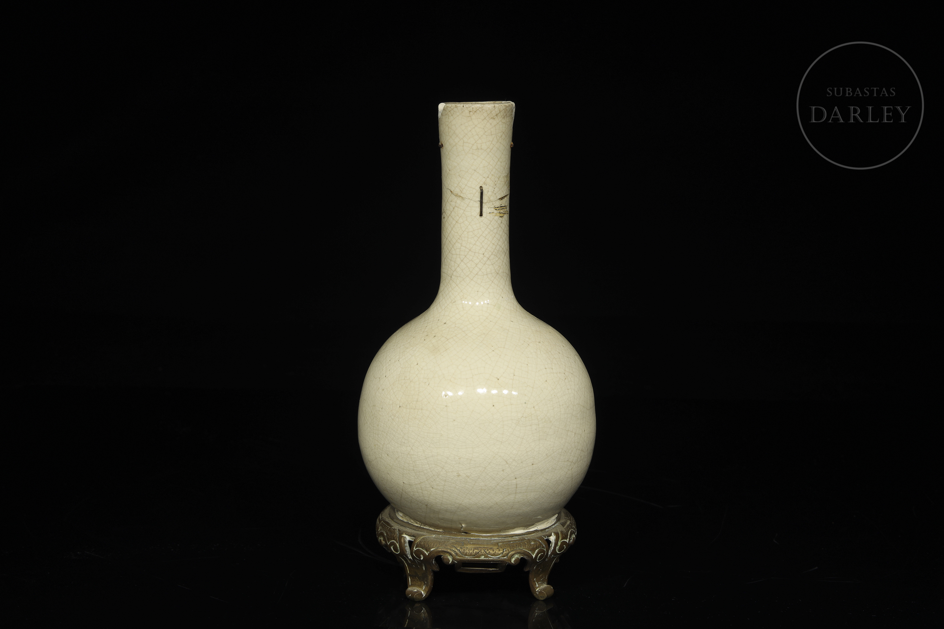 Jarrón de cerámica vidriada. Posee un pie de bronce añadido posteriormente, sobre el que se alza un cuerpo circular coronado por un alargado y estrecho cuello. Cubierta por un fino vidriado de tonalidad crema y un entramado de craqueladuras. Presenta restauraciones en cuello y base.