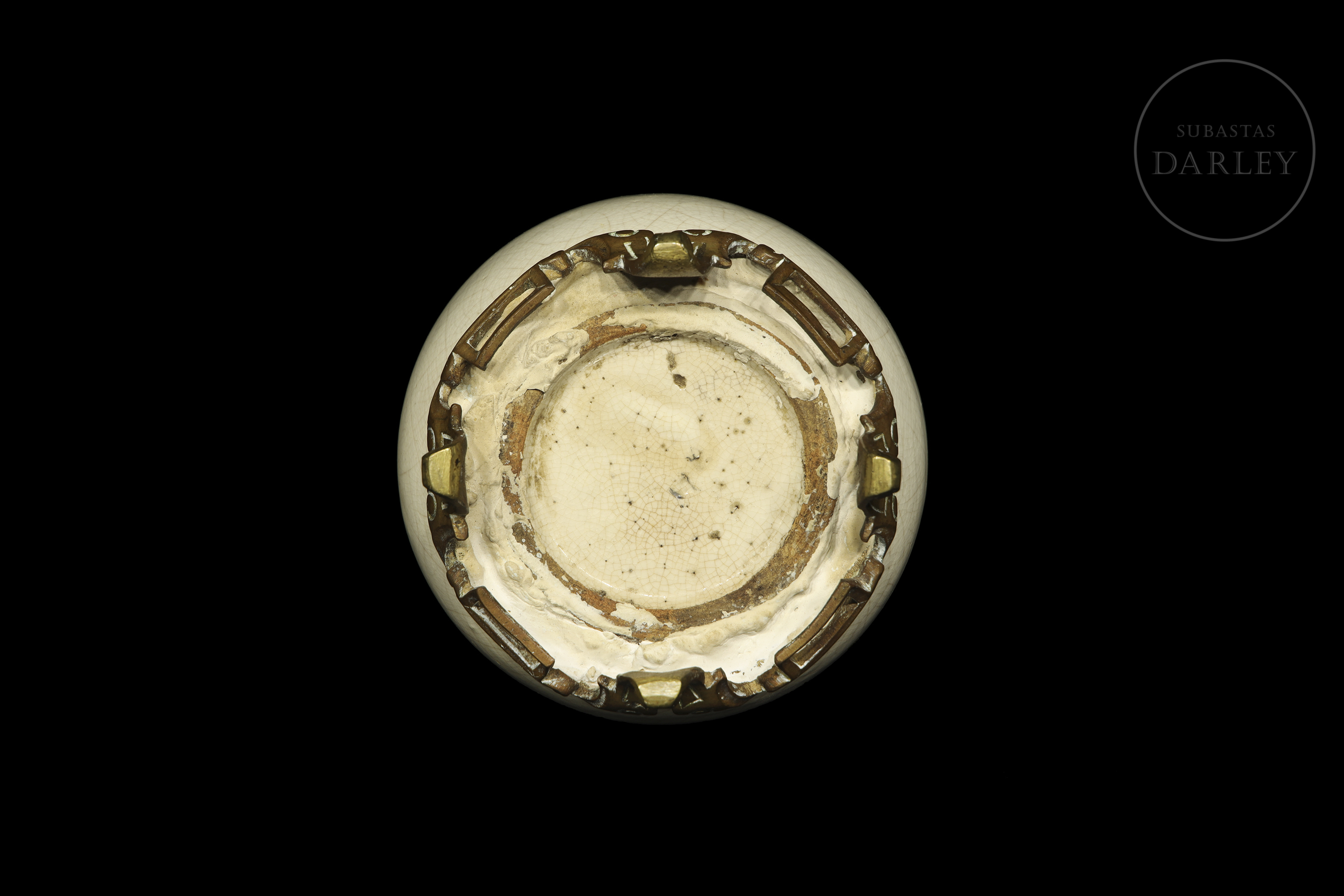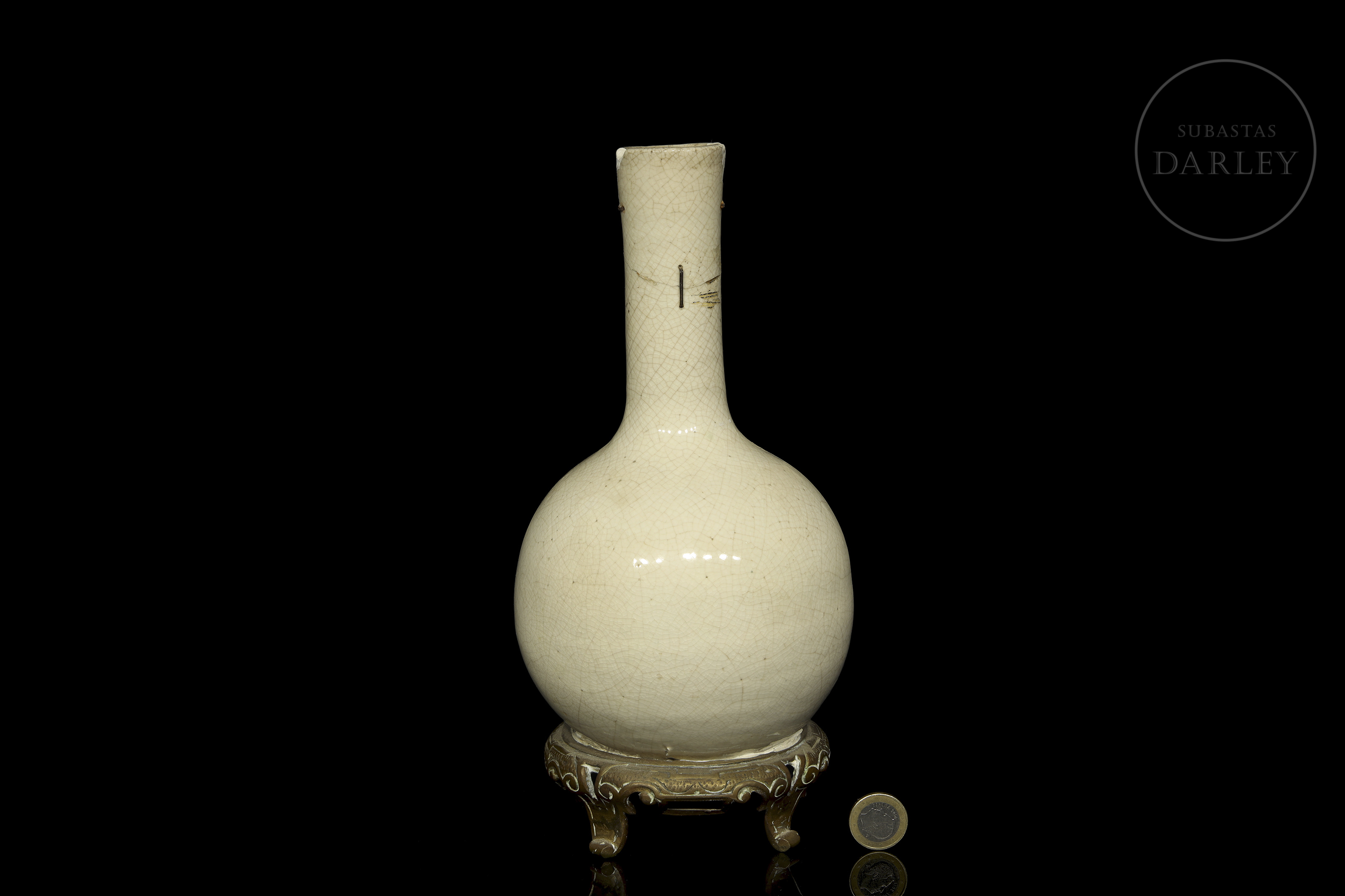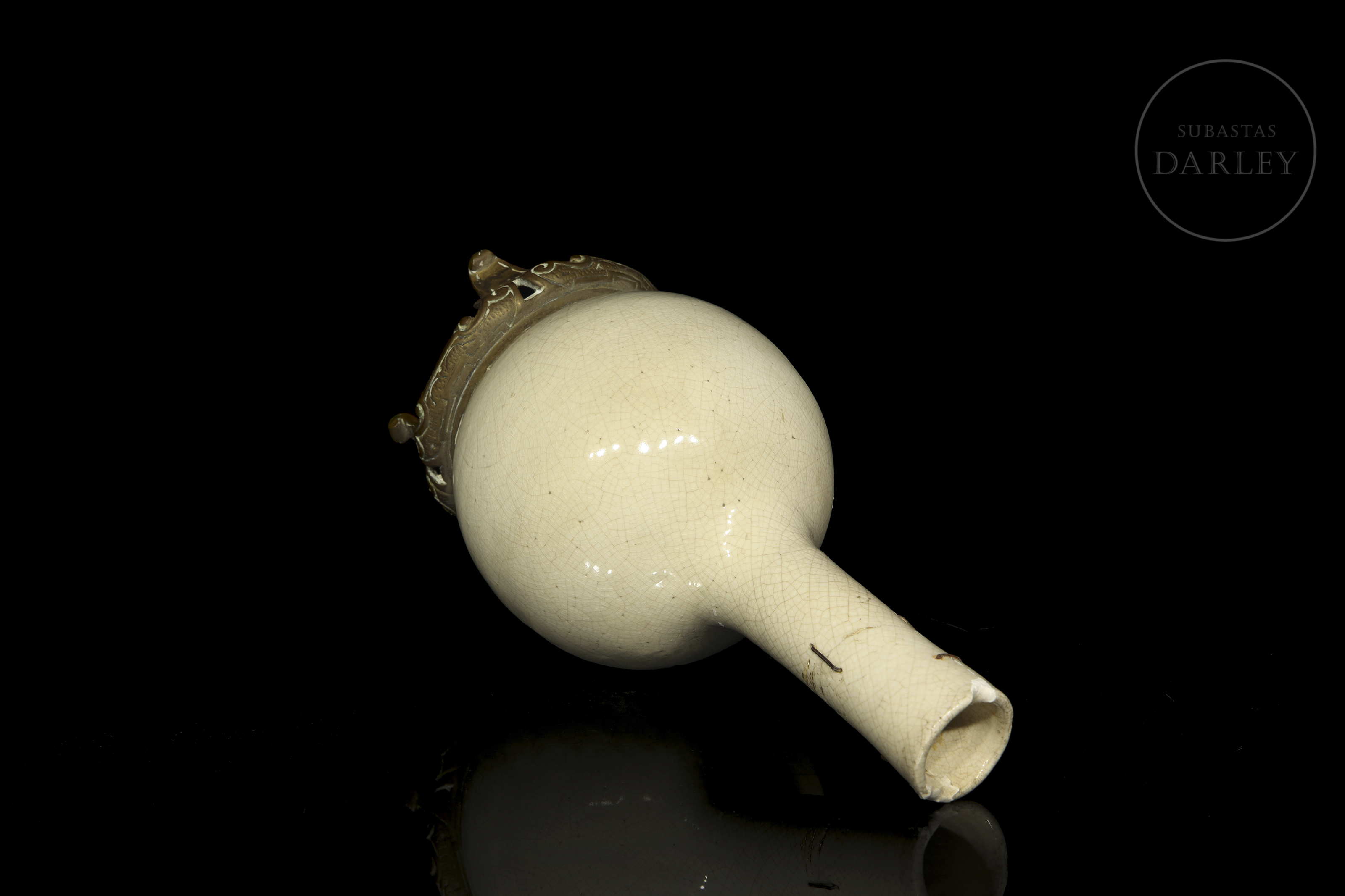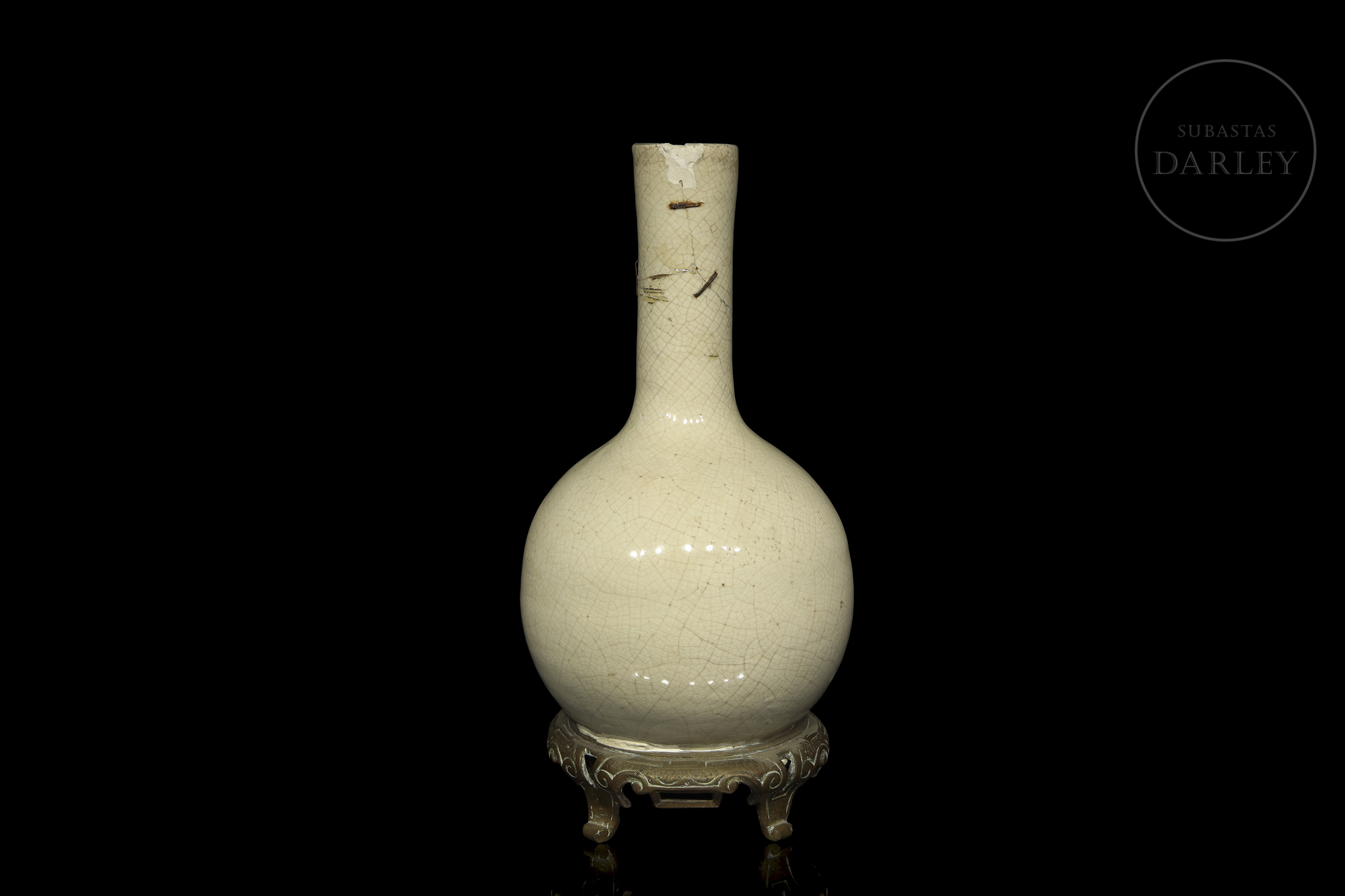 Jarrón de cerámica vidriada. Posee un pie de bronce añadido posteriormente, sobre el que se alza un cuerpo circular coronado por un alargado y estrecho cuello. Cubierta por un fino vidriado de tonalidad crema y un entramado de craqueladuras. Presenta restauraciones en cuello y base.