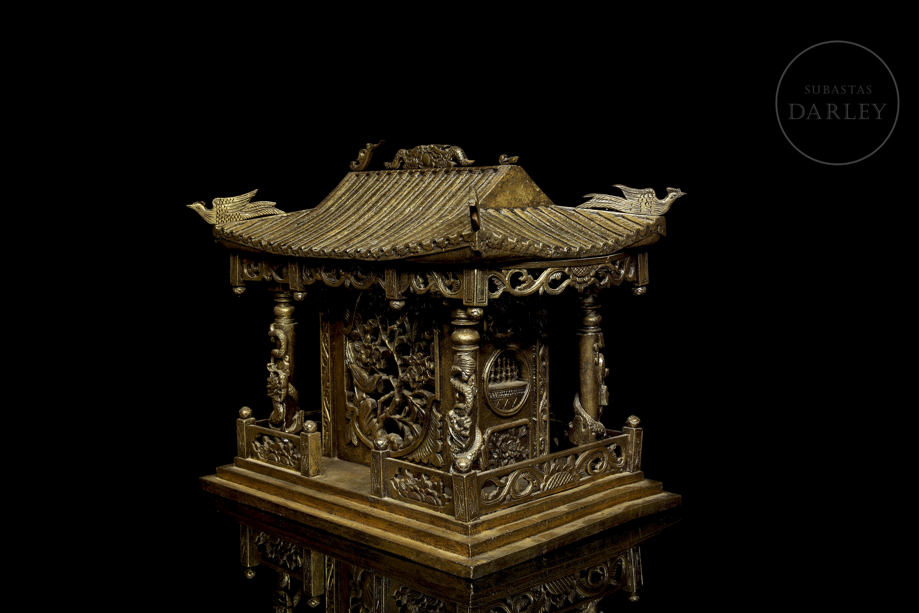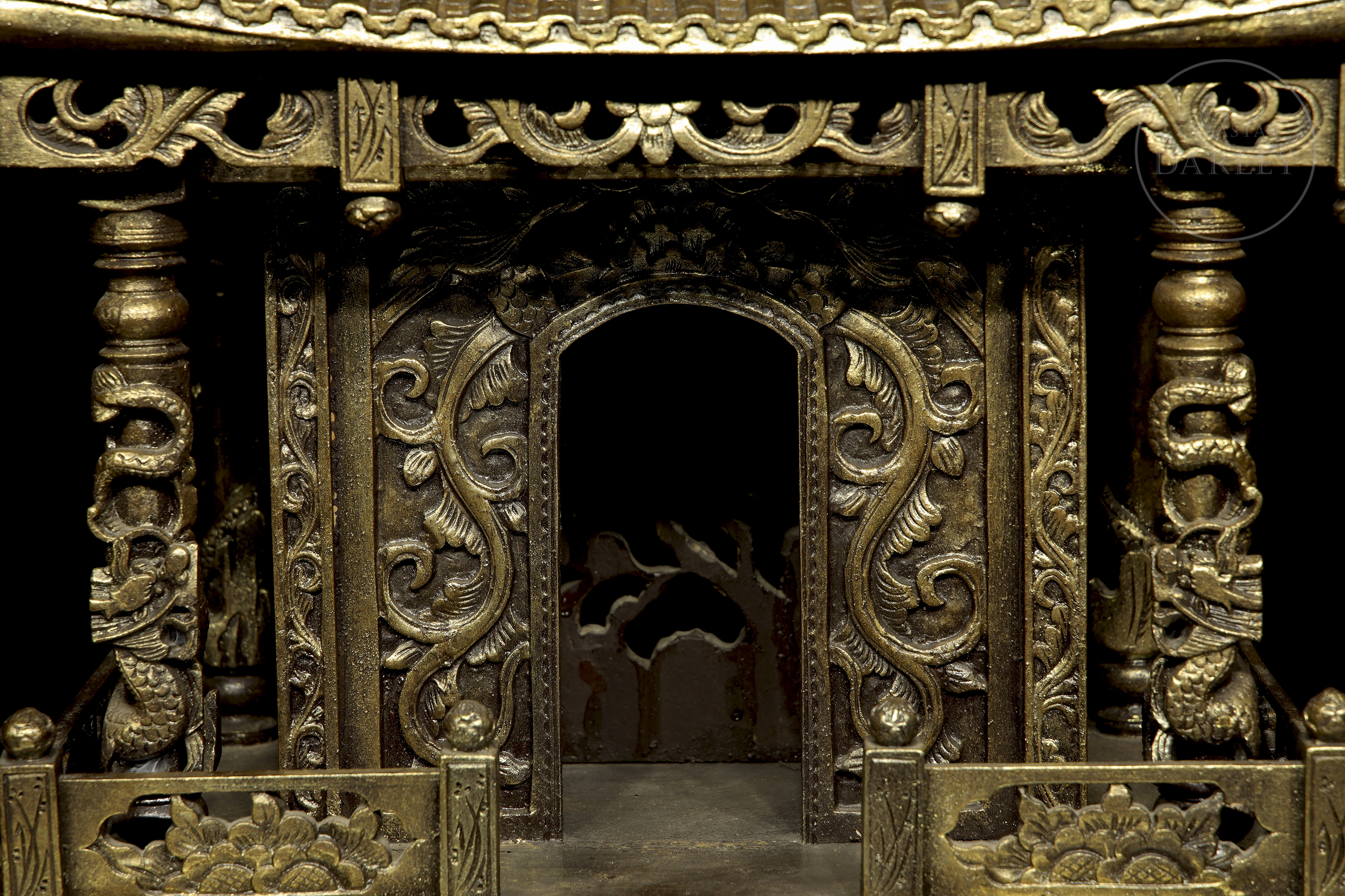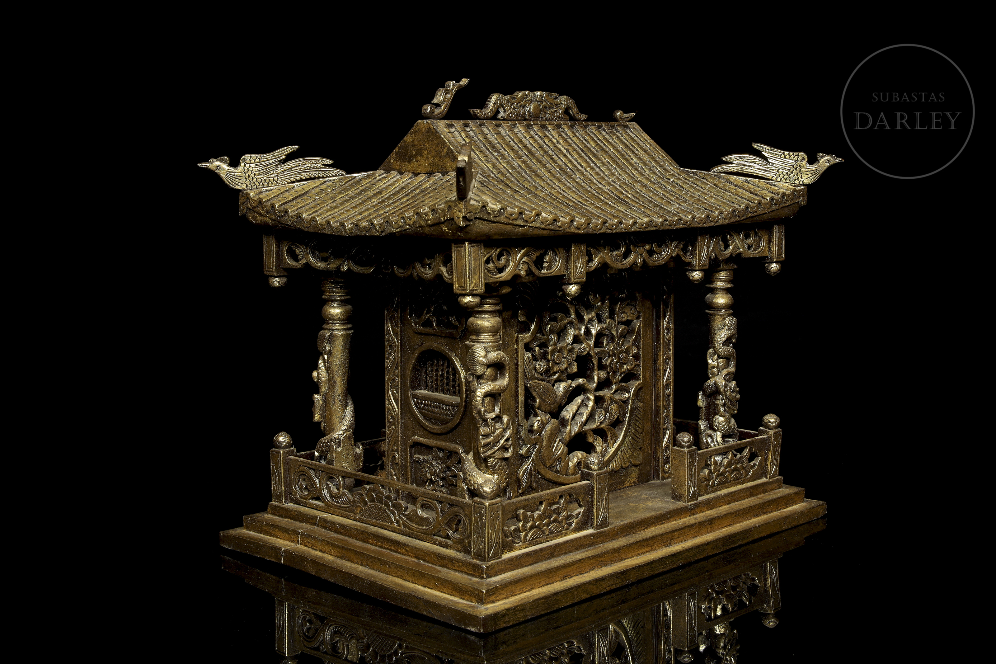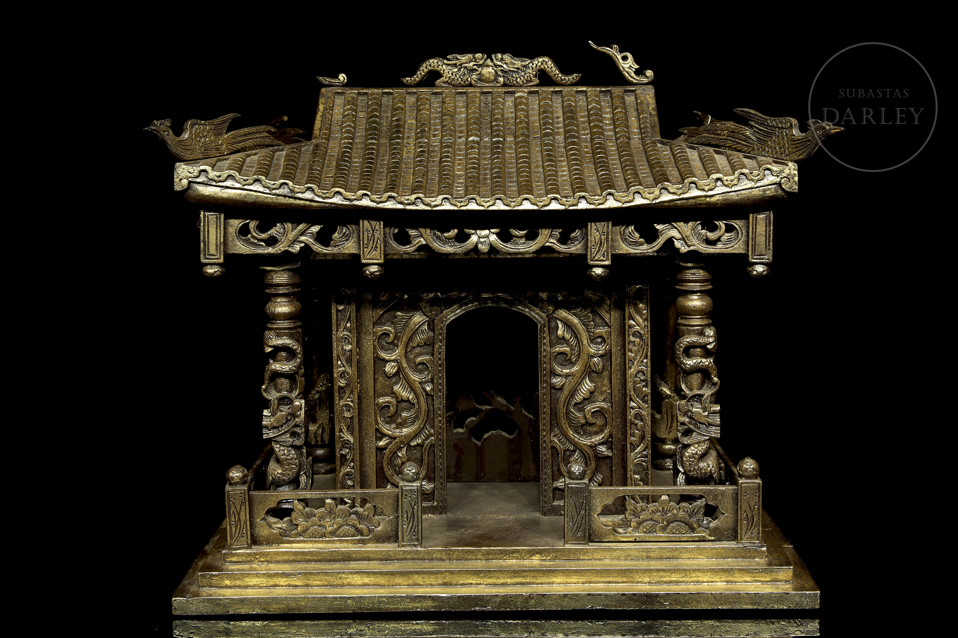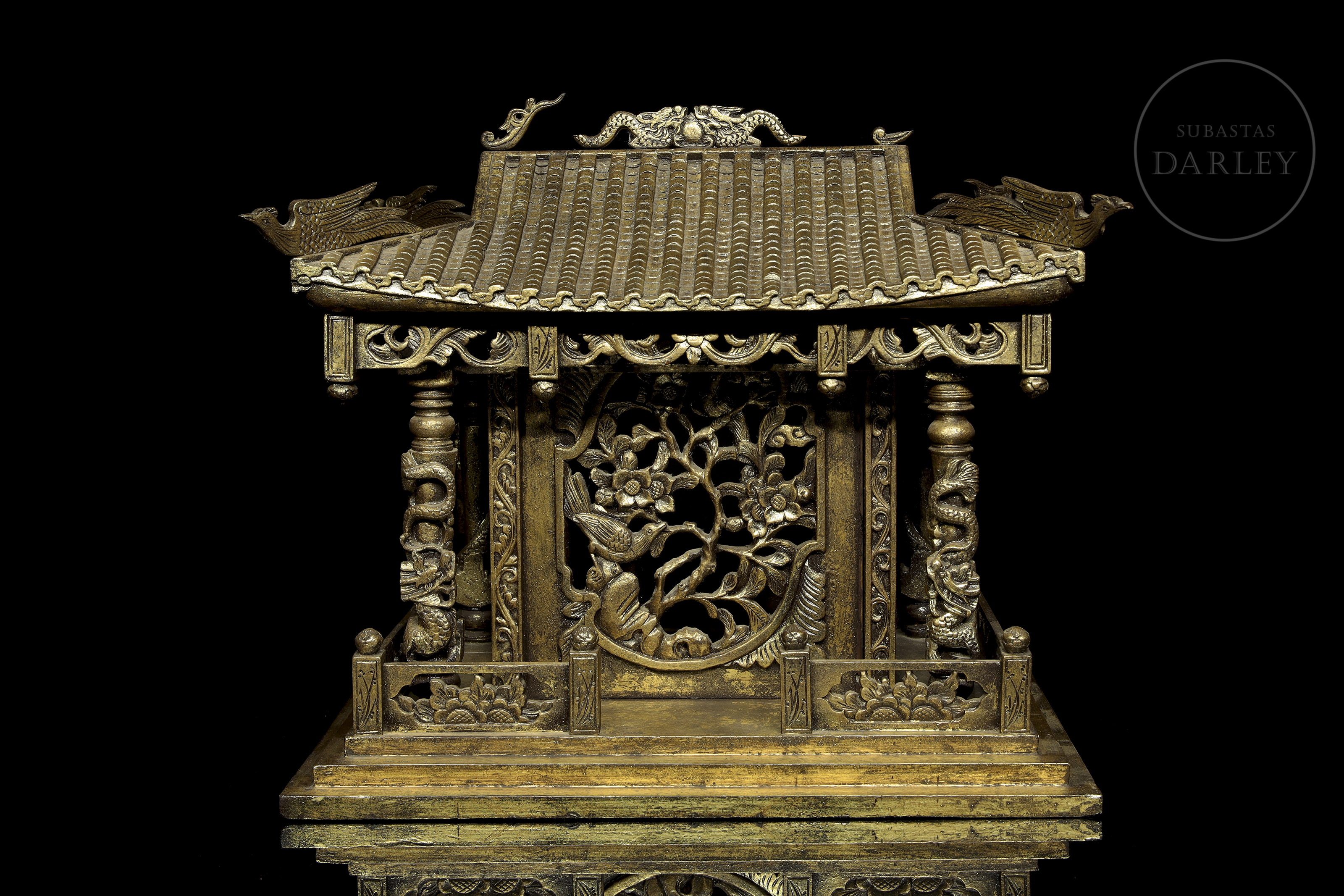 Madera tallada en forma de pequeño templo de arquitectura china, con columnas adornadas con imágenes de dragones en relieve, frisos calados y muros decorados con roleos florales. Muestra restos de pigmento dorado y ligeras faltas.