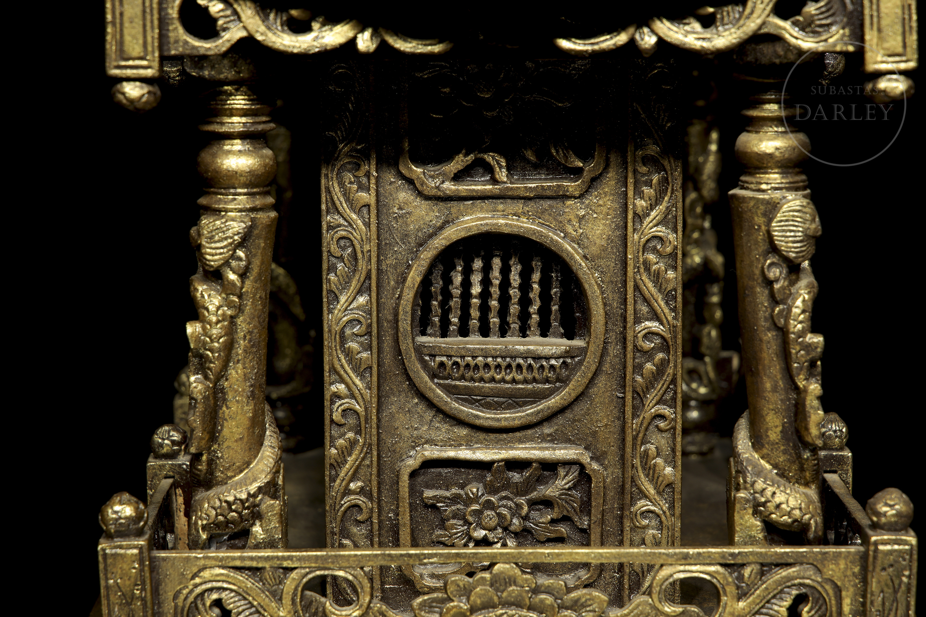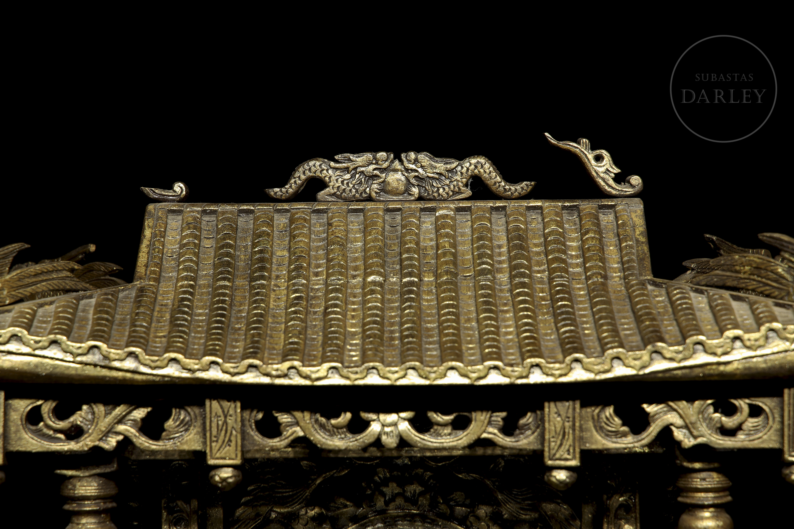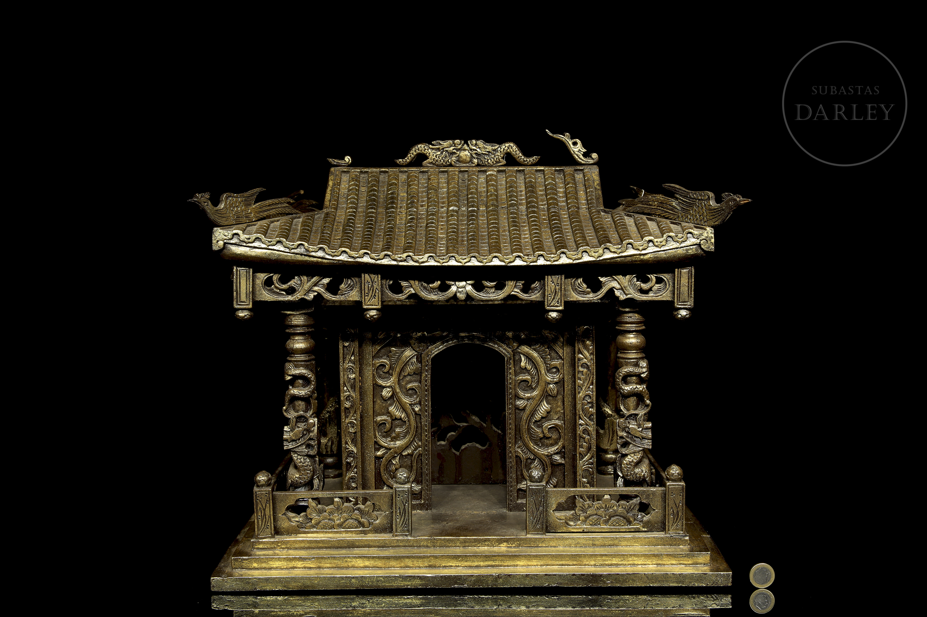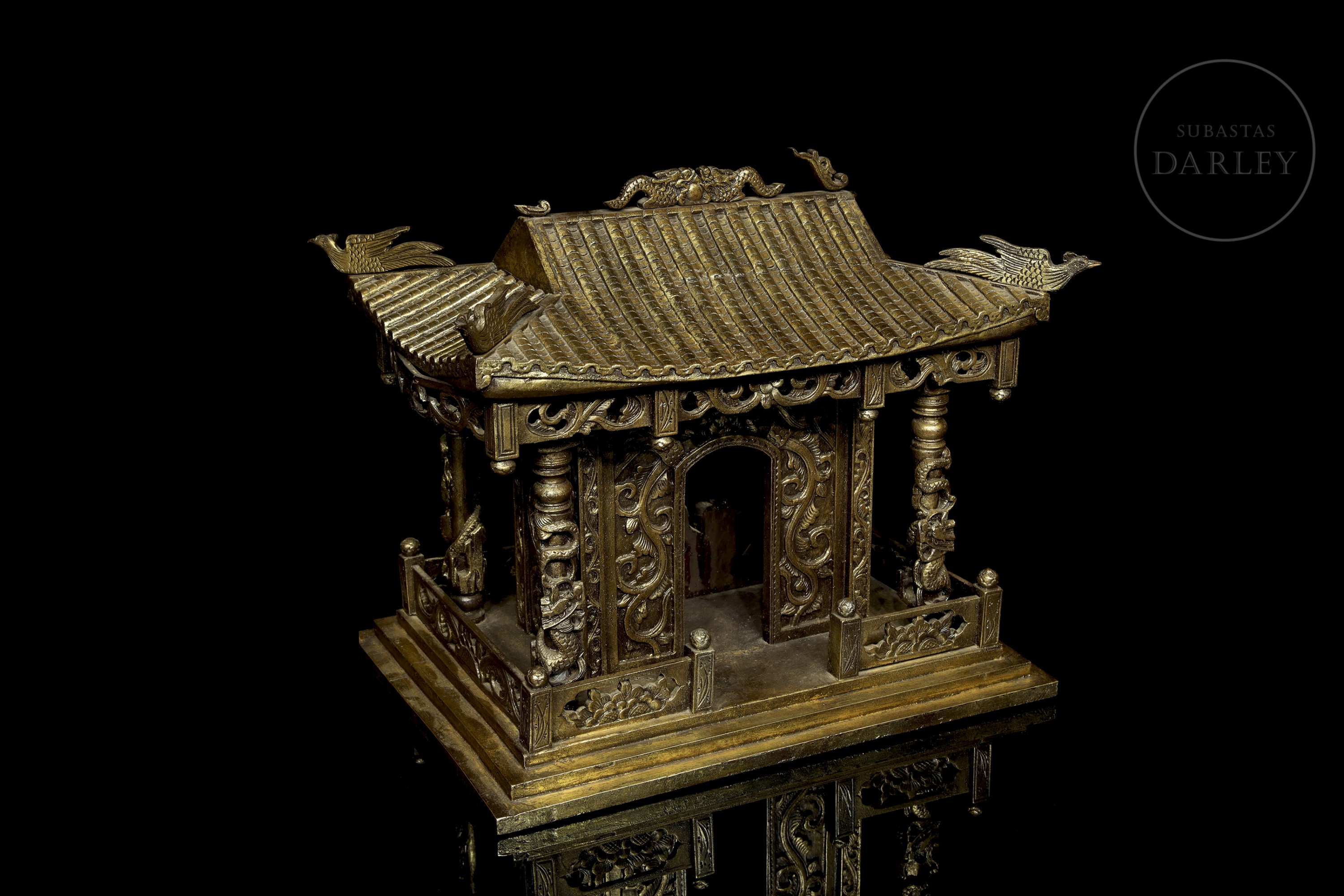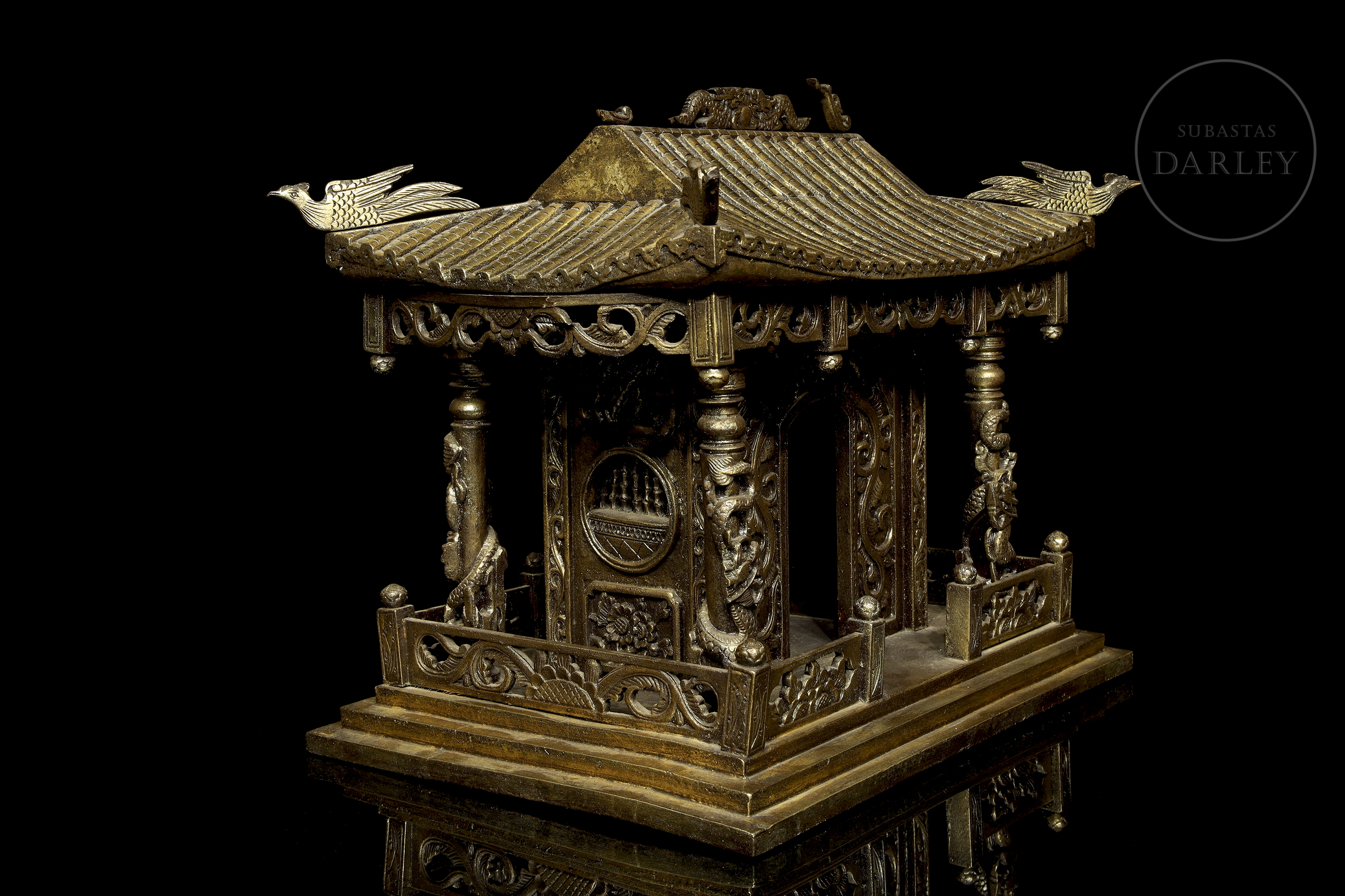 Madera tallada en forma de pequeño templo de arquitectura china, con columnas adornadas con imágenes de dragones en relieve, frisos calados y muros decorados con roleos florales. Muestra restos de pigmento dorado y ligeras faltas.