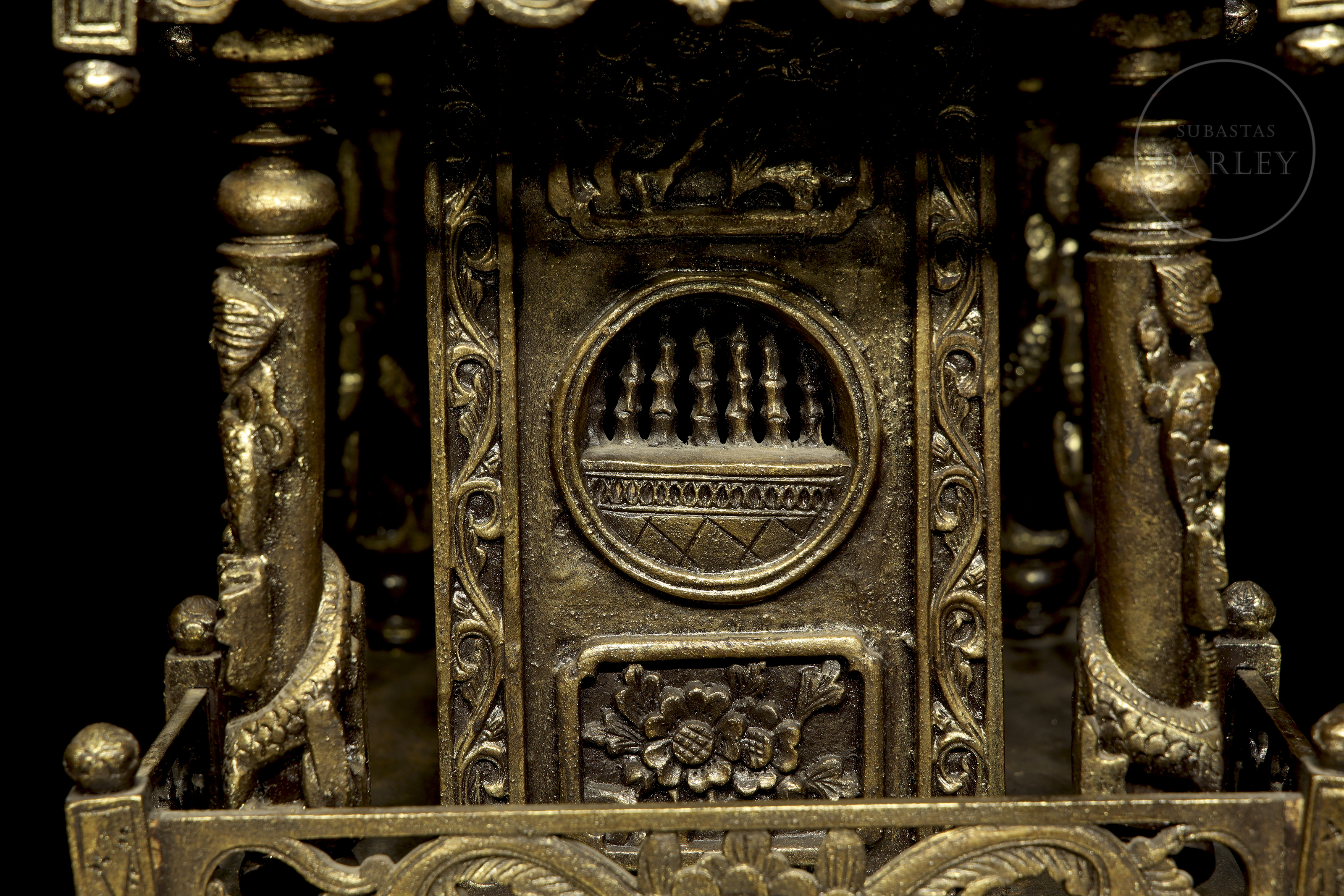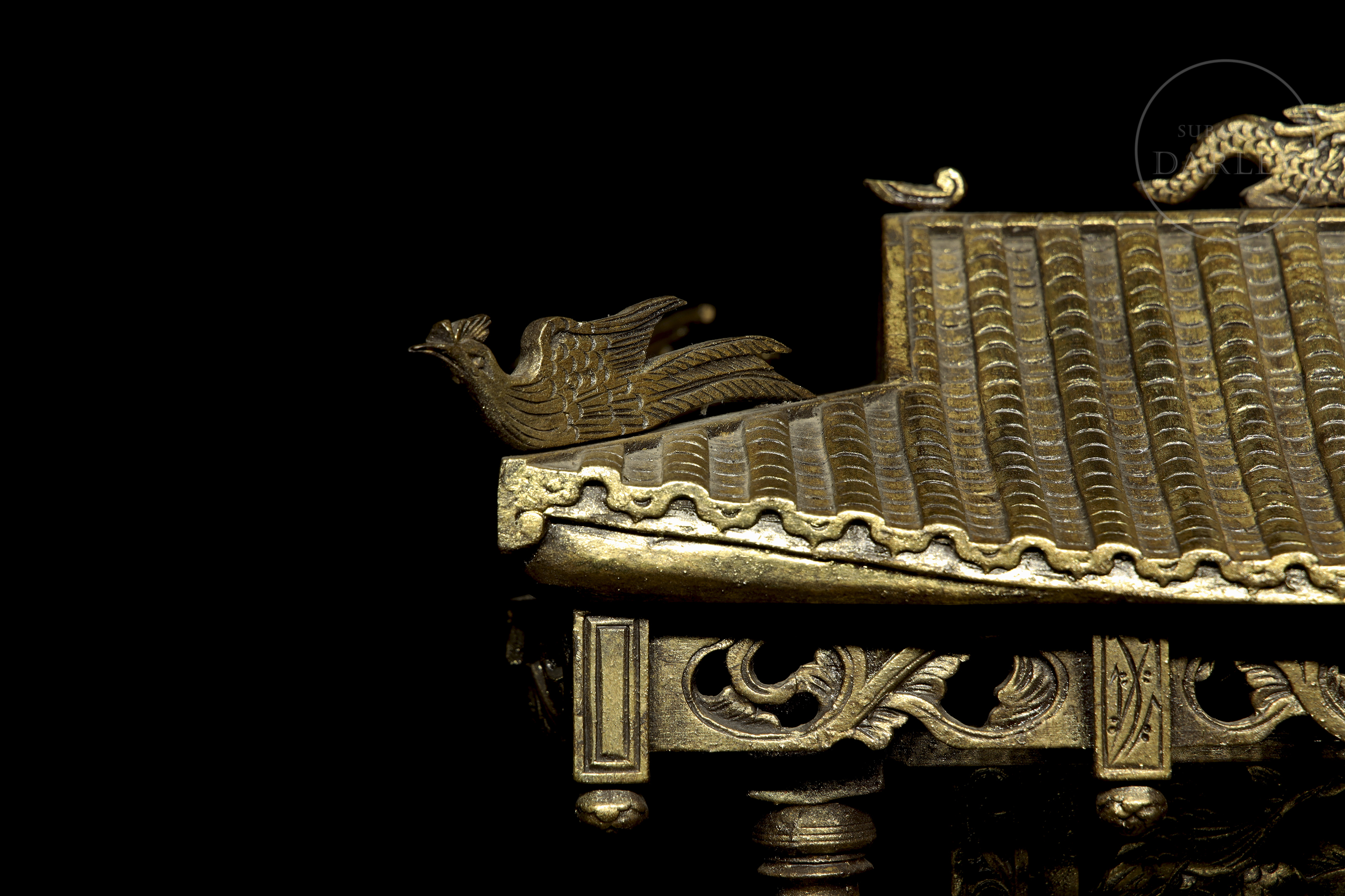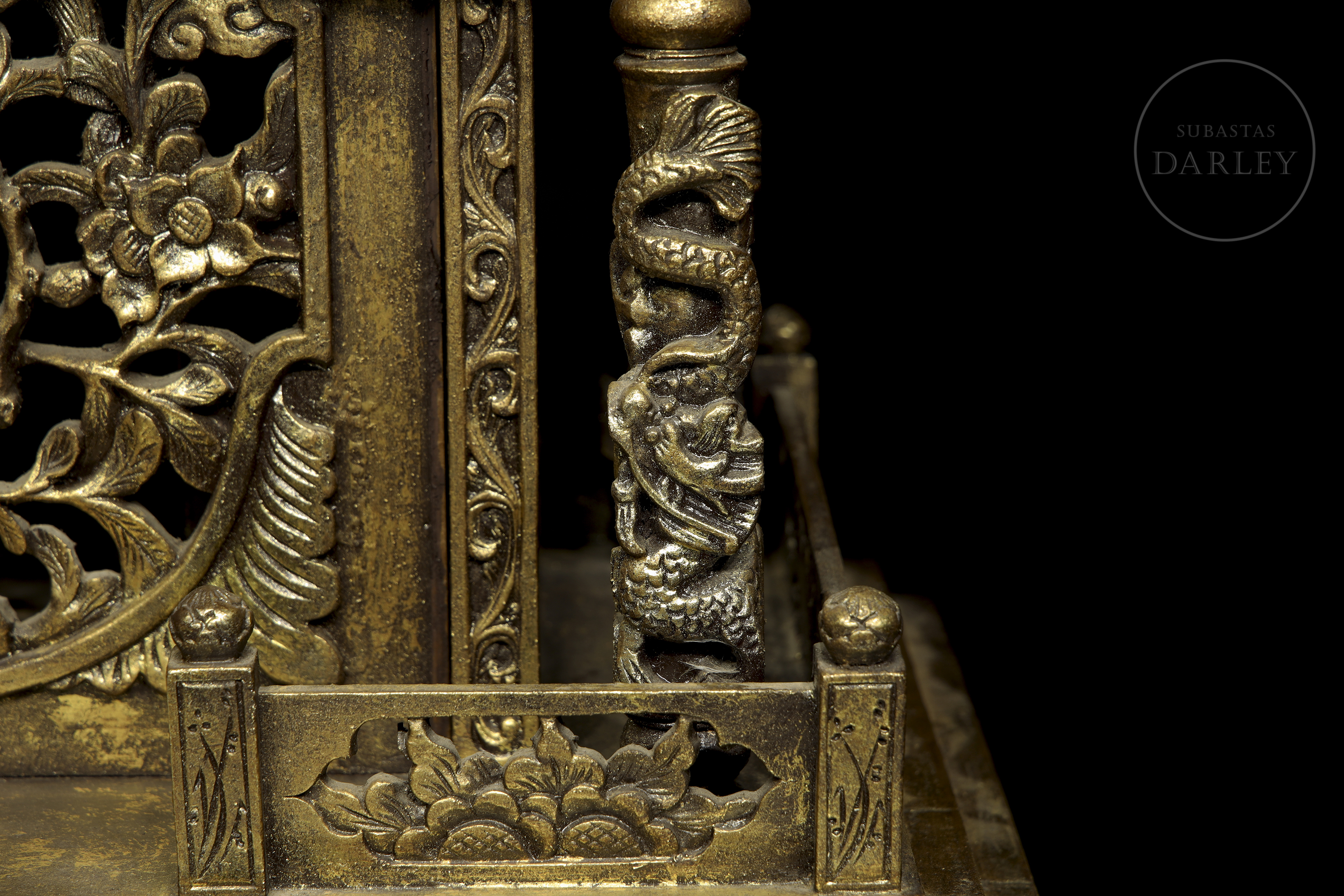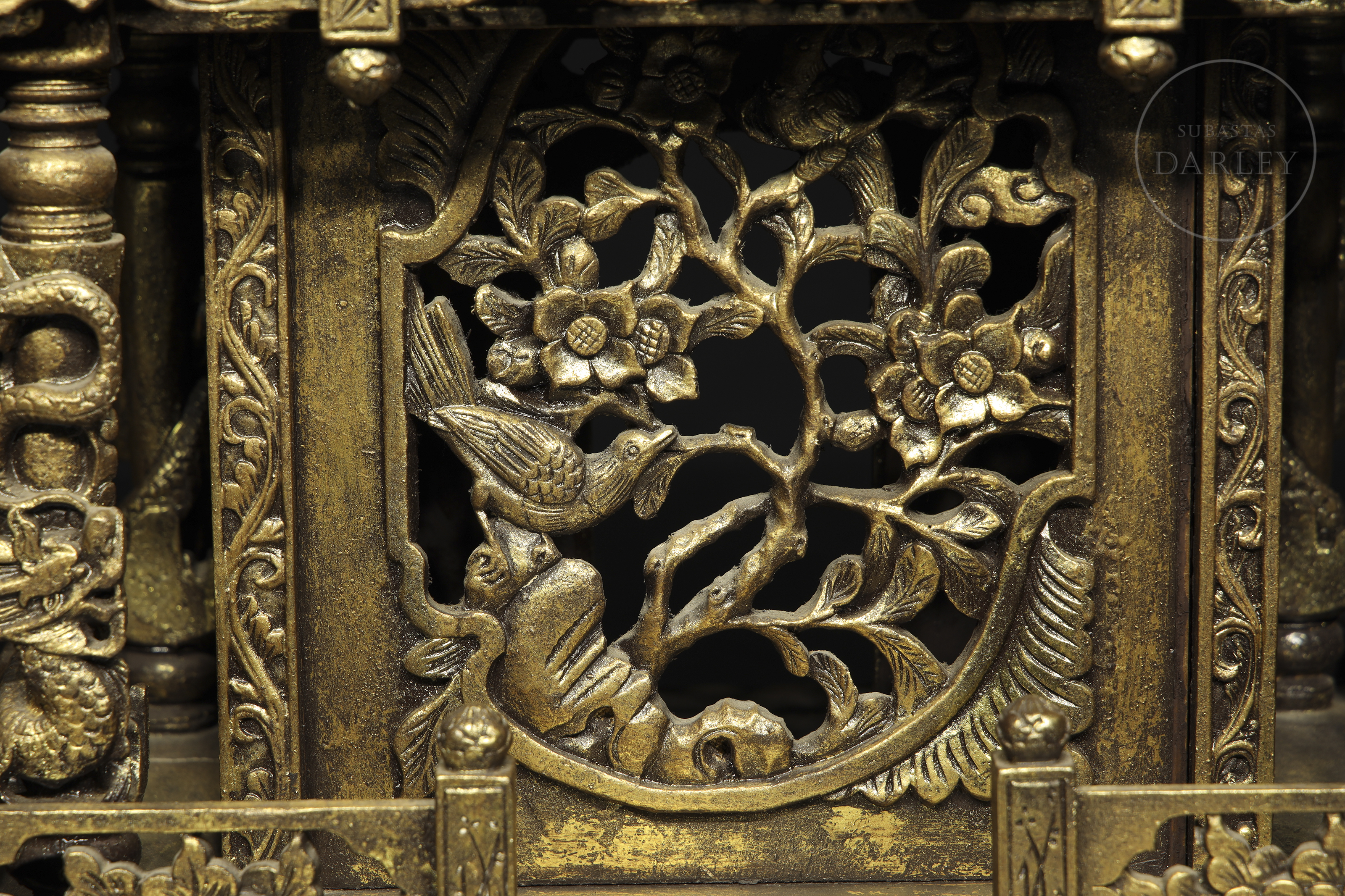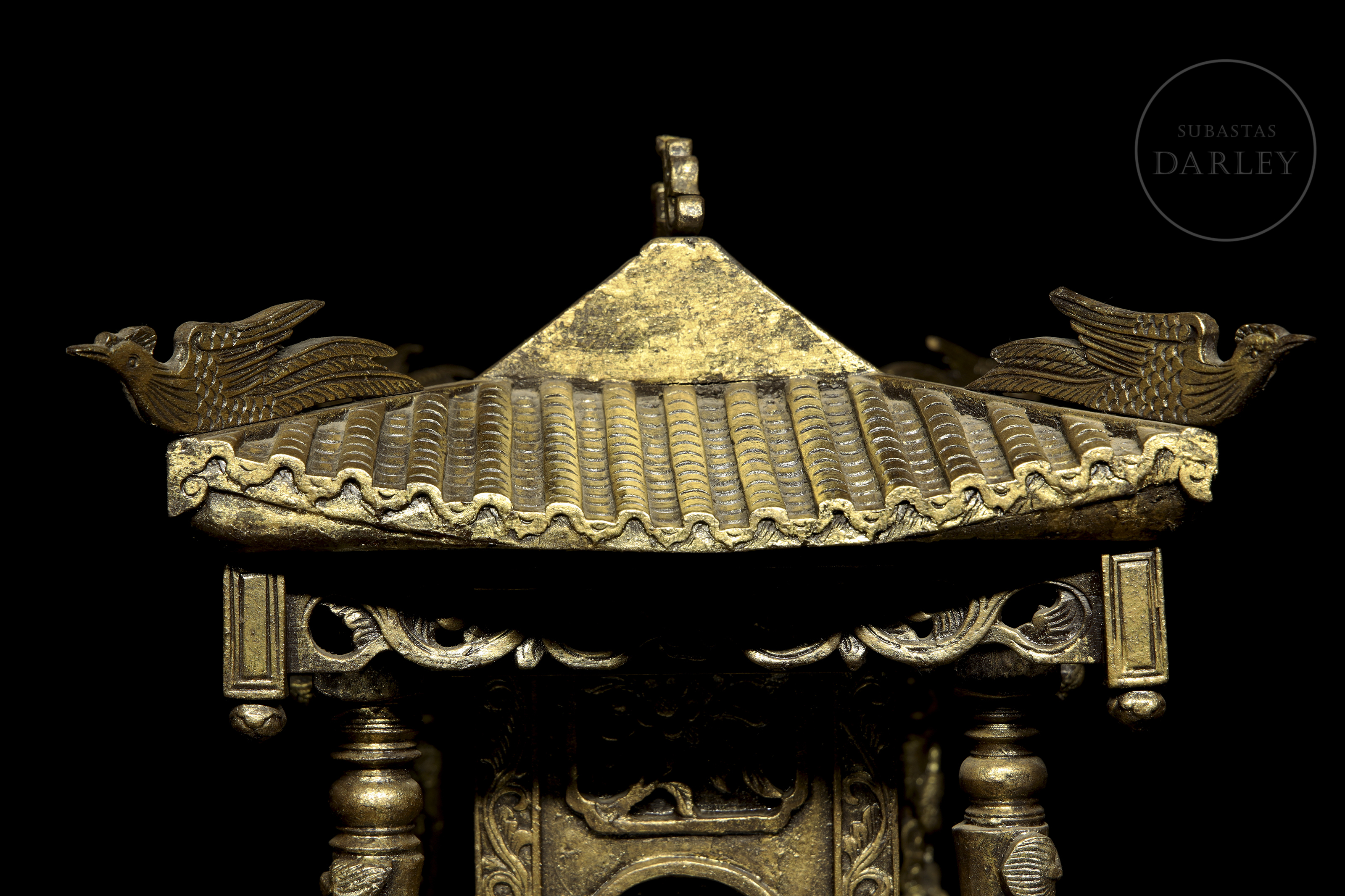 Madera tallada en forma de pequeño templo de arquitectura china, con columnas adornadas con imágenes de dragones en relieve, frisos calados y muros decorados con roleos florales. Muestra restos de pigmento dorado y ligeras faltas.