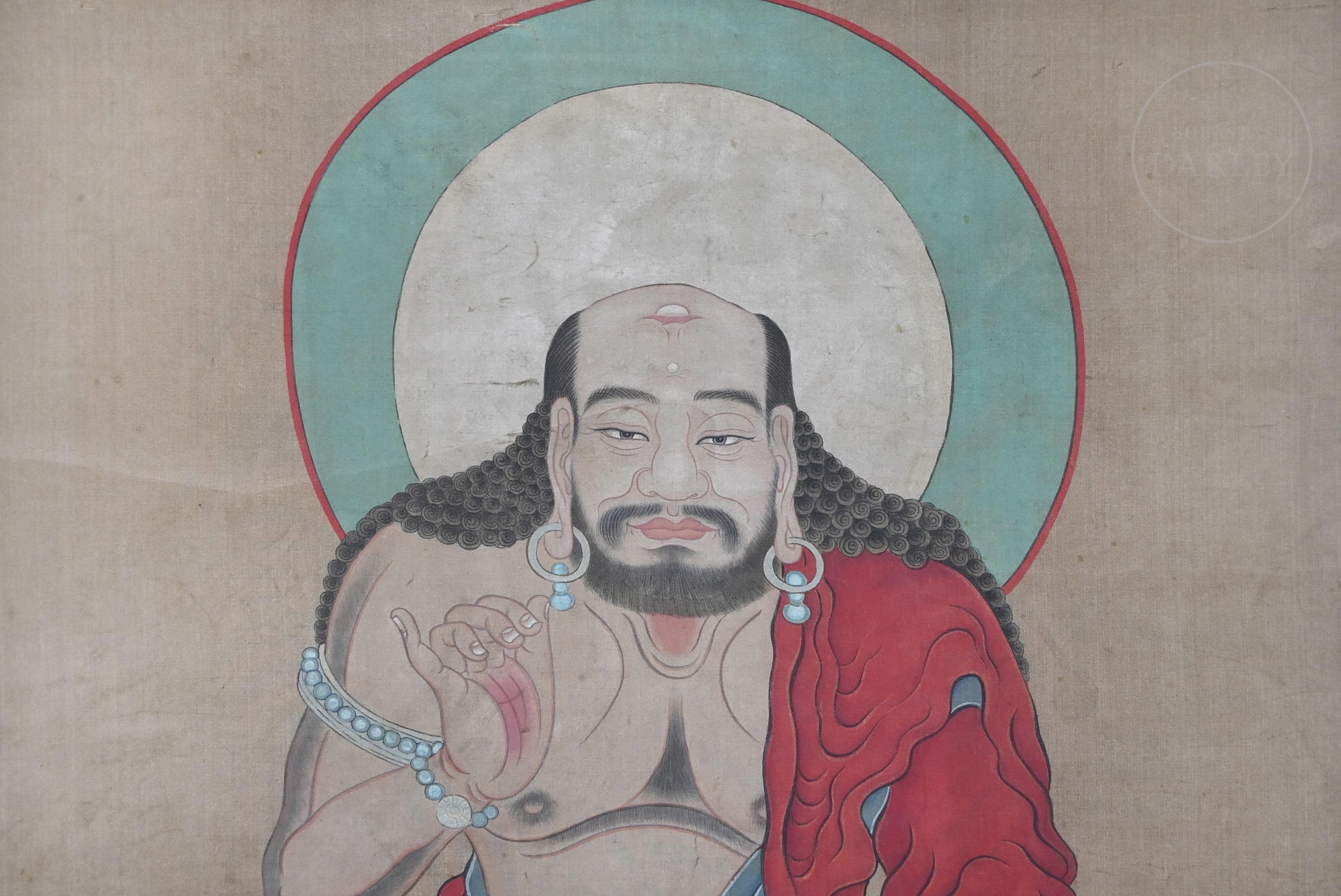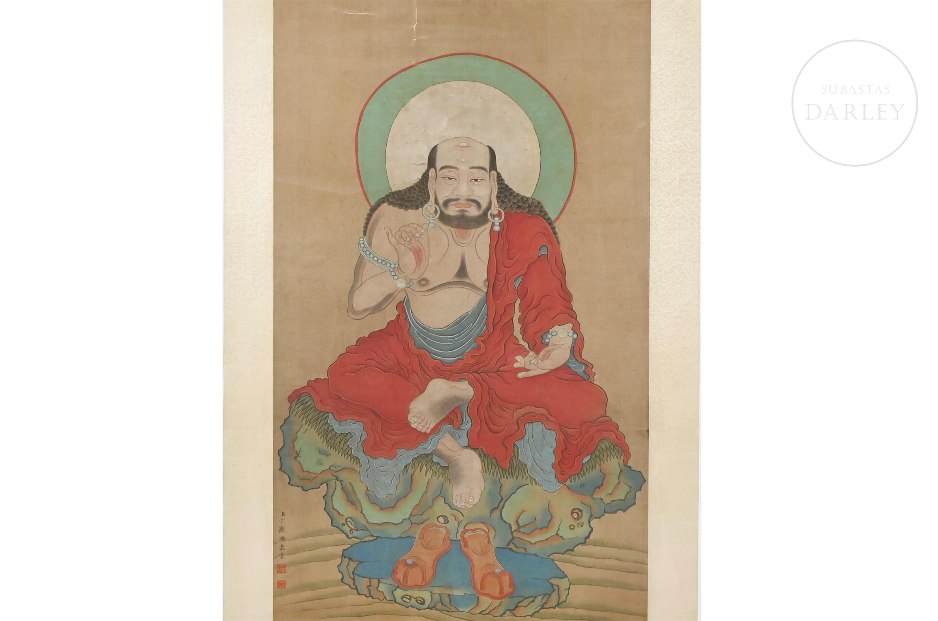 Pintura realizada en tinta y pigmentos sobre seda, montada en un marco de seda brocada. Representa a un arhat sentado sobre una formación rocosa, vestido con túnica roja y portando un mala en la mano derecha, mientras ofrece con la izquierda un gesto de dádiva. Presenta la inscripción en la parte inferior izquierda "臣丁观鹏恭画", acompañada de los sellos en rojo "丁观鹏" y "恭绘". Ding Guanpeng (1708–1771).