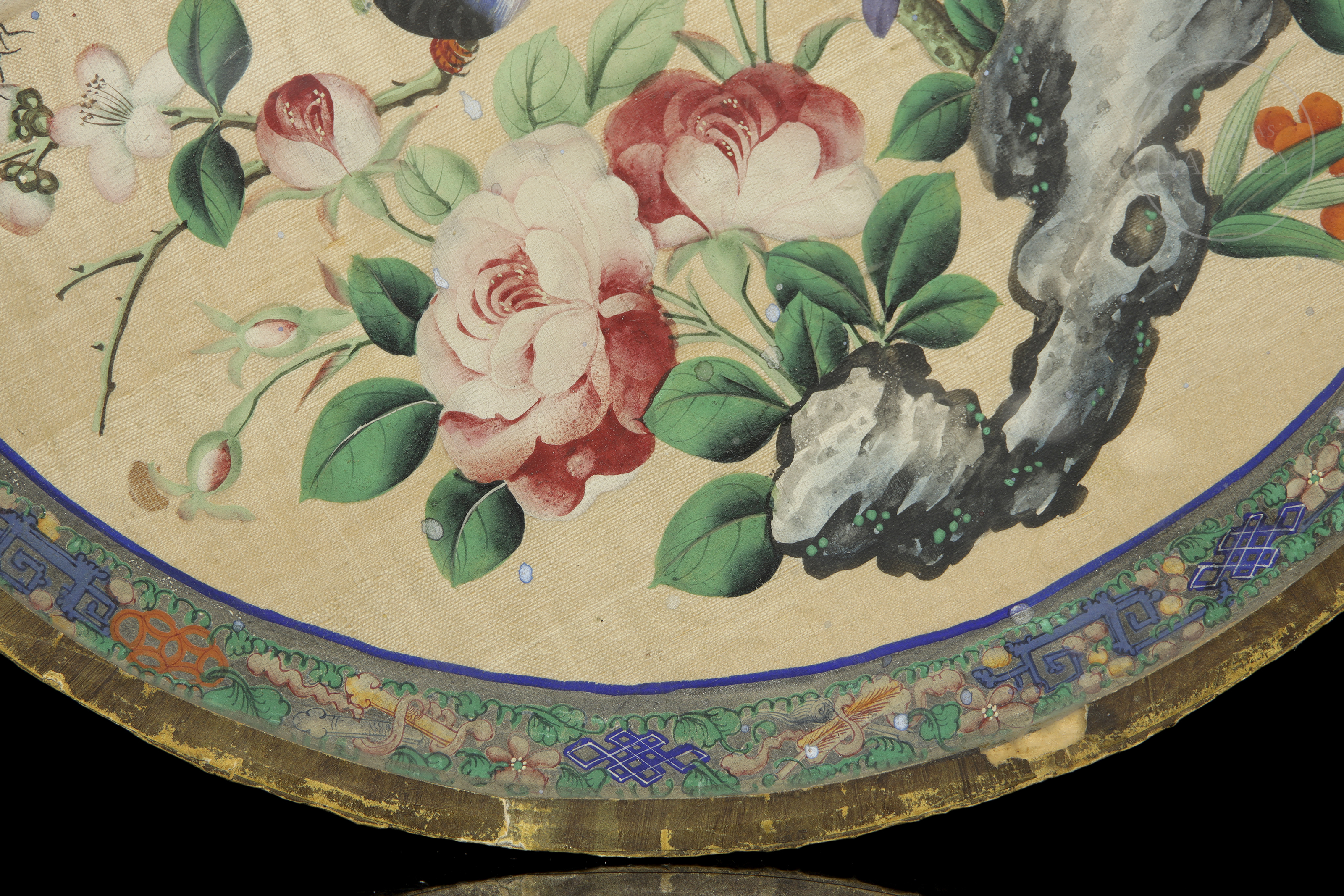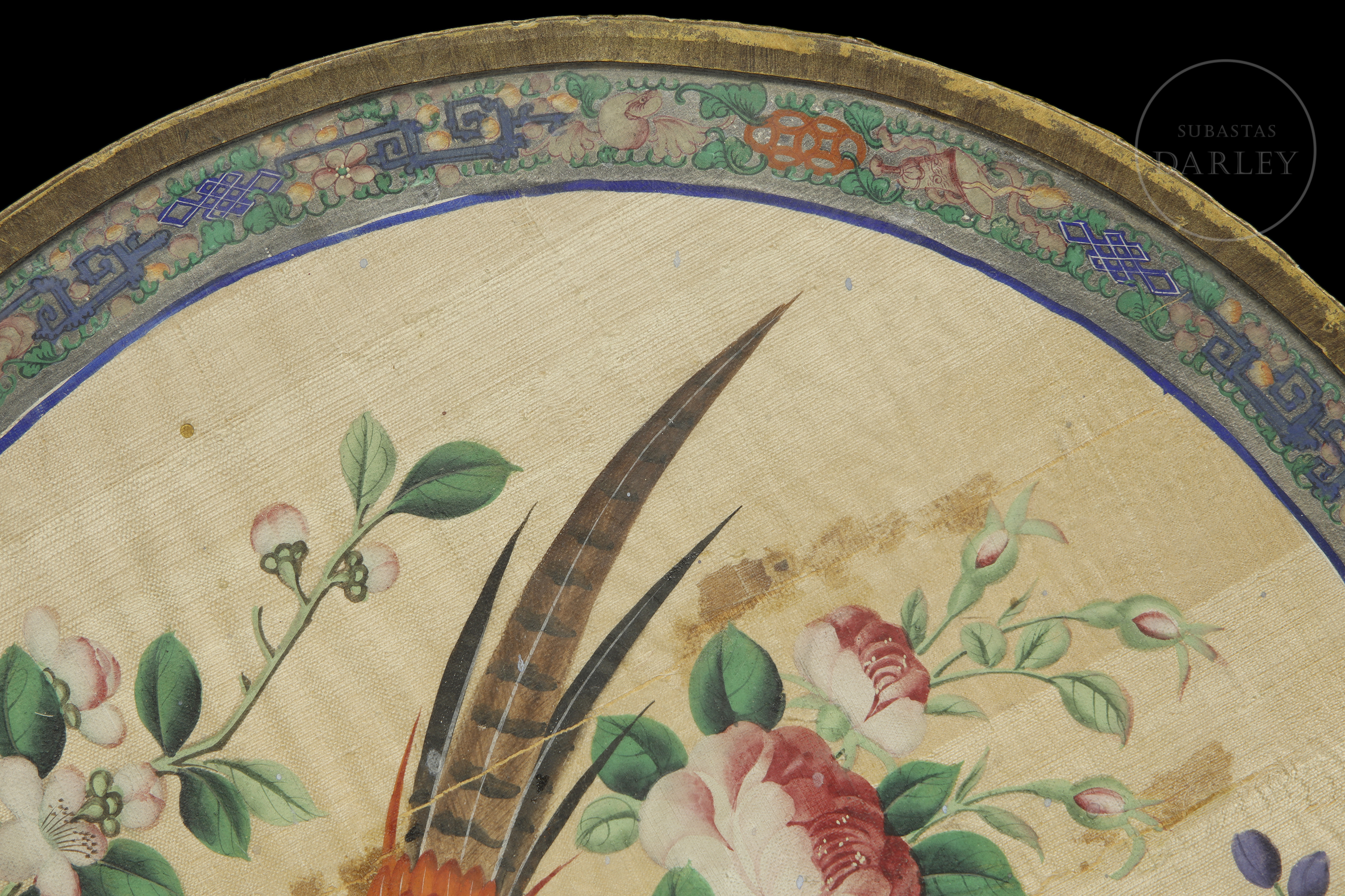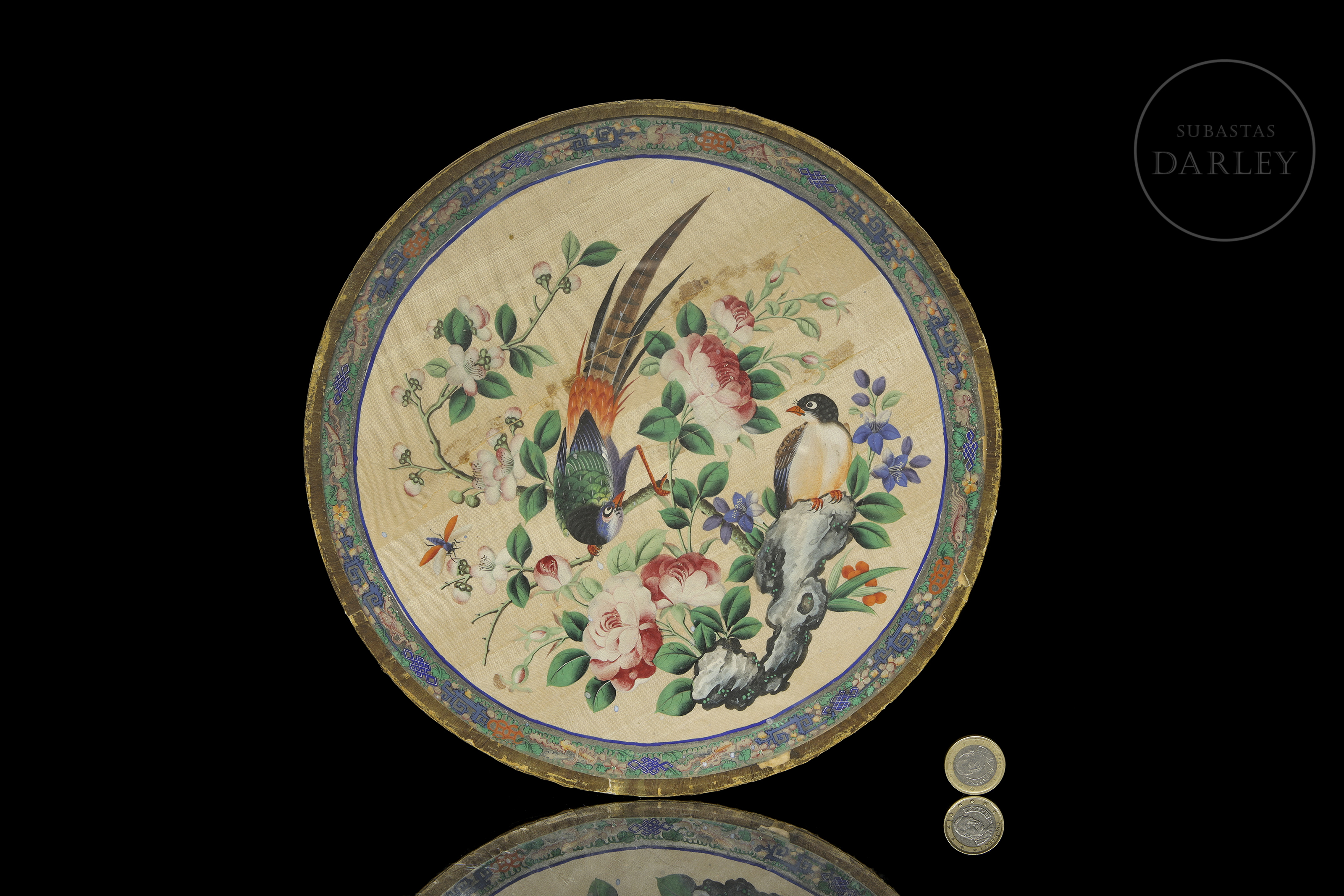 Pintura sobre seda. Posee una morfología circular o de medallón, con un marco perimetral policromado de motivos vegetales y auspiciosos. Muestra dos pájaros hermosos pájaros, uno de cola larga y otro posado sobre una roca, entre rosas, peonías y ramajes florales.