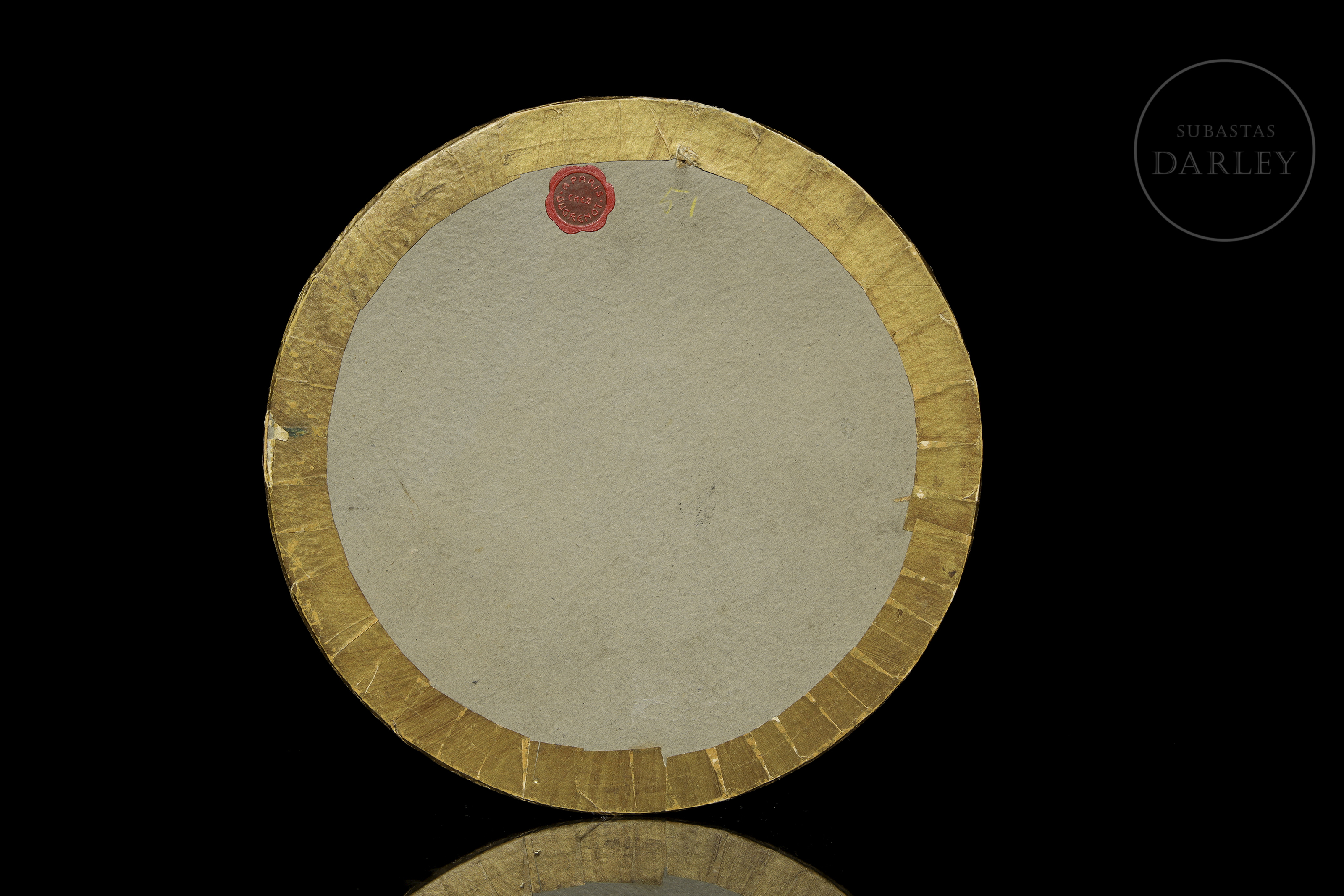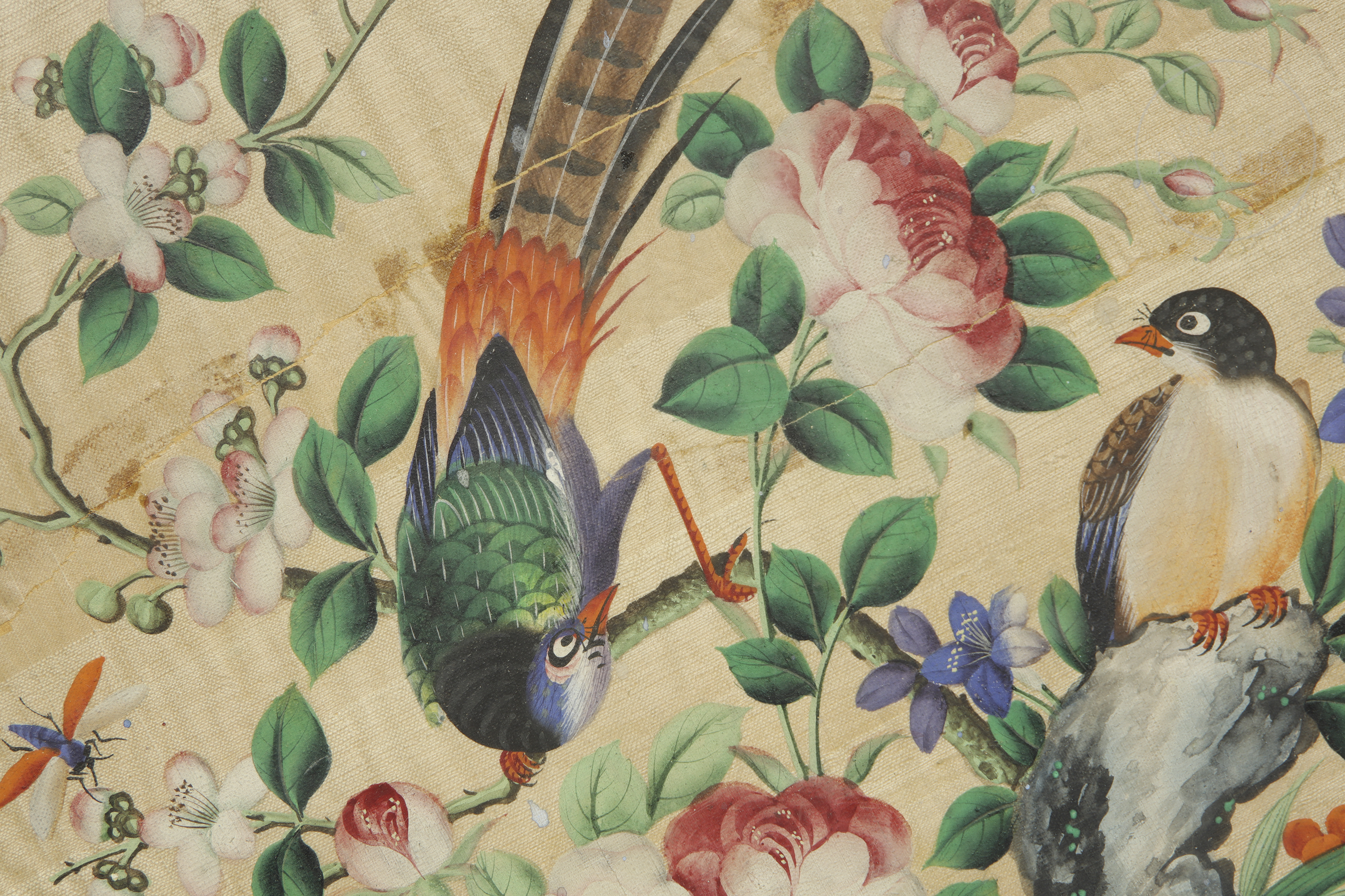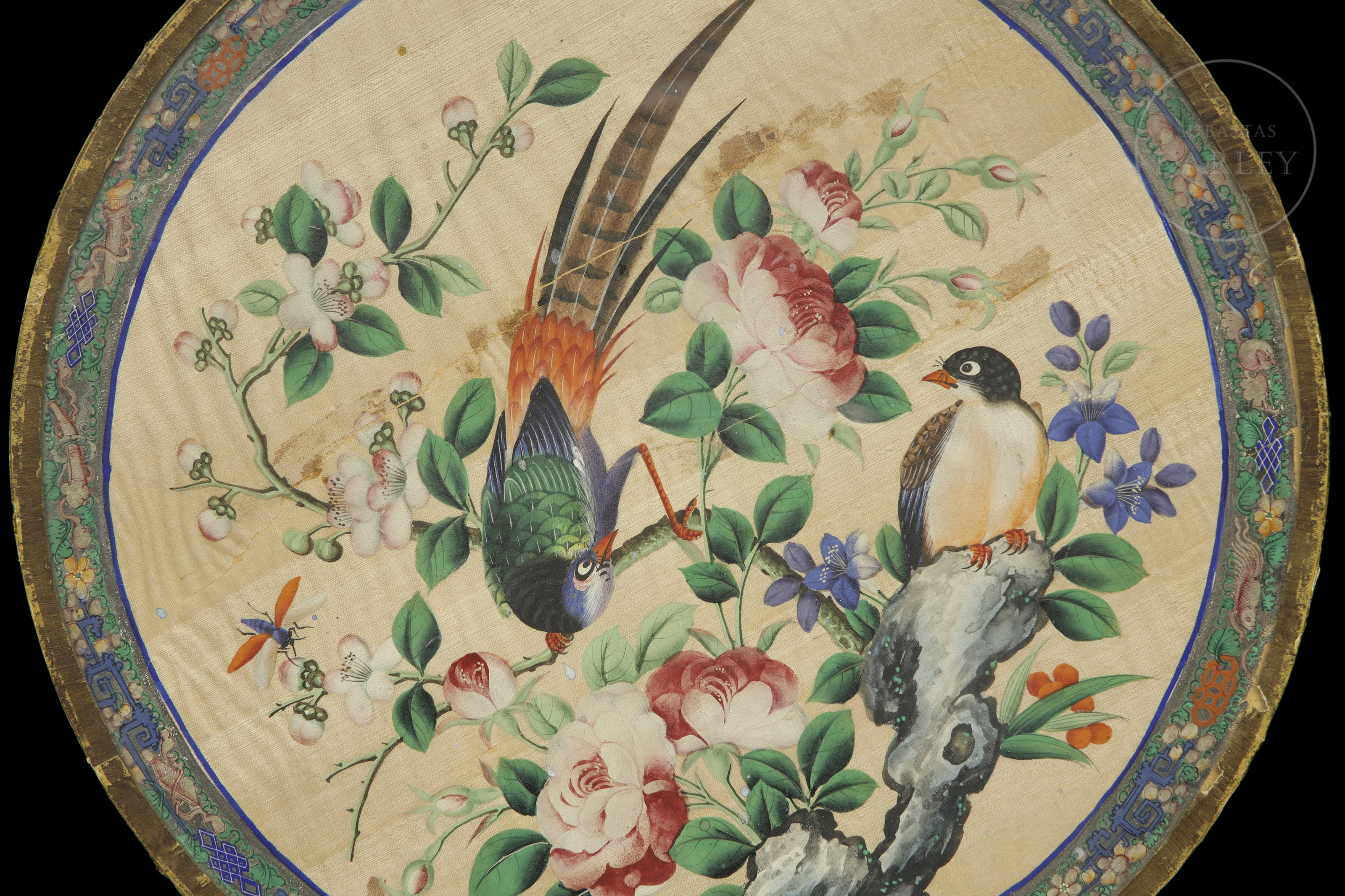 Pintura sobre seda. Posee una morfología circular o de medallón, con un marco perimetral policromado de motivos vegetales y auspiciosos. Muestra dos pájaros hermosos pájaros, uno de cola larga y otro posado sobre una roca, entre rosas, peonías y ramajes florales.