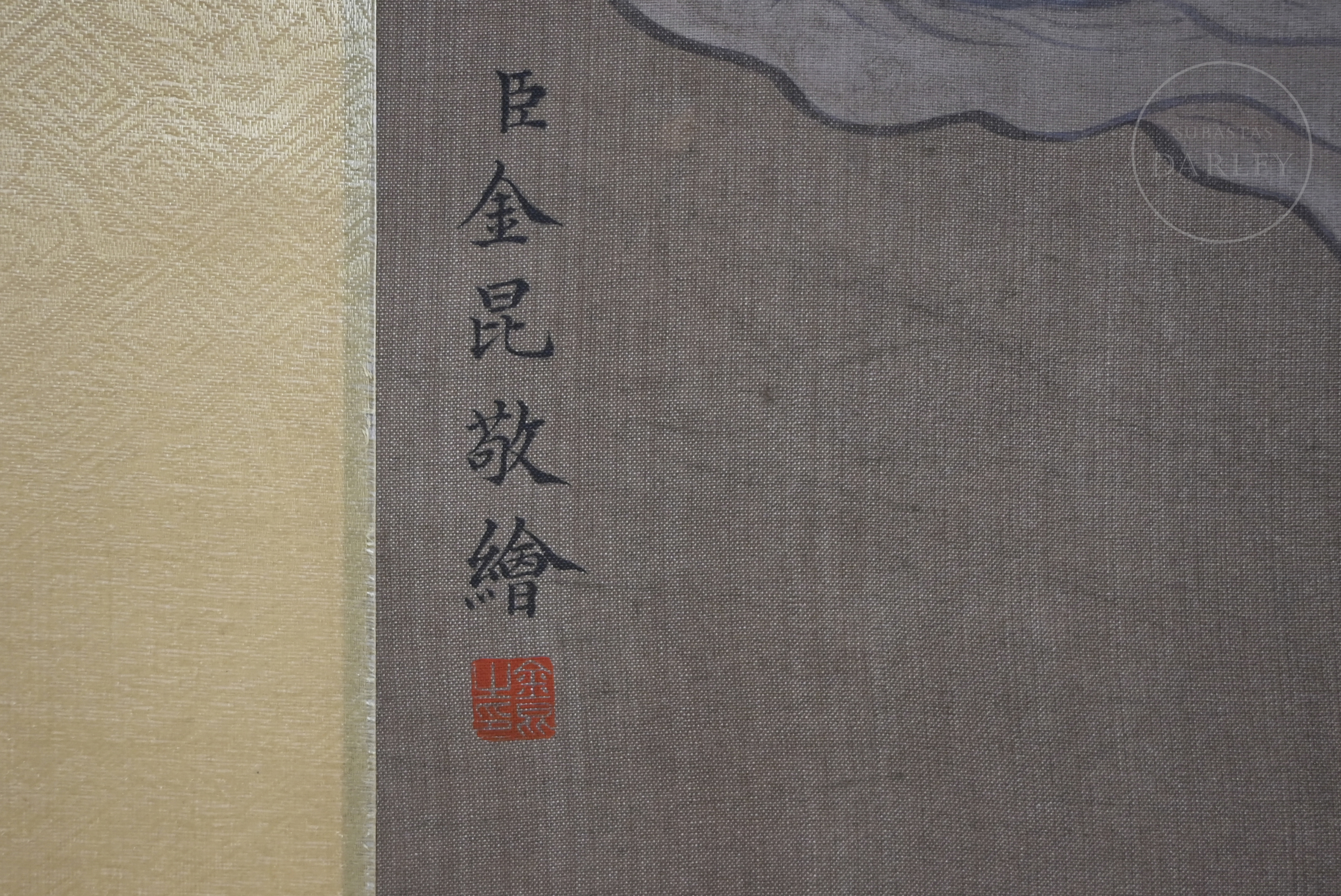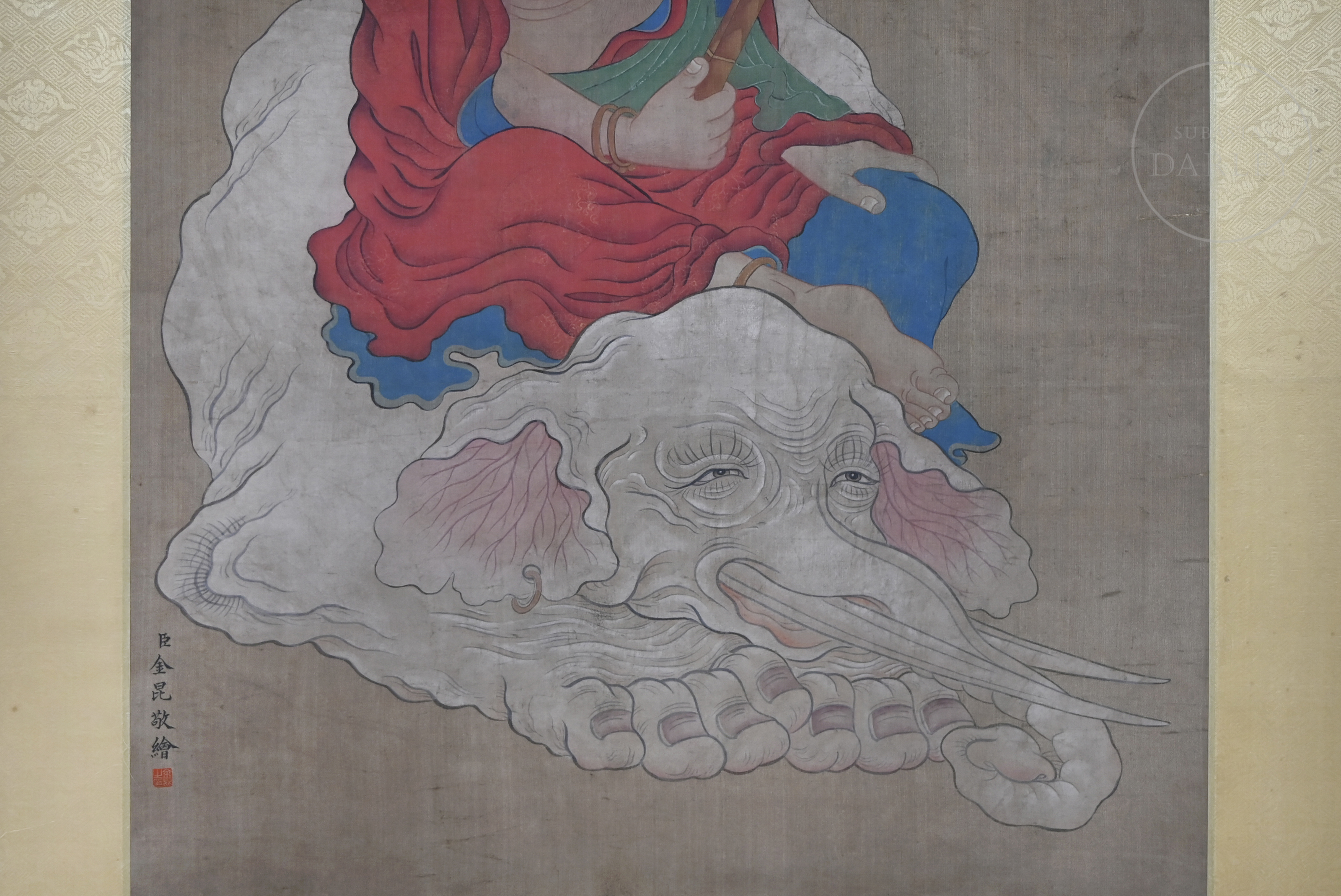 Pintura realizada en tinta y pigmentos sobre seda, dispuesta en un montaje de seda brocada. Representa a una deidad sentada sobre un elefante blanco, portando en su mano un gran ruyi. La figura, de aspecto solemne, viste túnica roja y azul con detalles verdes, mientras que tras ella se dispone un halo circular. En el lateral izquierdo aparece la inscripción "臣金昆敬绘" junto al sello en rojo "金昆之印".