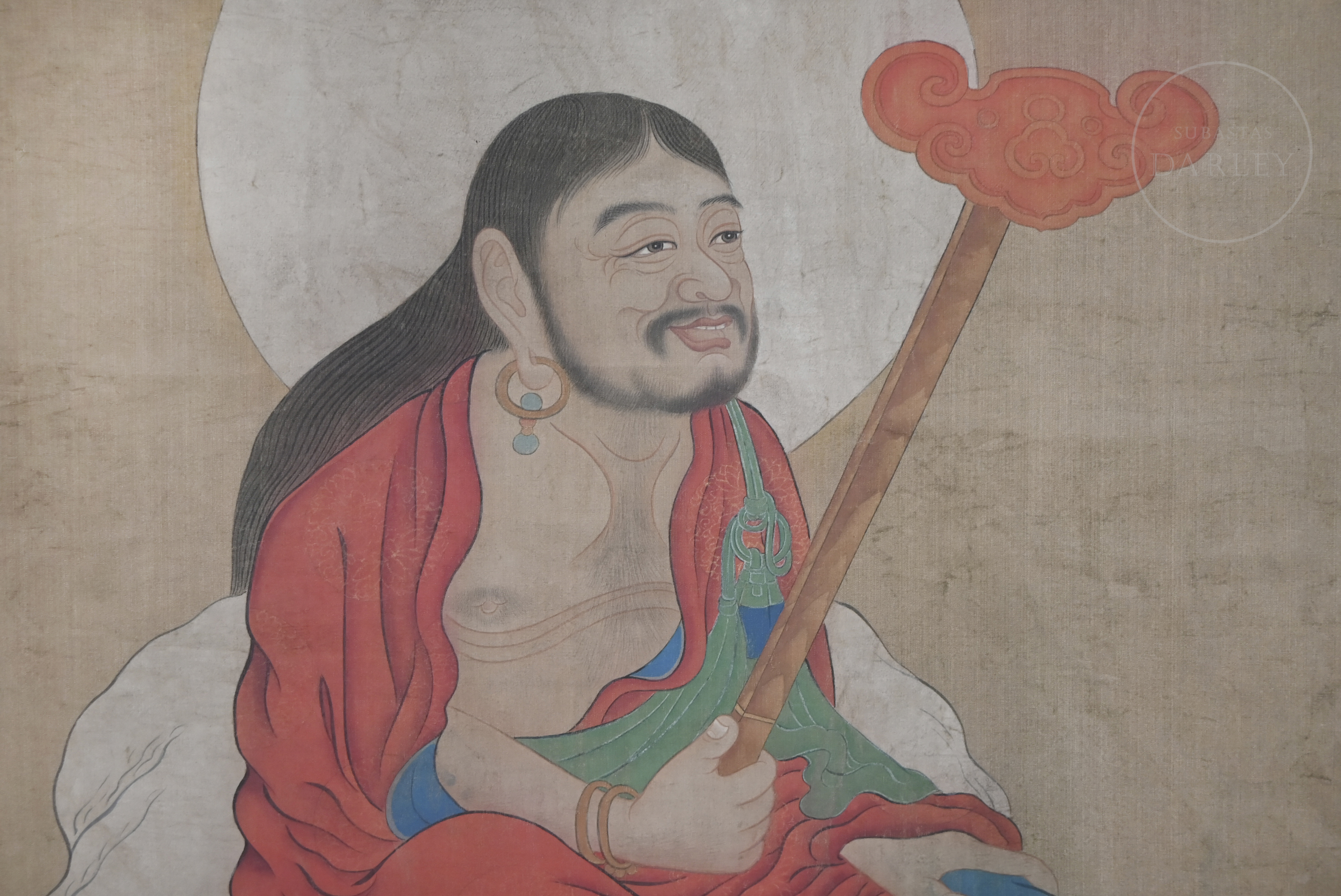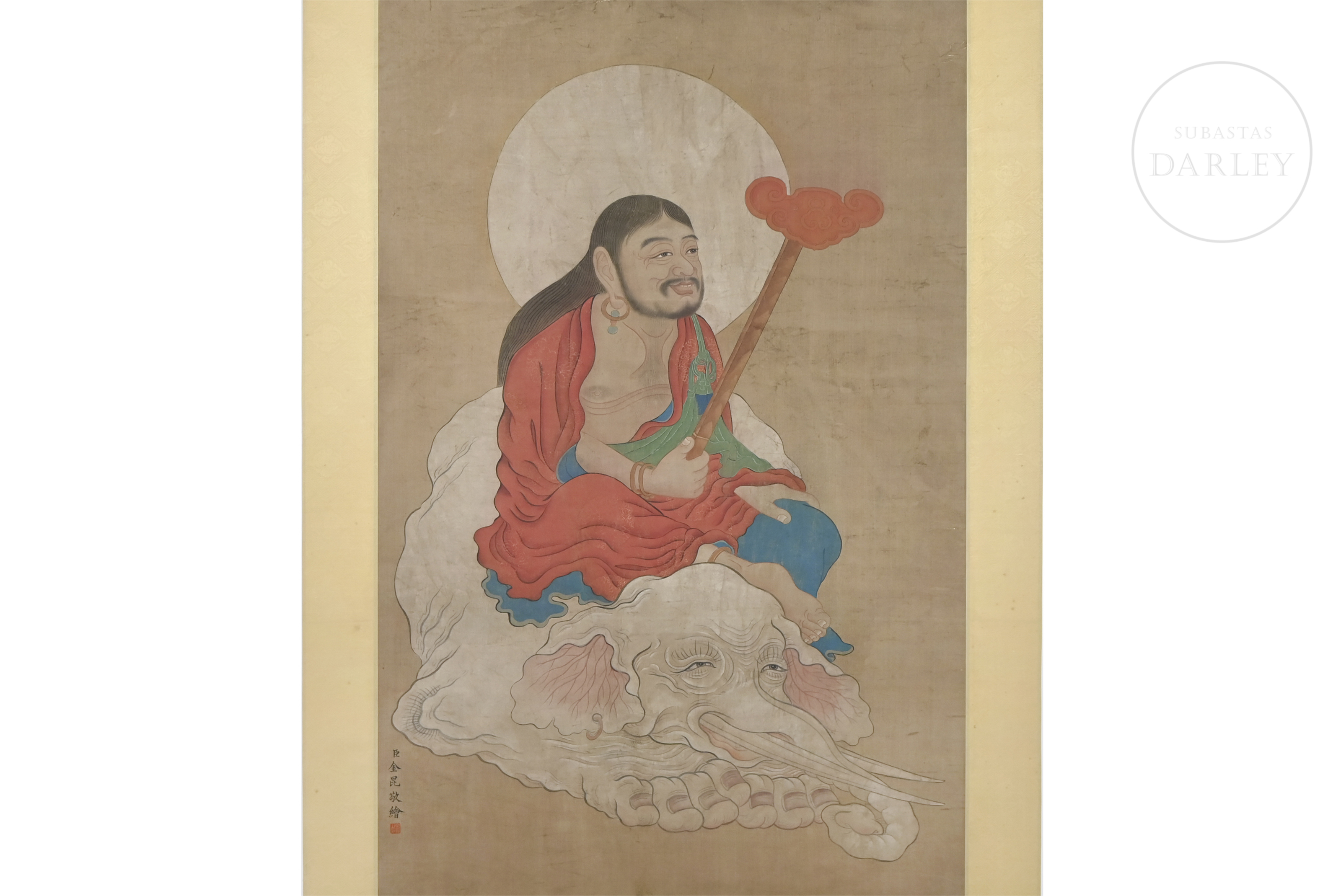 Inicio > Venta Directa > Pintura Asiática > Pintura china “Deidad sobre elefante blanco”, con firma Jin Kun