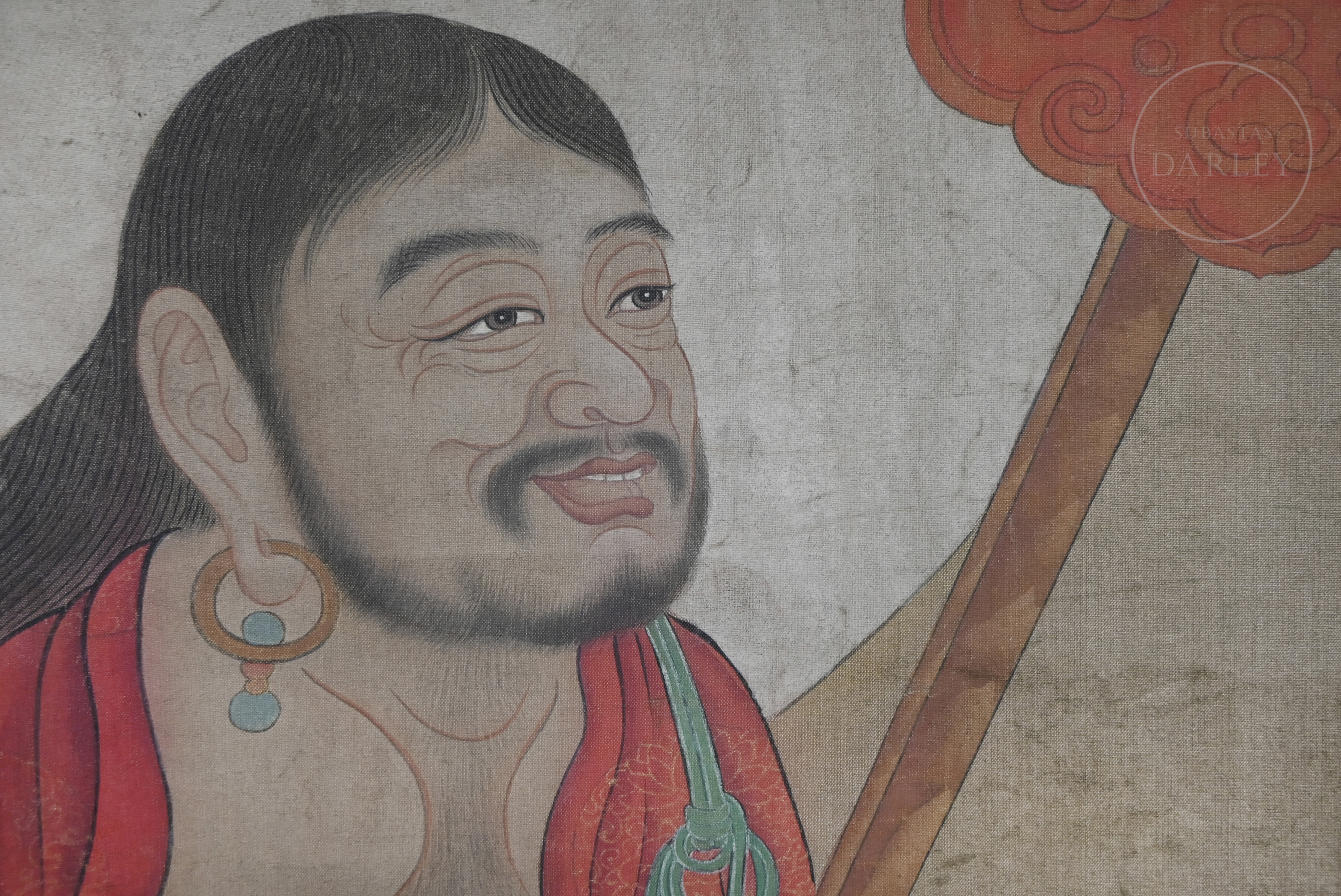 Pintura china “Deidad sobre elefante blanco”, con firma Jin Kun