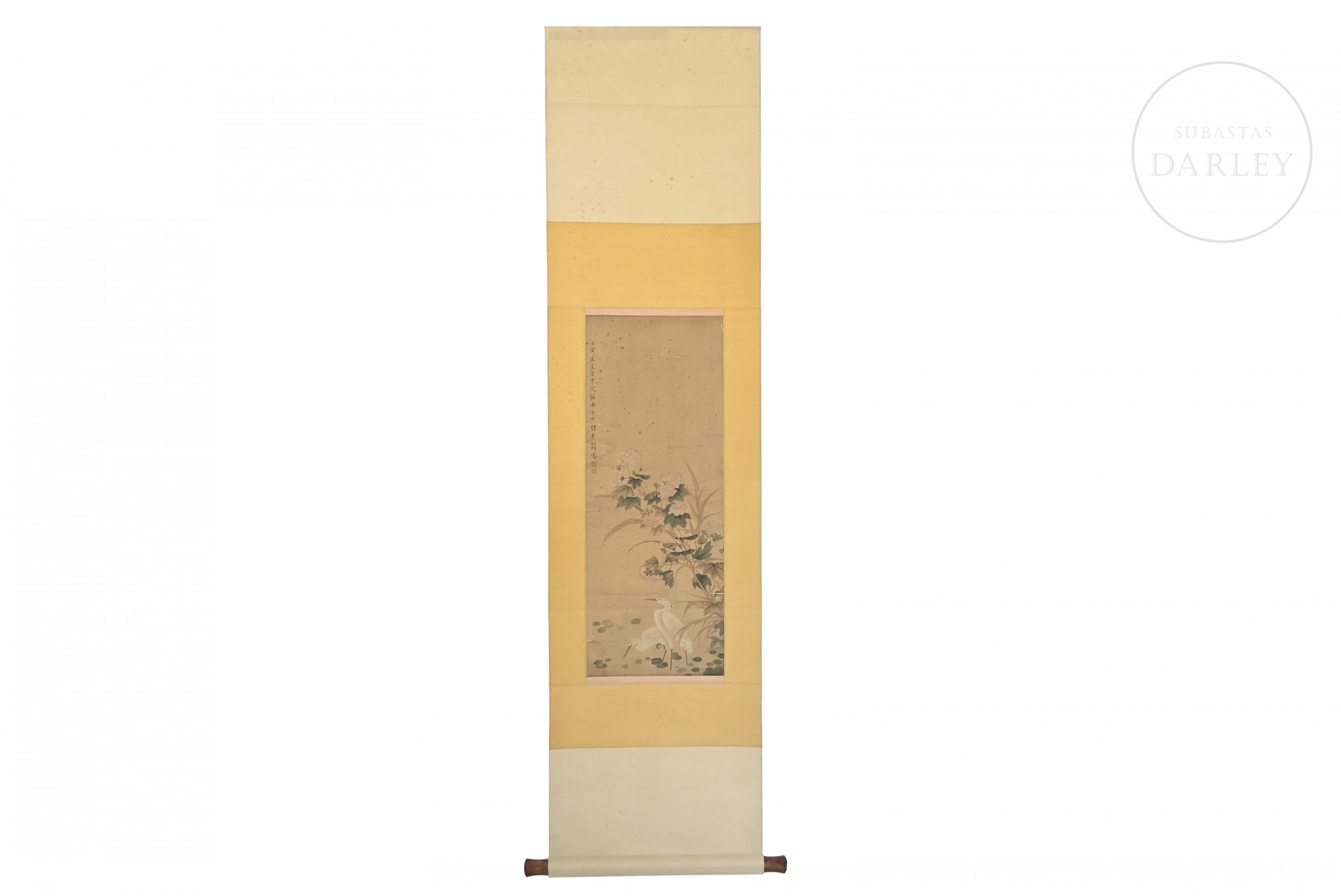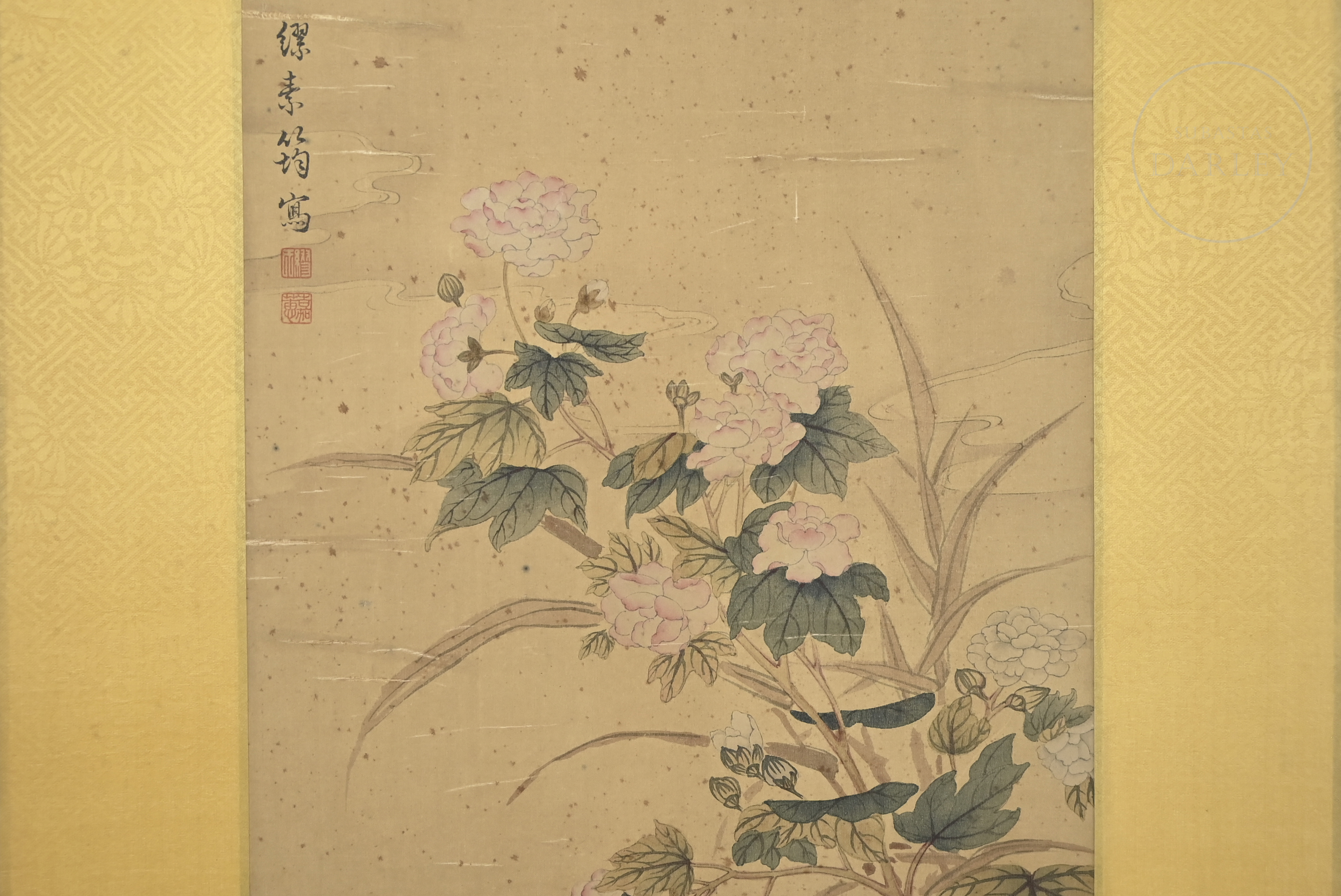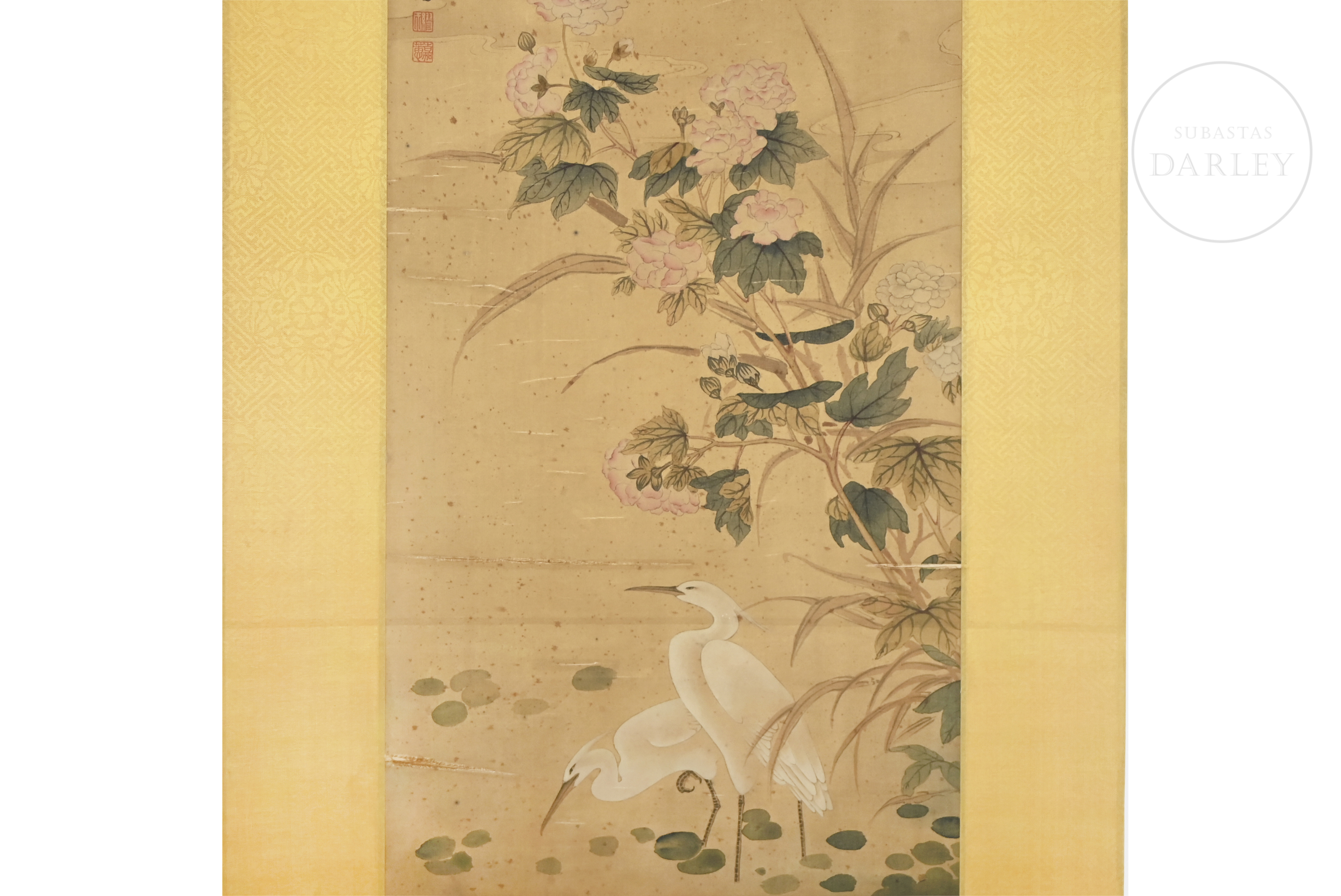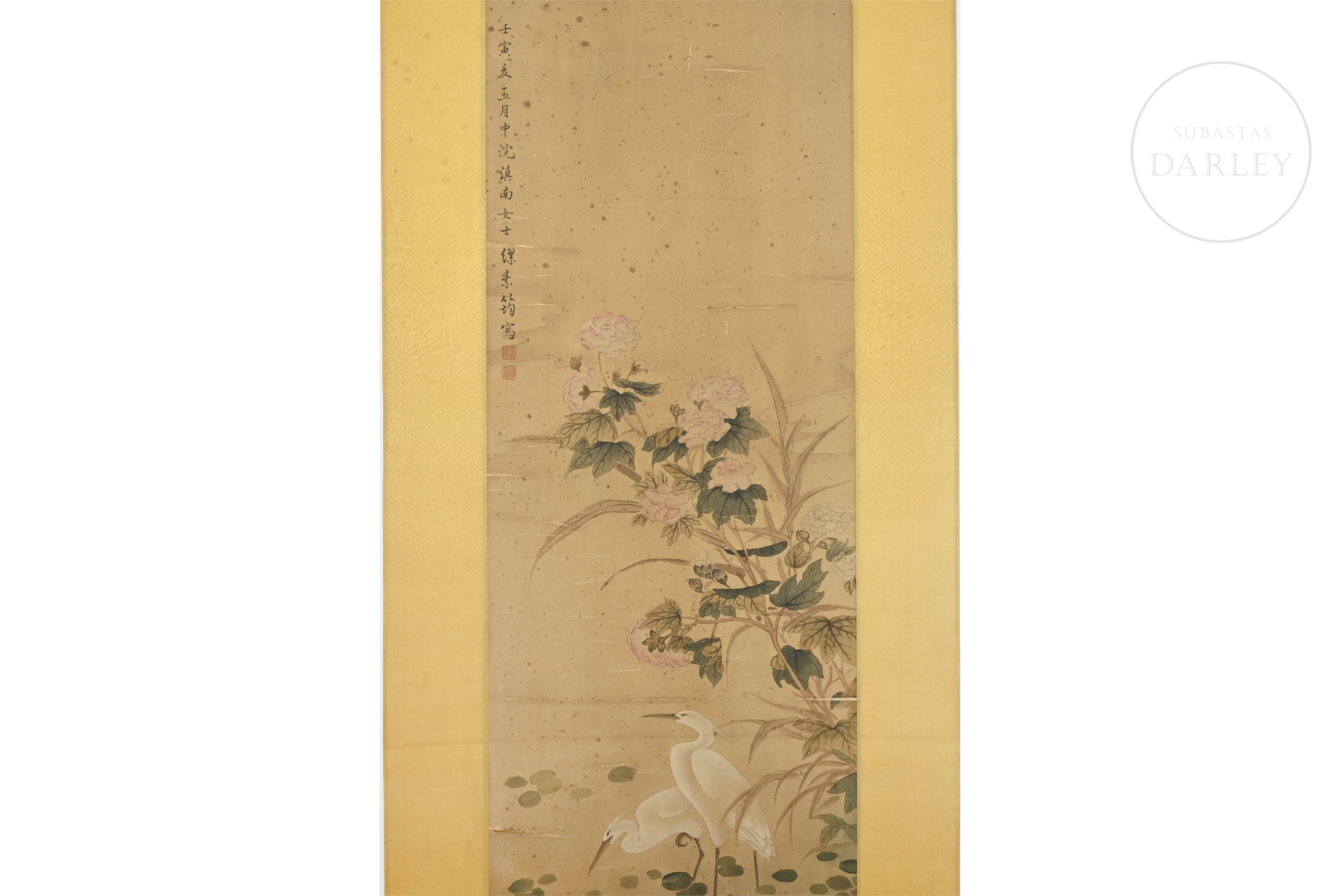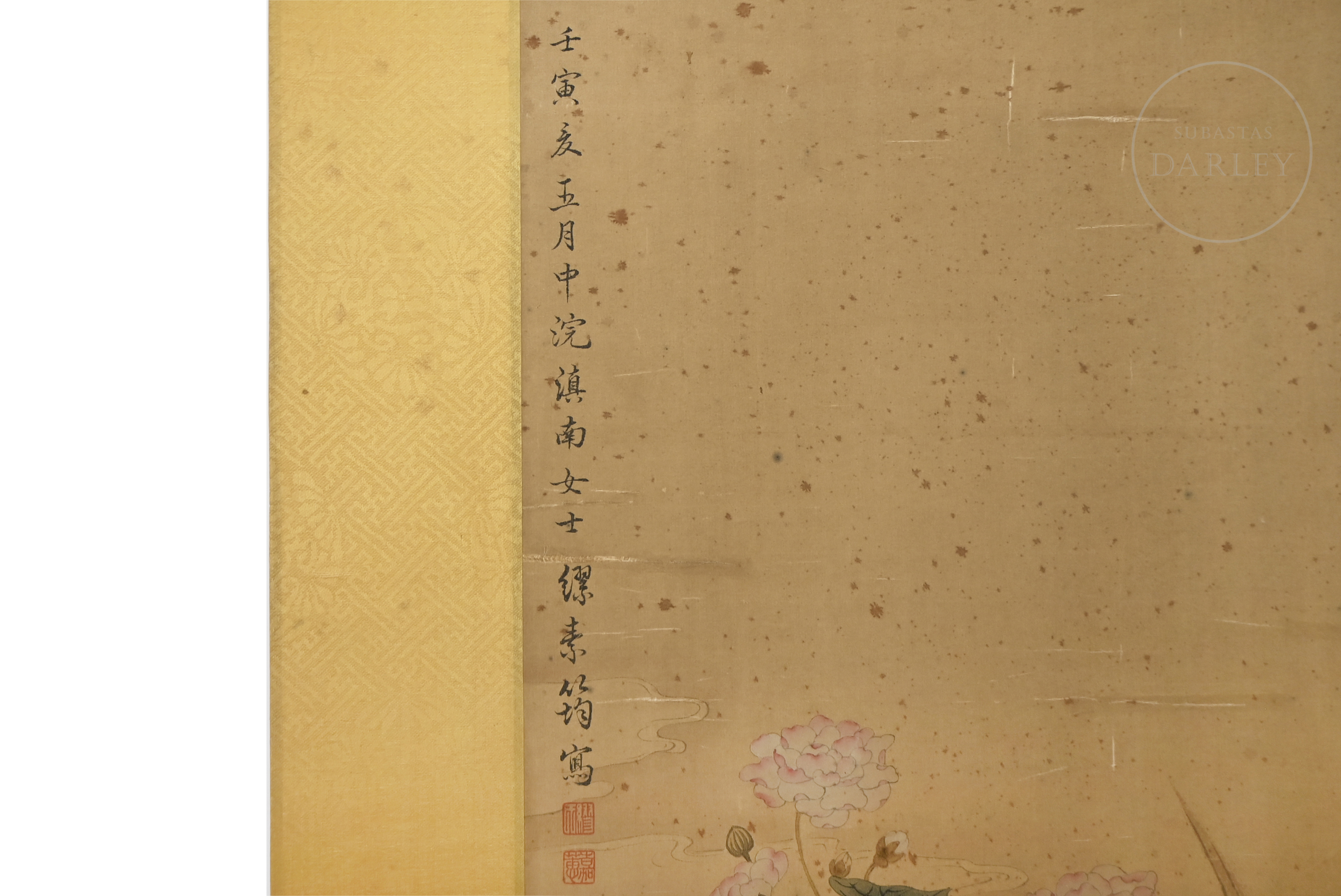 Tinta y pigmentos sobre seda. Representa dos garzas a orillas de un estanque, entre nenúfares y peonías en flor. En la parte superior izquierda figura una inscripción: "壬寅夏五月中涴滇南女士", seguida de la firma "缪嘉蕙" y dos sellos rojos: (缪素) y (嘉蕙). Miao Jiahui (1842-1918).