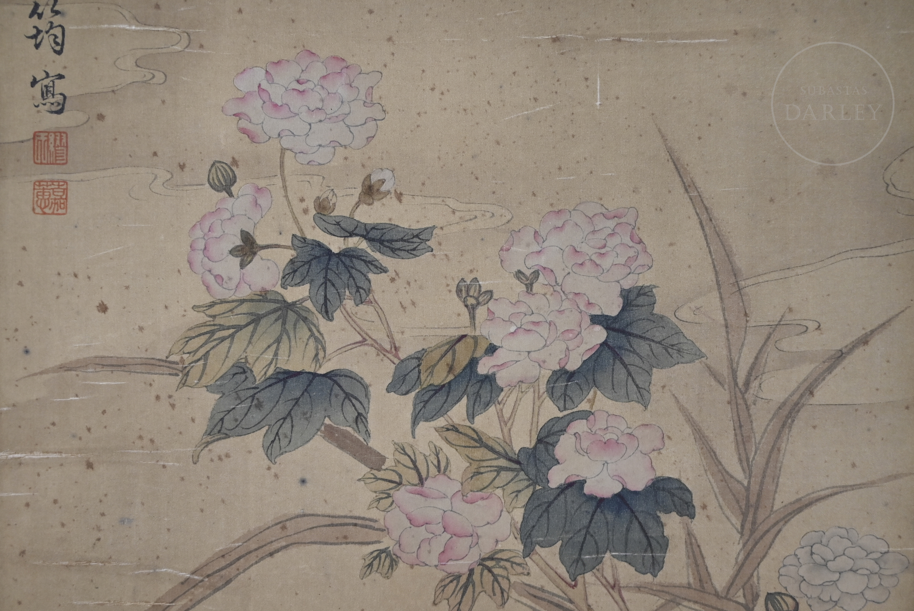 Inicio > Venta Directa > Pintura Asiática > Pintura china "Garzas y peonías junto al estanque", con firma Miao Jiahui