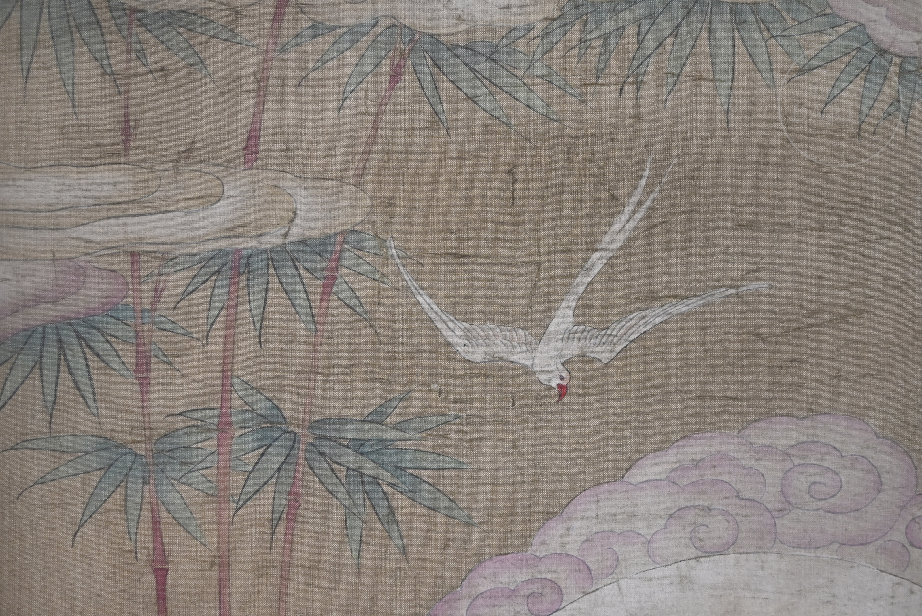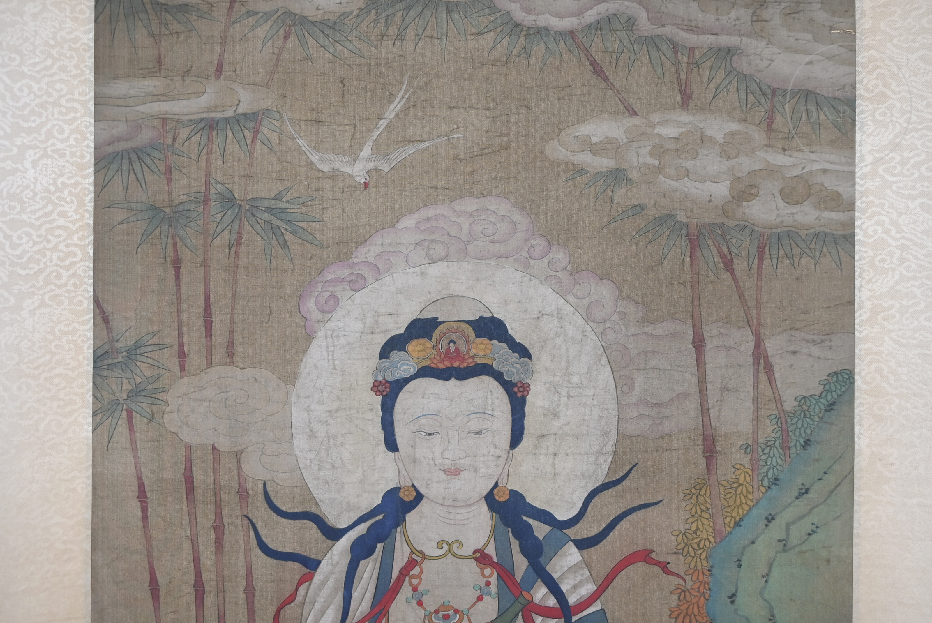 Pintura realizada en tinta y pigmentos sobre seda, montada en un marco de seda brocada. Representa a la bodhisattva Guanyin, sentada con porte sereno sobre un león celestial blanco, acompañada por un asistente infantil en primer plano. La escena se desarrolla en un paisaje de montañas y bambúes, con nubes estilizadas en el fondo. Presenta en el lateral izquierdo la inscripción "五云金礼瀛敬绘", junto al sello en rojo "金礼瀛印". Jin Liying (activo en el siglo XIX).