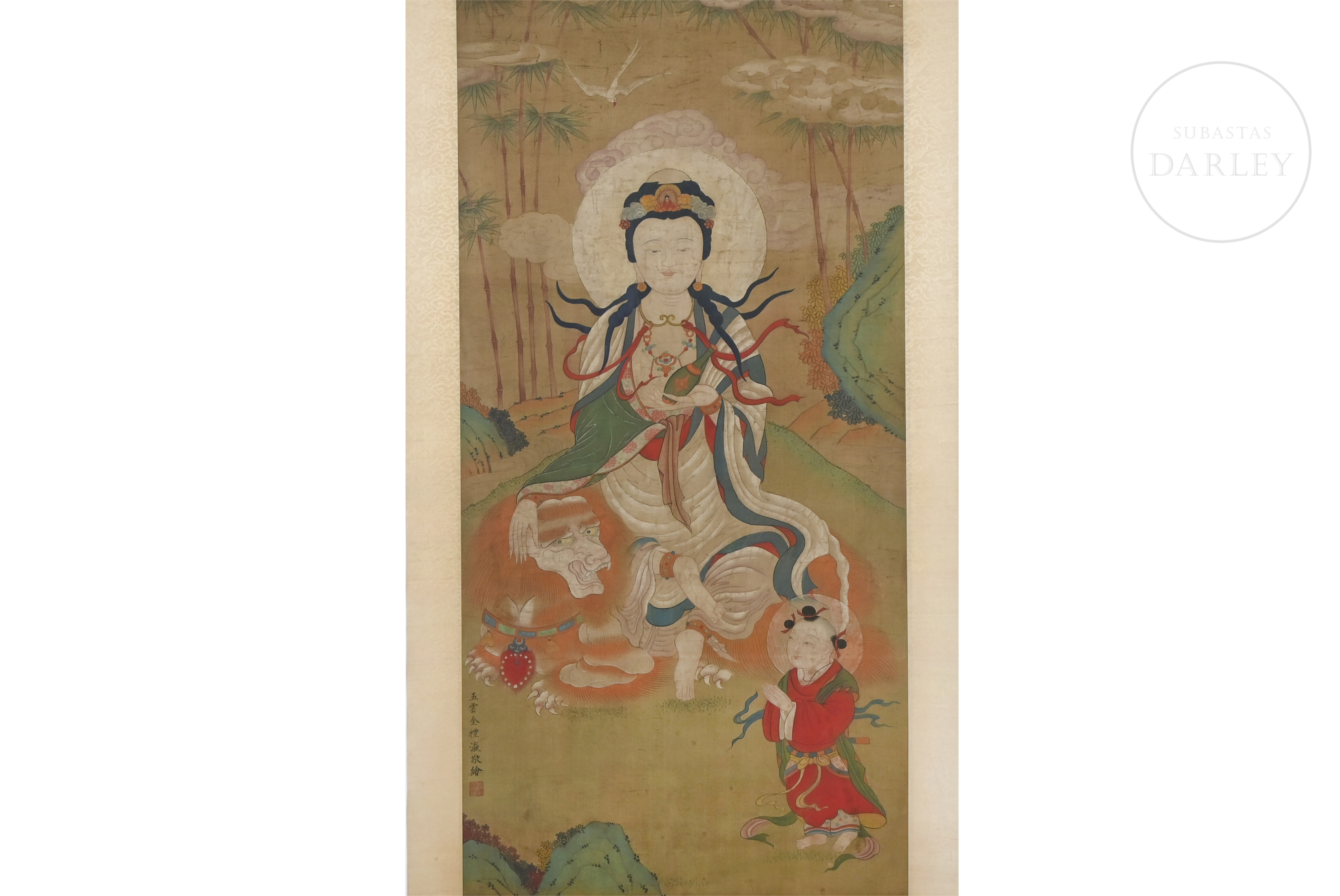 Inicio > Venta Directa > Pintura Asiática > Pintura china “Guanyin sobre león celestial”, con firma Jin Liying