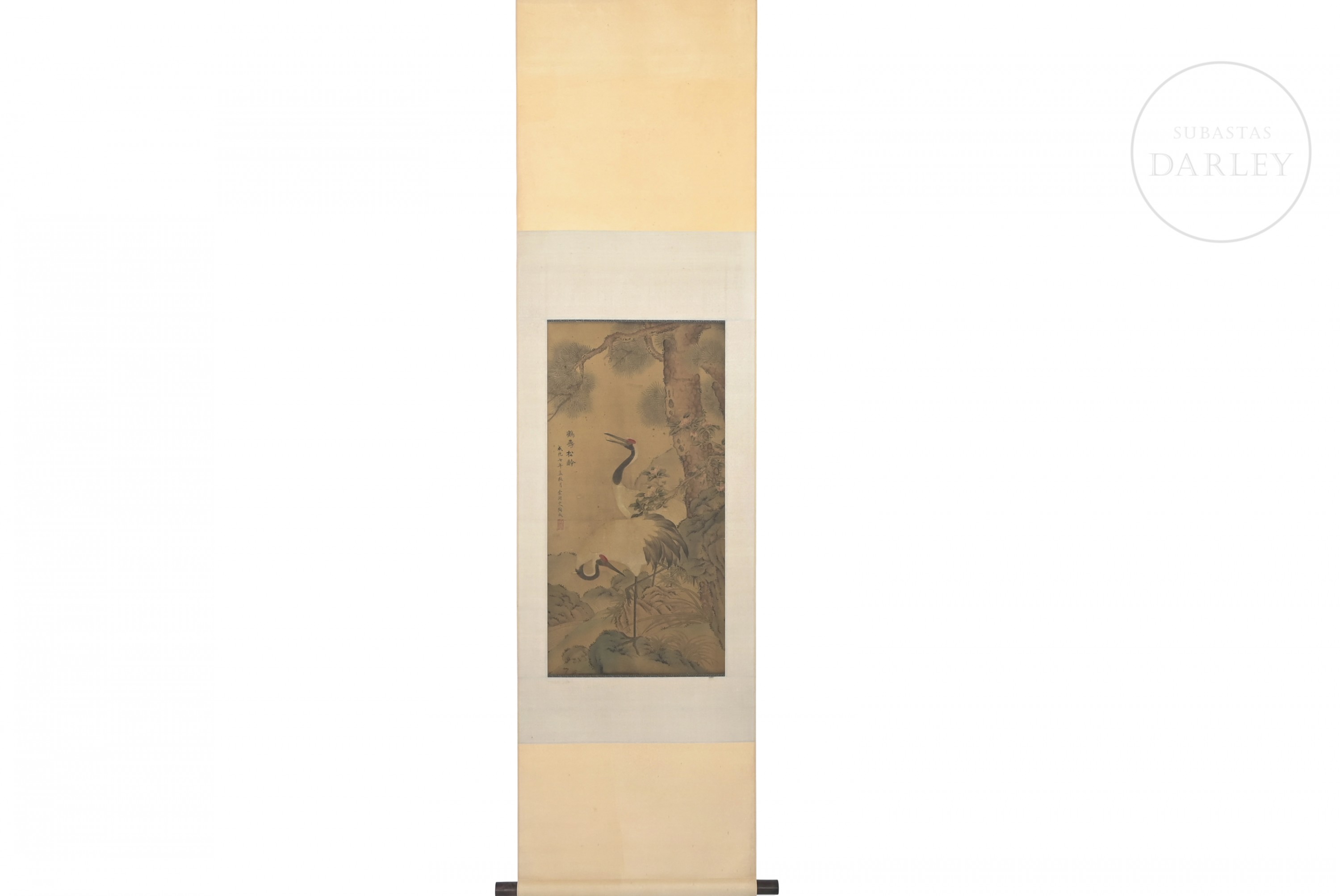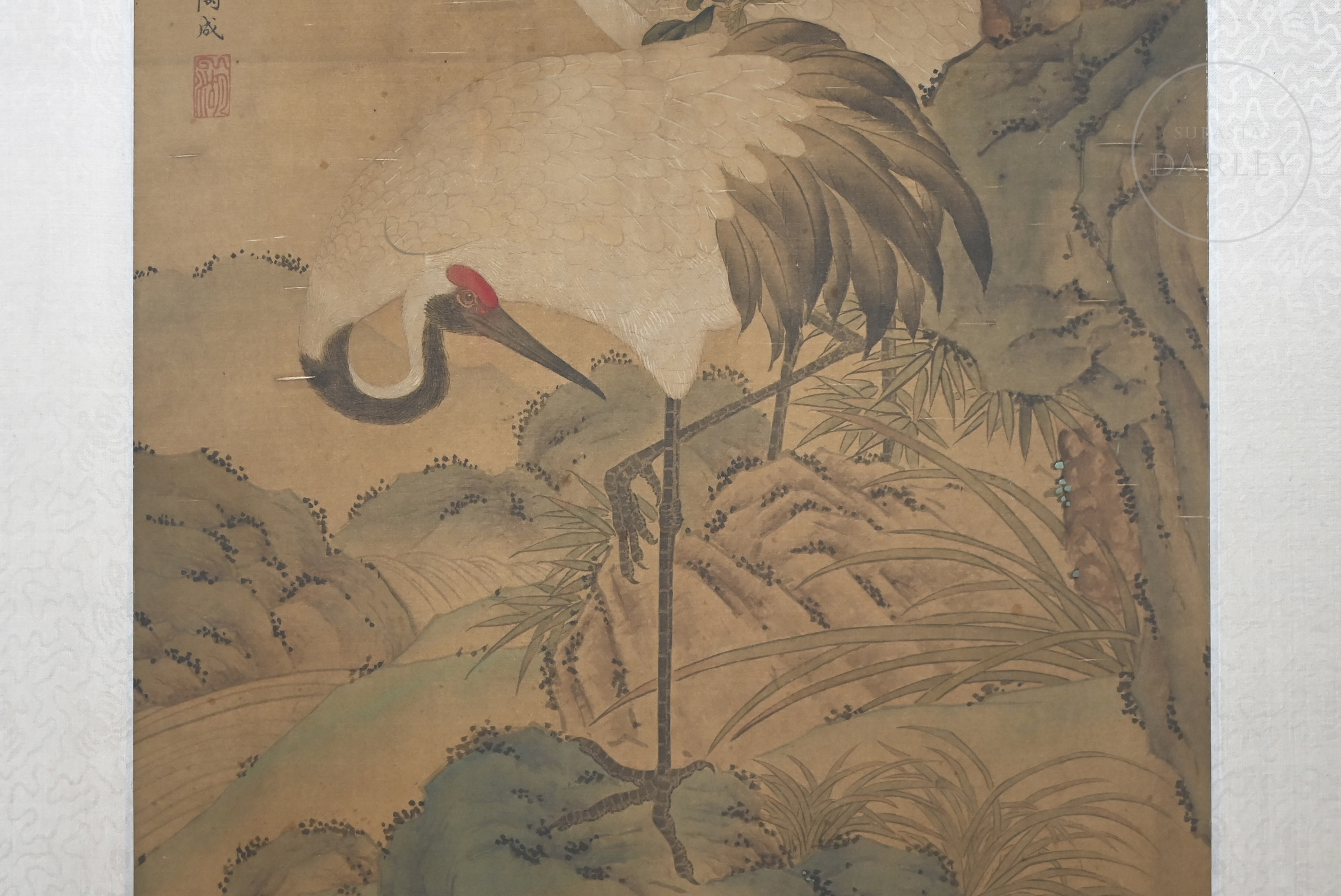 Inicio > Venta Directa > Pintura Asiática > Pintura china "Longevidad, la grulla y el pino", con firma Tao Cheng