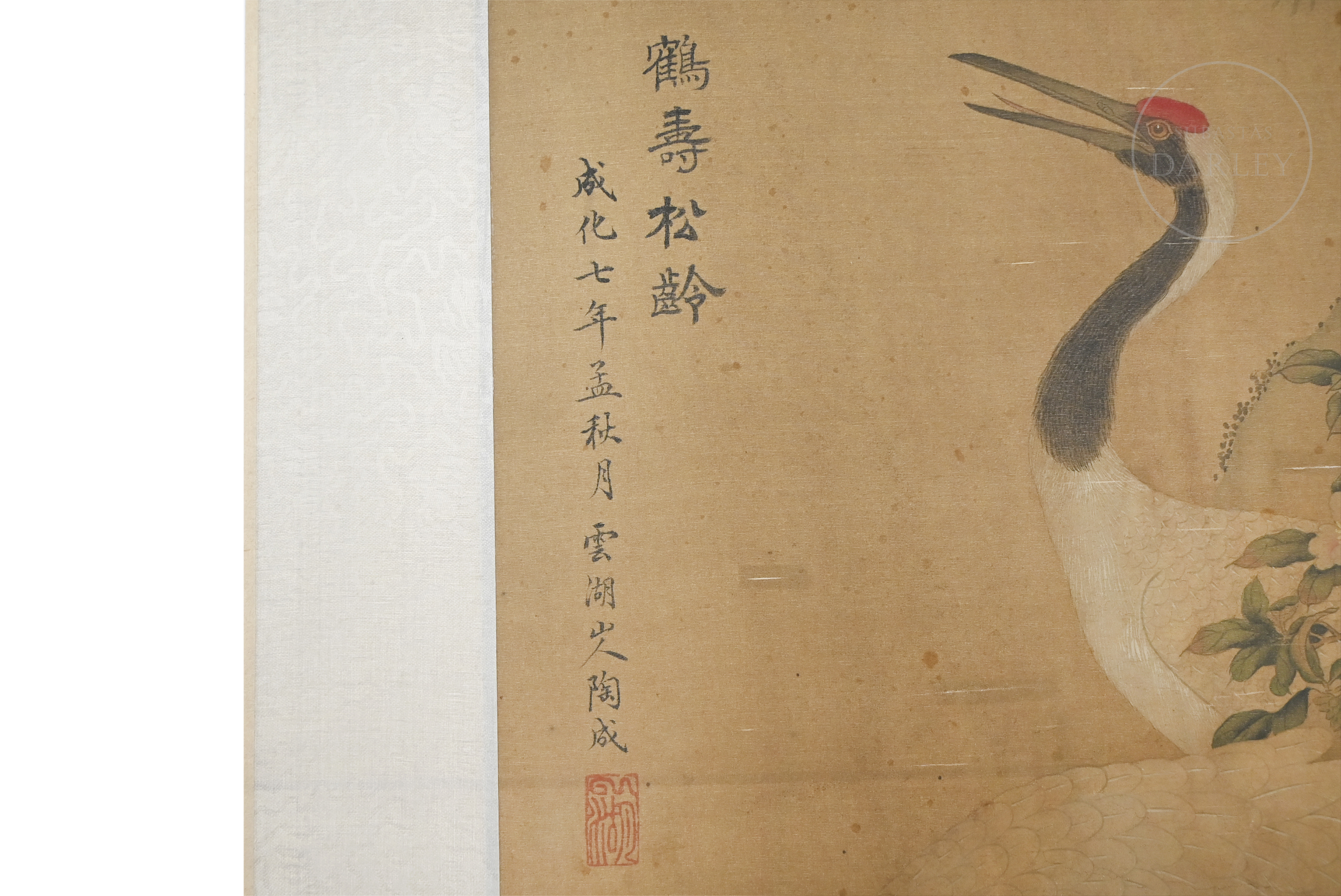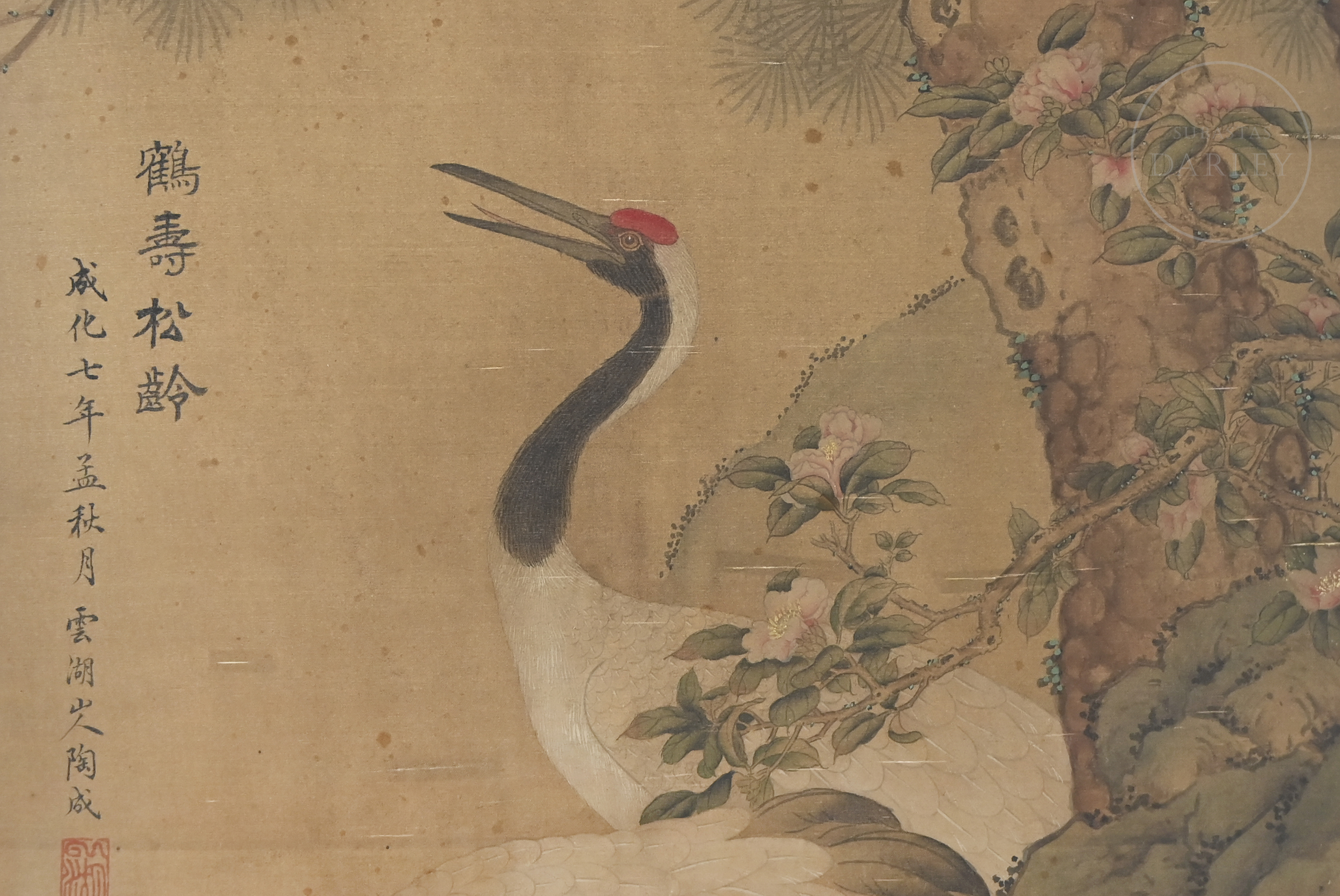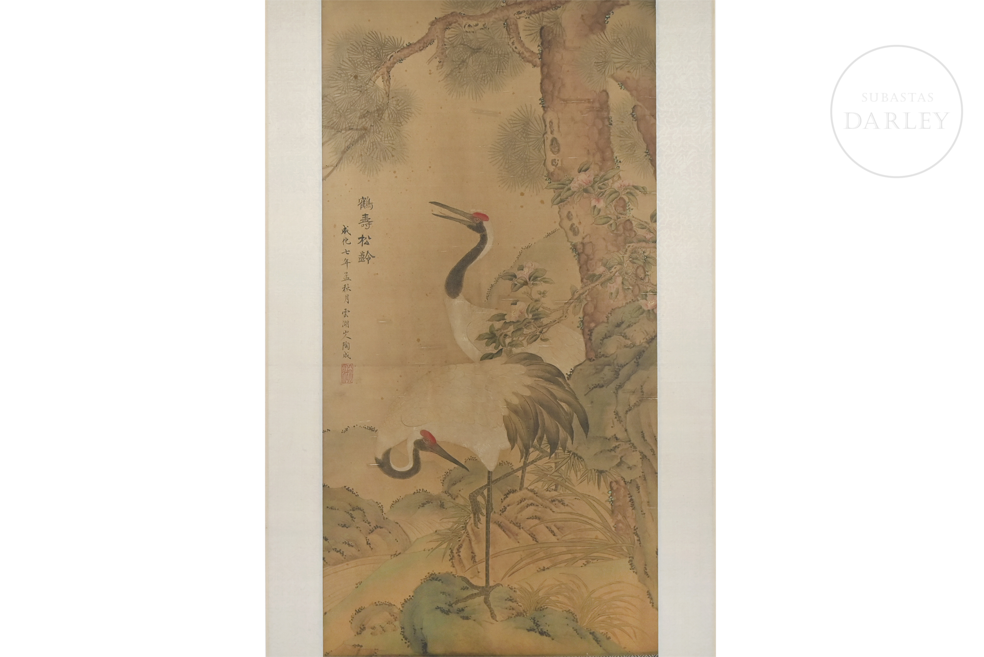 Tinta y pigmentos sobre seda, sobre marco de tela brocada. Representa dos grandes grullas bajo un pino, junto a un peñasco en el que florecen ramas de camelia, símbolos de longevidad y nobleza. En el margen izquierdo se dispone la inscripción "鹤寿松龄成化七年孟秋月云湖山人" junto a un sello rojo "云湖".