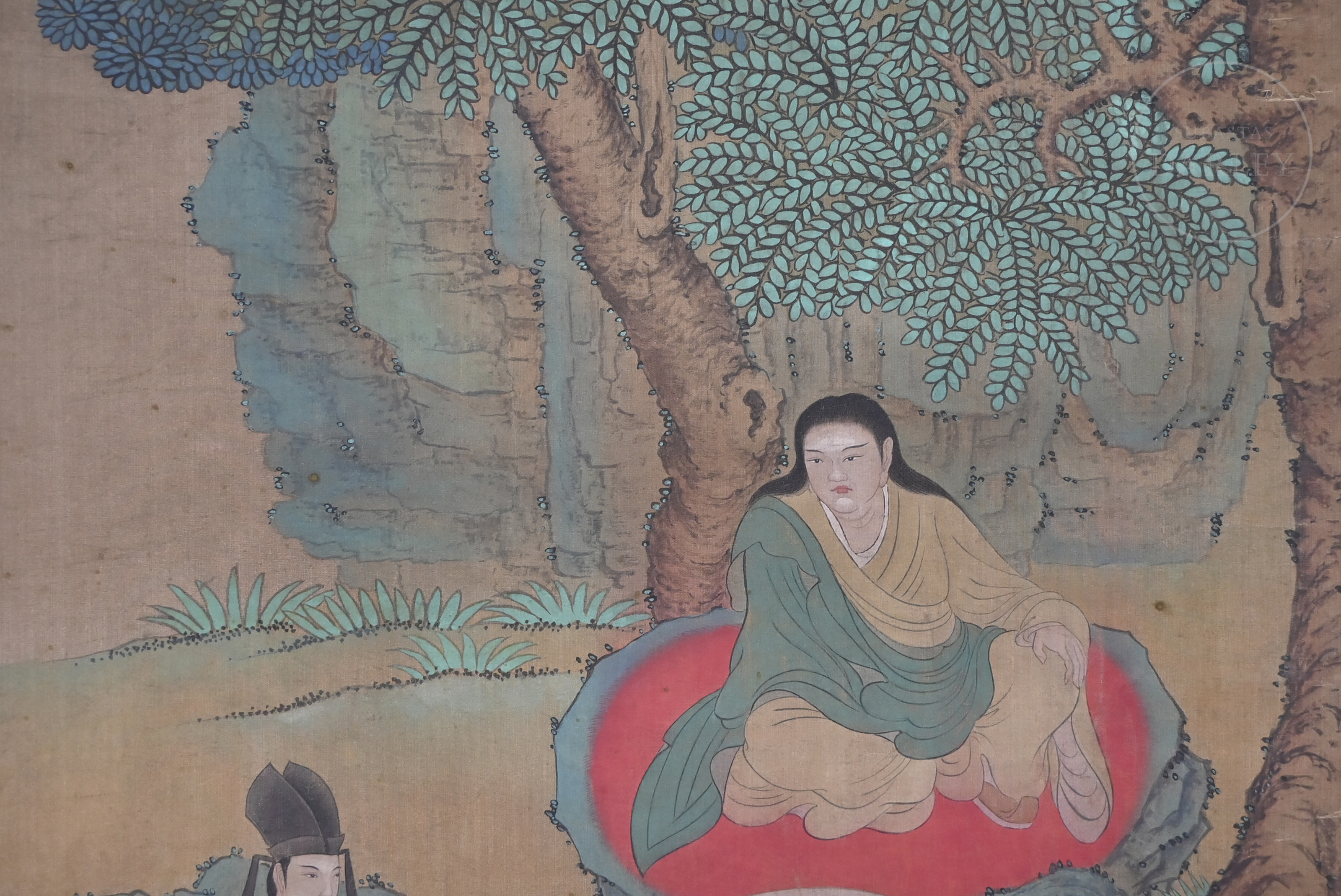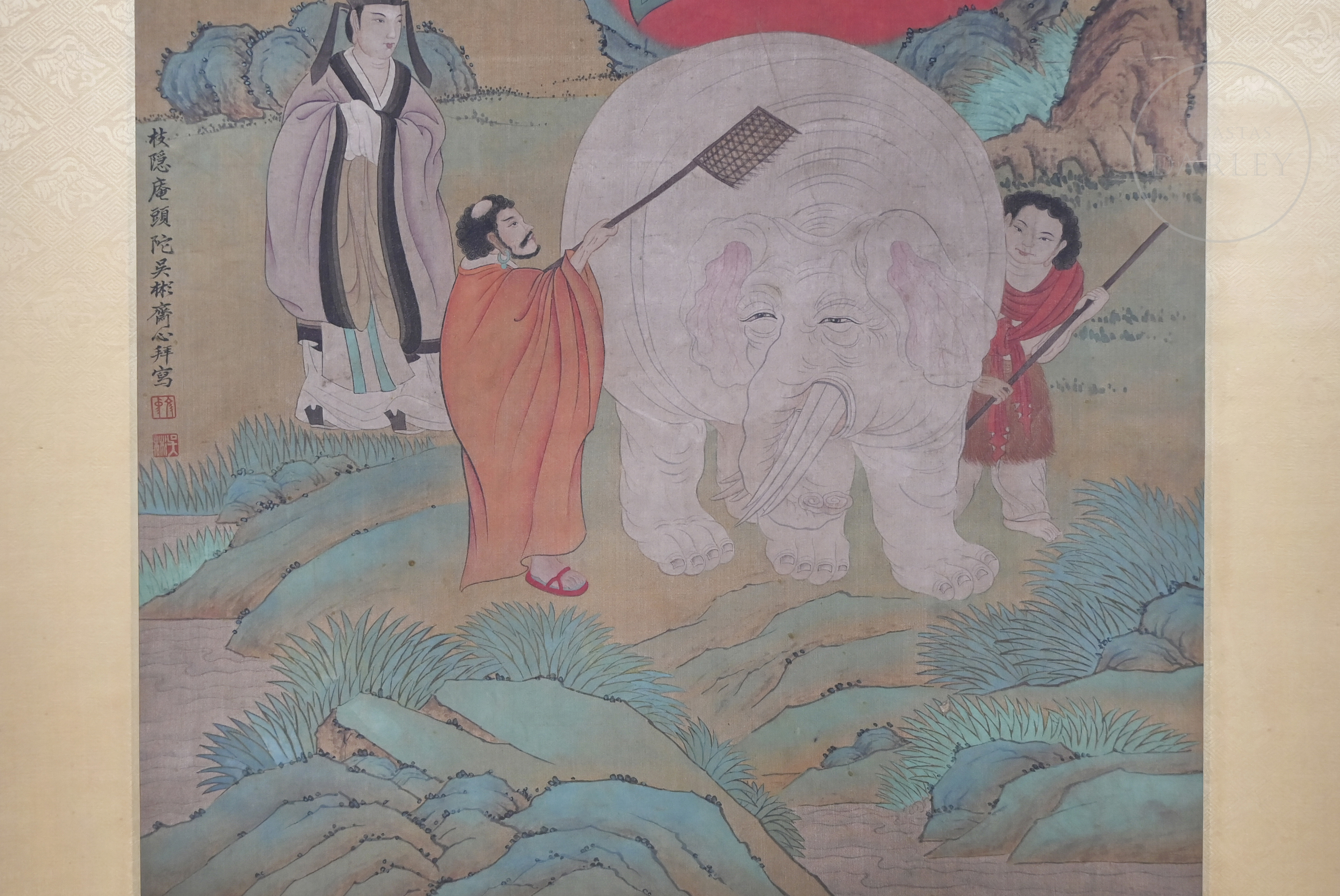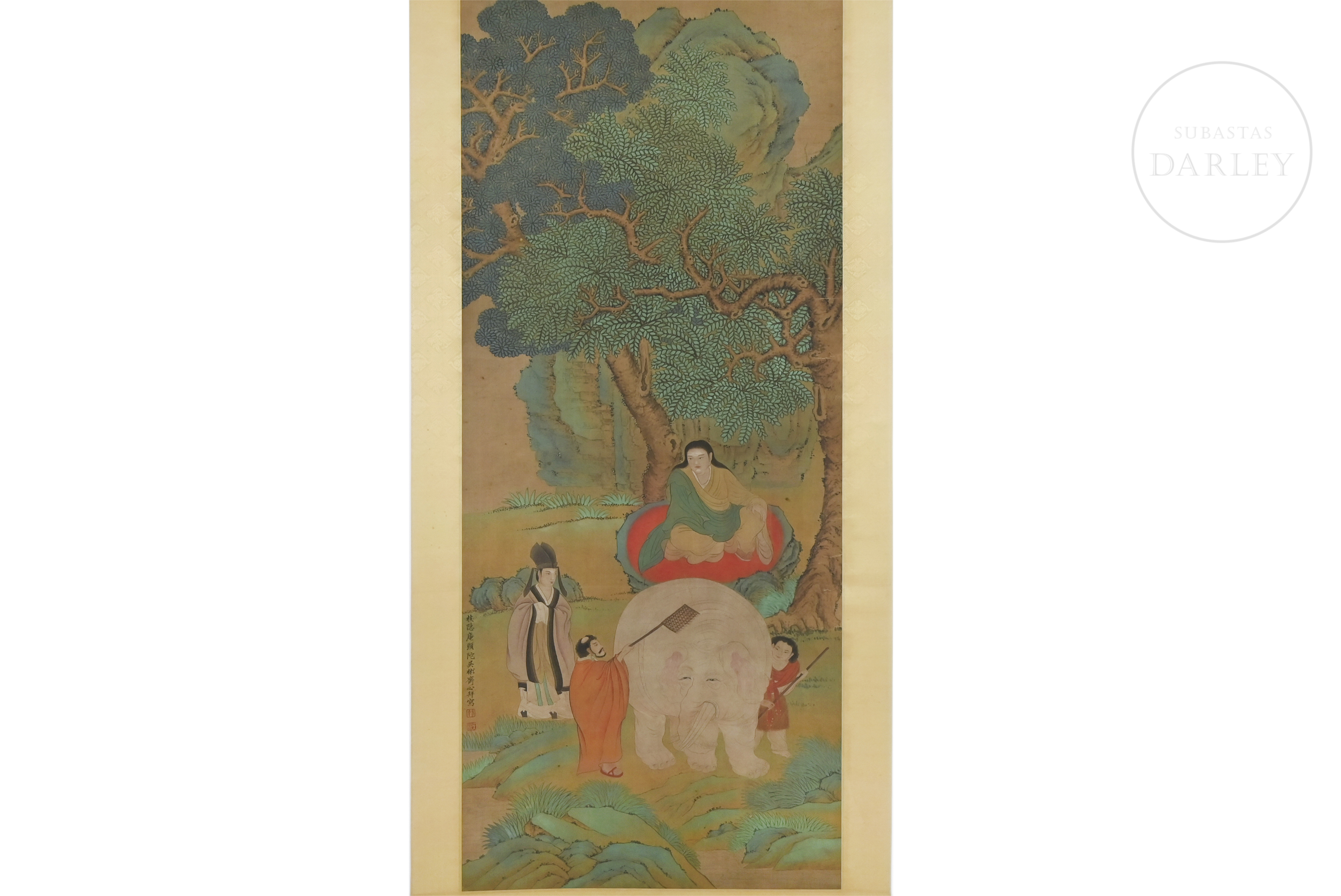 Pintura realizada en tinta y pigmentos sobre seda, montada en un marco de seda brocada. Representa a un monje sentado sobre un peñasco, bajo una frondosa arboleda; delante, un elefante blanco es guiado y atendido por jóvenes acólitos mientras un tercer personaje observa la escena. Presenta en el lateral izquierdo la inscripción "枝隐庵头陀吴彬斋心拜心", junto a los sellos en rojo "文中" y "吴彬". Wu Bin (activo a finales de la dinastía Ming).