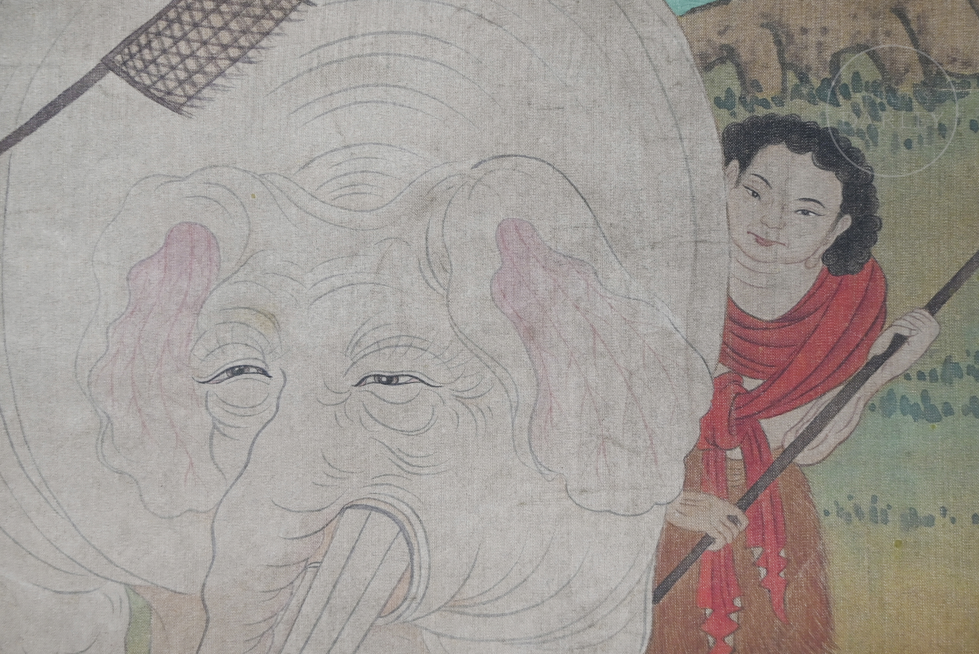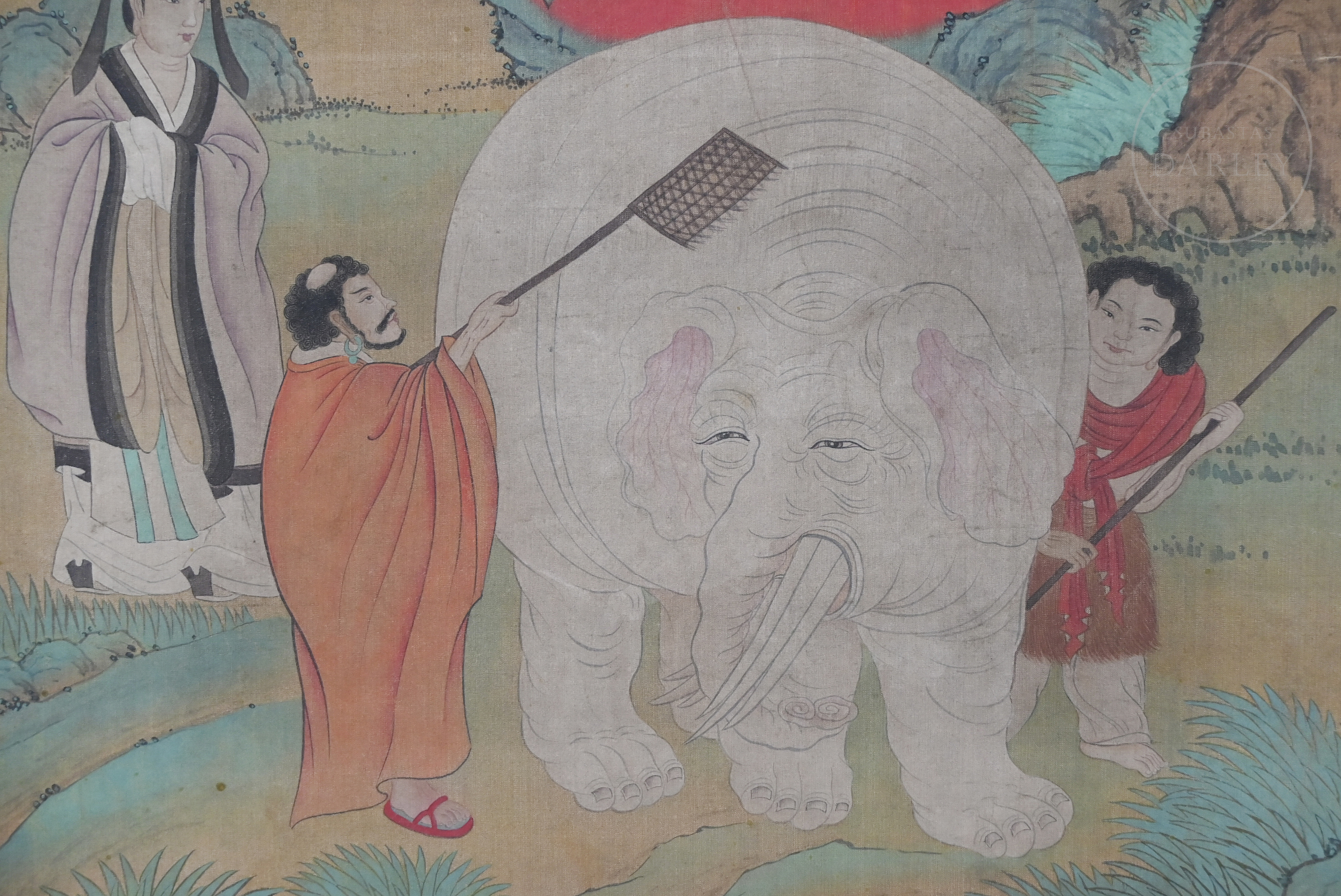 Inicio > Venta Directa > Pintura Asiática > Pintura china “Monje con elefante blanco”, con firma Wu Bin