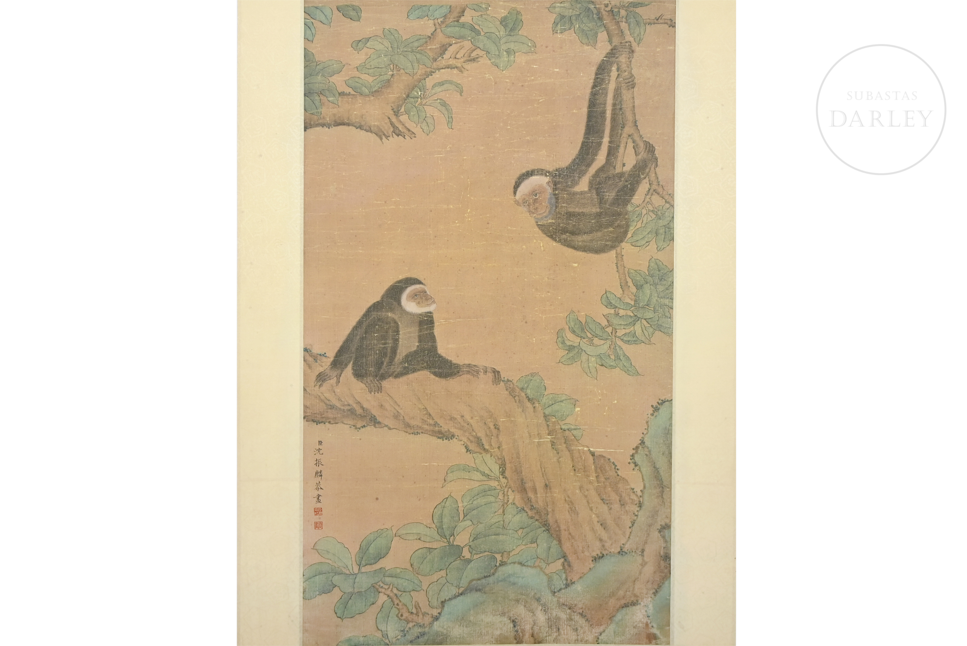 Pintura realizada en tinta y pigmentos de color sobre seda, montada en un marco de seda de tonos claros. La composición muestra dos monos sobre ramas de árbol, uno en reposo y otro colgado de las ramas, en un entorno vegetal descrito con pinceladas fluidas y tonos verdosos. Presenta inscripción "臣沈振麟恭画" junto a dos sellos en rojo "臣沈振麟" y "恭画". Shen Zhenlin (1820-1890) o posterior.