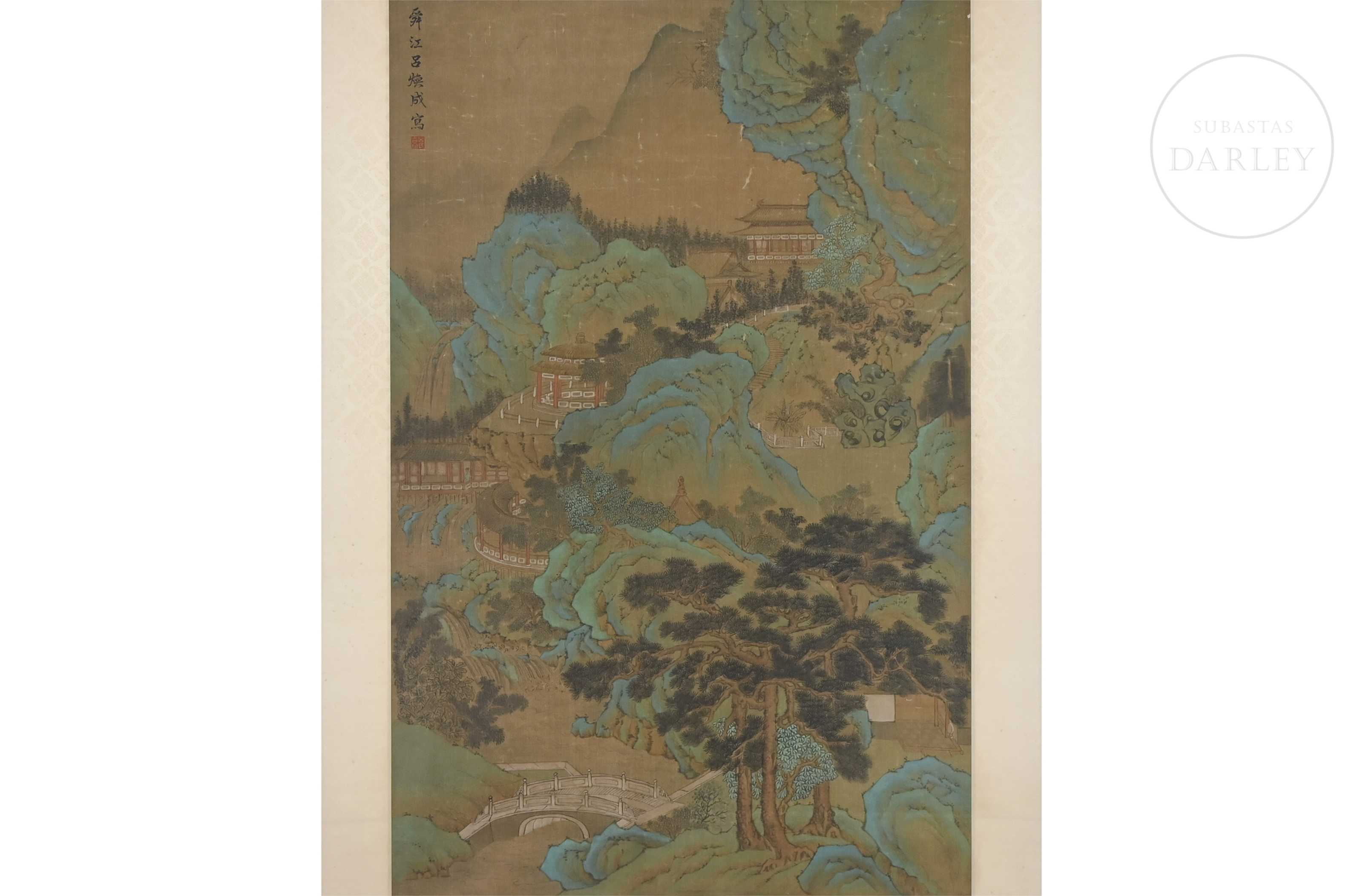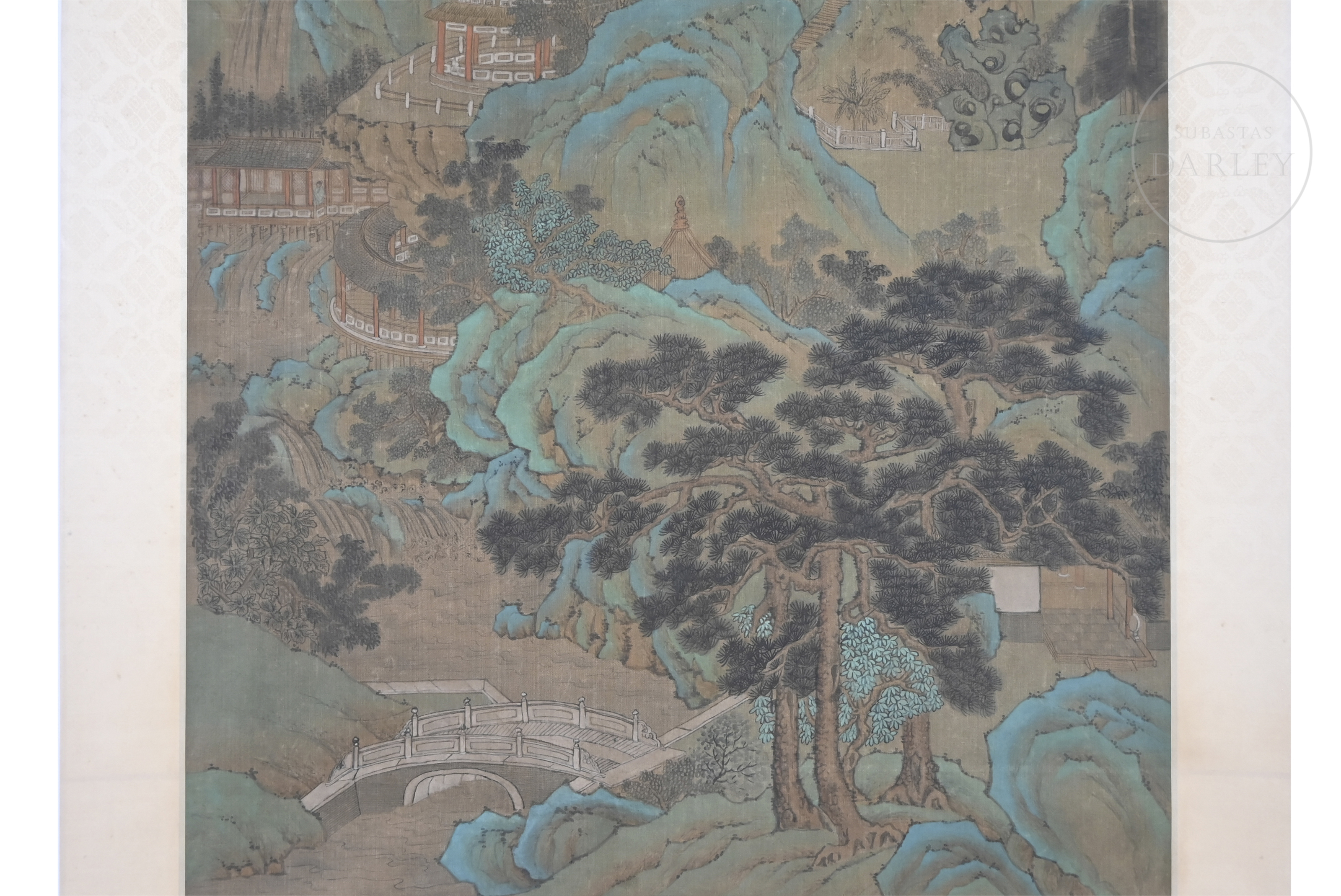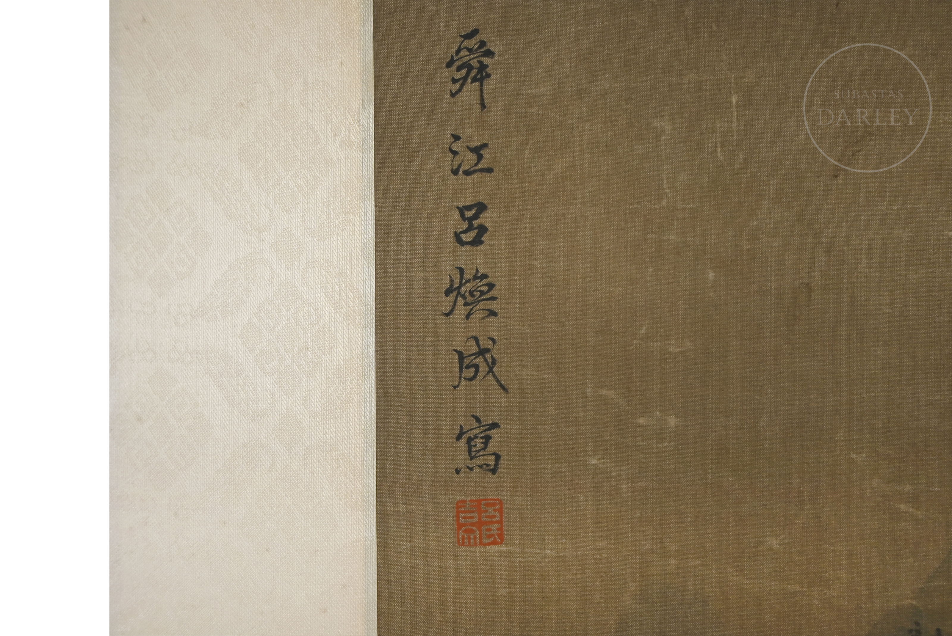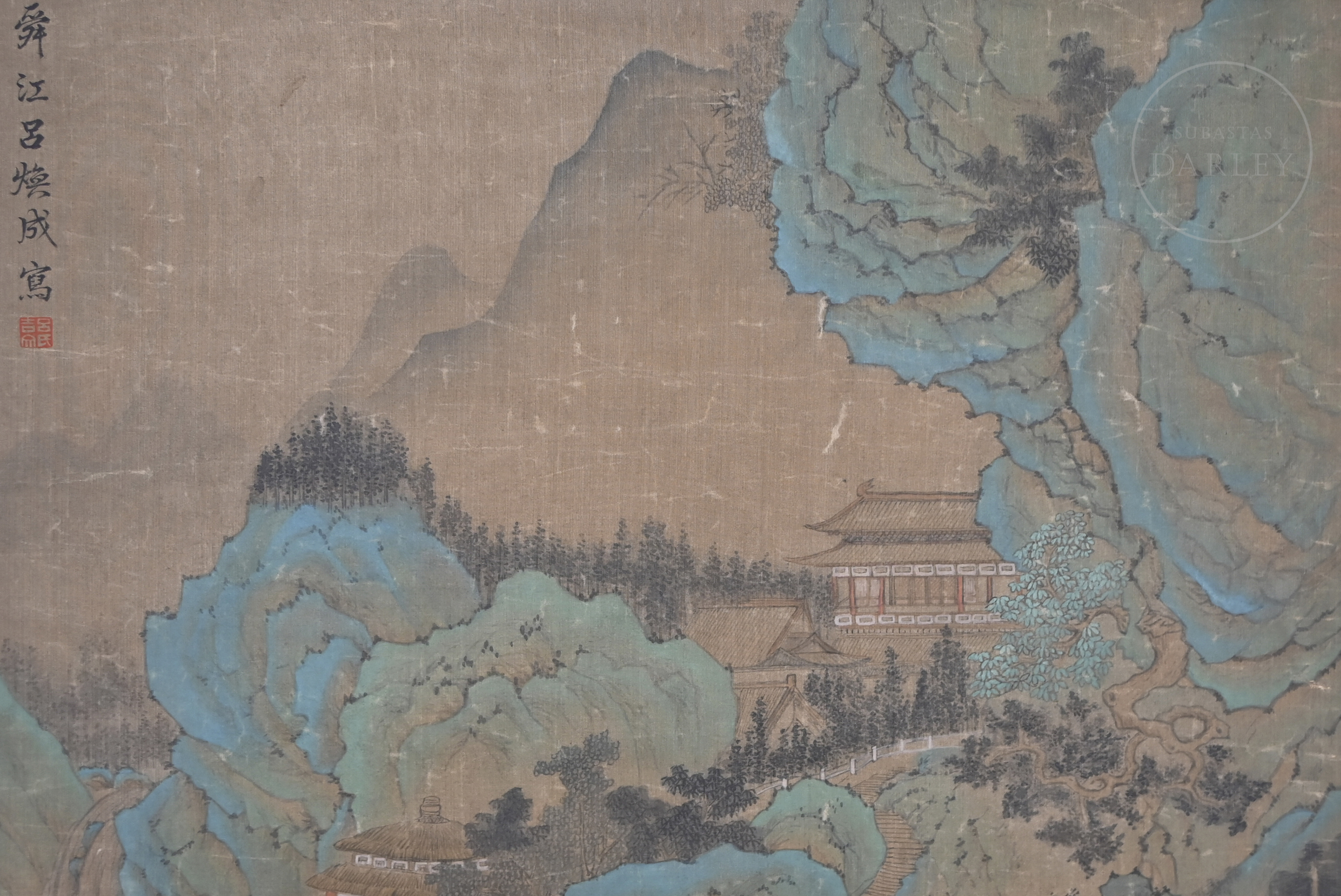 Pintura realizada en tinta y pigmentos sobre seda, montada en un marco de seda brocada. Representa un paisaje montañoso recorrido por un río, en el que se aprecian arquitecturas entre la vegetación y un puente de piedra en primer plano. Presenta en la parte superior izquierda la inscripción "舜江吕焕成写", junto al sello en rojo "吕氏吉印". Lu Huancheng (siglo XIX).