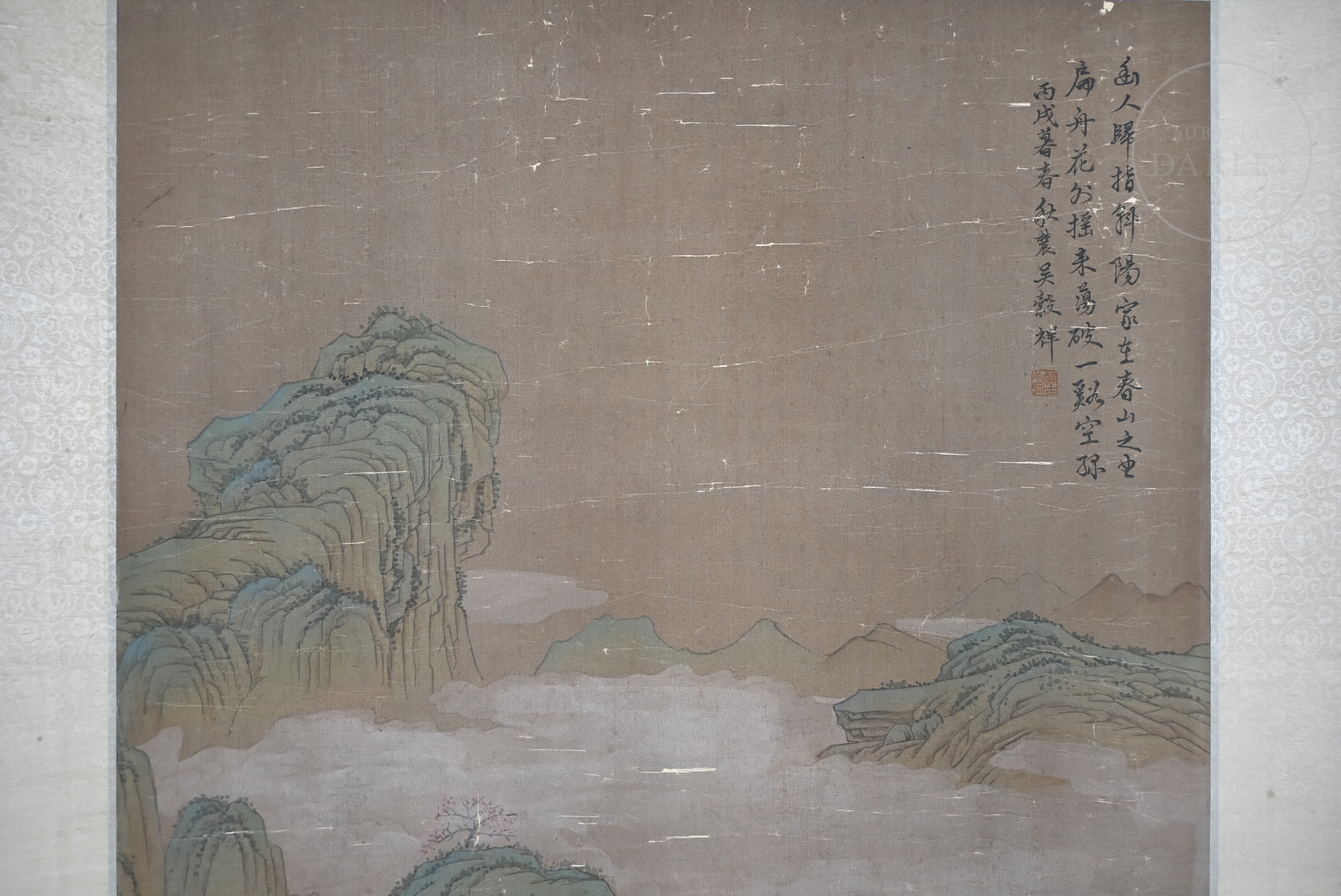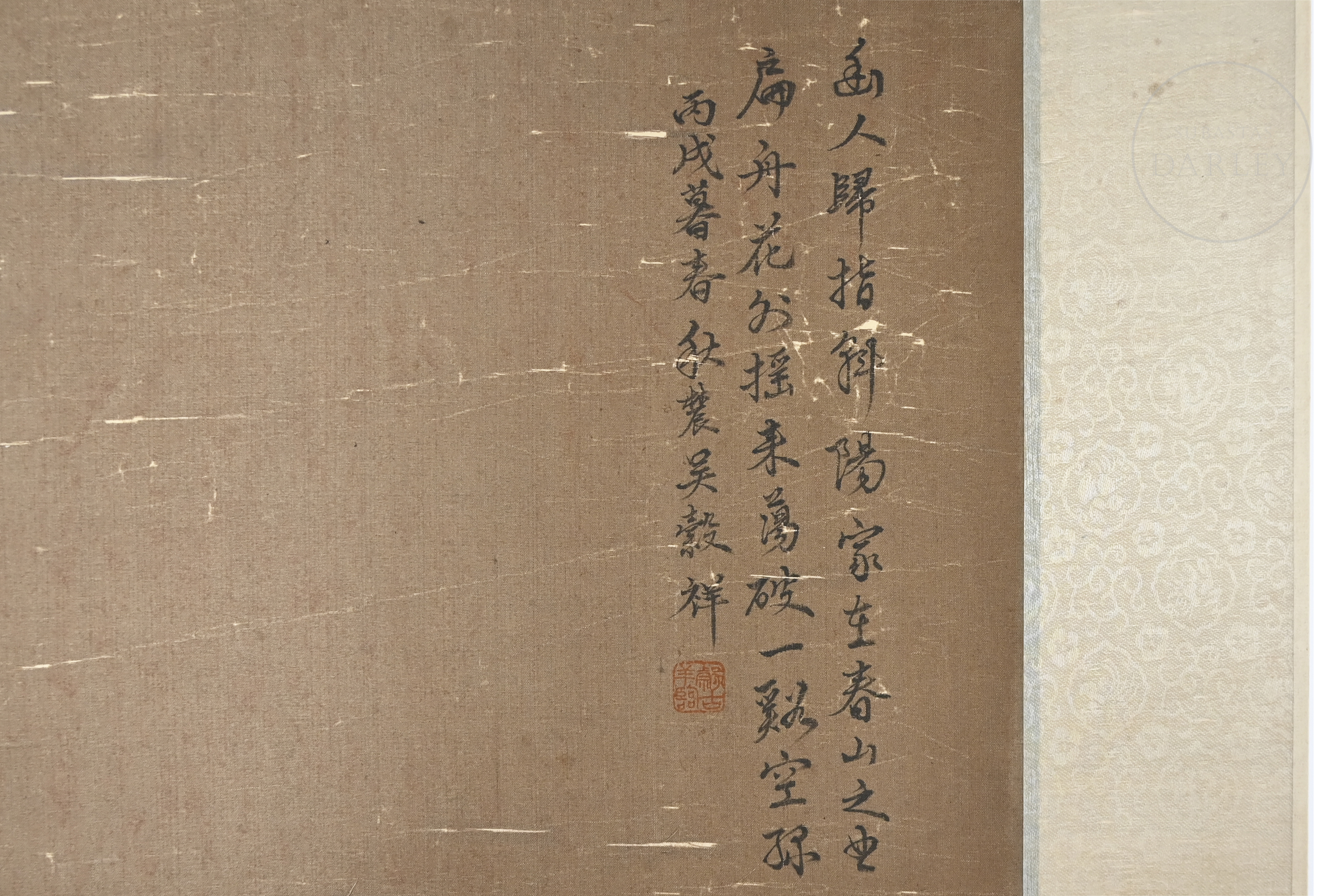 Pintura vertical sobre seda, realizada con pigmentos y tinta, que representa un paisaje montañoso con árboles frondosos, formaciones rocosas y nieblas que envuelven el valle. Presenta inscripción en la parte superior derecha: “幽人归指斜阳 家在春山之内 扁舟花外摇来 荡破一悉空弥 丙戌暮春秋农吴谷祥”, acompañada de un sello del artista (吴谷祥印). En la zona inferior izquierda se aprecia un sello de colección (俪荃鉴赏之章).
