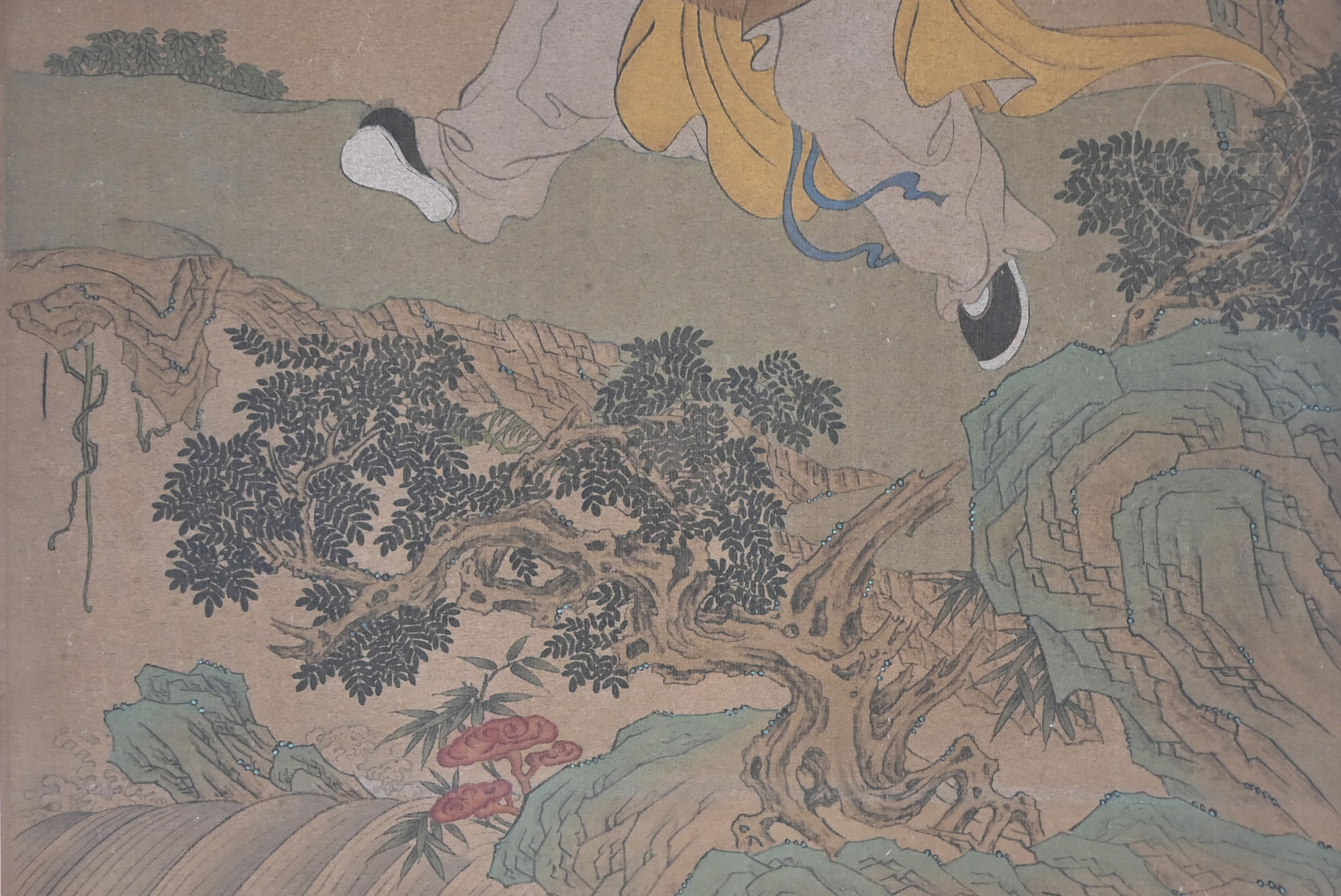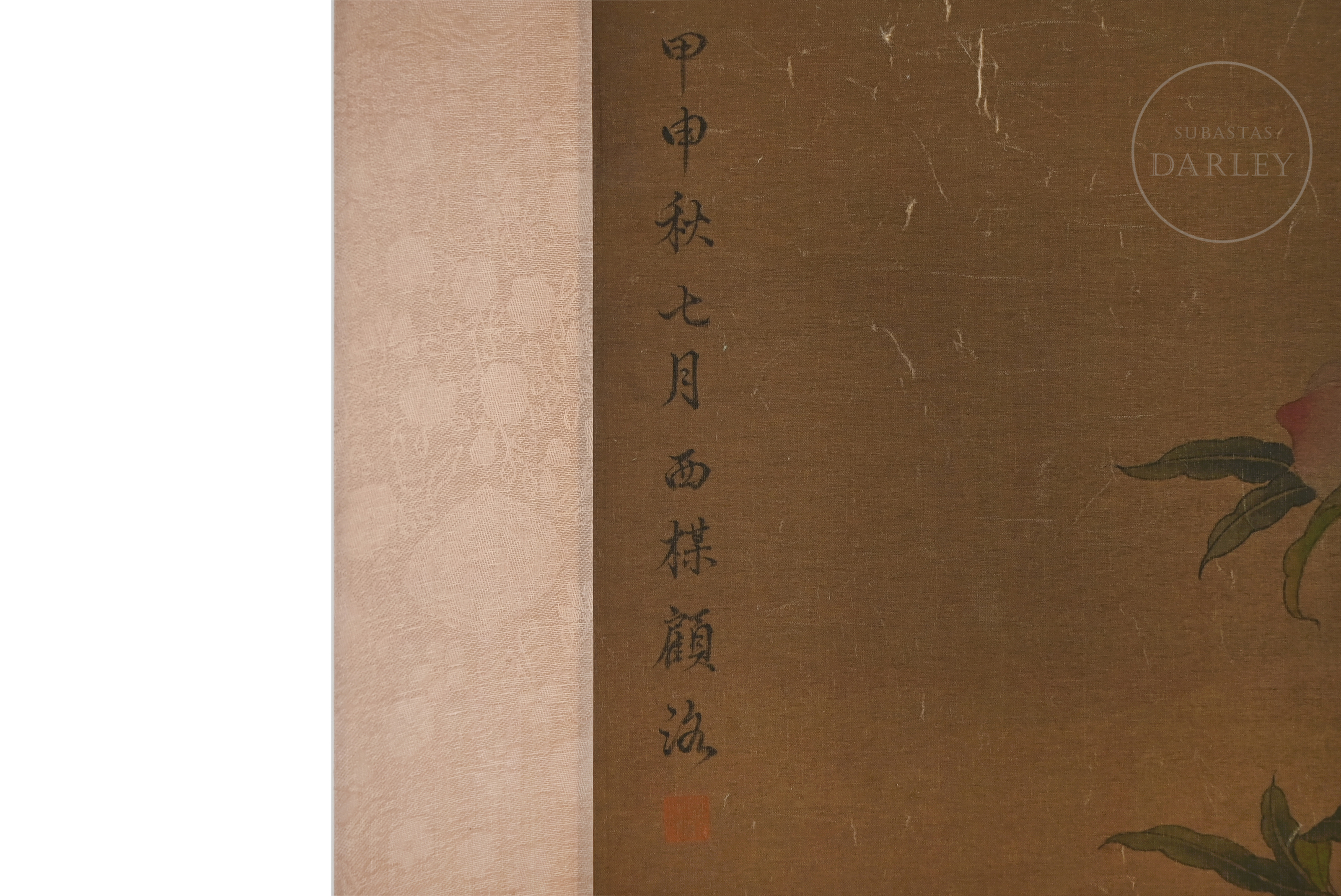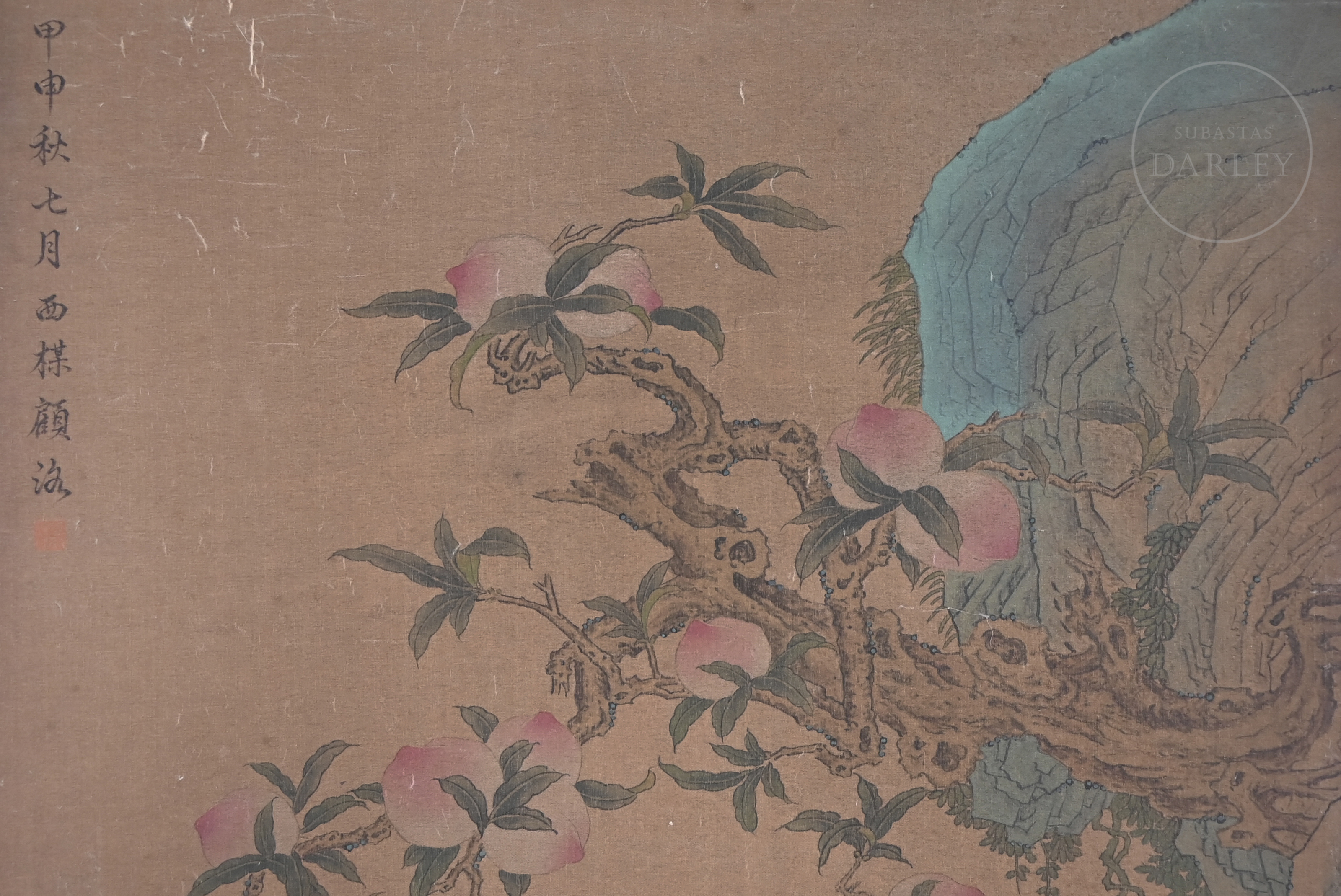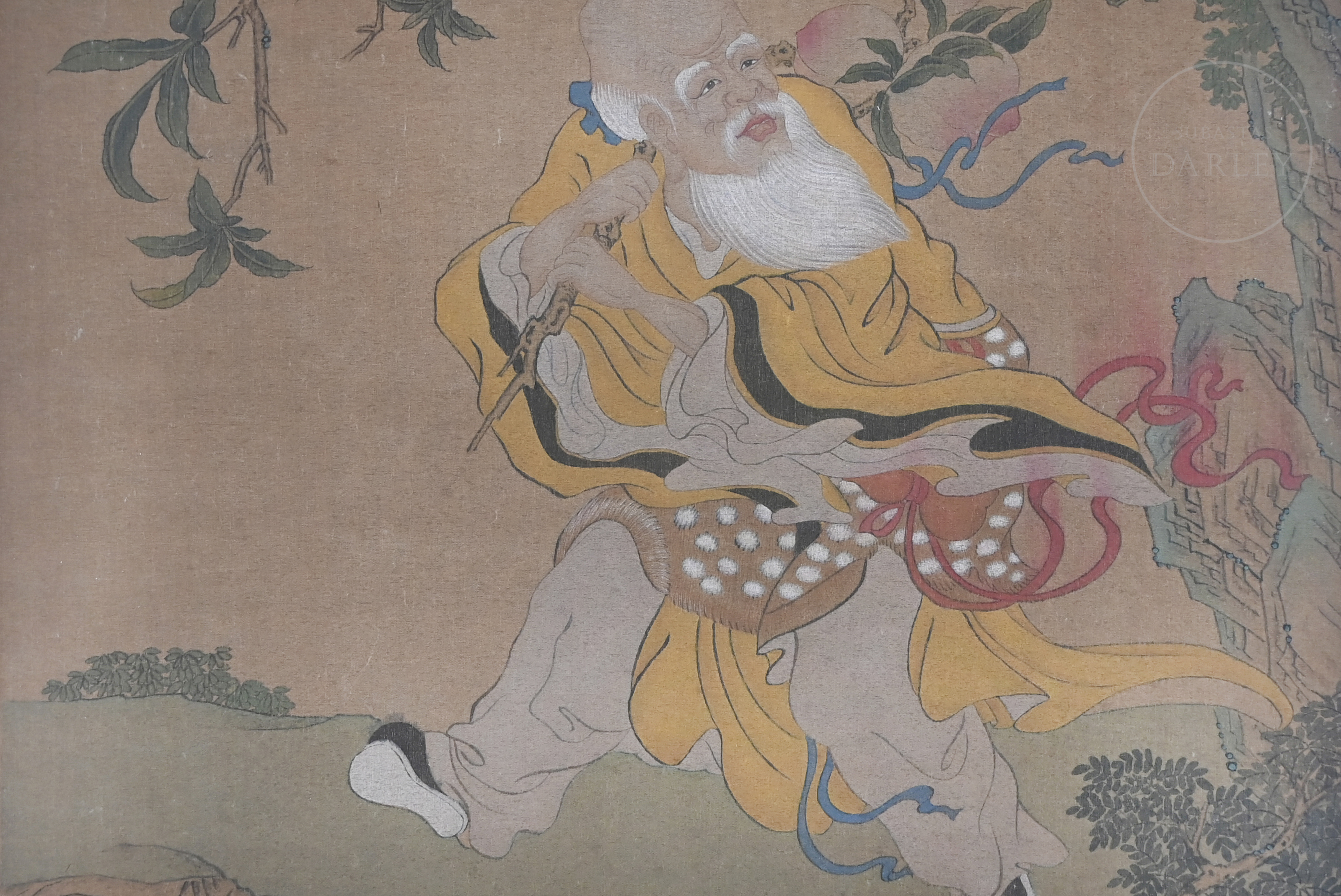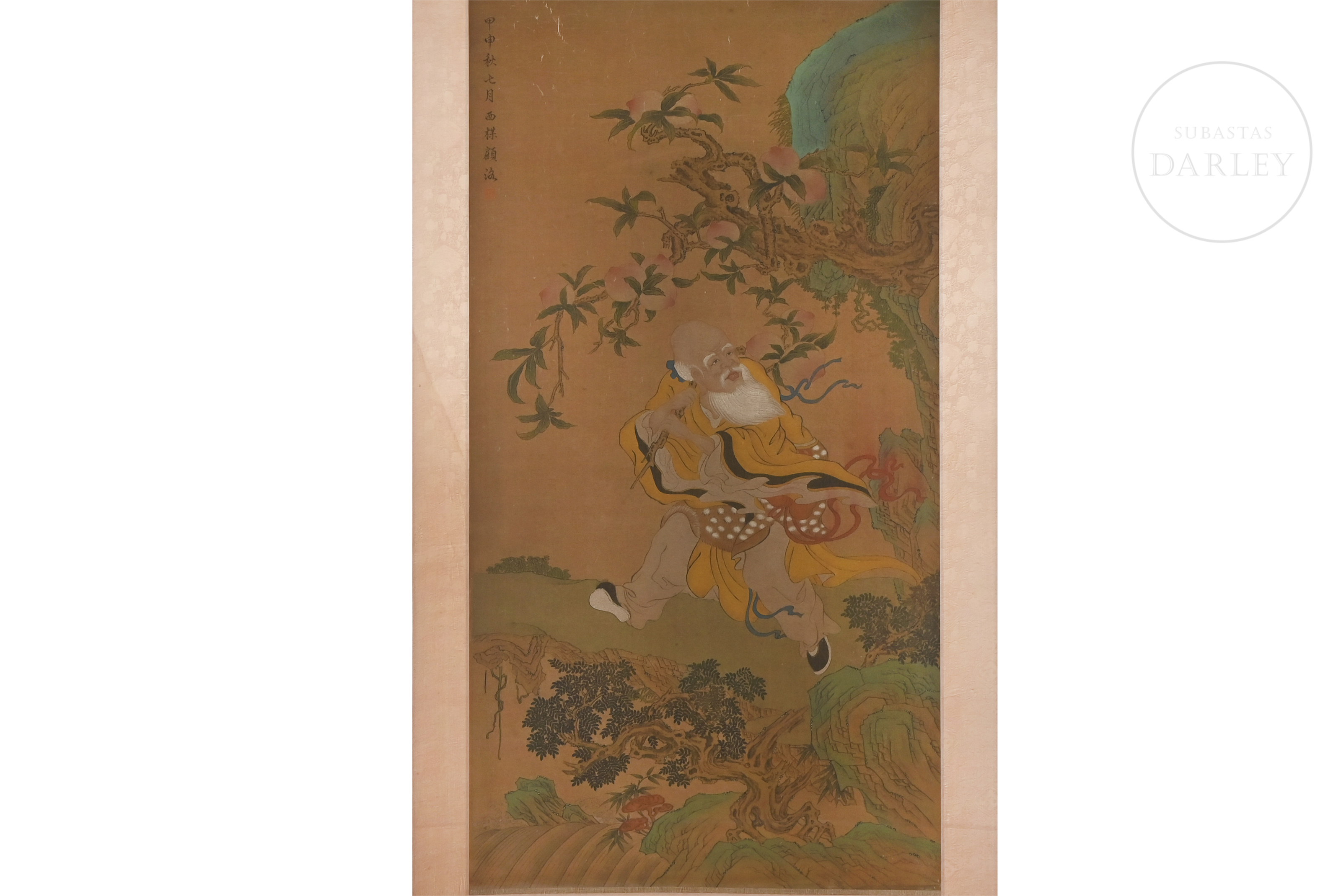 Pintura realizada en tinta y pigmentos sobre seda, dispuesta en un marco de seda brocada. Representa a un sabio de avanzada edad, ataviado con túnica amarilla, en actitud caminante bajo un frondoso melocotonero en flor, repleto de frutos. La obra presenta en el lateral superior izquierdo la inscripción "甲申秋七月西梅顾洛", seguida del sello en rojo "顾洛之印".