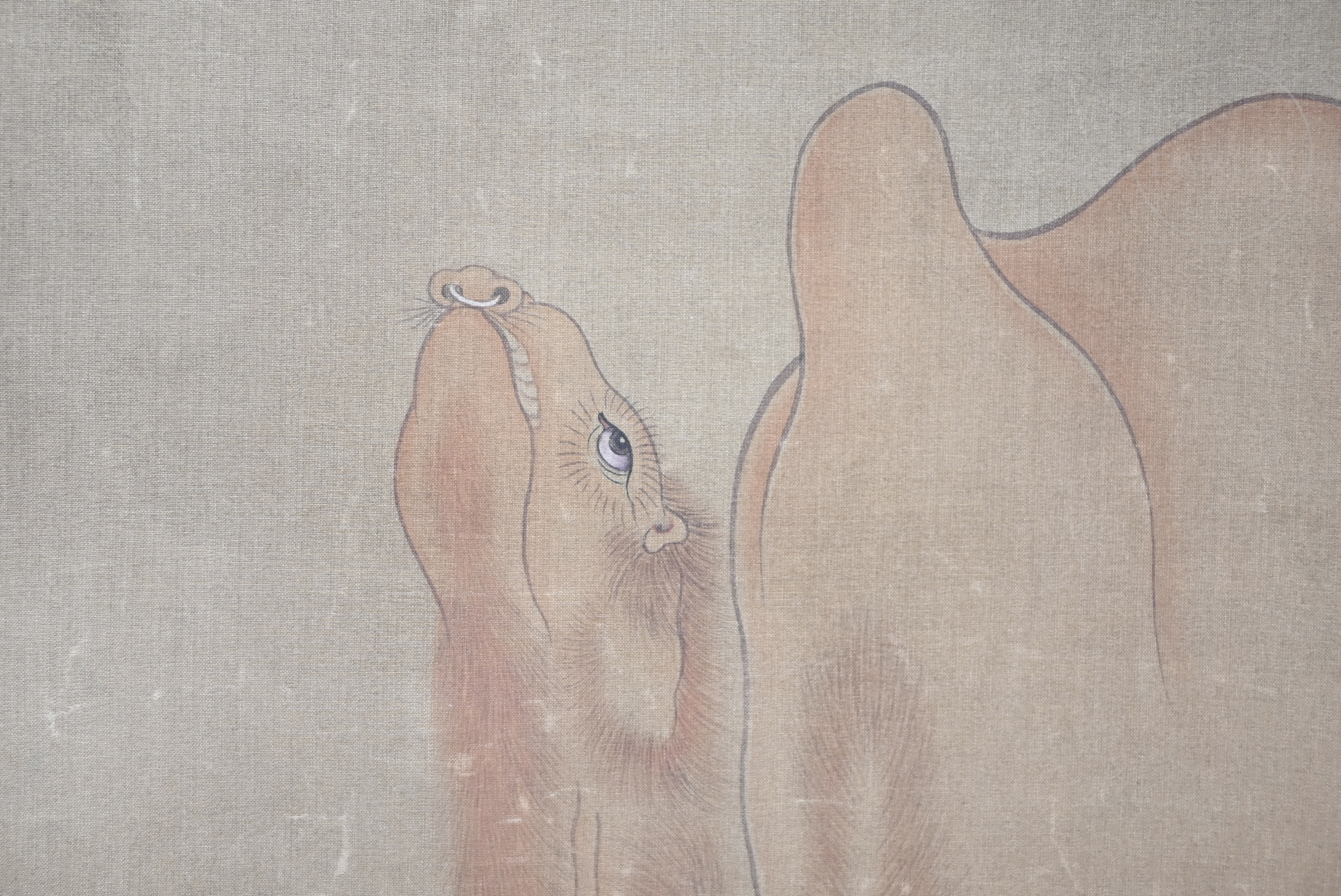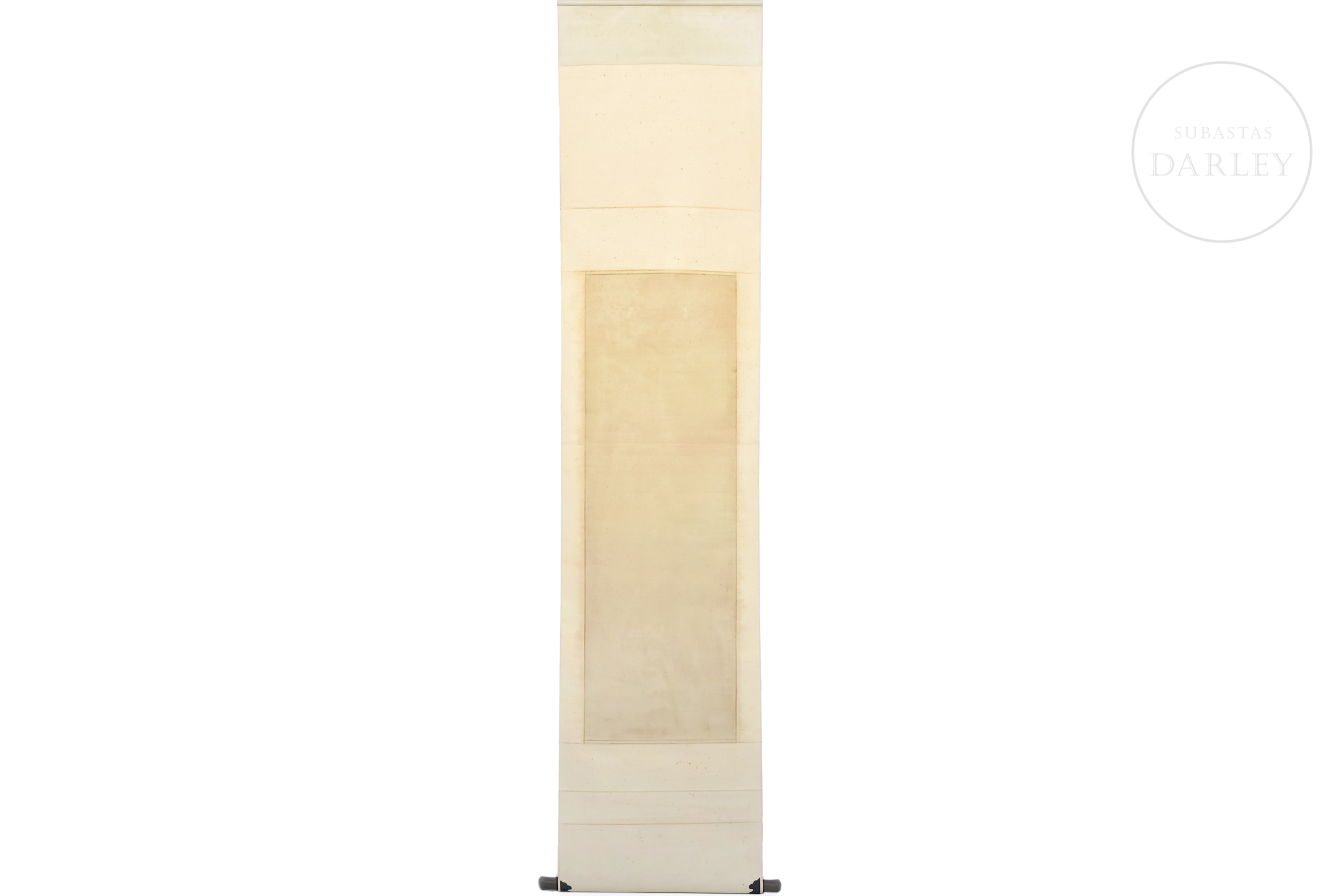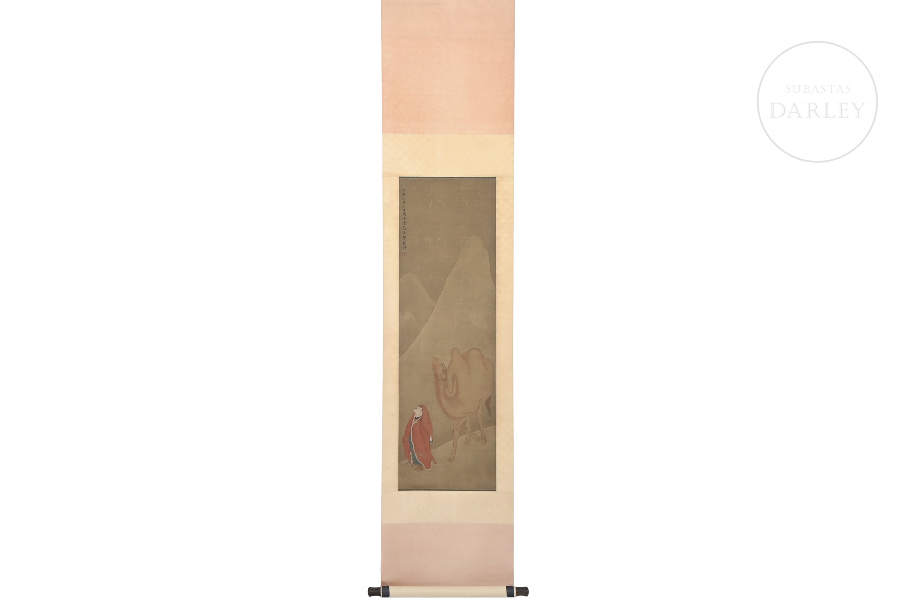 Pintura realizada en tinta y pigmentos sobre seda, dispuesta en un marco de seda brocada. Muestra representación de un sabio ataviado con túnica roja guiando un camello de dos jorobas, en un paisaje de montañas esquematizadas. Presenta en el lateral superior izquierdo la inscripción "甲申二月七日为守堂先生作 ", seguida de sello en rojo "罗聘". Luo Ping (1733-1799).