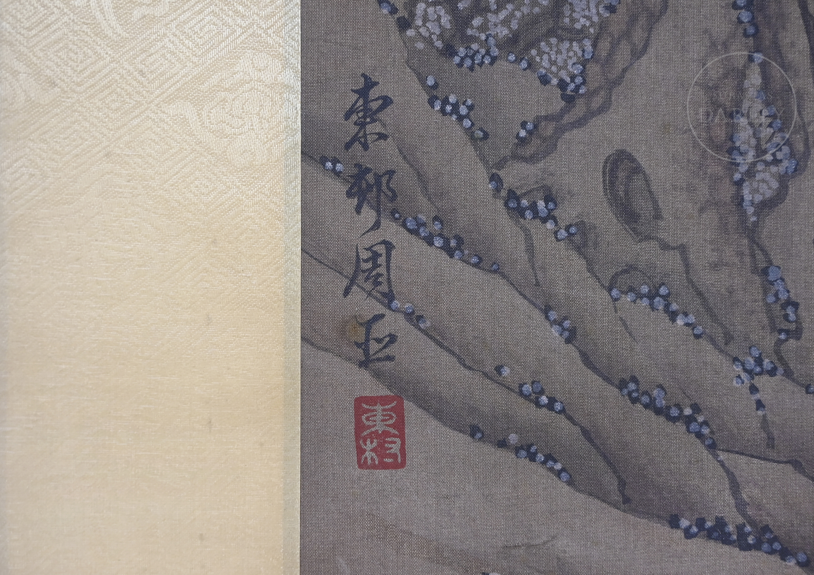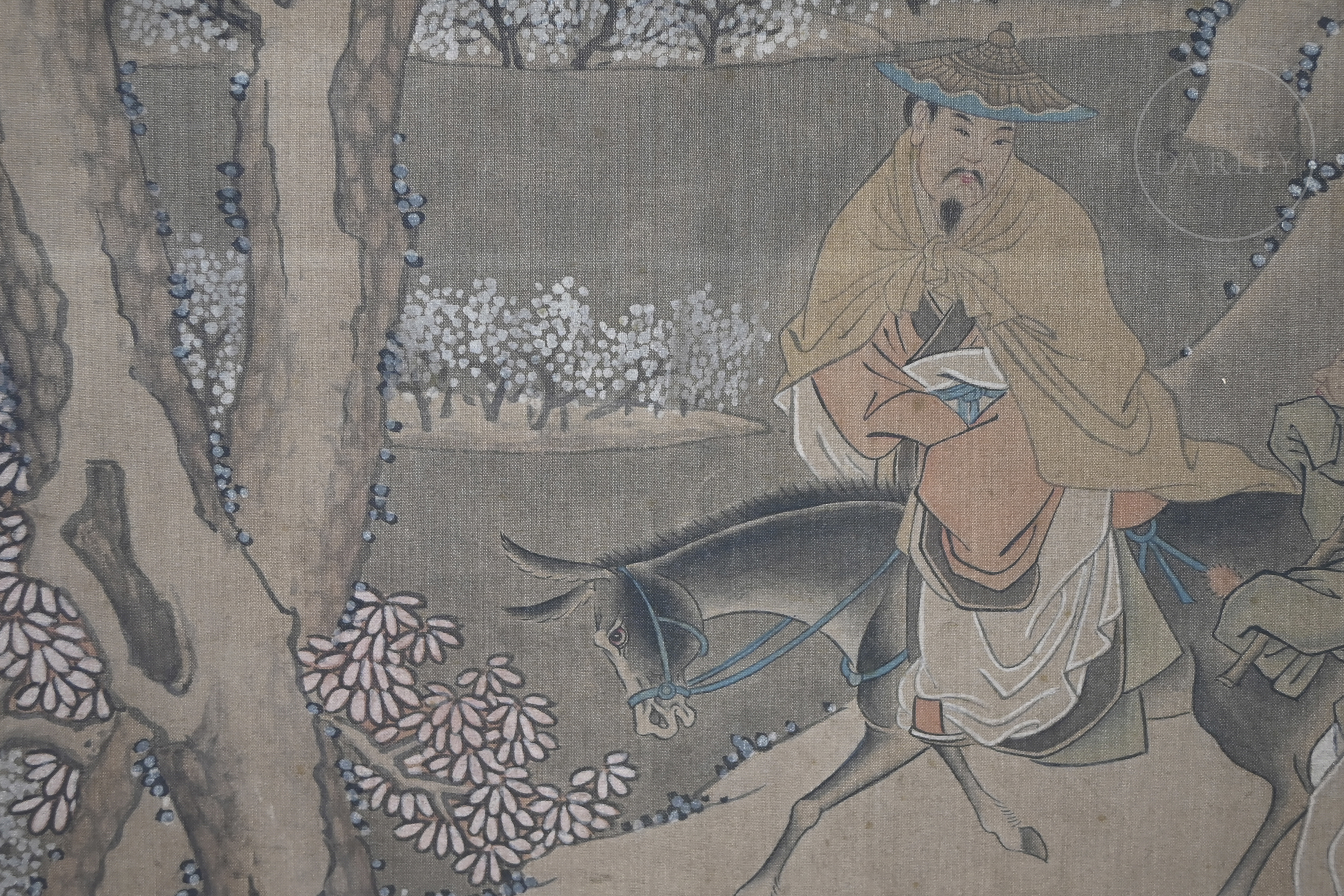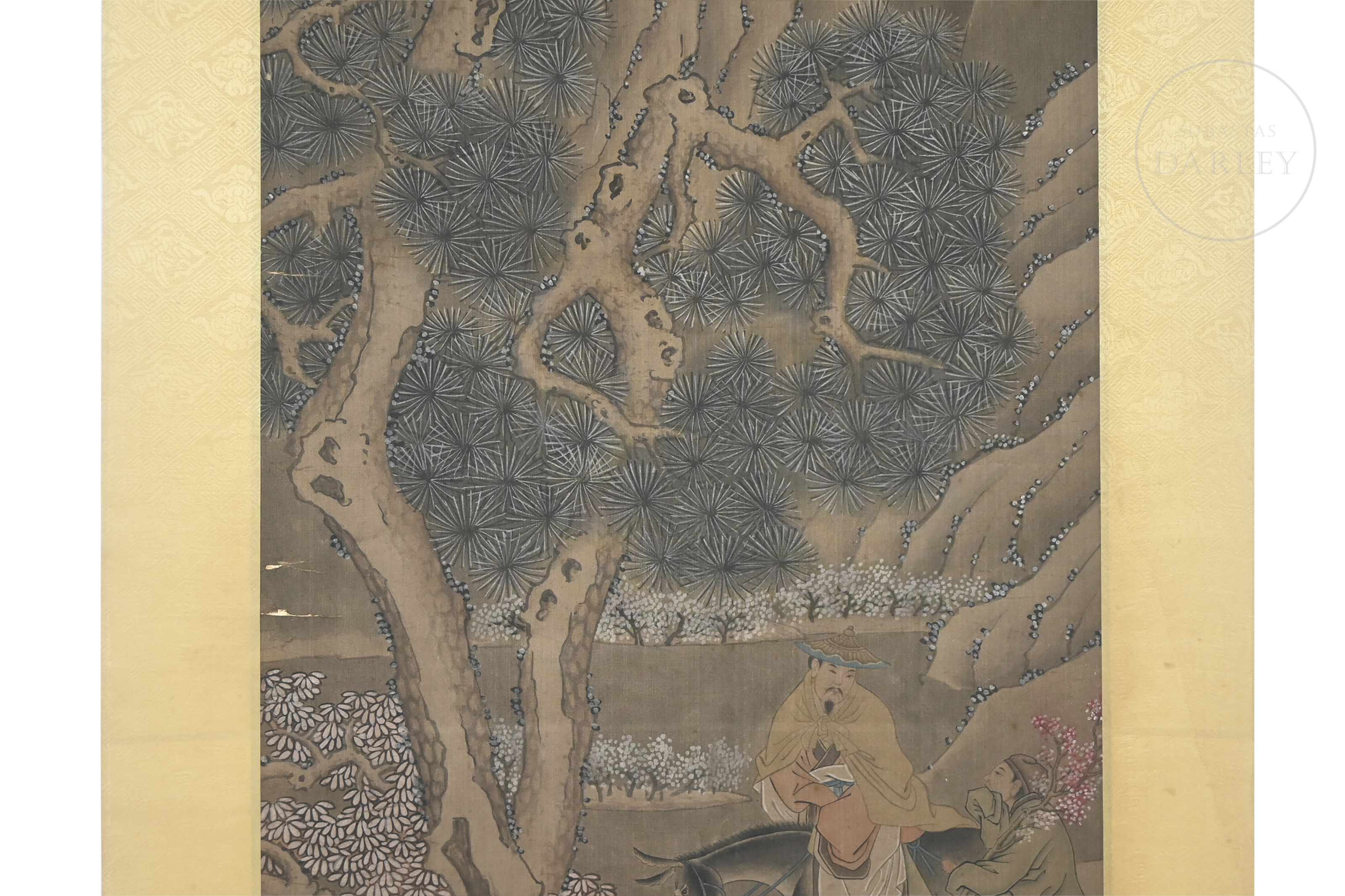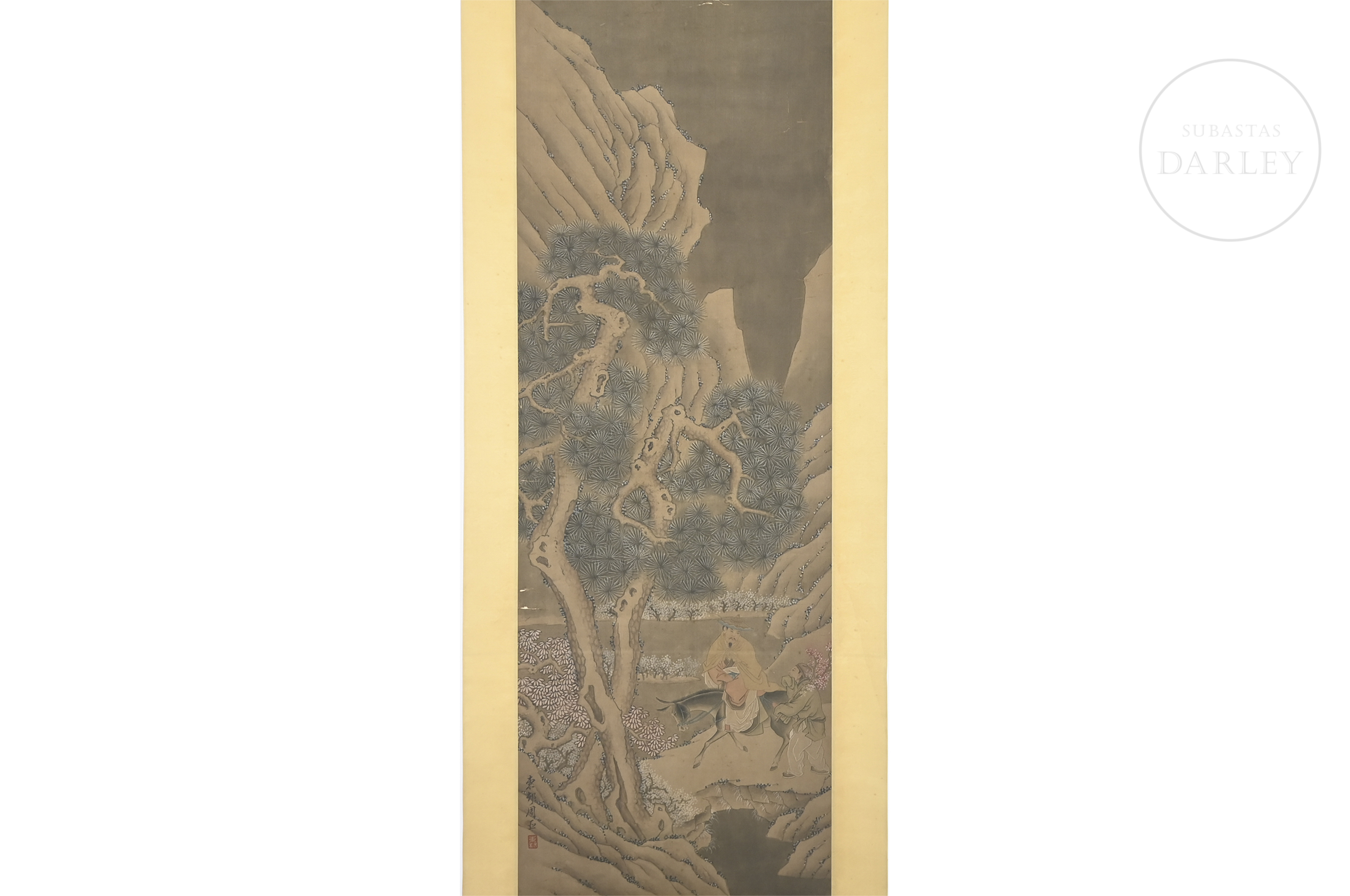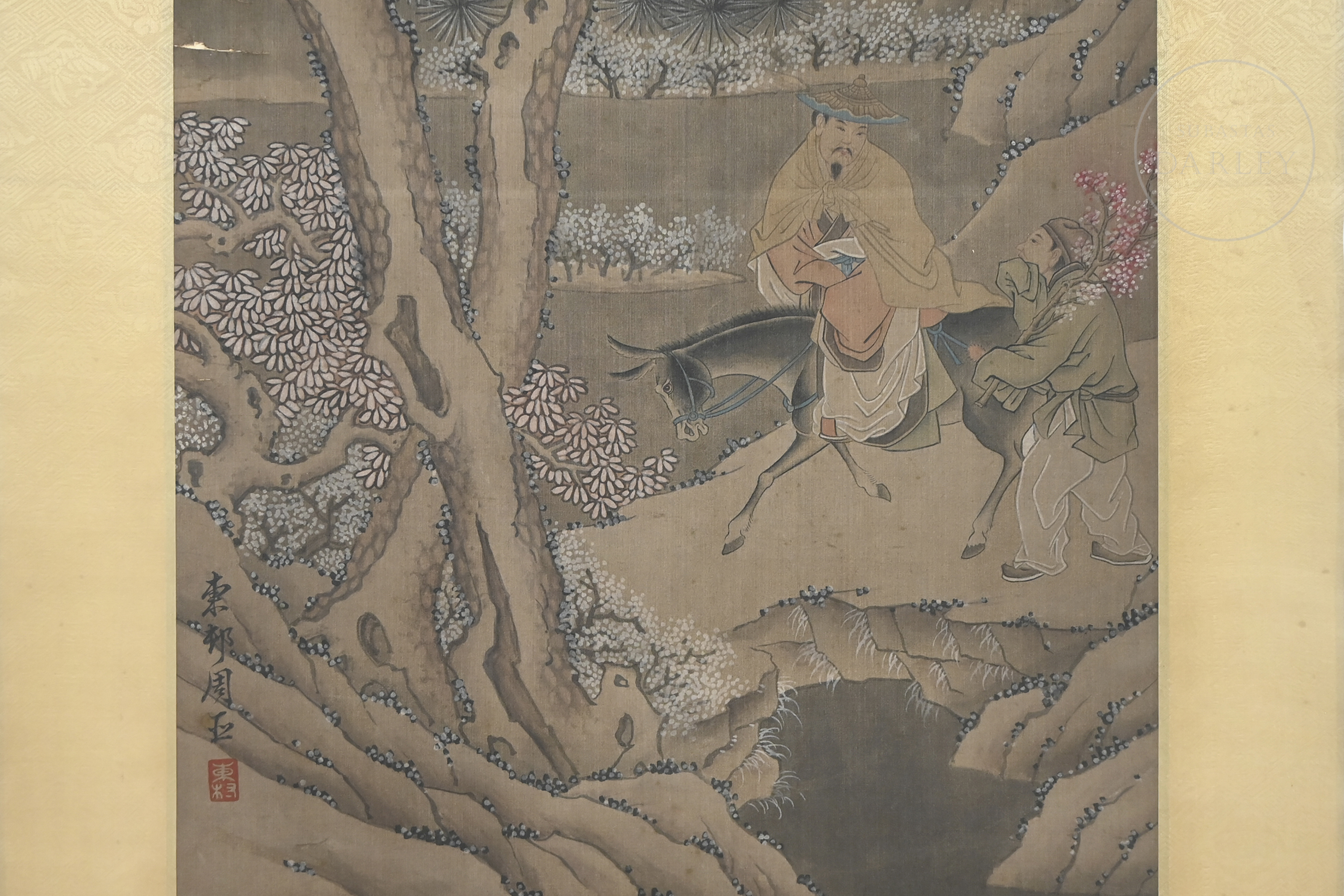 Pintura realizada en tinta y pigmentos sobre seda, montada en un marco de seda brocada. La composición muestra a un sabio montado sobre un asno, acompañado por un sirviente, avanzando por un sendero entre montañas escarpadas y pinos de intrincado ramaje. En la parte inferior izquierda presenta la inscripción "东邨周臣", acompañada de un sello en rojo "东邨". Zhou Chen (ca. 1450–1535).