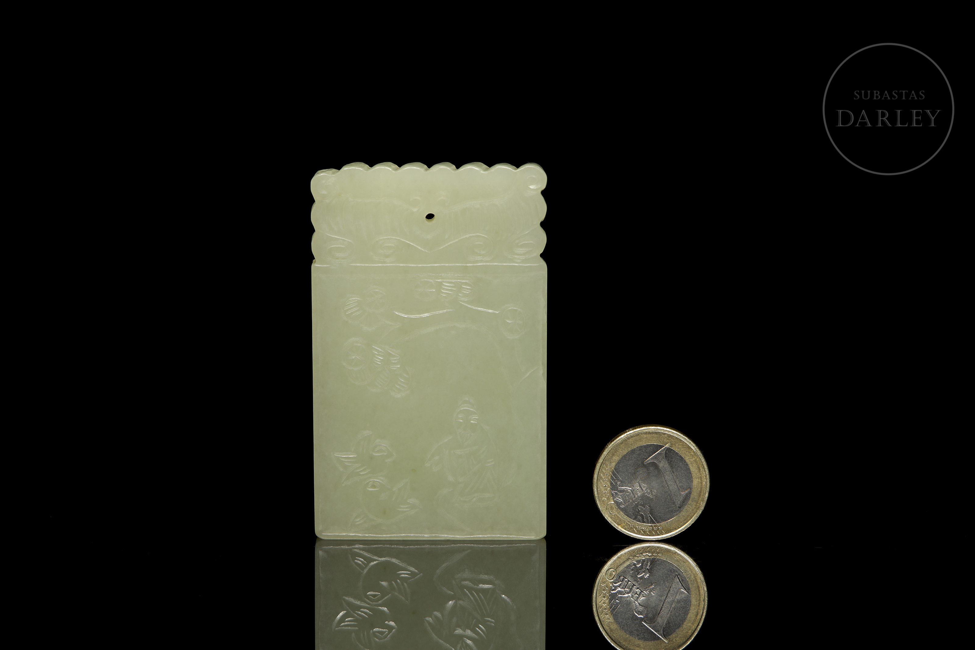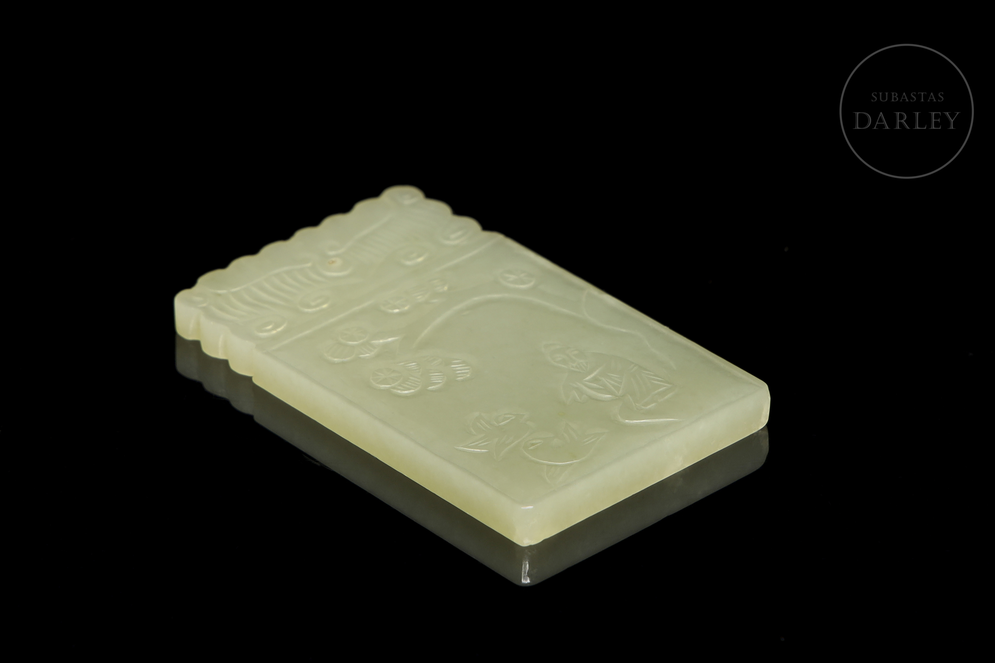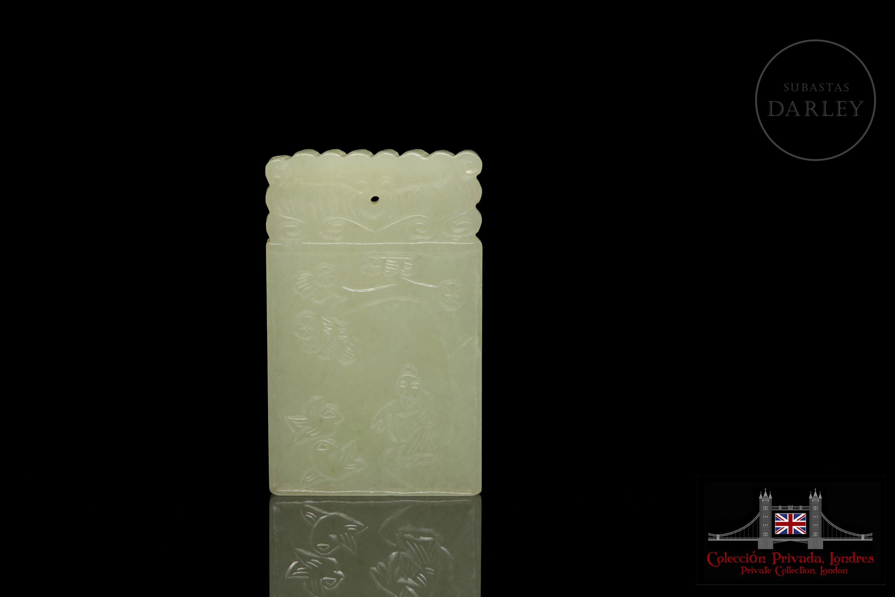Jade de tenue color blanco con subtonalidad verdosa. Posee forma rectangular y se encuentra adornado en ambas caras con detalles incisos y en relieve, inscritos por un fino marco adornado en la zona superior con patrones de líneas y espirales. En la cara delantera, se sitúa una pequeña escena, donde un anciano alimenta a dos aves que revolotean bajo la sobra de un árbol. En la cara posterior se dispone un corto poema inciso. Dinastía Qing (1644-1912) o posterior.