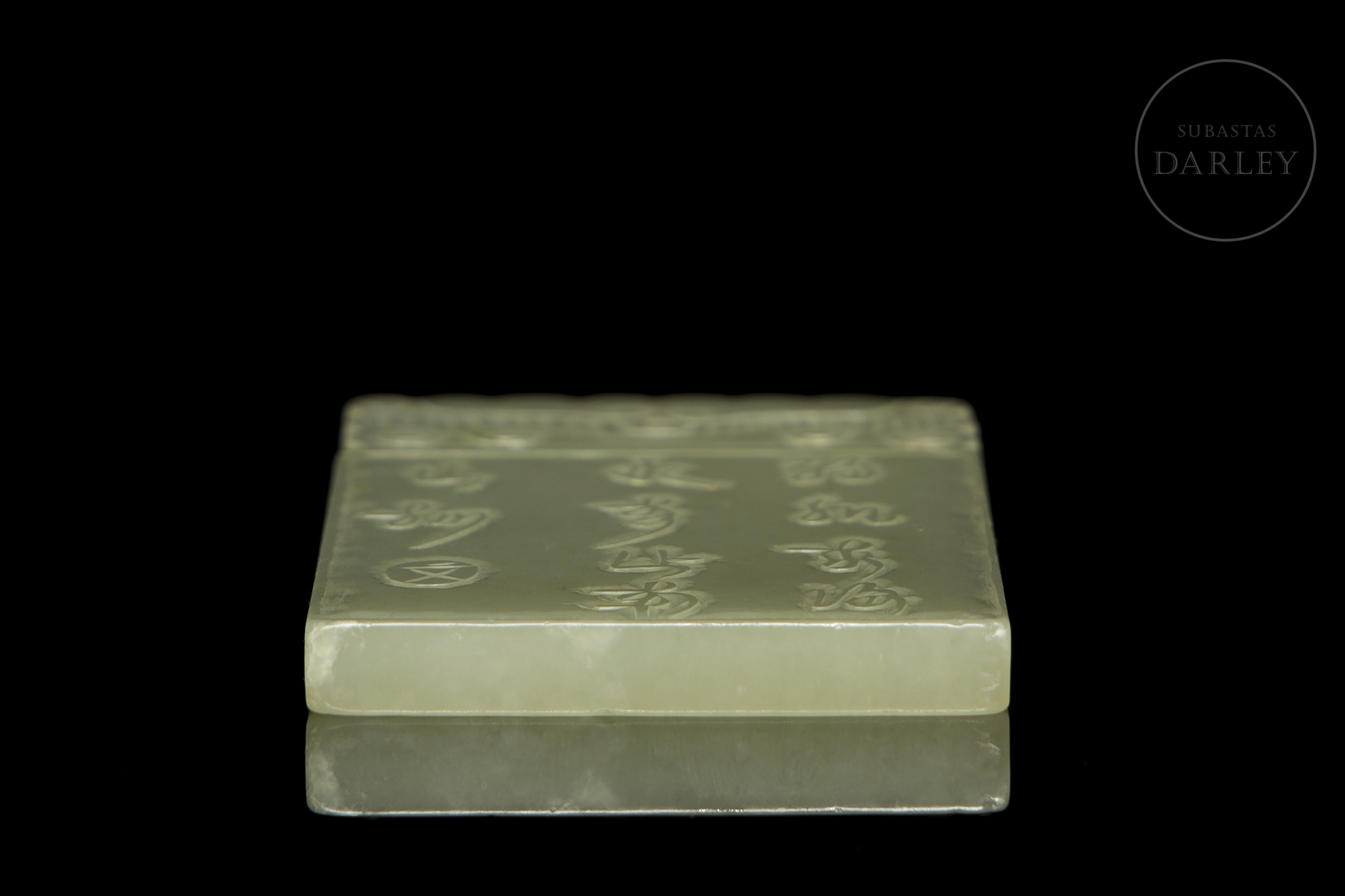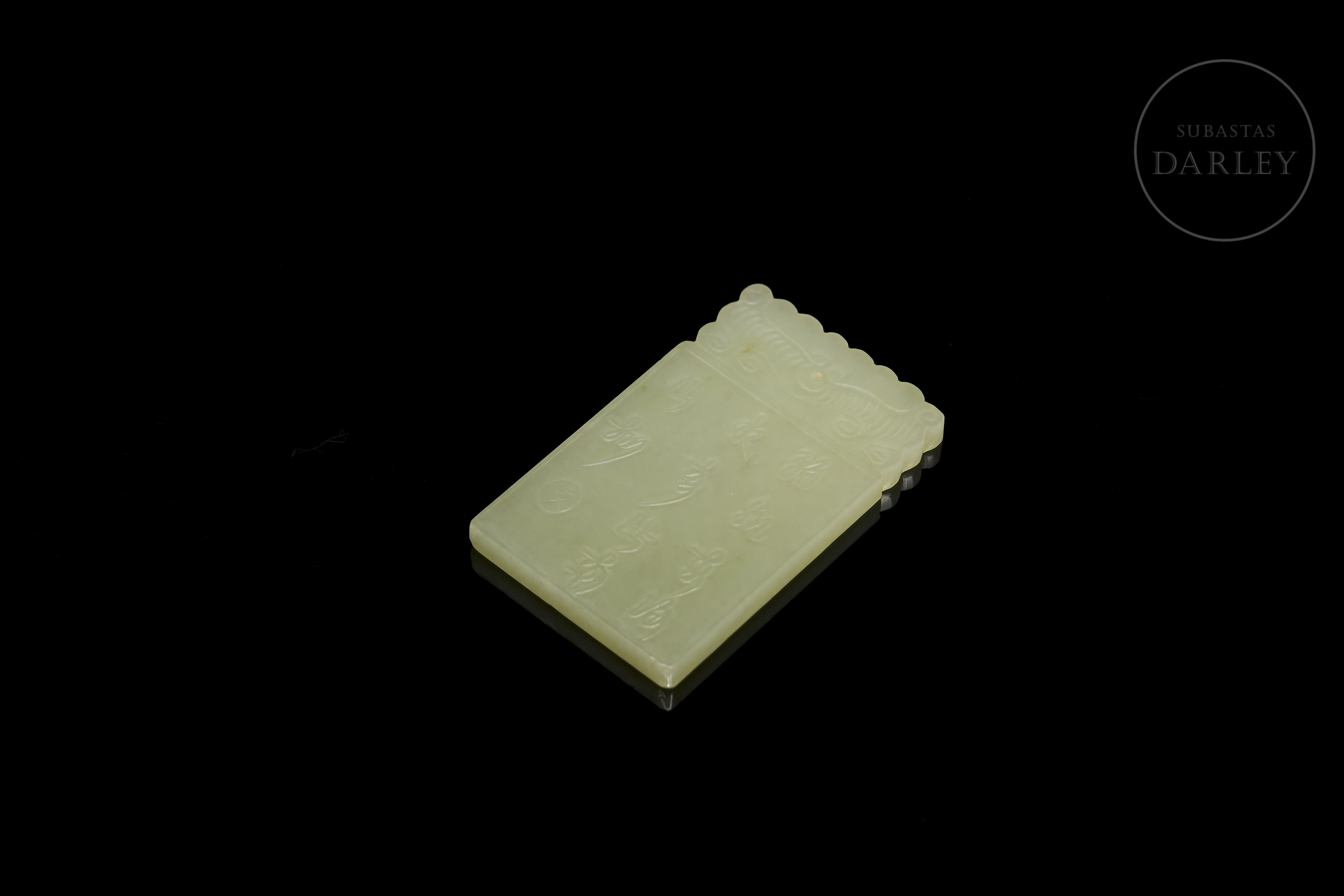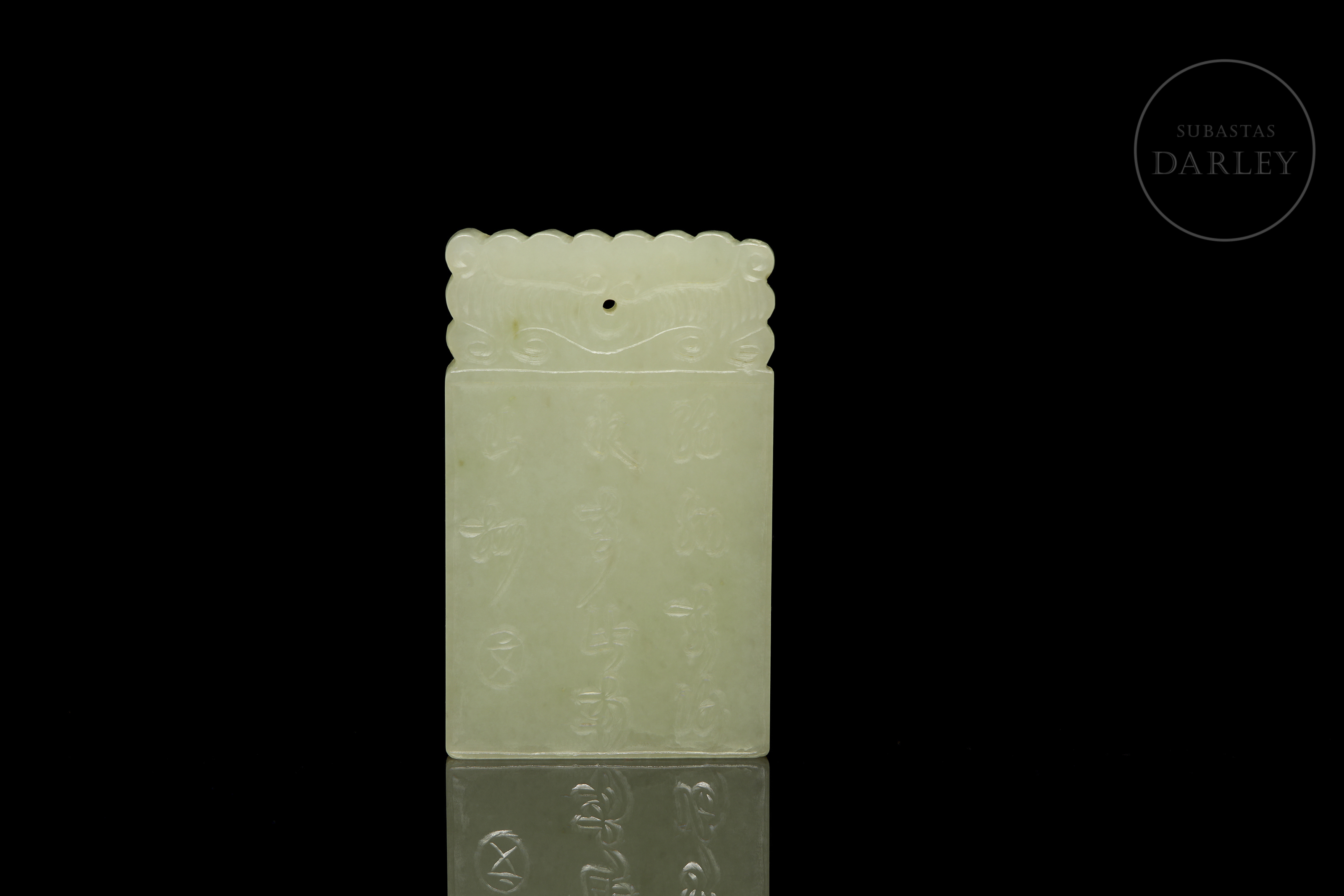 Jade de tenue color blanco con subtonalidad verdosa. Posee forma rectangular y se encuentra adornado en ambas caras con detalles incisos y en relieve, inscritos por un fino marco adornado en la zona superior con patrones de líneas y espirales. En la cara delantera, se sitúa una pequeña escena, donde un anciano alimenta a dos aves que revolotean bajo la sobra de un árbol. En la cara posterior se dispone un corto poema inciso. Dinastía Qing (1644-1912) o posterior.