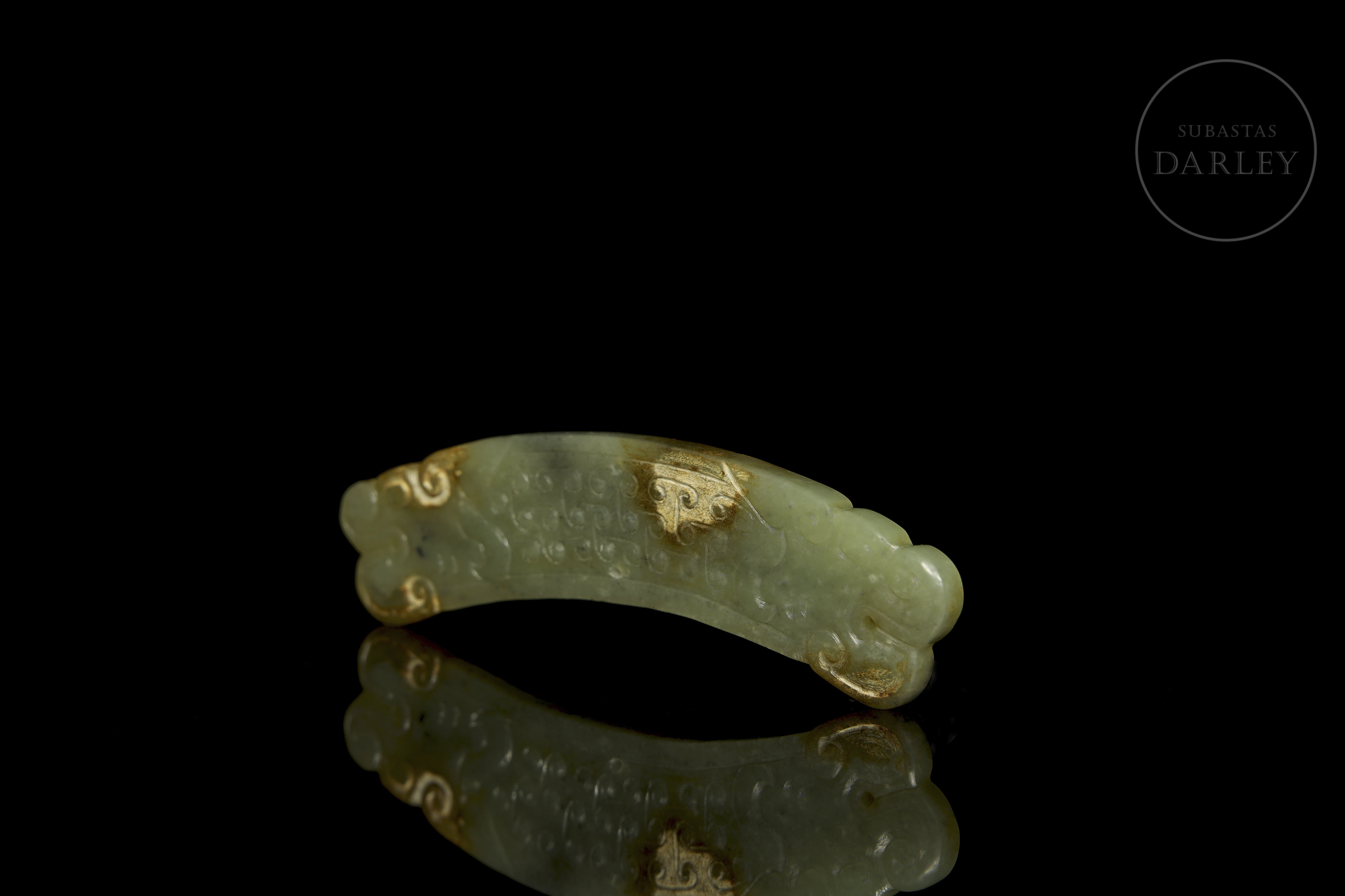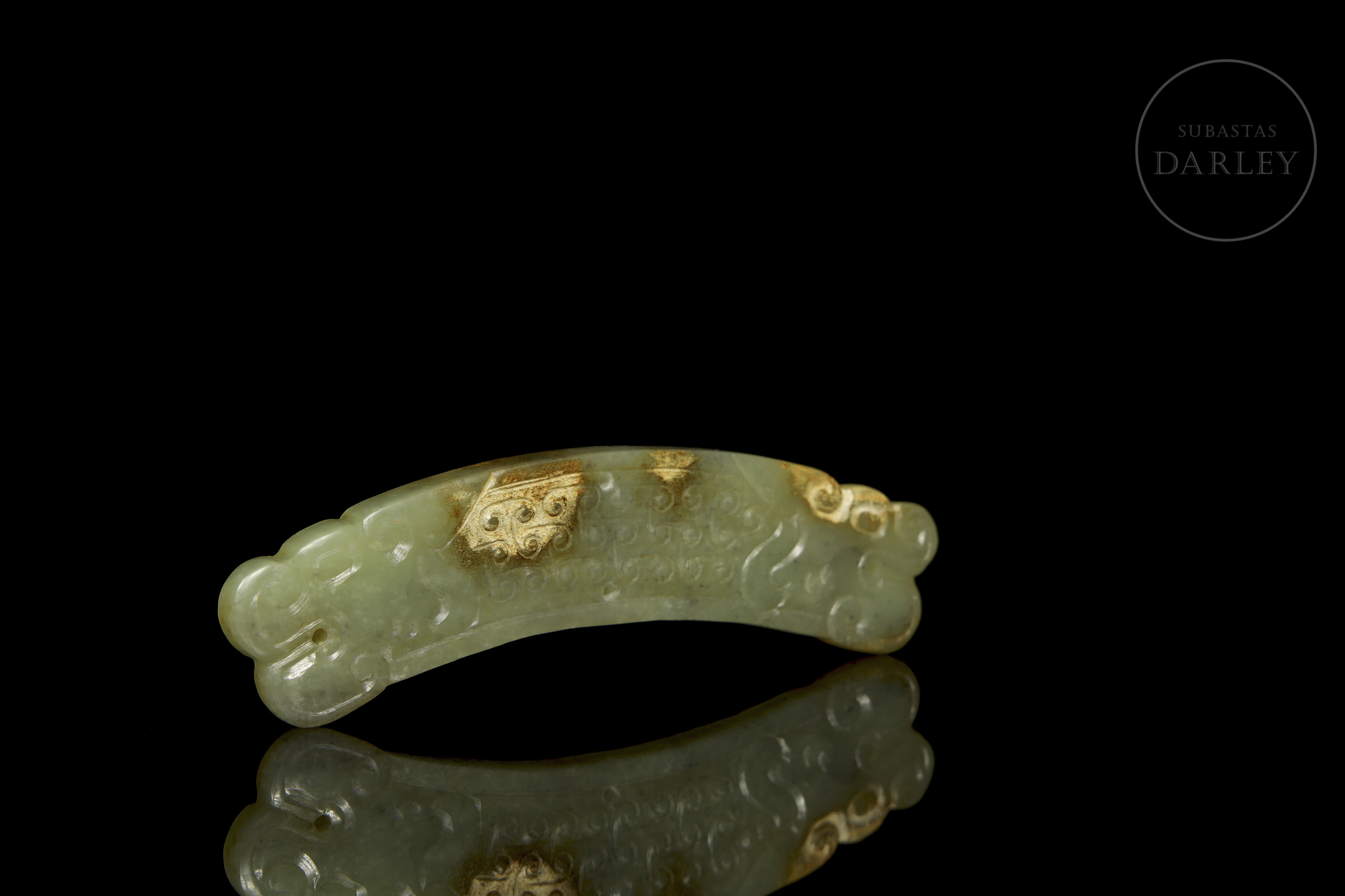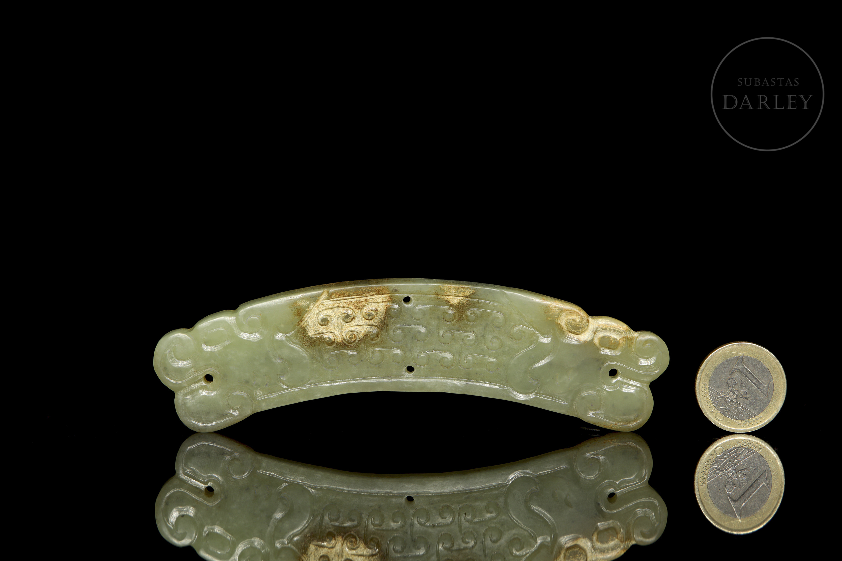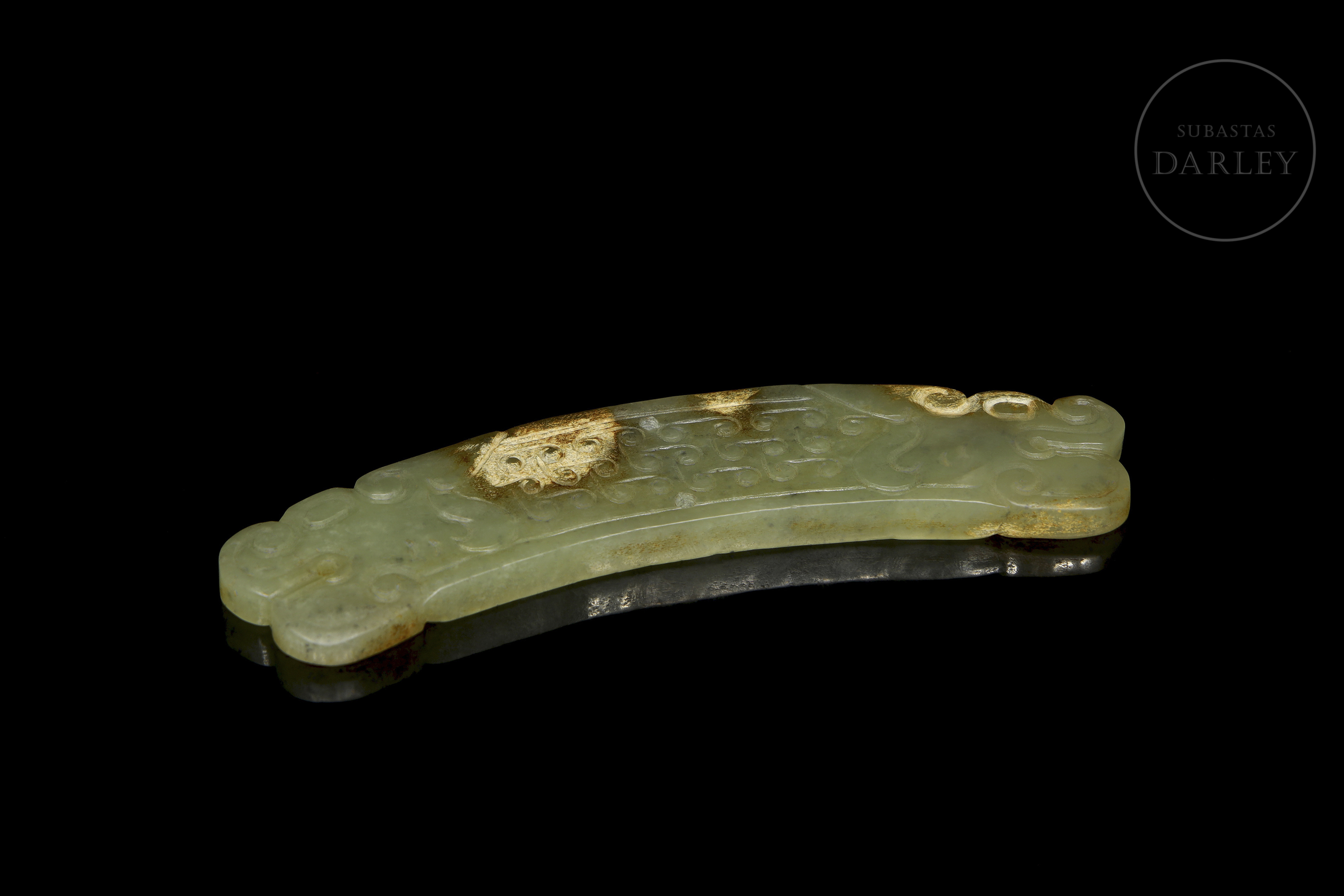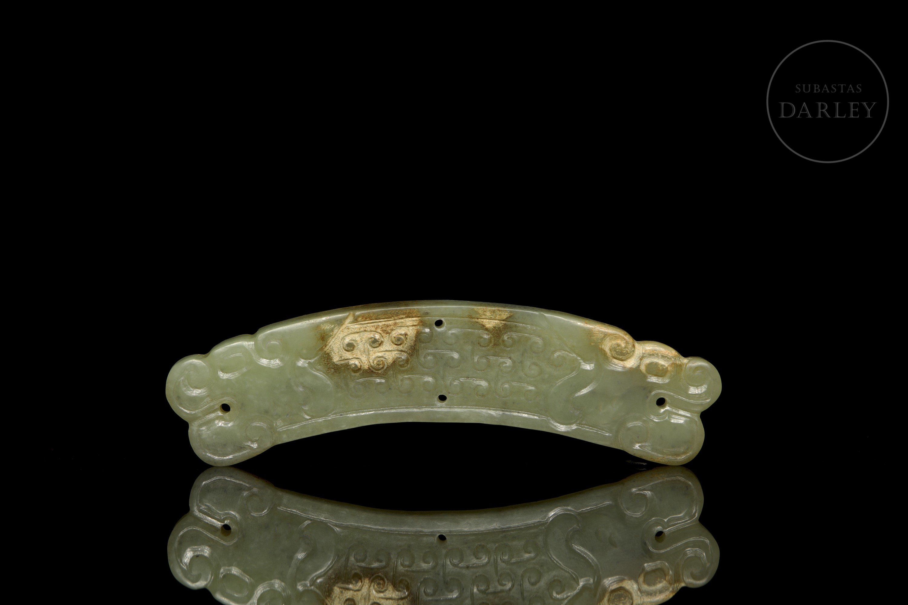 Placa de jade de perfil plano y delgado que conforma un cuerpo arqueado. La superficie está decorada con motivos de espirales y dragones arcaicos. El jade es de tono verde pálido con amplias zonas de calcificación blanquecina.