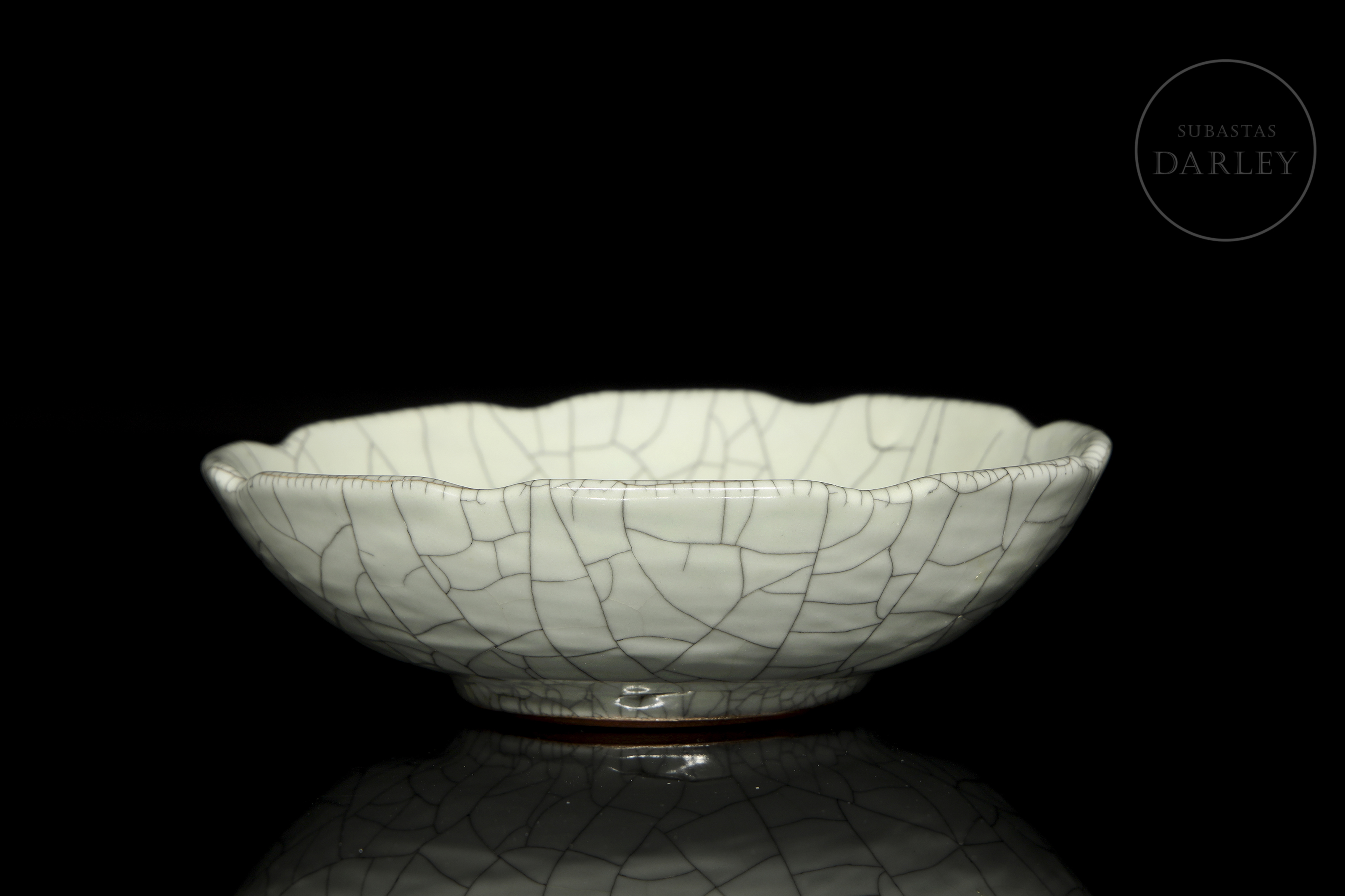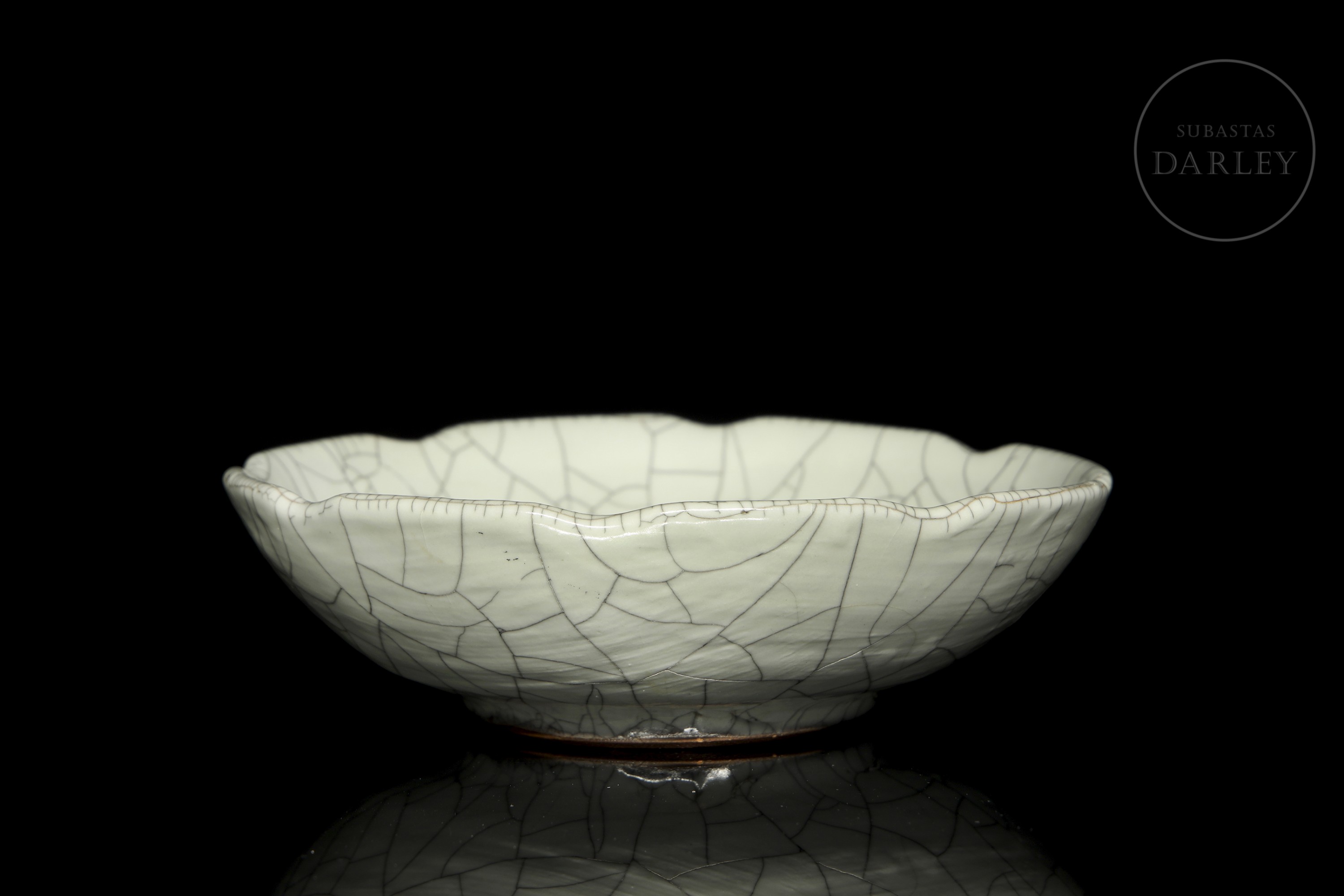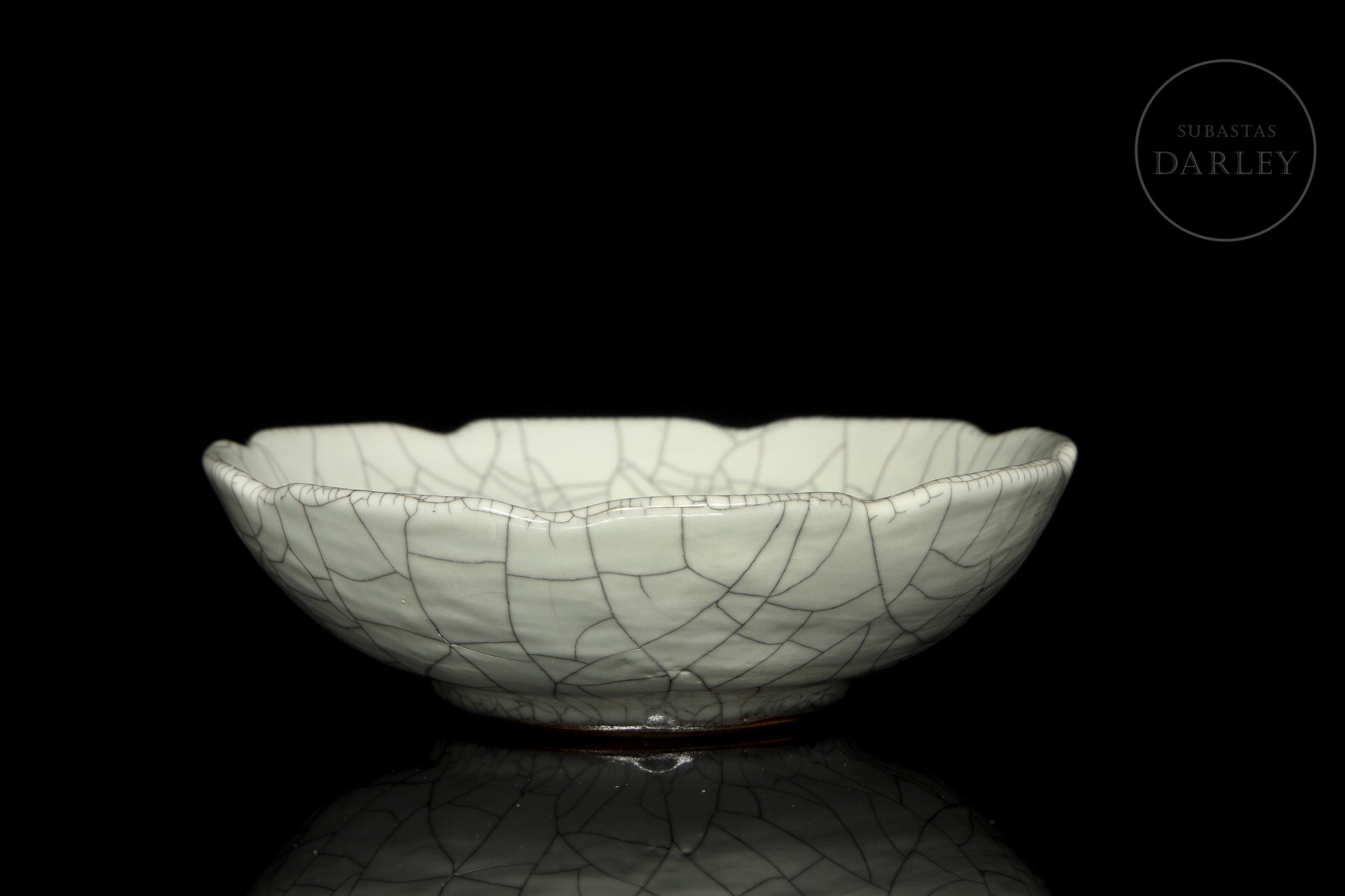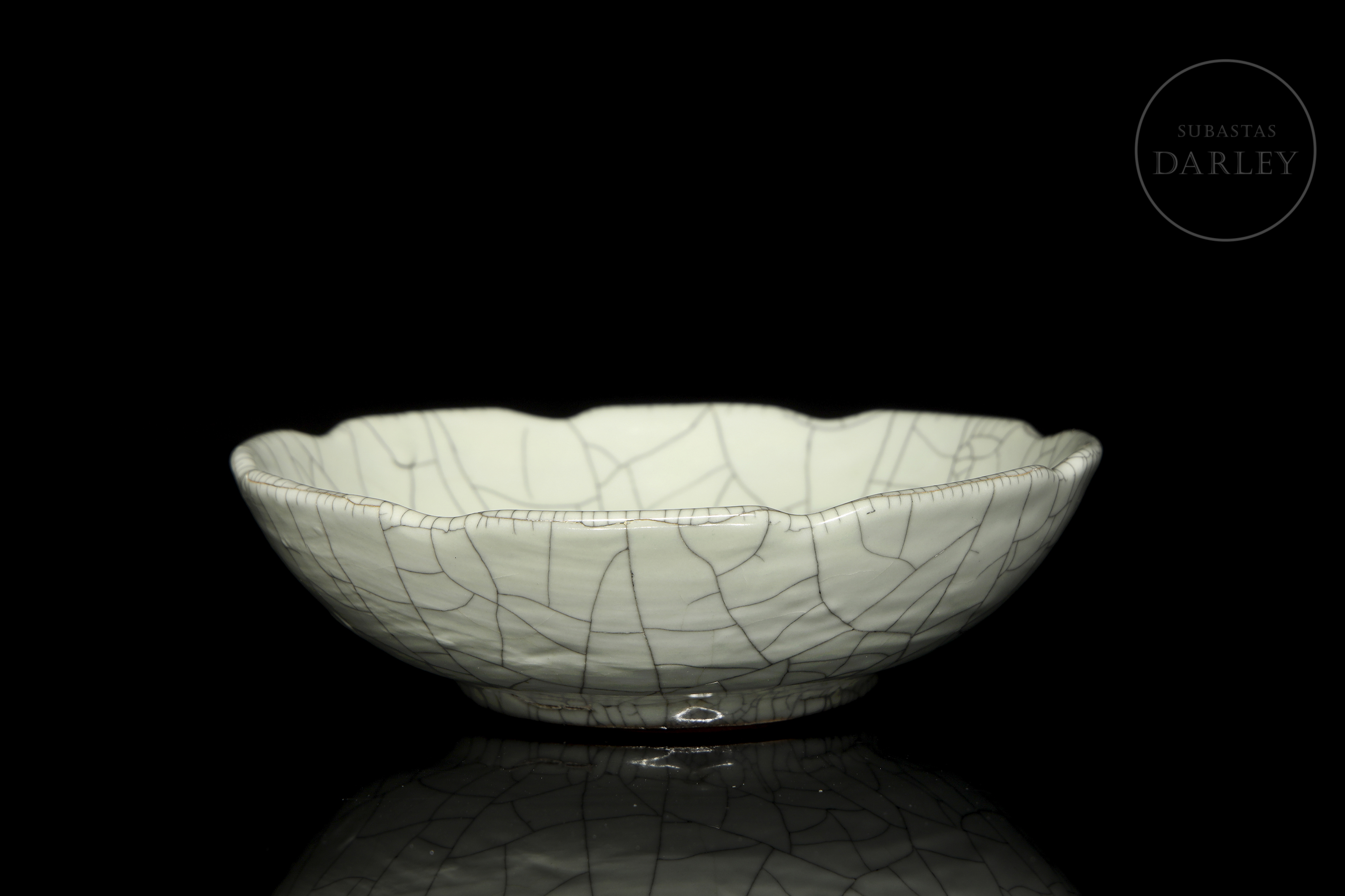 Posee un corto pie circular sobre el que se dispone el hondo cuerpo, de perfil curvado, que se ensancha a la altura de la boca, finalizando en un borde lobulado que se asemeja a los pétalos de una flor. Cubierto por un grueso esmalte de tonalidad celadón, con un suave color azul lechoso, sobre el que destaca un entramado de craqueladuras oscuras. Muestra ligeros desperfectos,