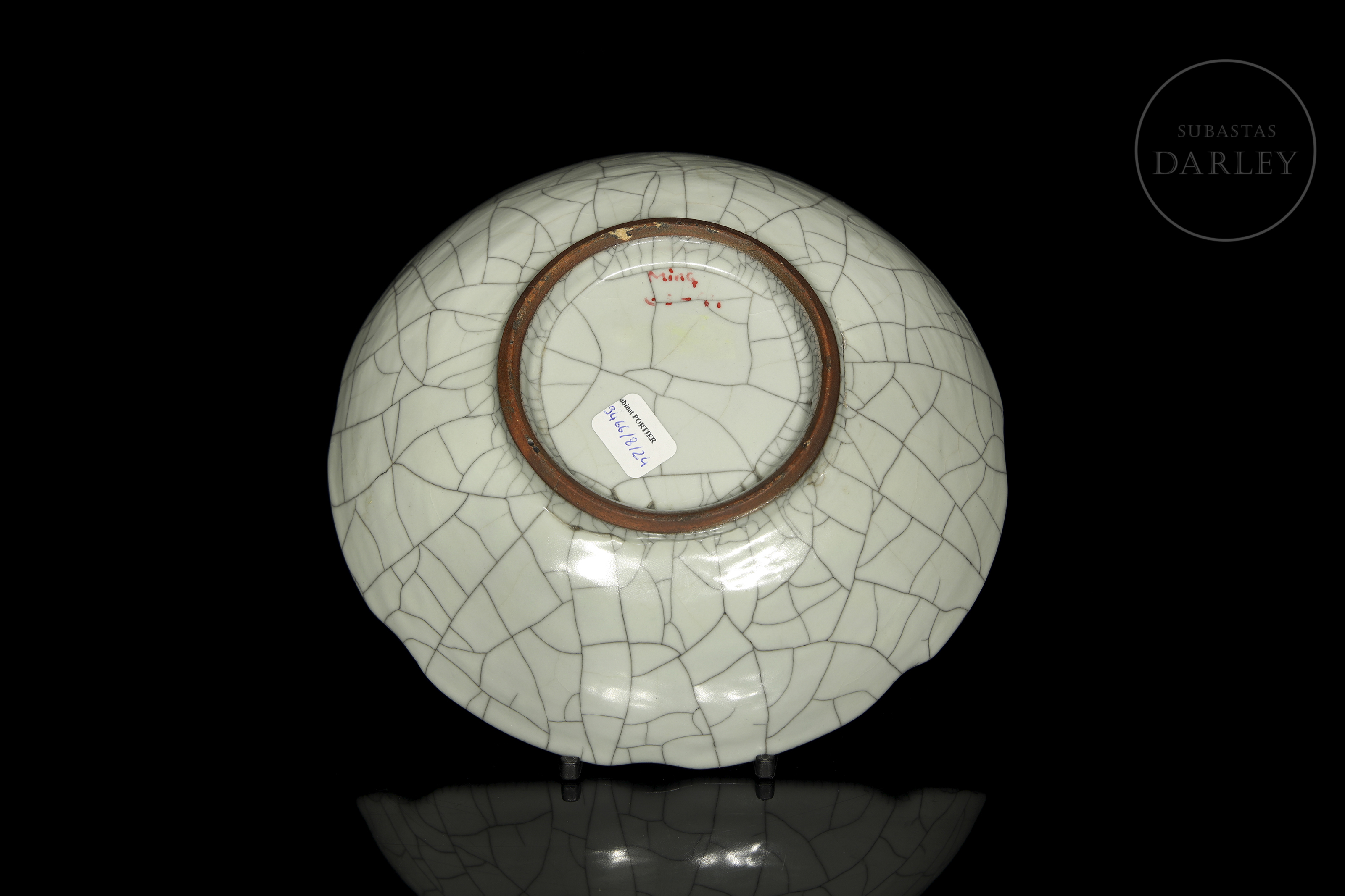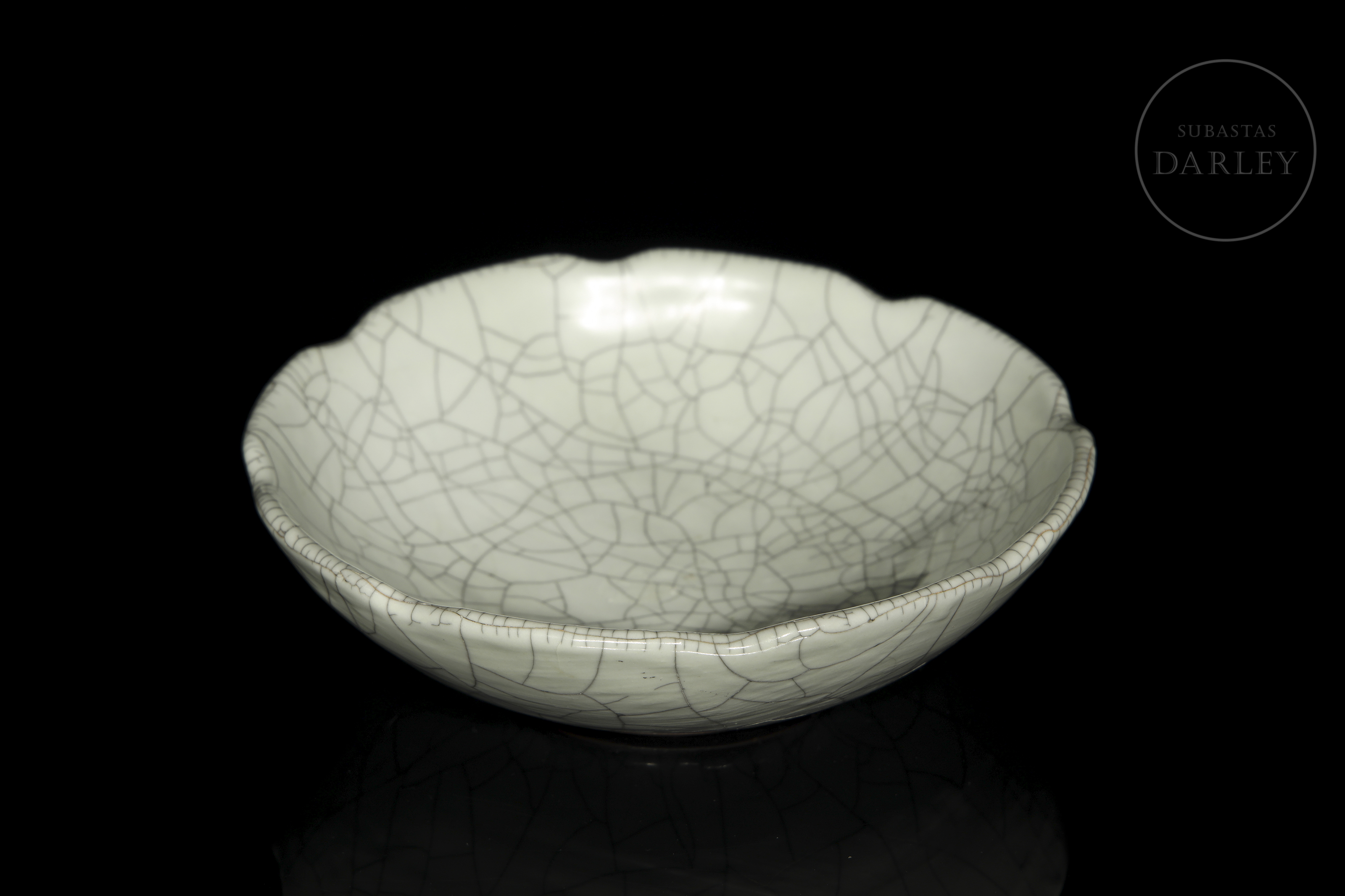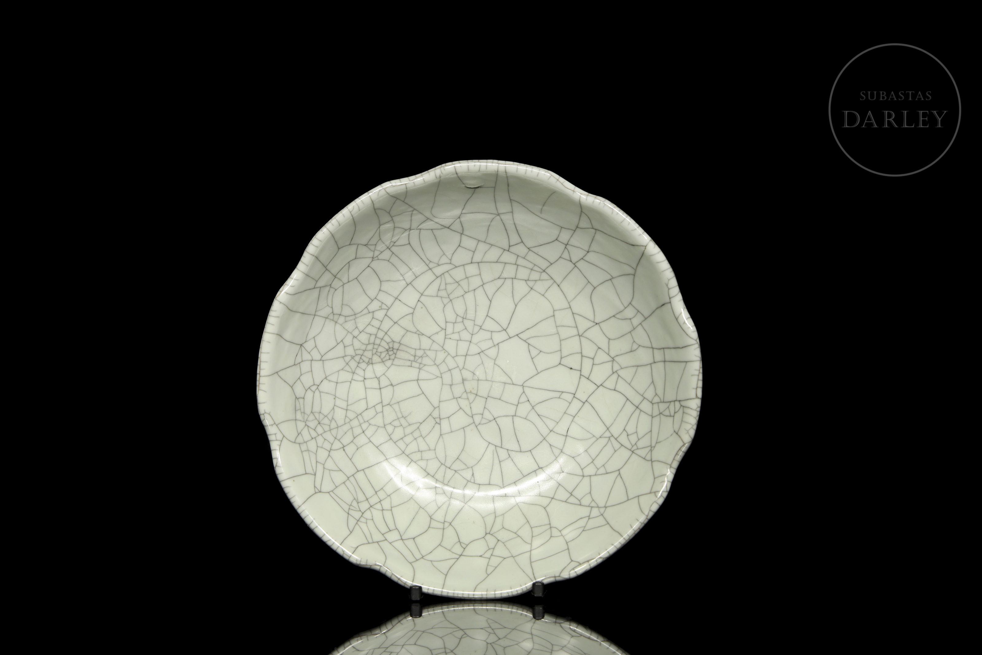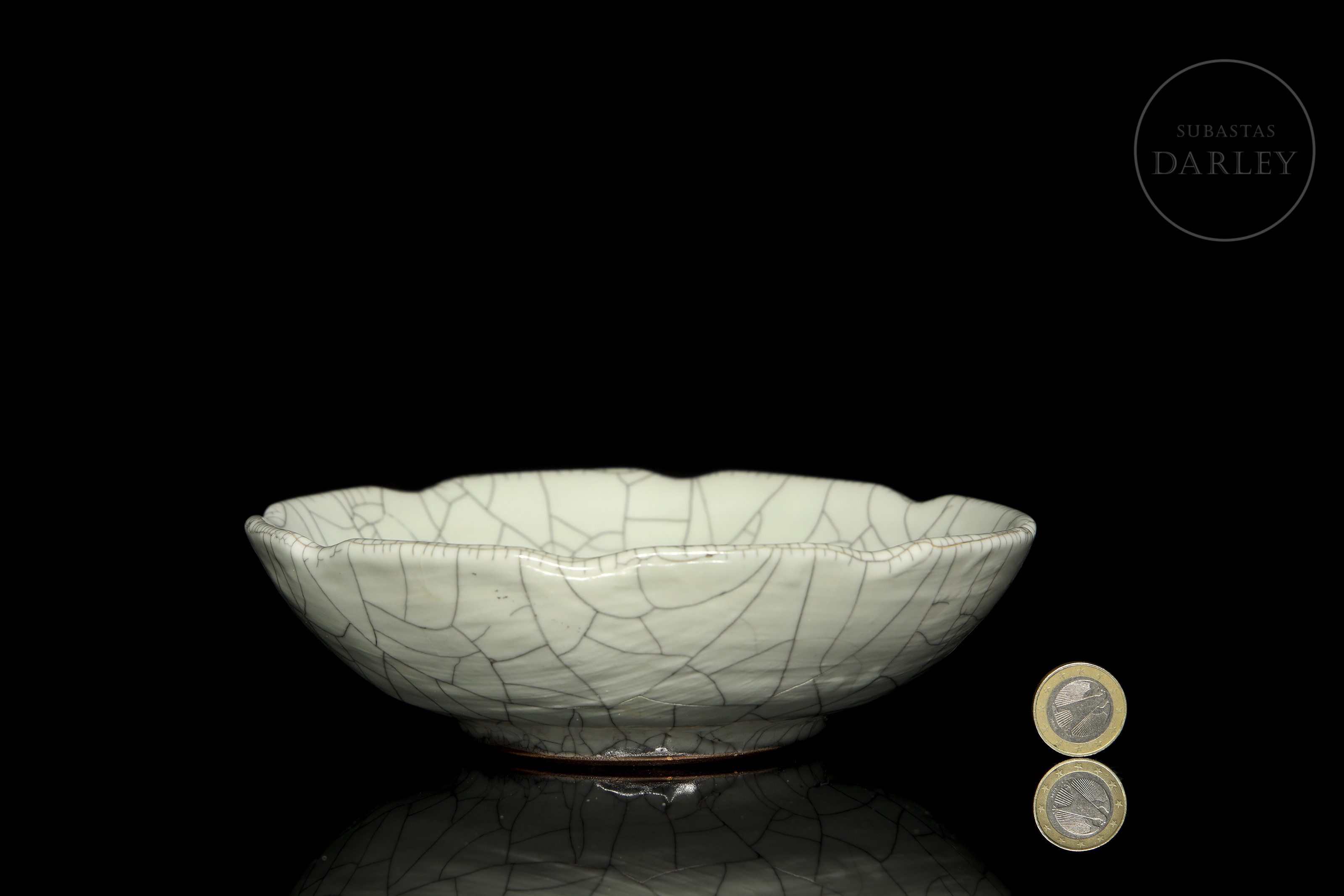 Posee un corto pie circular sobre el que se dispone el hondo cuerpo, de perfil curvado, que se ensancha a la altura de la boca, finalizando en un borde lobulado que se asemeja a los pétalos de una flor. Cubierto por un grueso esmalte de tonalidad celadón, con un suave color azul lechoso, sobre el que destaca un entramado de craqueladuras oscuras. Muestra ligeros desperfectos,