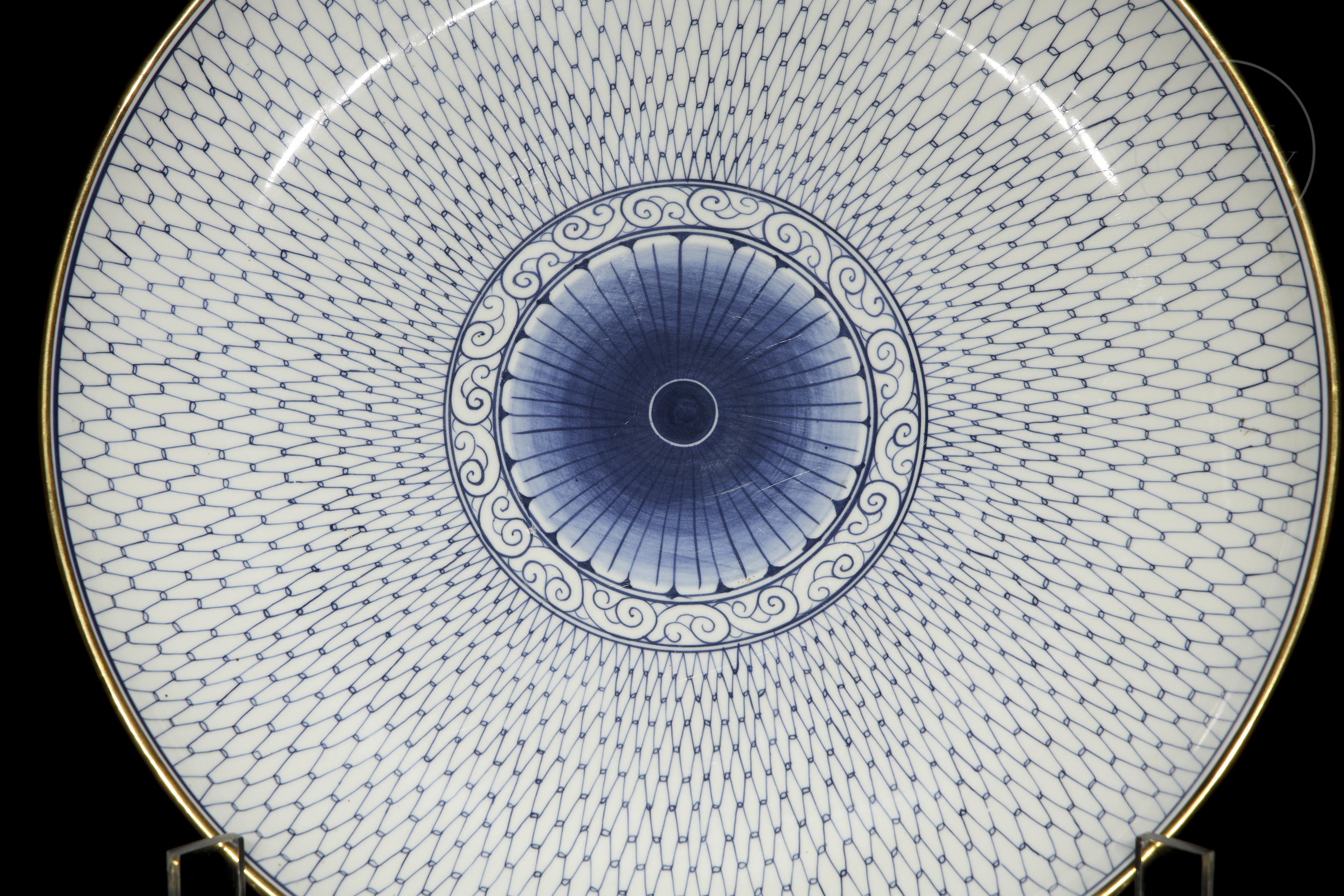 Plato de porcelana con decoraciones en azul bajo vidriado y borde dorado. Se encuentra por un patrón de rombos y círculos entramados, acompañado de una cenefa de roleos que enmarca una gran flor central. Con marca de cuatro caracteres en la base, en azul bajo vidriado.