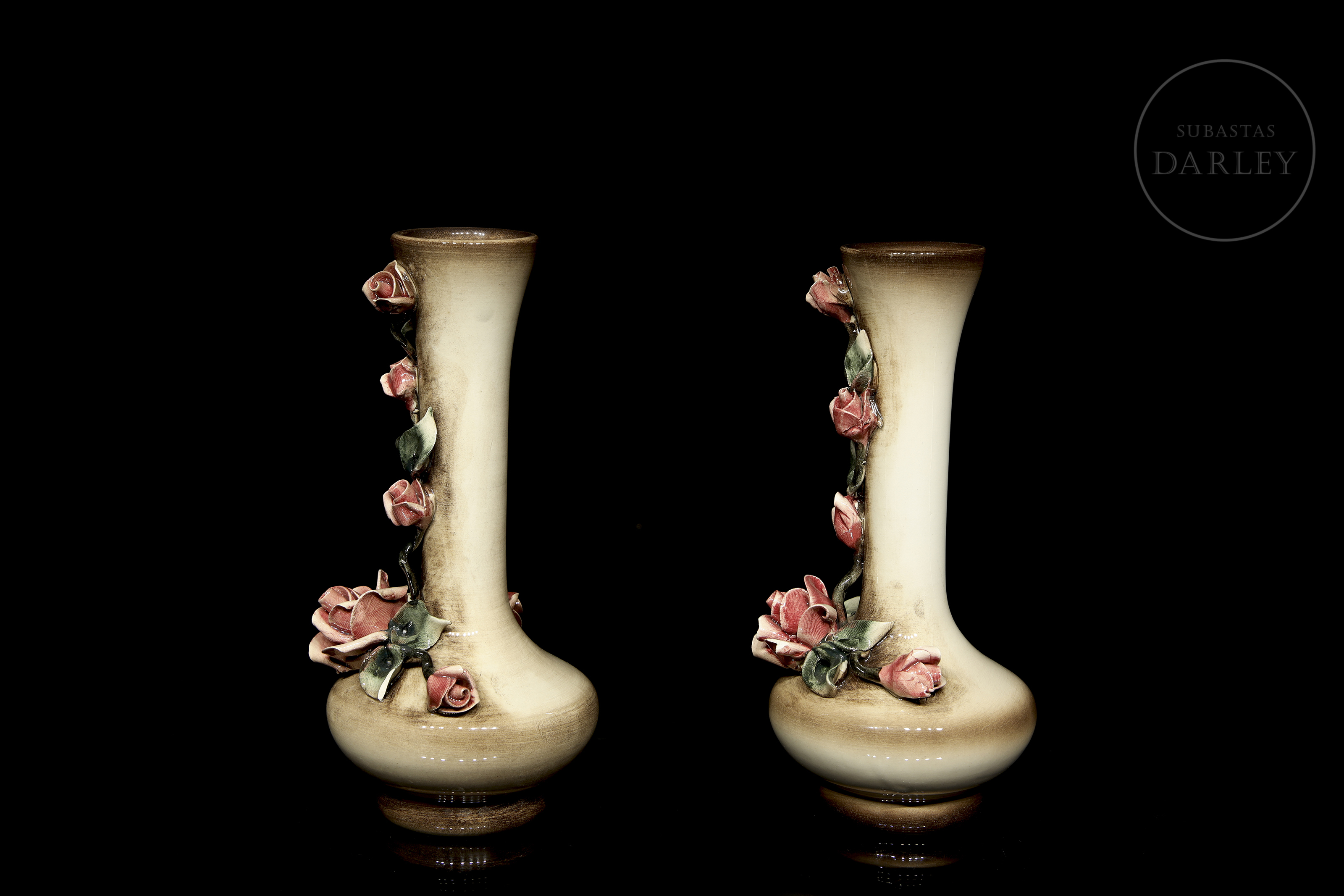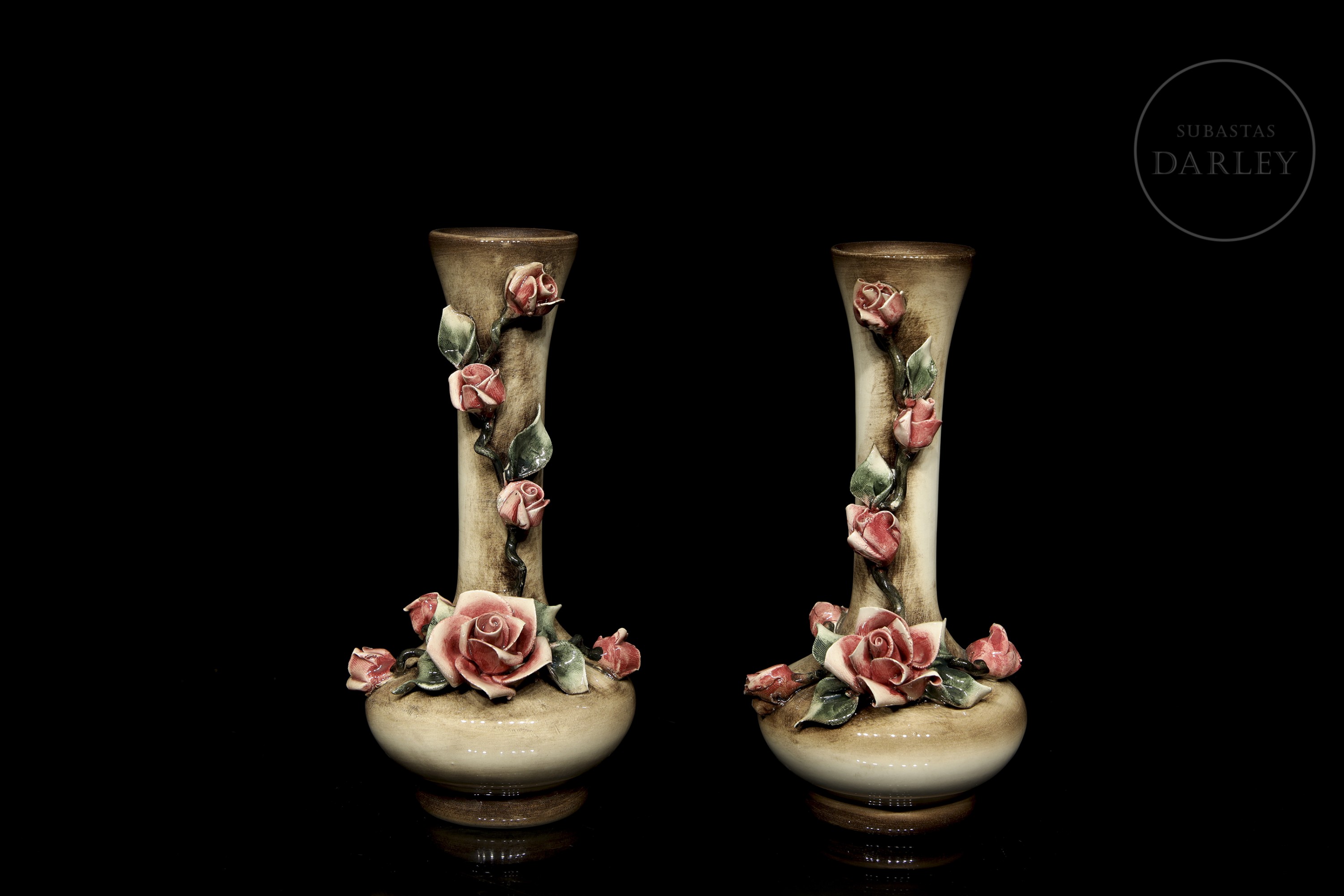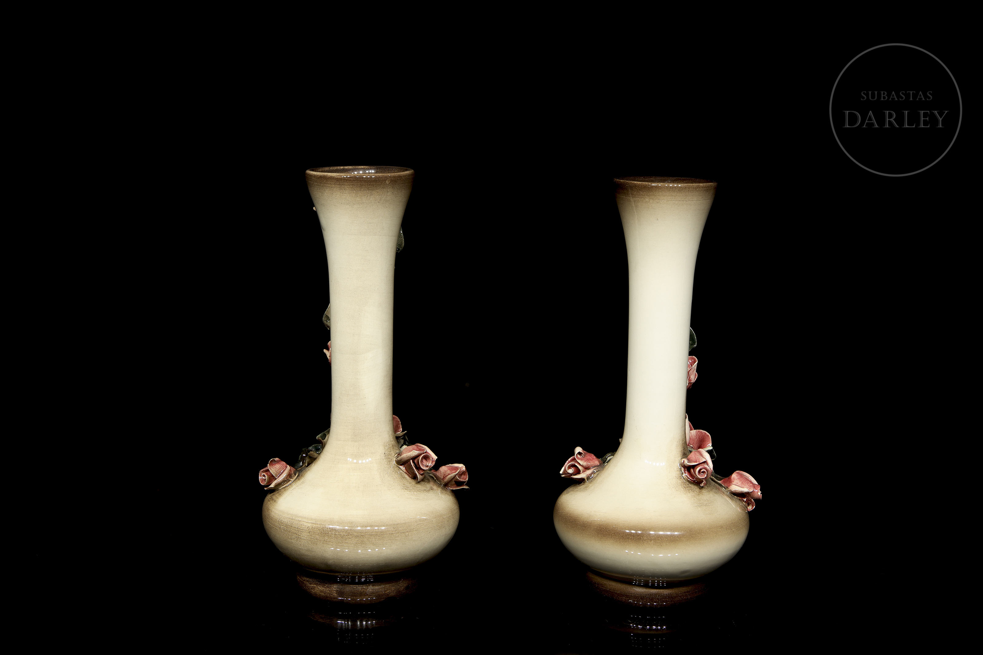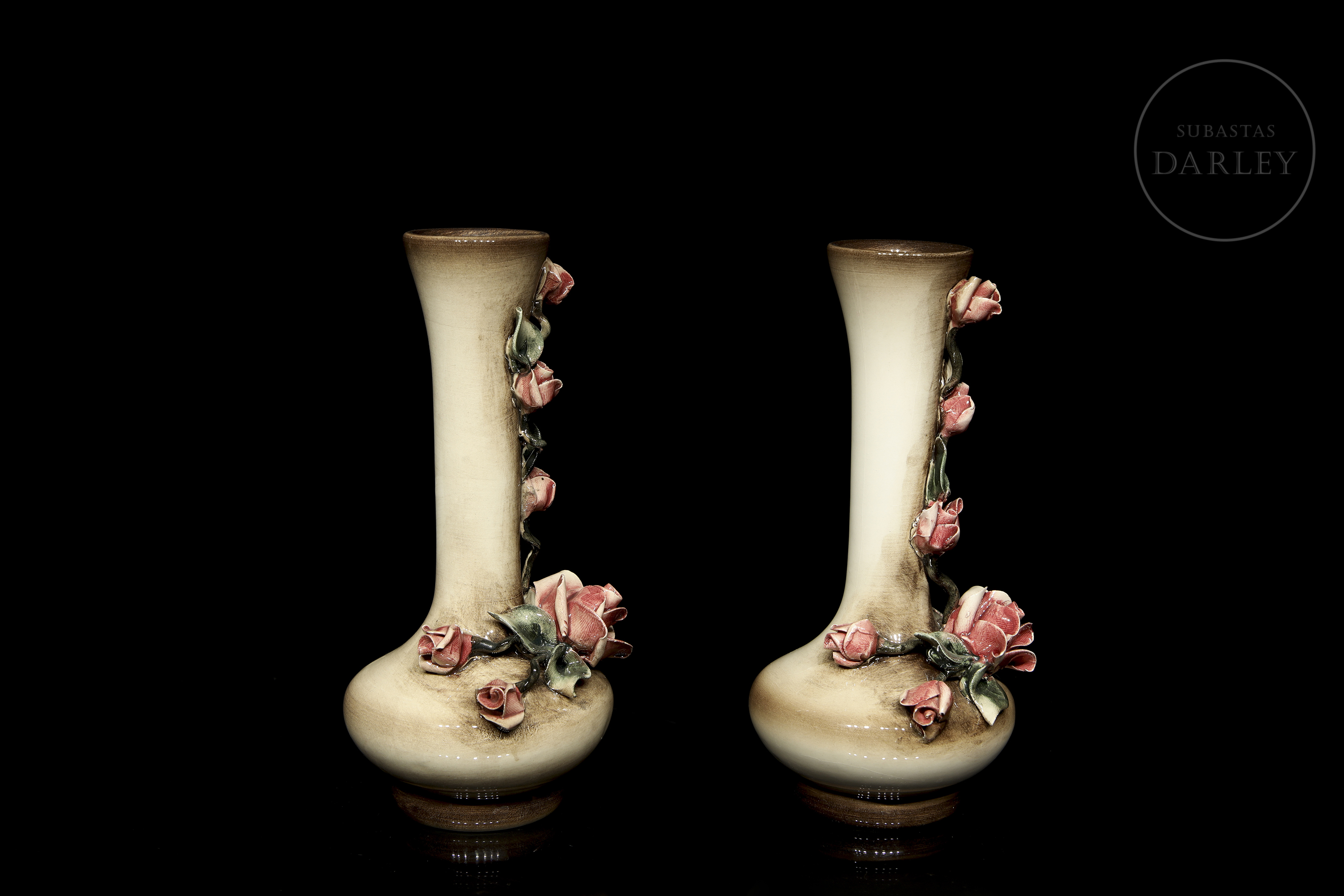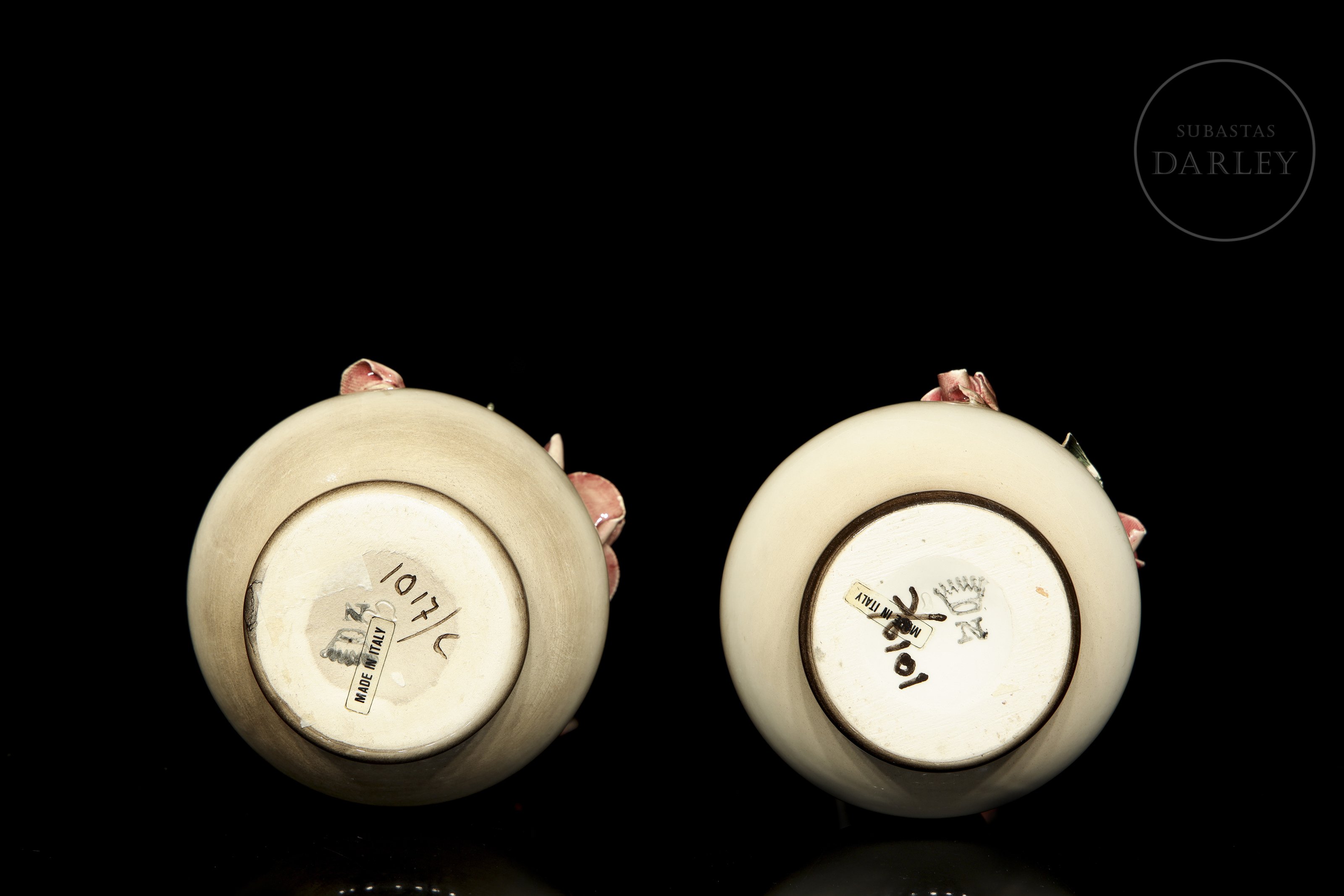 Pareja de pequeños floreros de porcelana modelada y esmaltada, acabado brillo con detalles de flores y hojas. Con ligeros desperfectos. Sellada en la base e indica "Made in Italy/ Md. 1017".