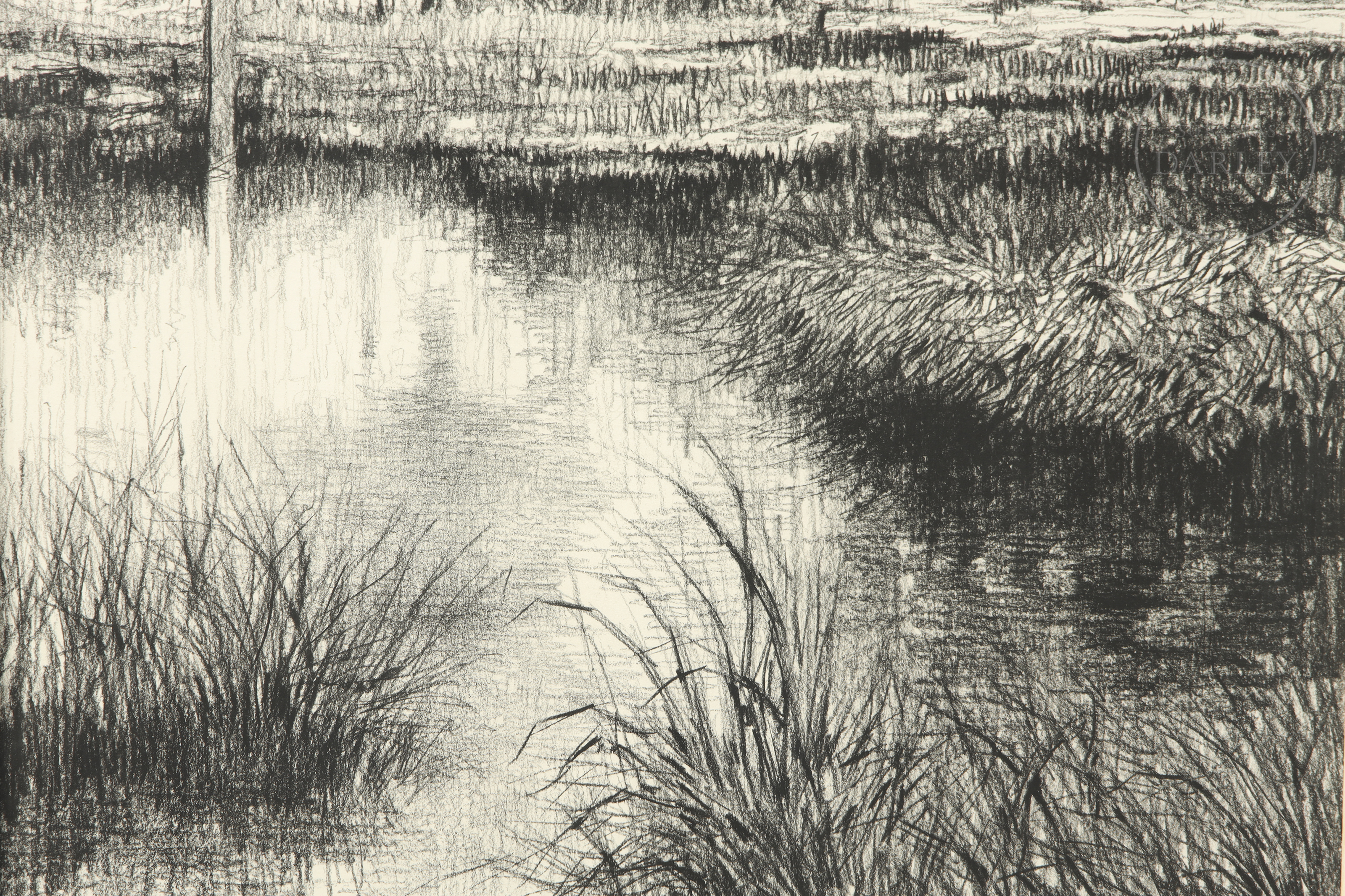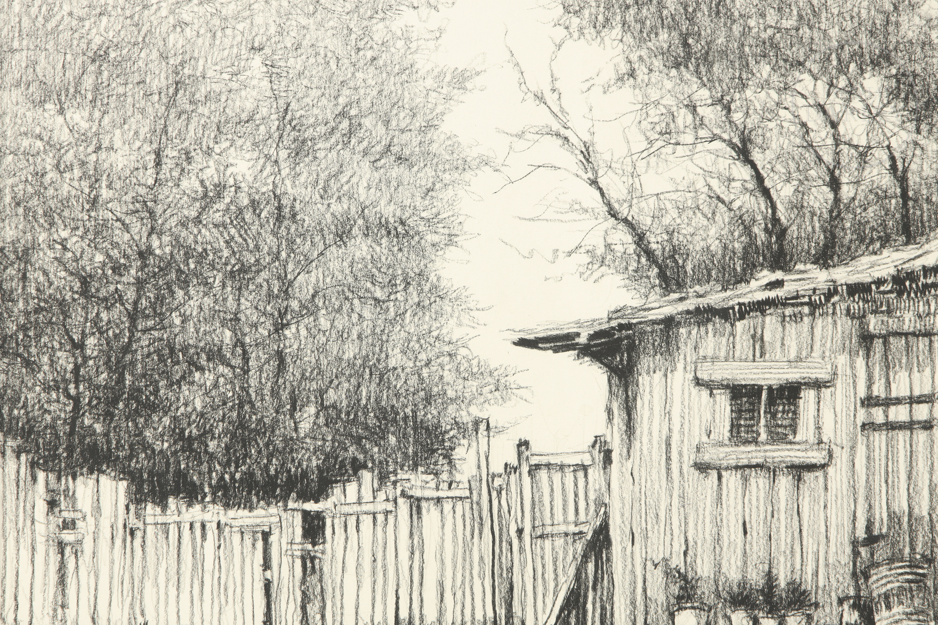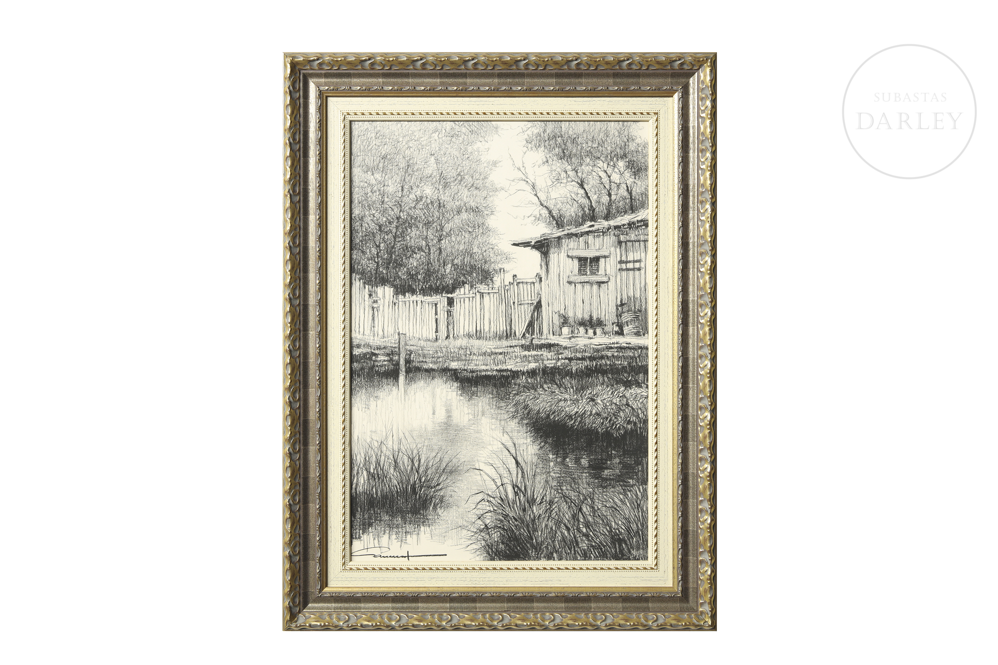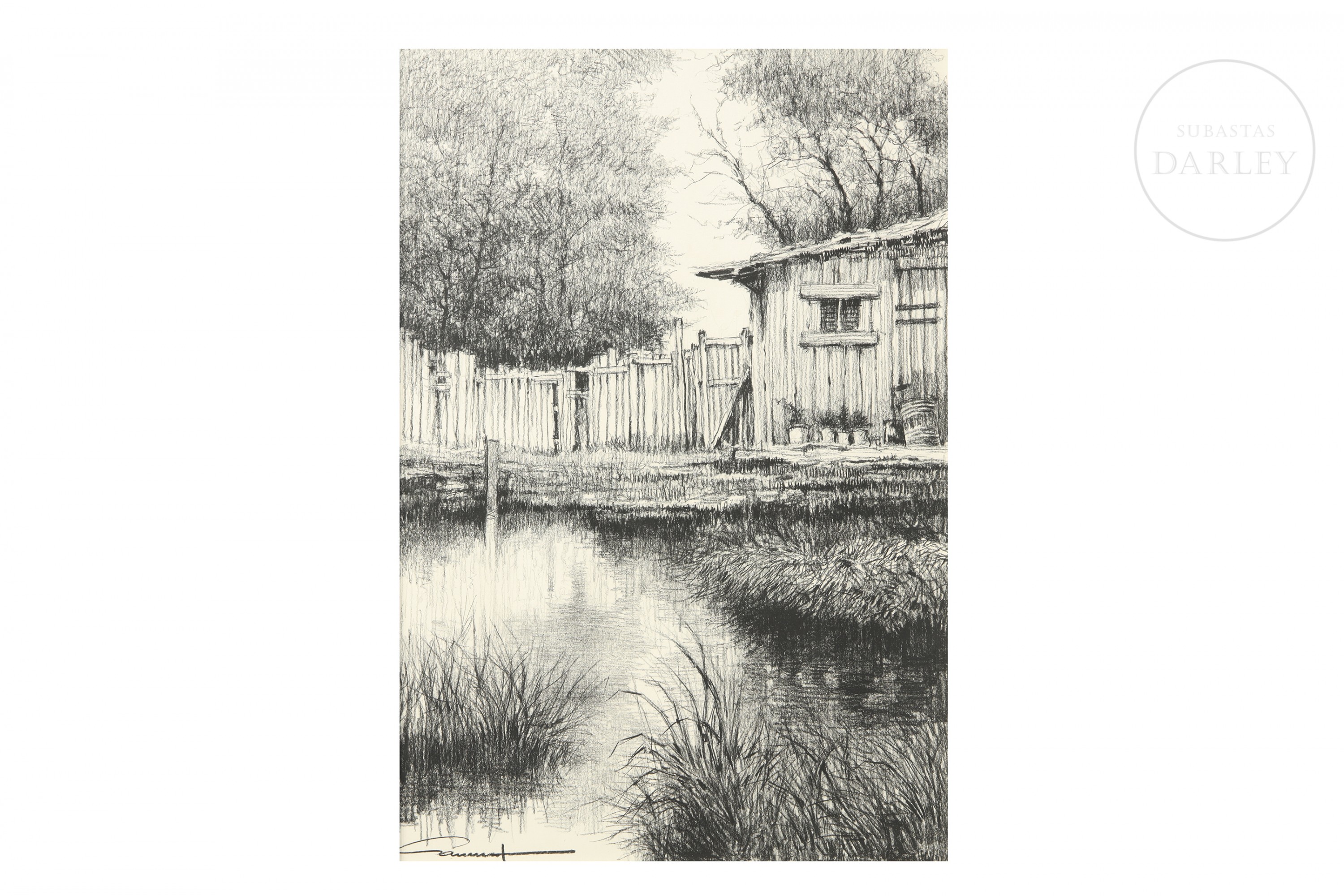 Grafito y lápiz compuesto sobre papel. Dibujo de gran realismo que representa una cabaña de madera y una valla junto a la orilla de un lago o estanque. Firmado "Garrich" en la esquina inferior izquierda.