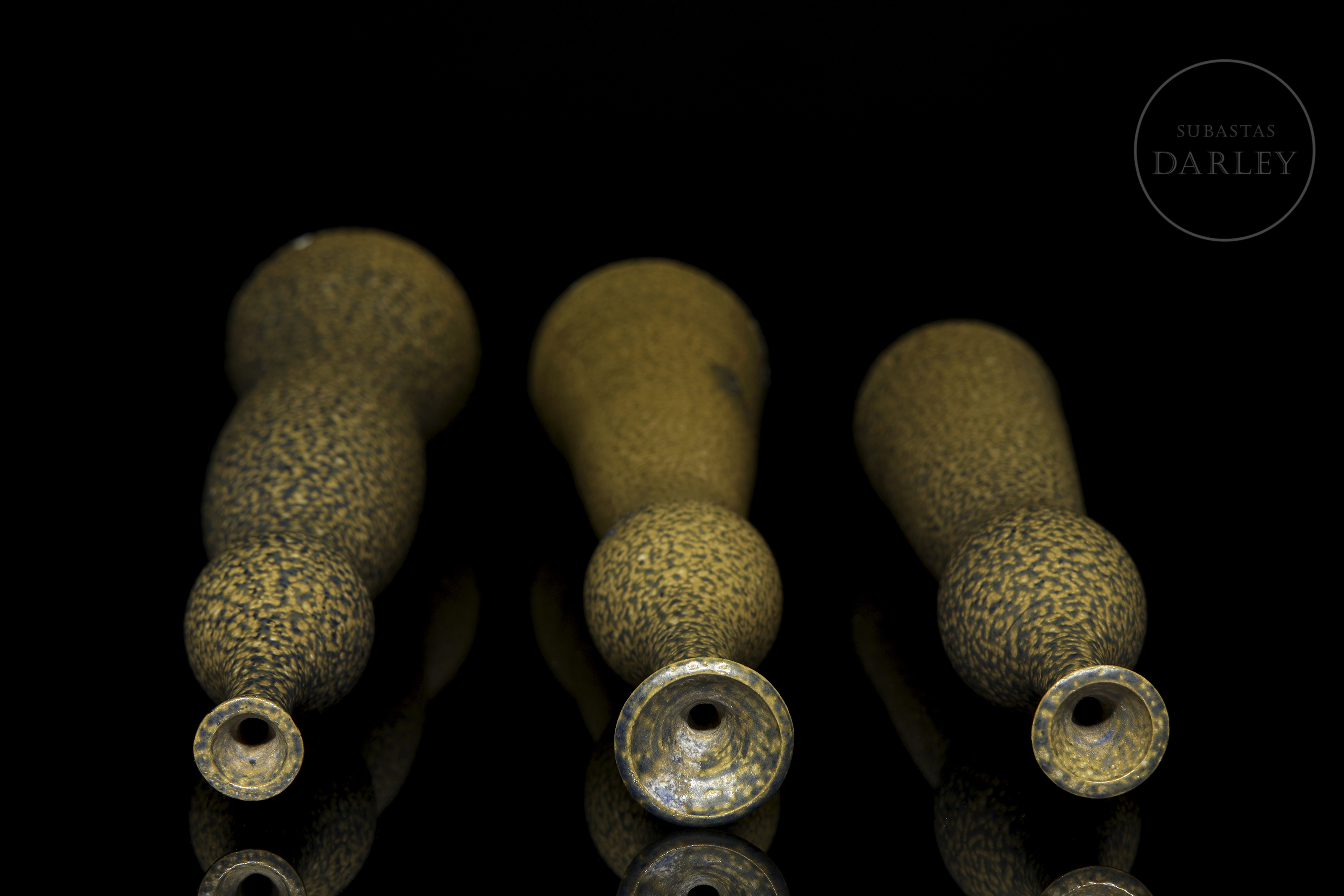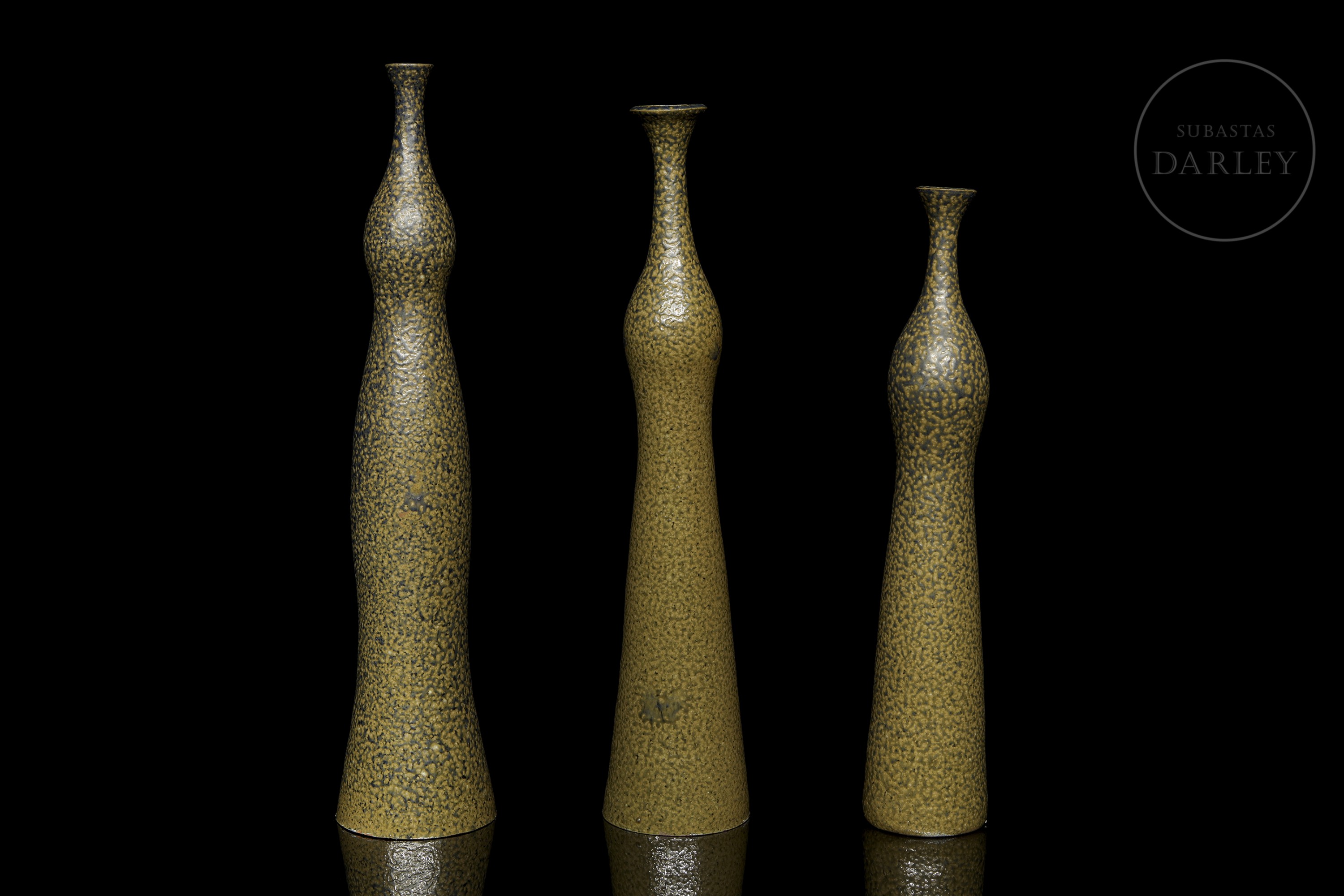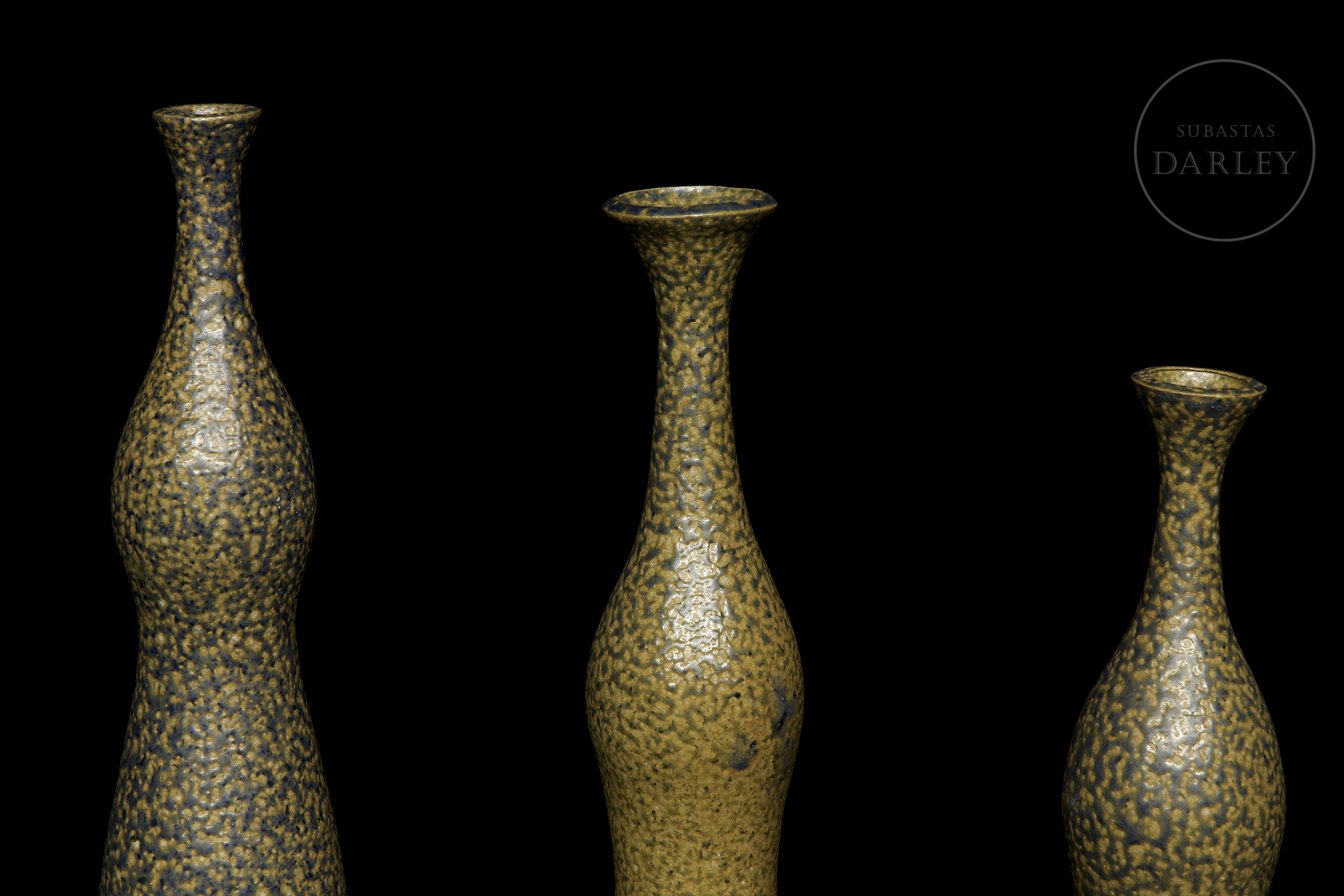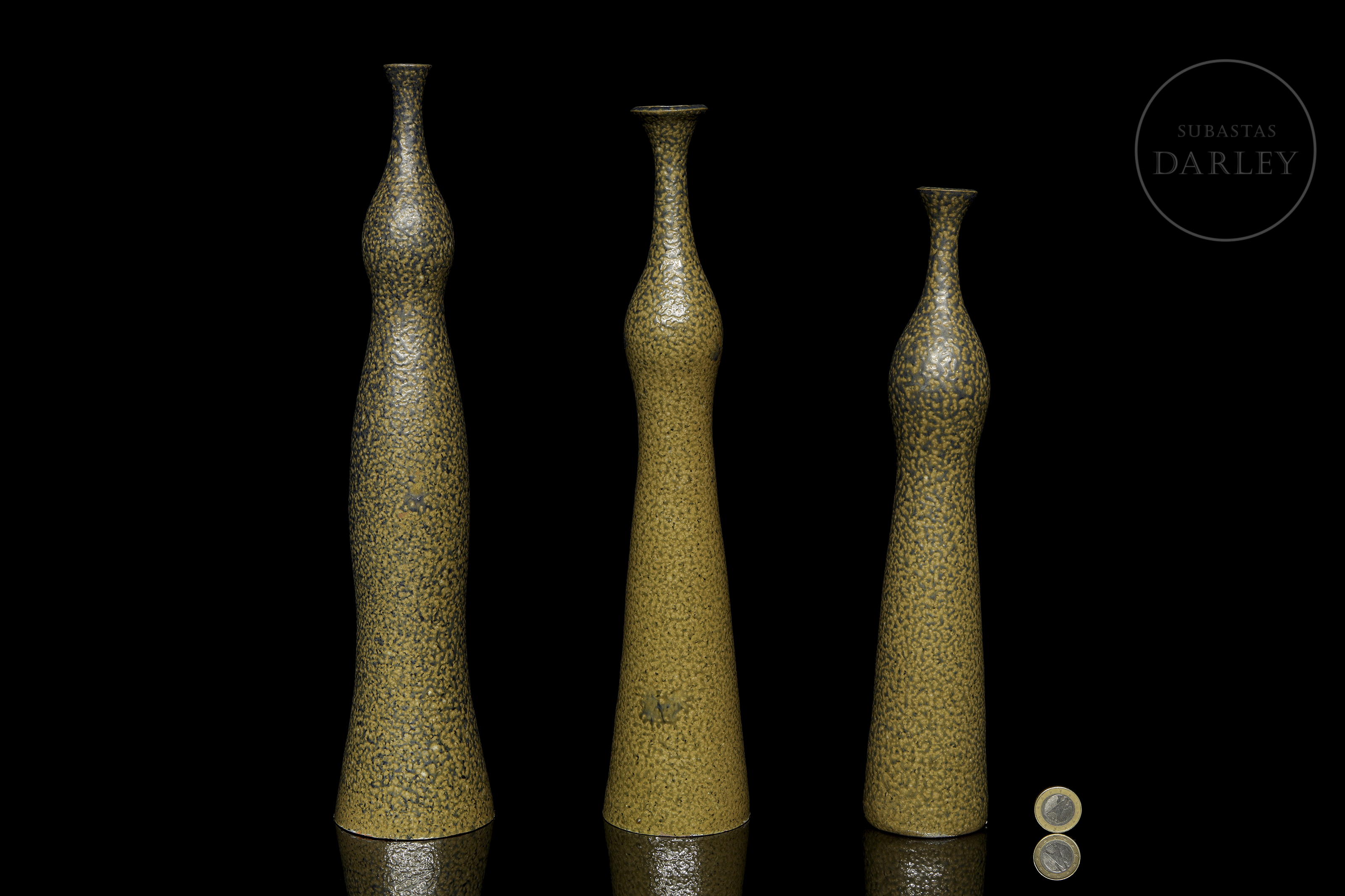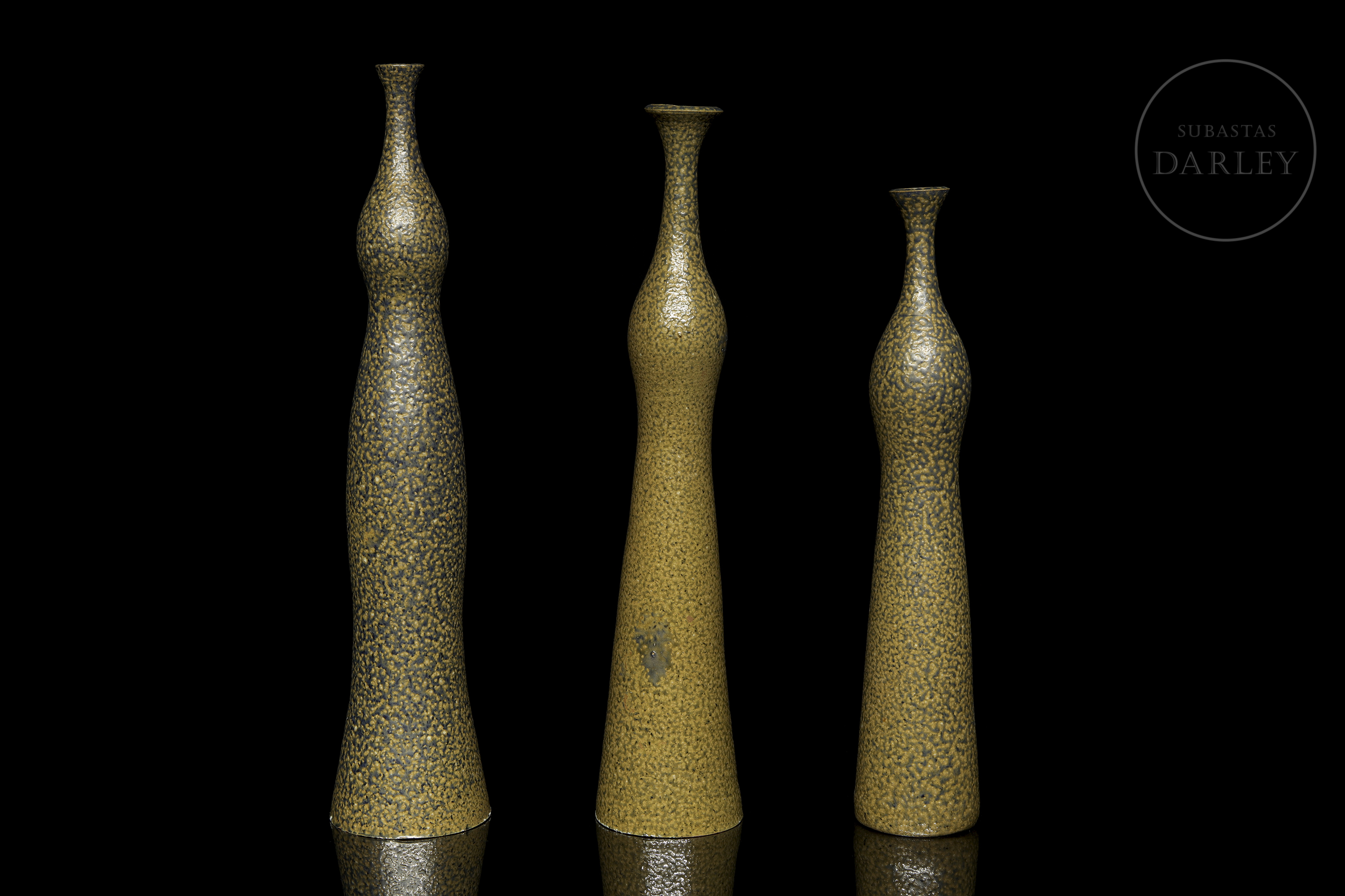 Juego de tres finos jarrones de cerámica modelada y esmaltada, de perfil estilizado y abalaustrado. Realizados por los artesanos Alberto González Rayón y Luisa Lizarraga Iraizoz. Firmados y ubicados en la base.