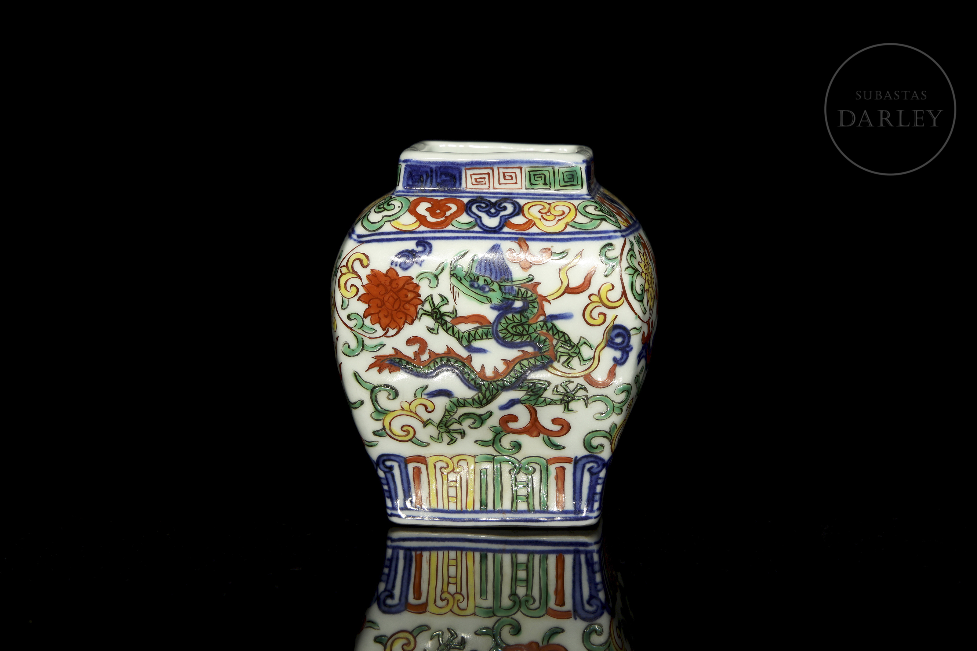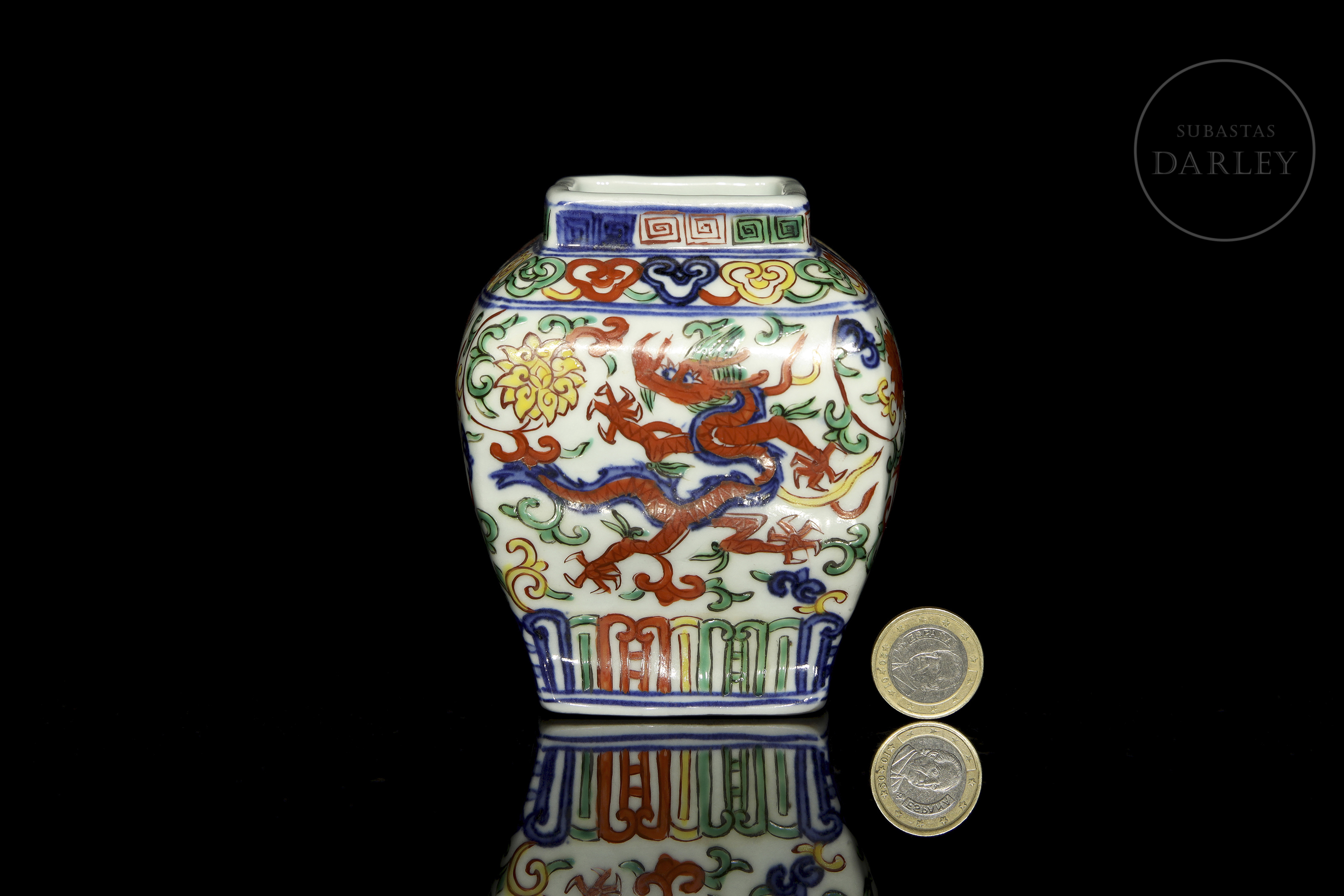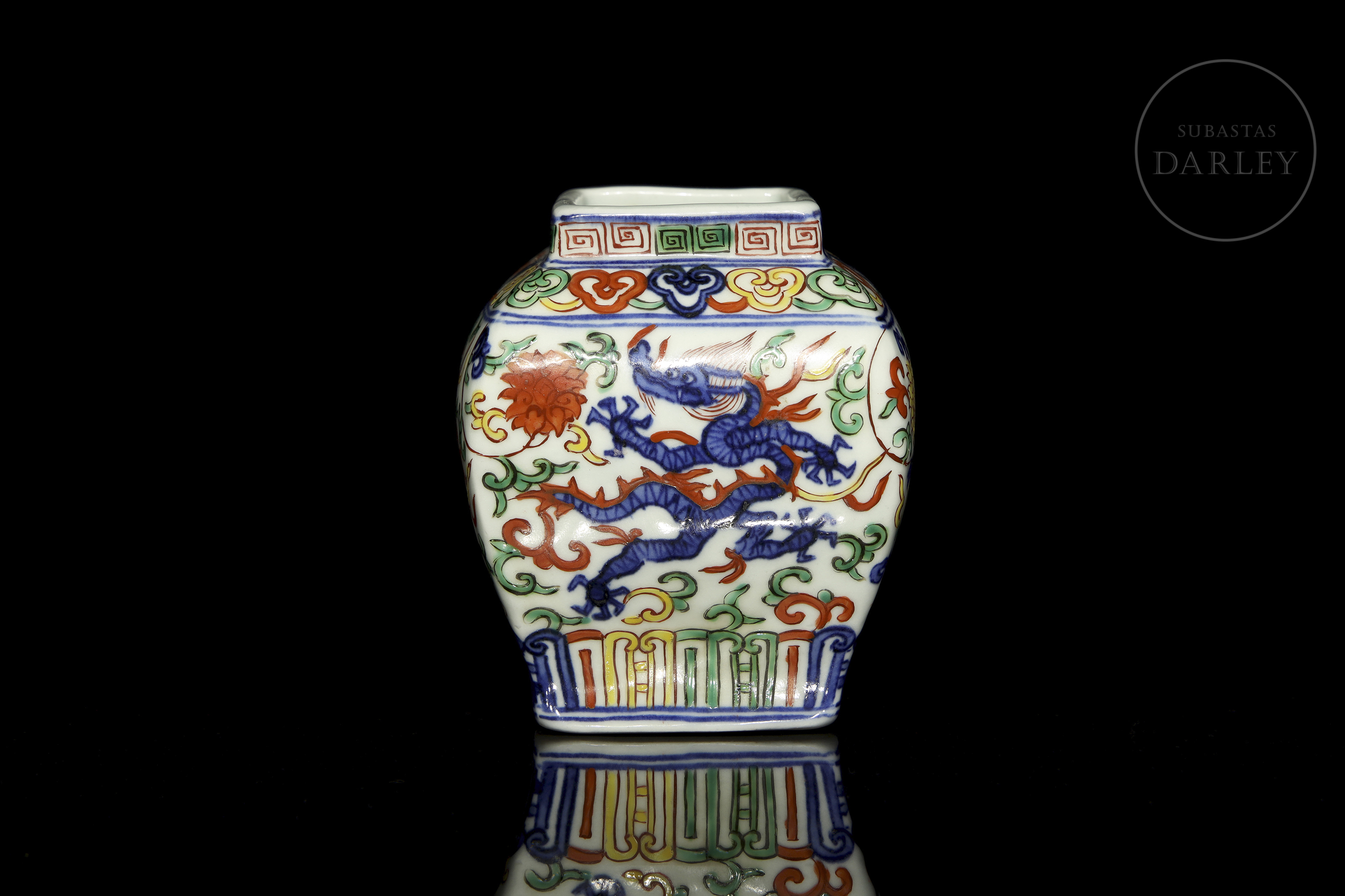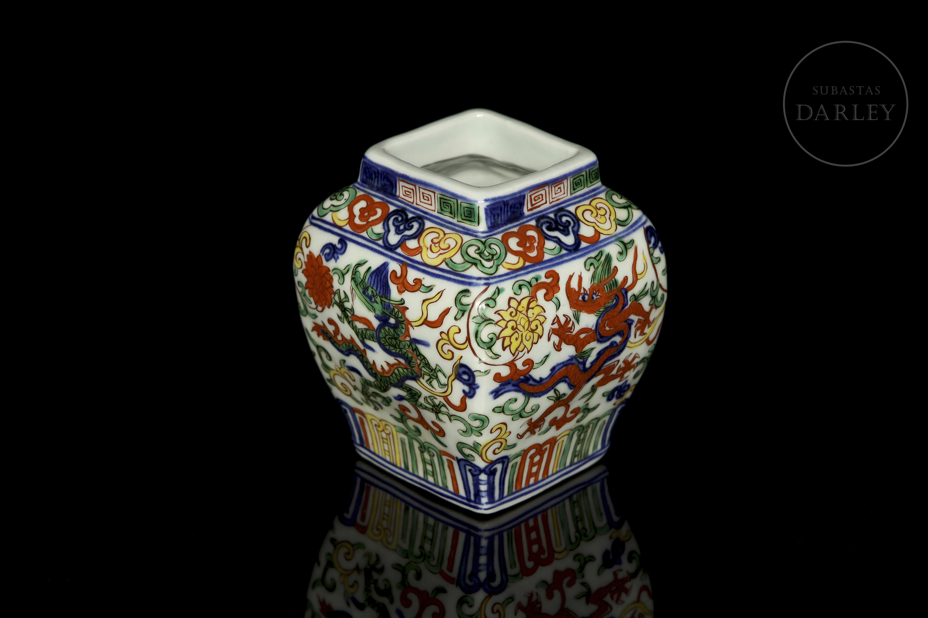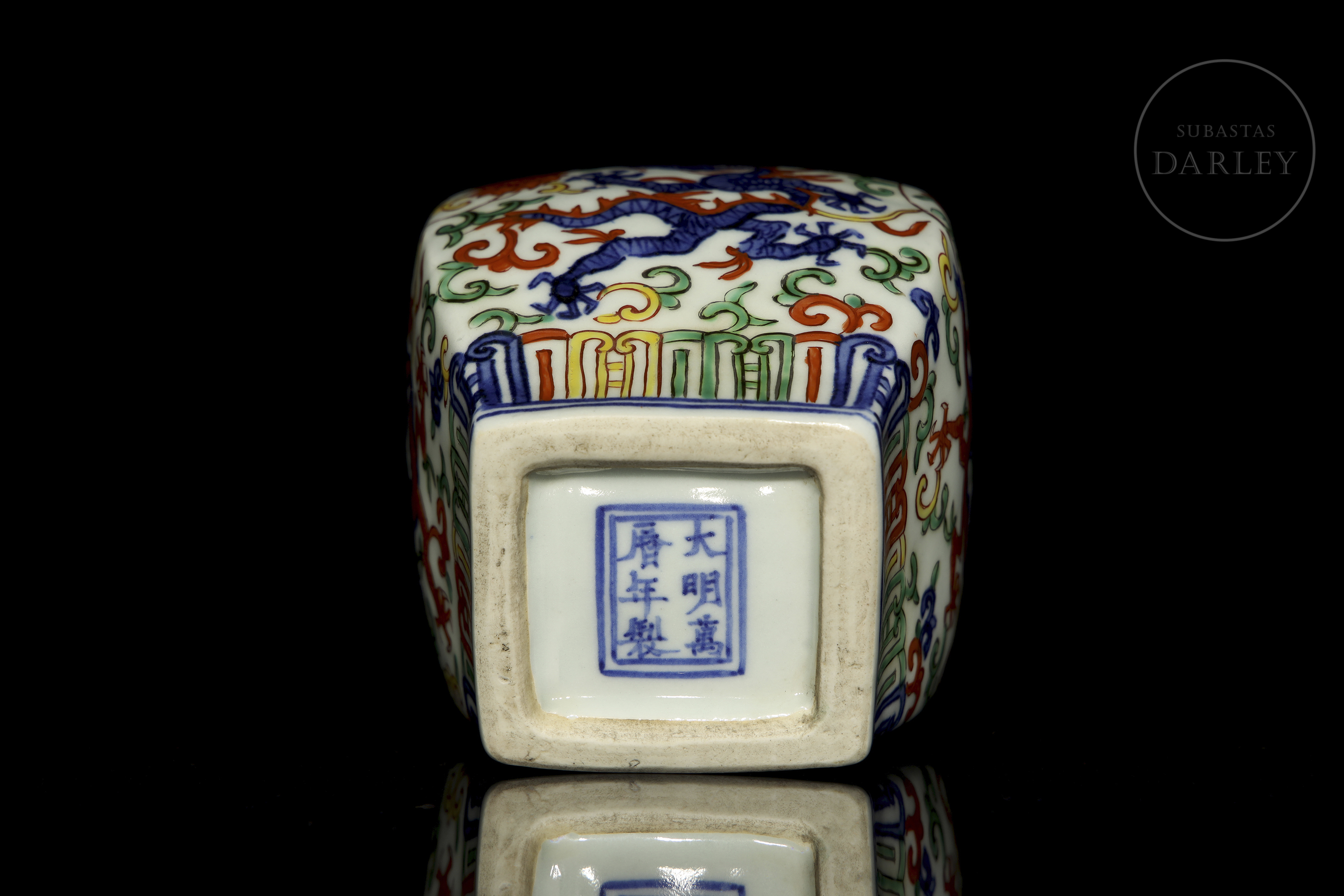 Frasco de porcelana de forma cuadrada, con perfil curvo, hombros redondeados y cuello corto, decorado en esmaltes wucai sobre fondo blanco. Cada una de sus cuatro caras presenta un dragón de cinco garras, rodeado de nubes estilizadas, flores de loto y volutas. Frisos geométricos decoran el cuello y el pie. En la base se encuentra un sello en azul bajo vidriado "大明万历年制".
