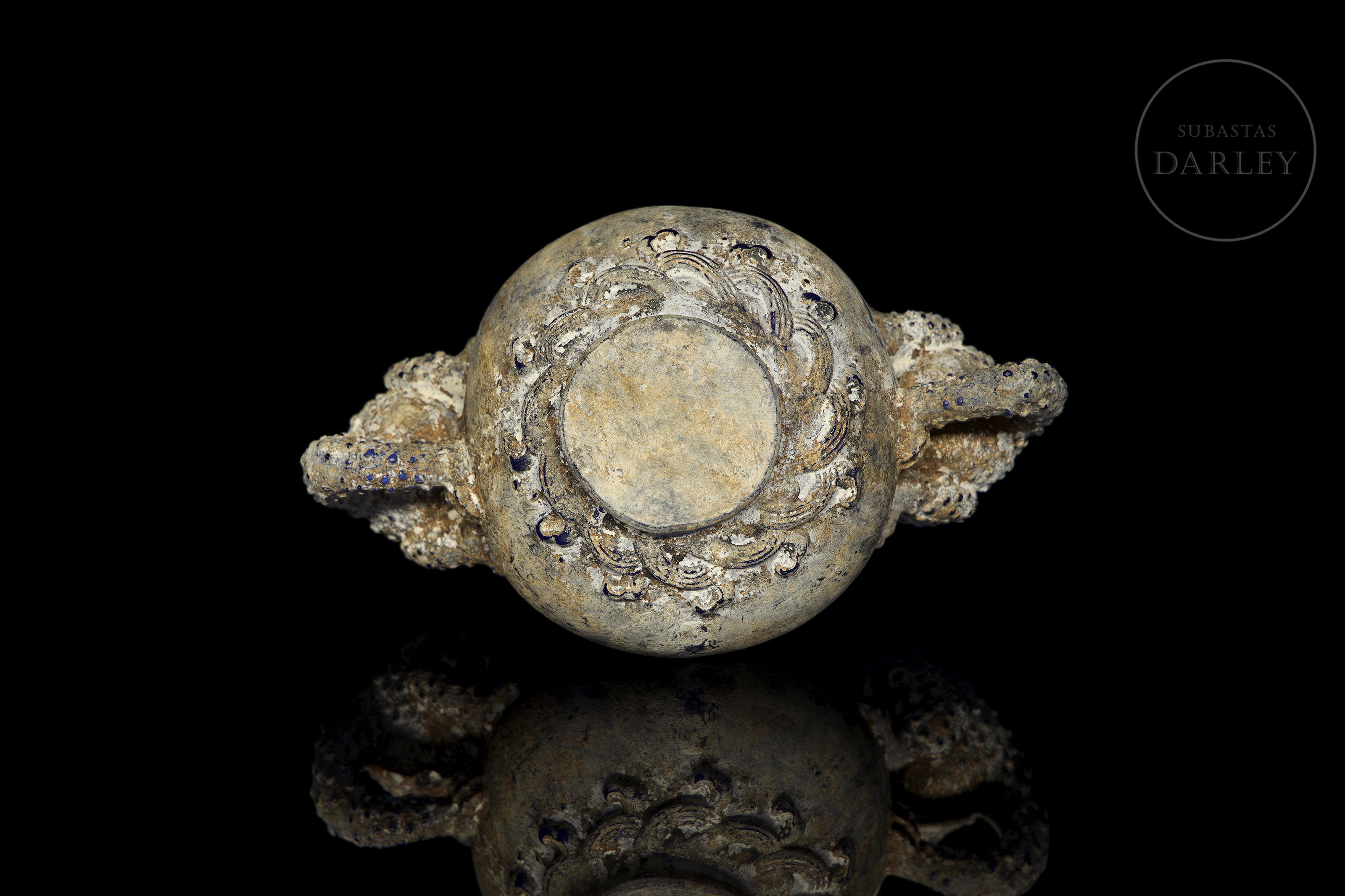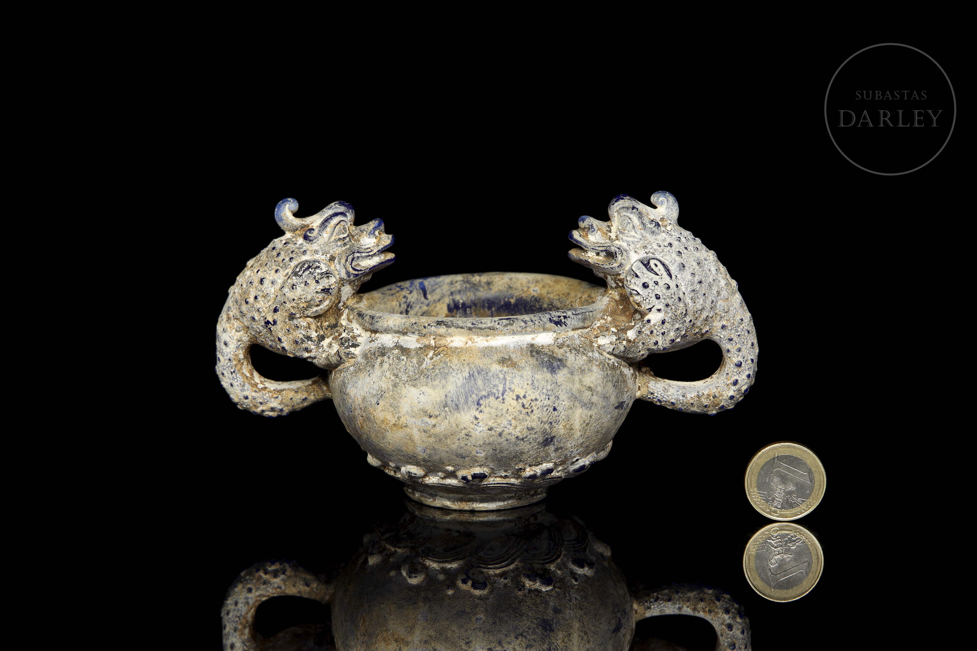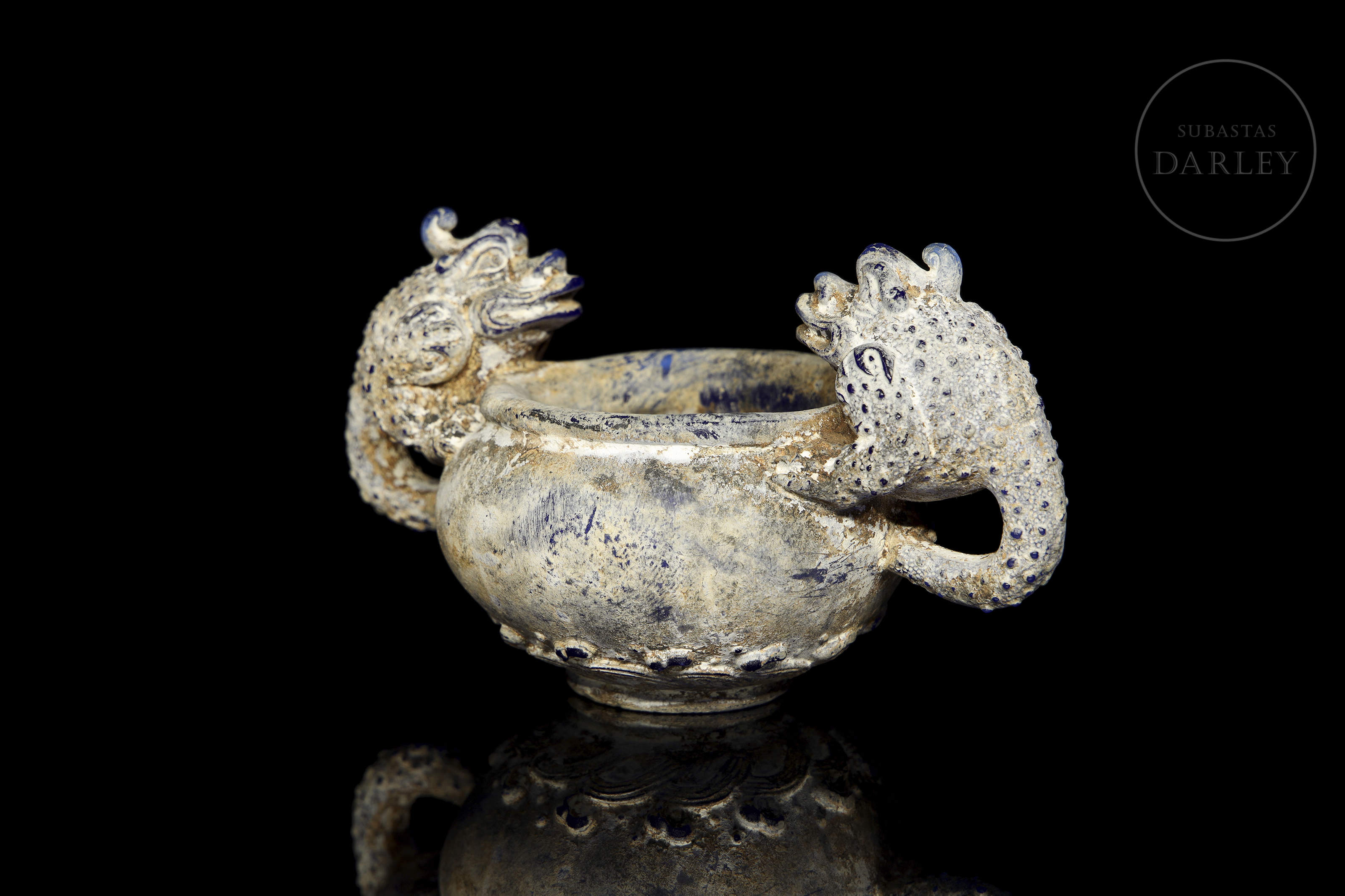 Realizado en vidrio "liulí" (琉璃) de color azul cobalto con una densa pátina con concreciones terrosas. La pieza presenta un cuerpo globular con dos asas laterales de gran tamaño, magistralmente modeladas en forma de bestias mitológicas con escamas y detalles en relieve. El borde es circular, mientras que la base está decorada con una banda de olas estilizadas. Dinastía Han (206 a.C. – 220 d.C.) o posterior.