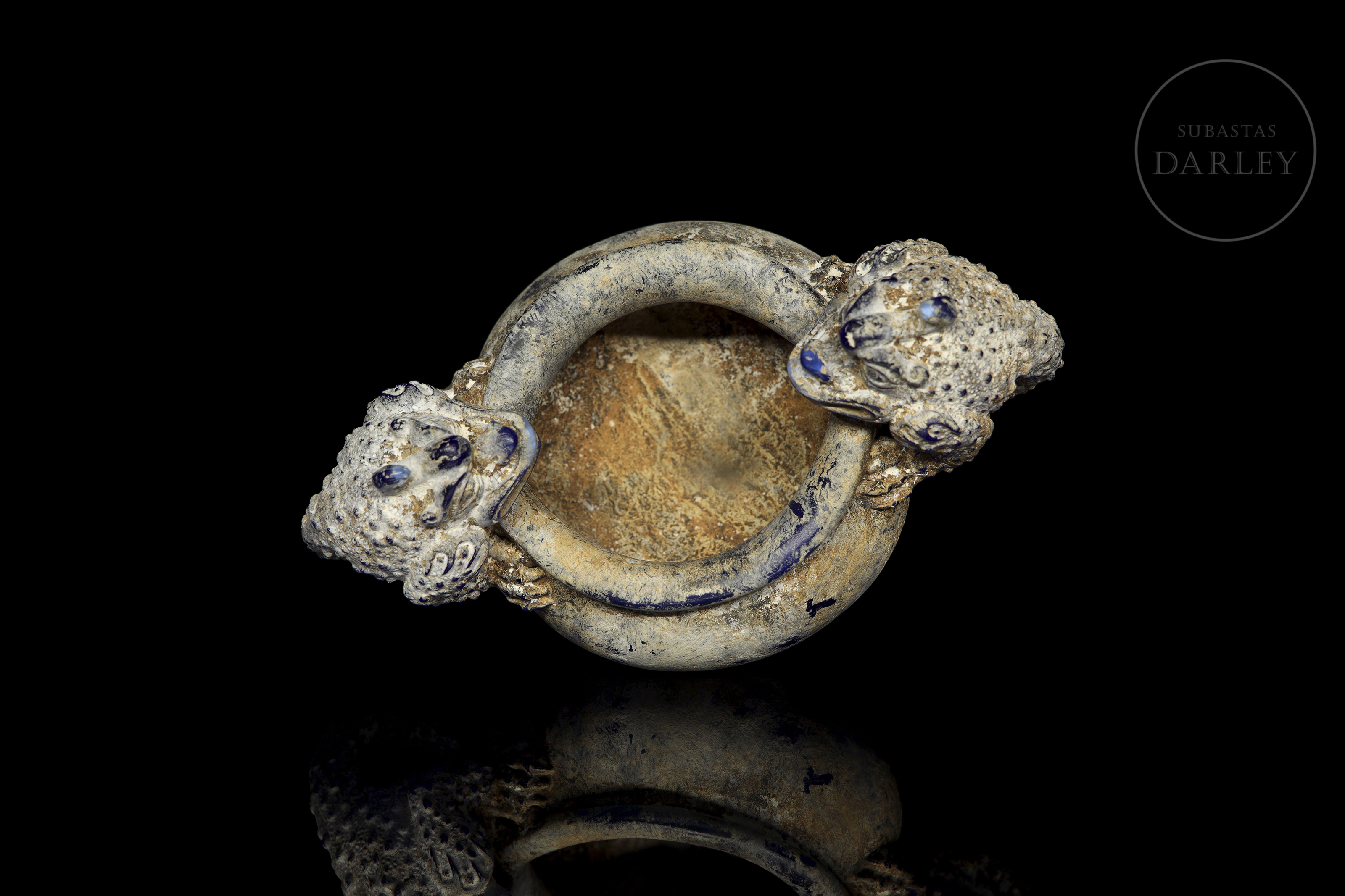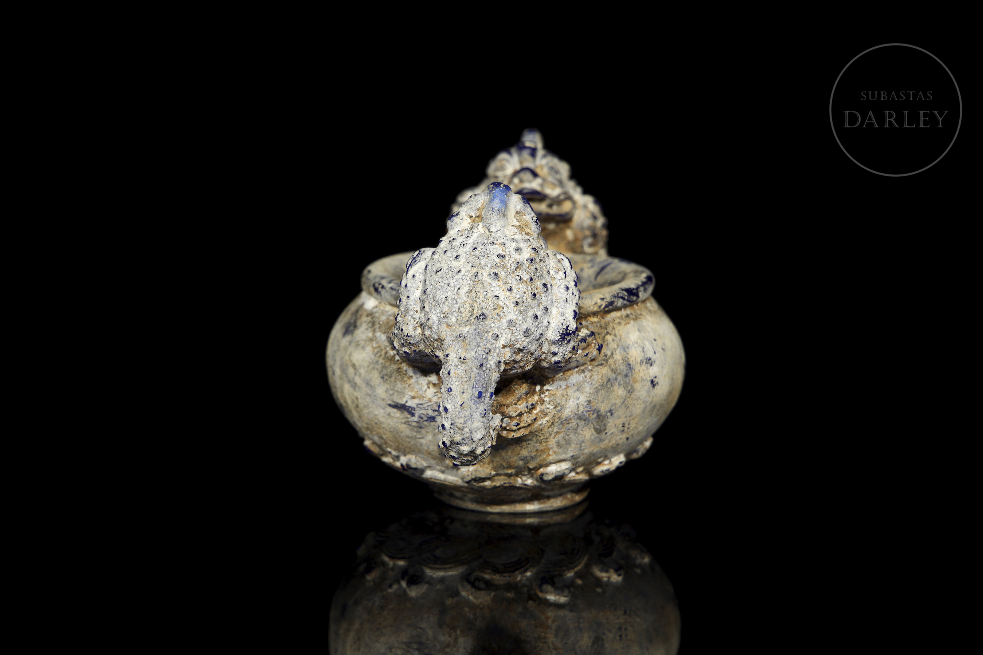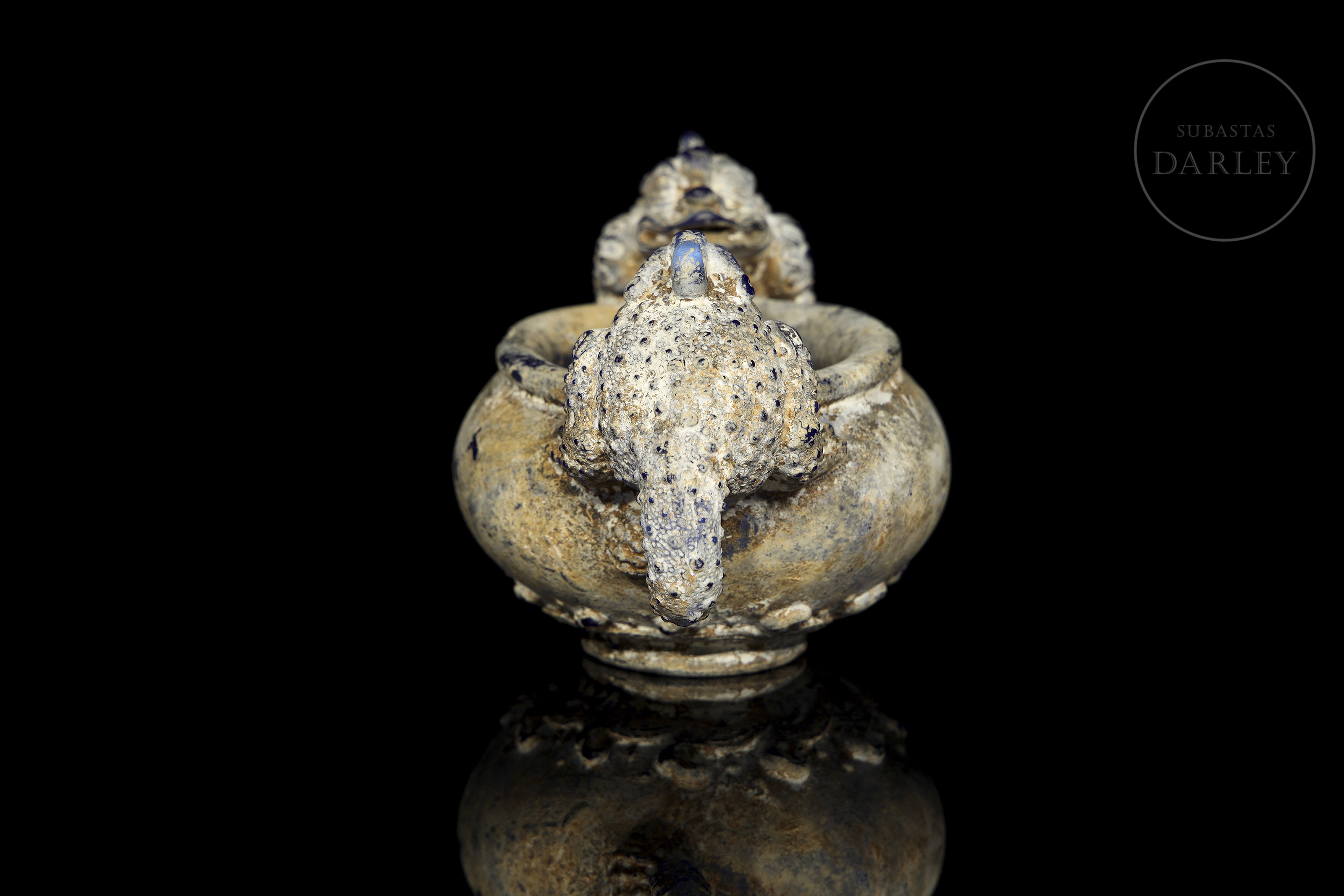 Realizado en vidrio "liulí" (琉璃) de color azul cobalto con una densa pátina con concreciones terrosas. La pieza presenta un cuerpo globular con dos asas laterales de gran tamaño, magistralmente modeladas en forma de bestias mitológicas con escamas y detalles en relieve. El borde es circular, mientras que la base está decorada con una banda de olas estilizadas. Dinastía Han (206 a.C. – 220 d.C.) o posterior.