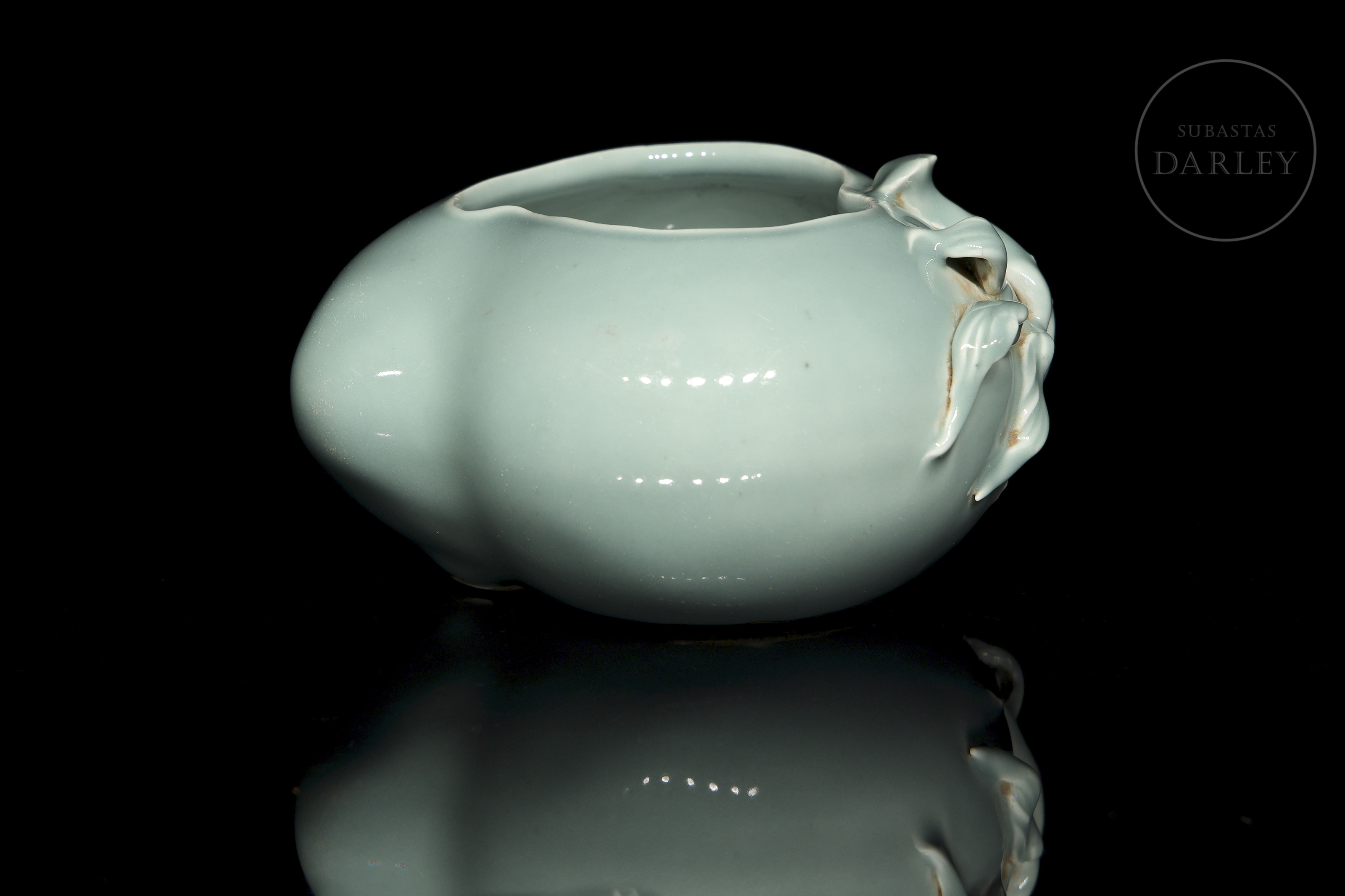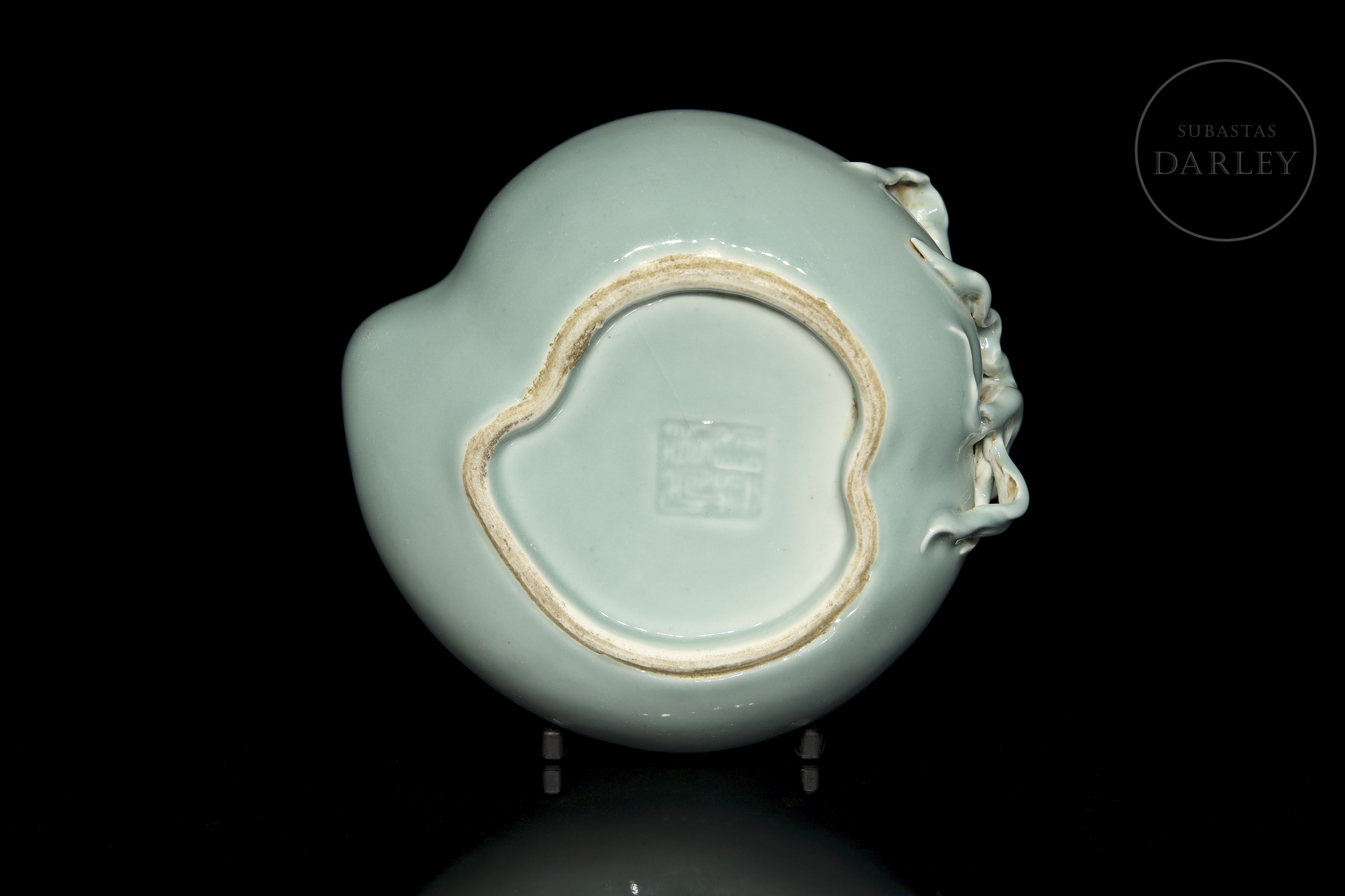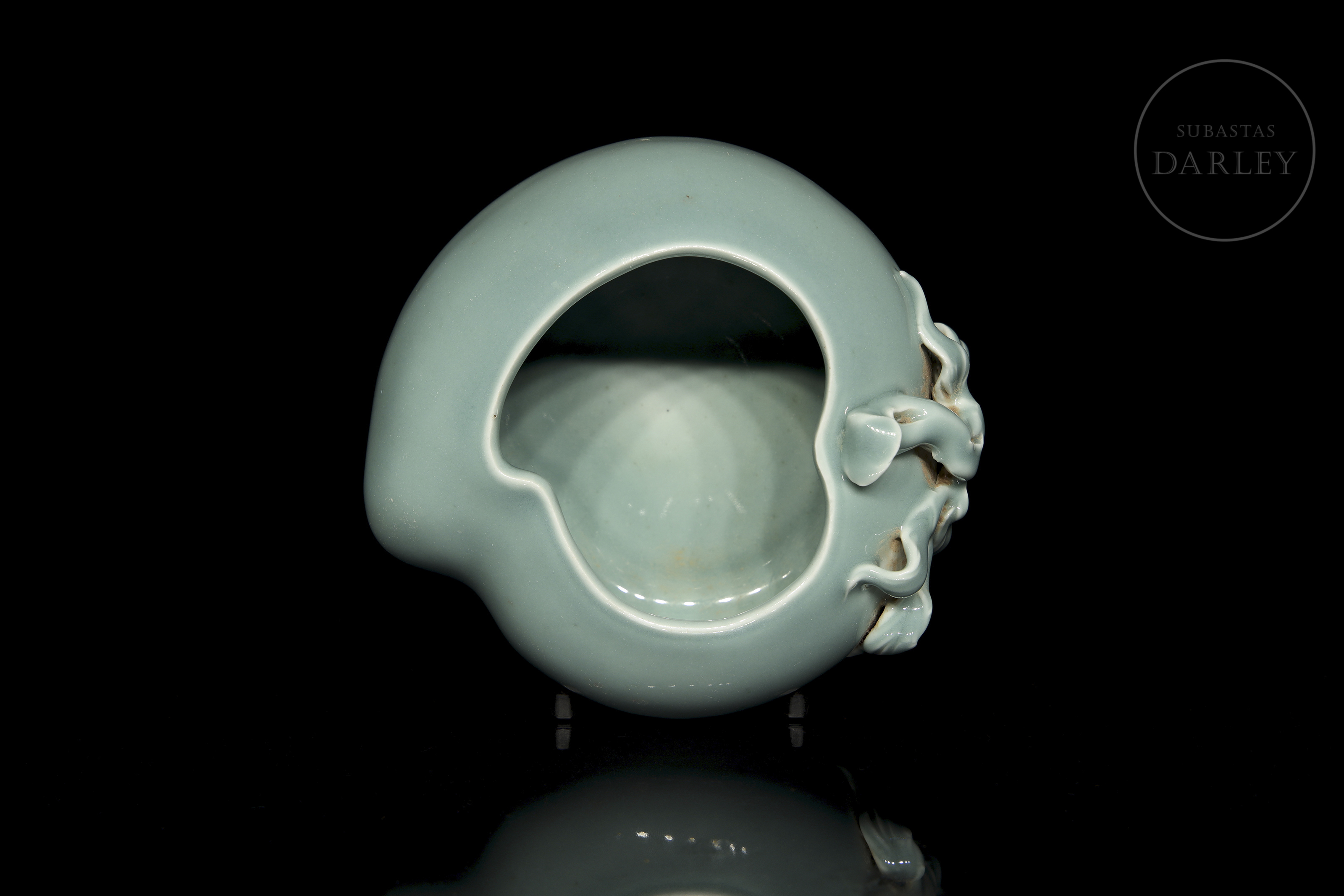 Tintero de porcelana esmaltada en tono celadón claro, moldeado en forma de melocotón, símbolo de longevidad. En uno de sus lados se observa una enroscada rama cuyas hojas se curvan sobre la superficie. La base muestra un sello de cuatro caracteres "乾隆年制" realizado en relieve.