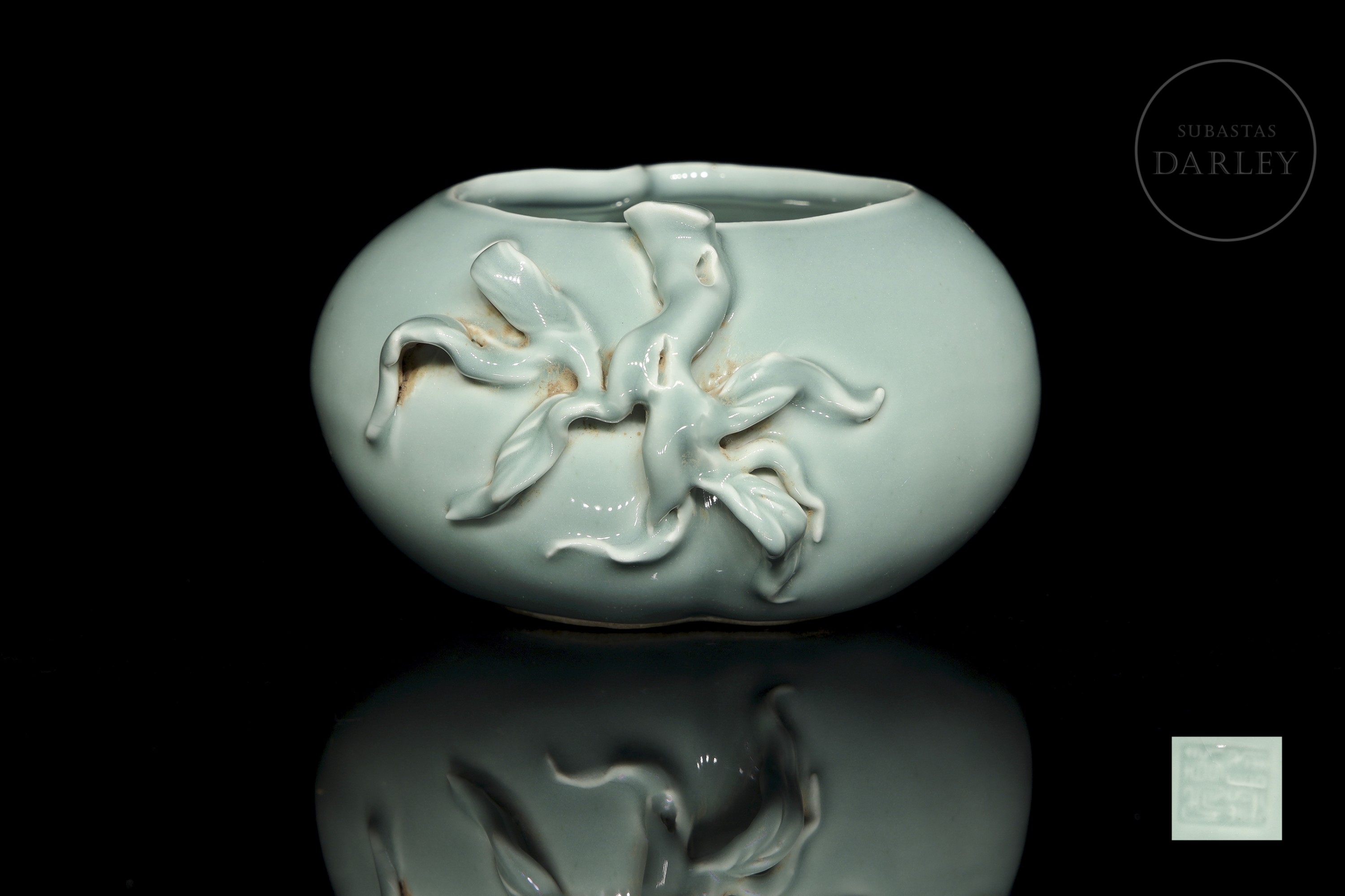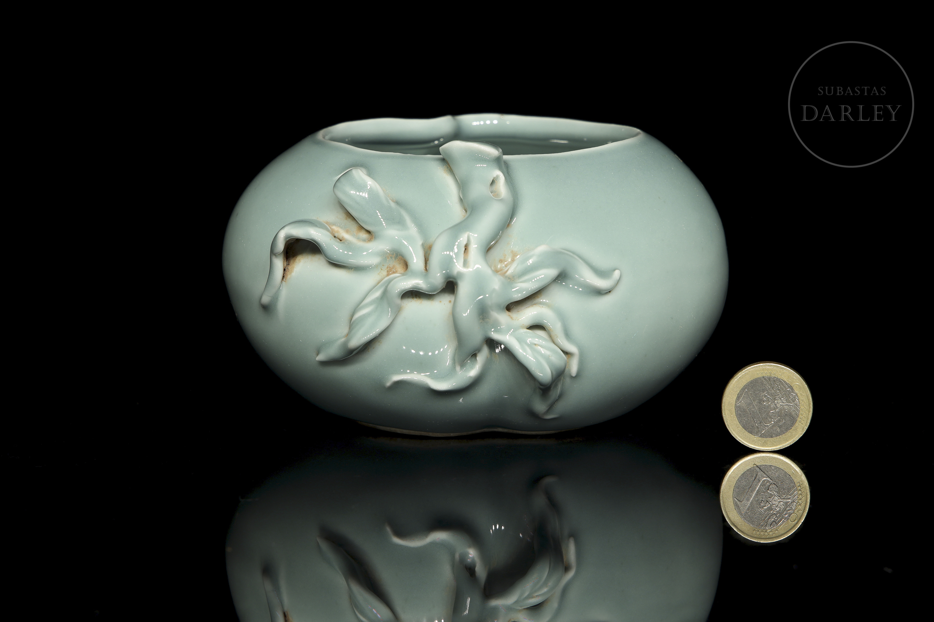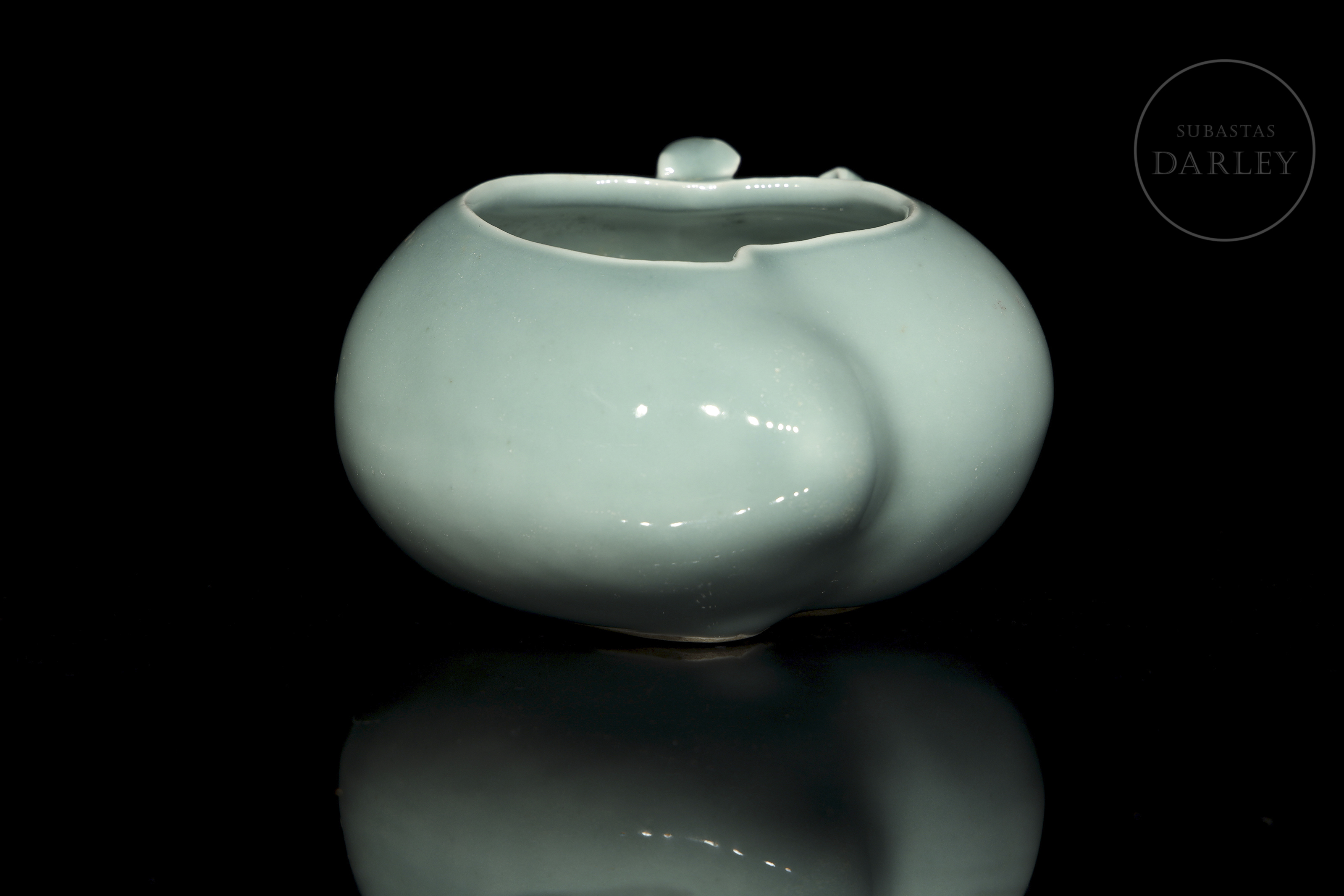 Tintero de porcelana esmaltada en tono celadón claro, moldeado en forma de melocotón, símbolo de longevidad. En uno de sus lados se observa una enroscada rama cuyas hojas se curvan sobre la superficie. La base muestra un sello de cuatro caracteres "乾隆年制" realizado en relieve.