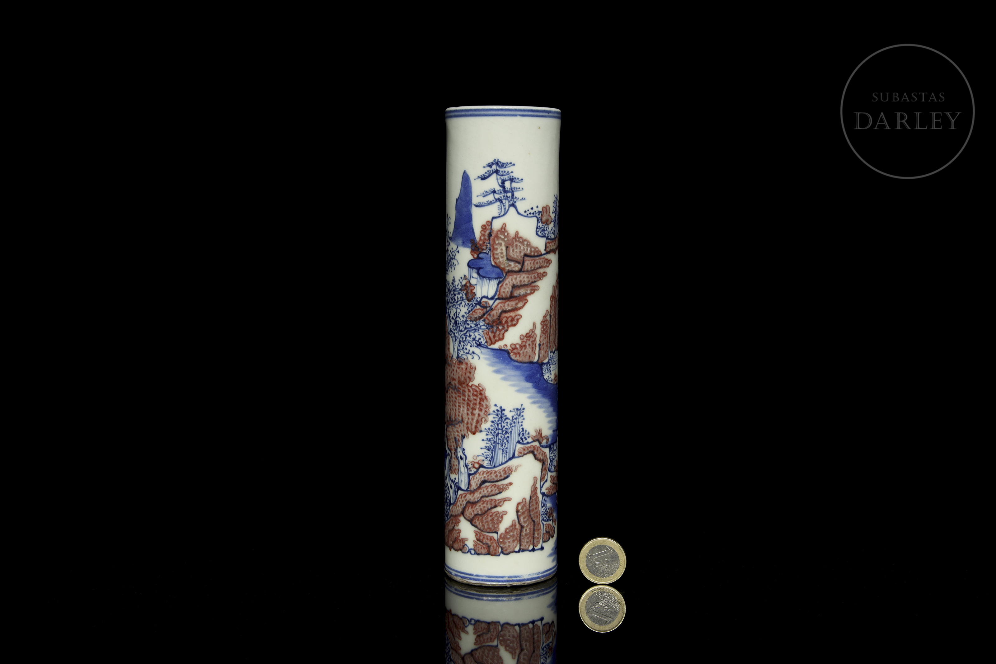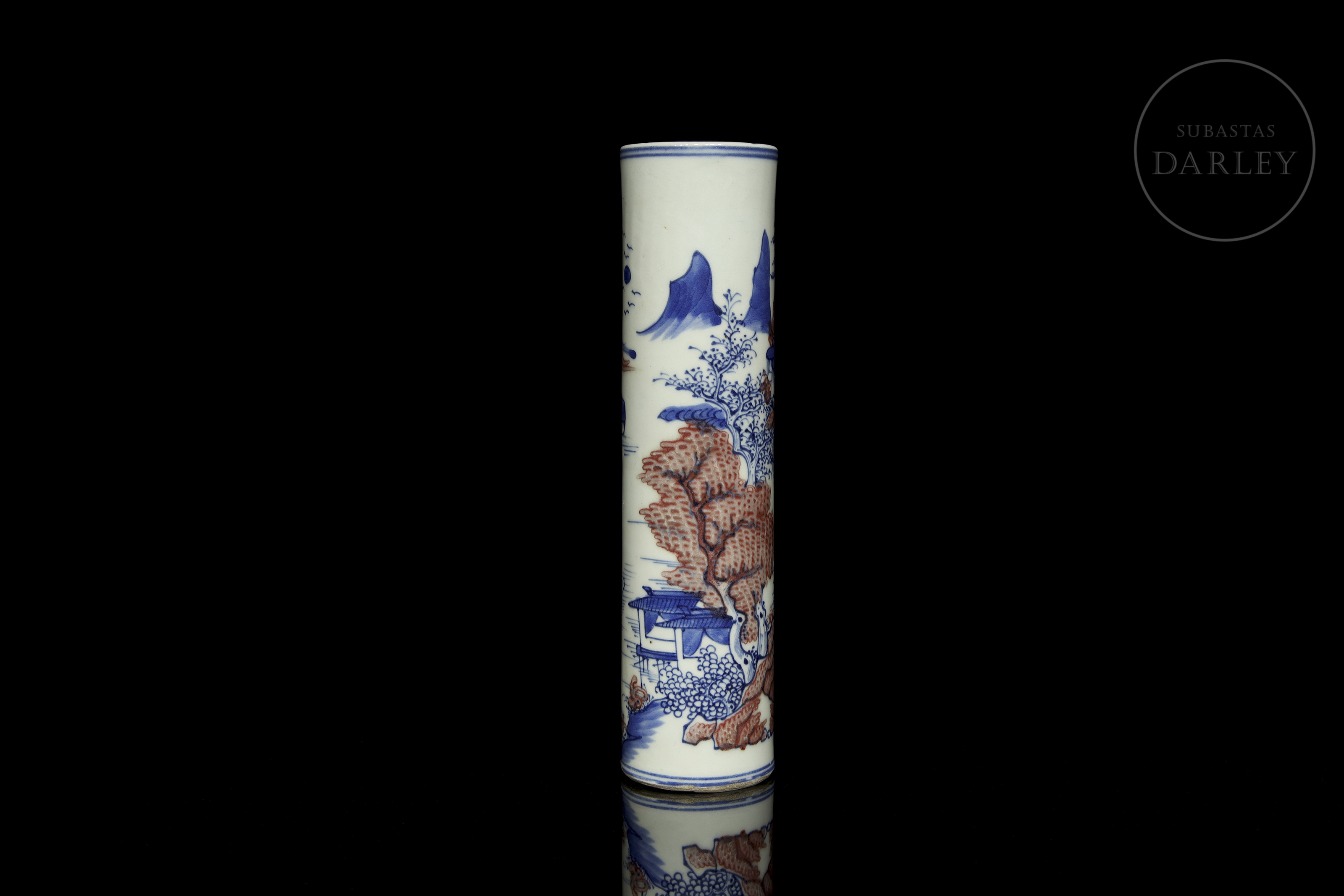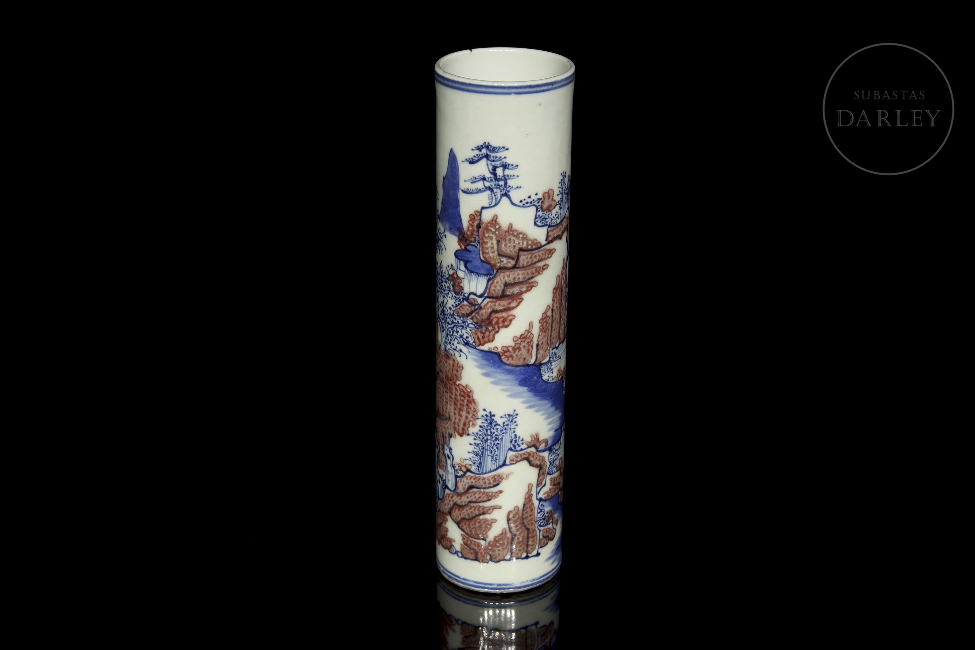 Recipiente de porcelana modelada, de forma cilíndrica, adornado en el perímetro por una escena continua de un paisaje montañoso en azul cobalto y rojo hierro. Se observan formaciones rocosas, árboles, casas y un pequeño río, todo ello enmarcado por dos dobles líneas azules.