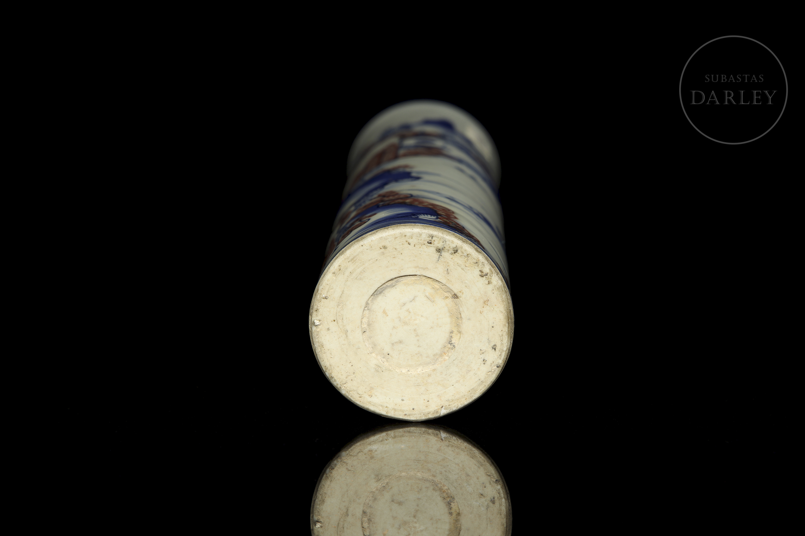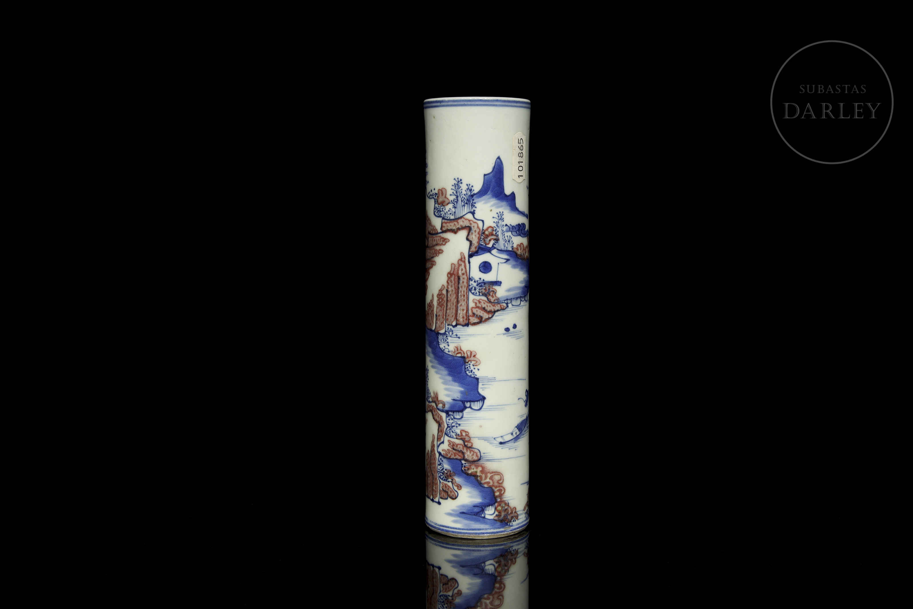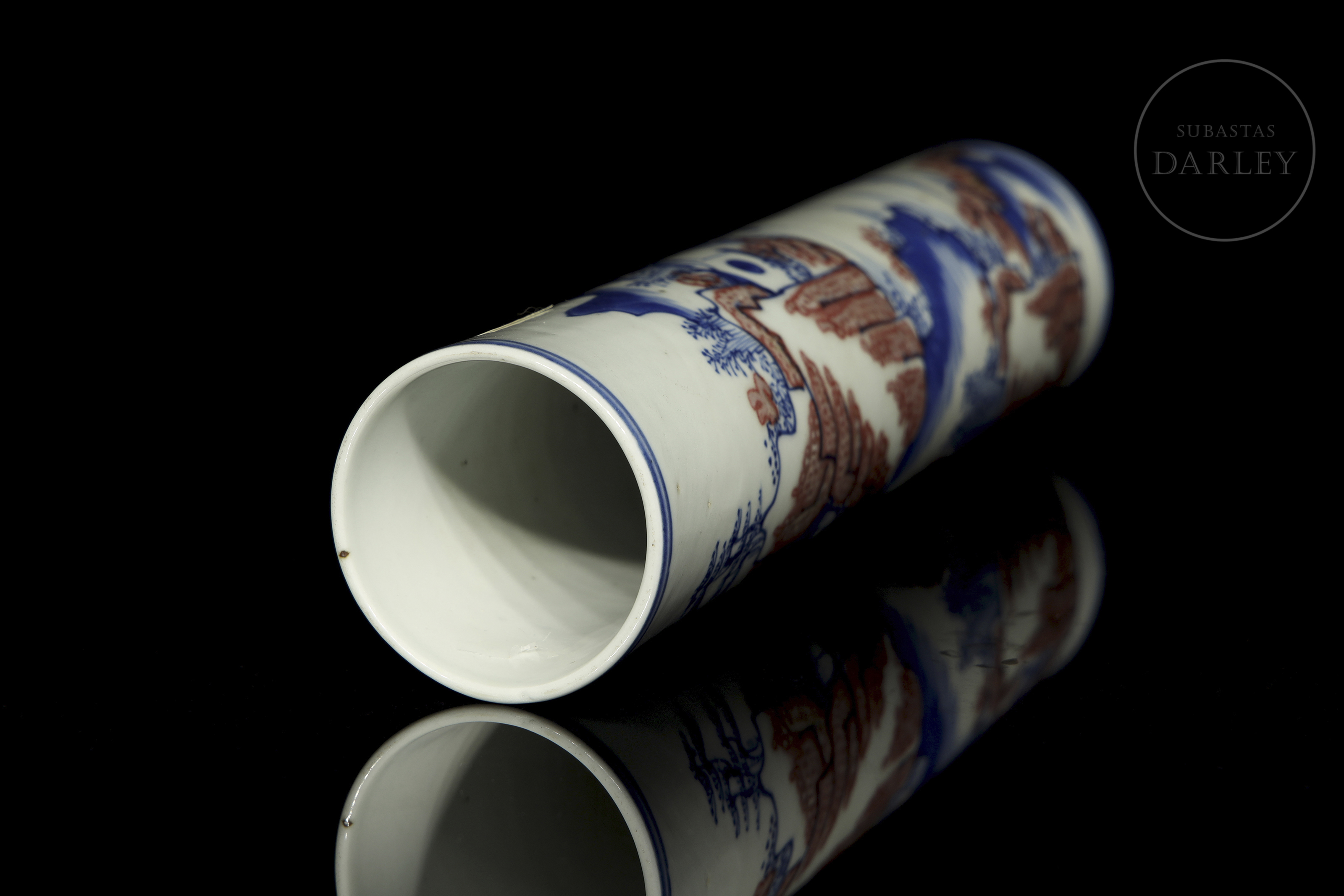Recipiente de porcelana modelada, de forma cilíndrica, adornado en el perímetro por una escena continua de un paisaje montañoso en azul cobalto y rojo hierro. Se observan formaciones rocosas, árboles, casas y un pequeño río, todo ello enmarcado por dos dobles líneas azules.