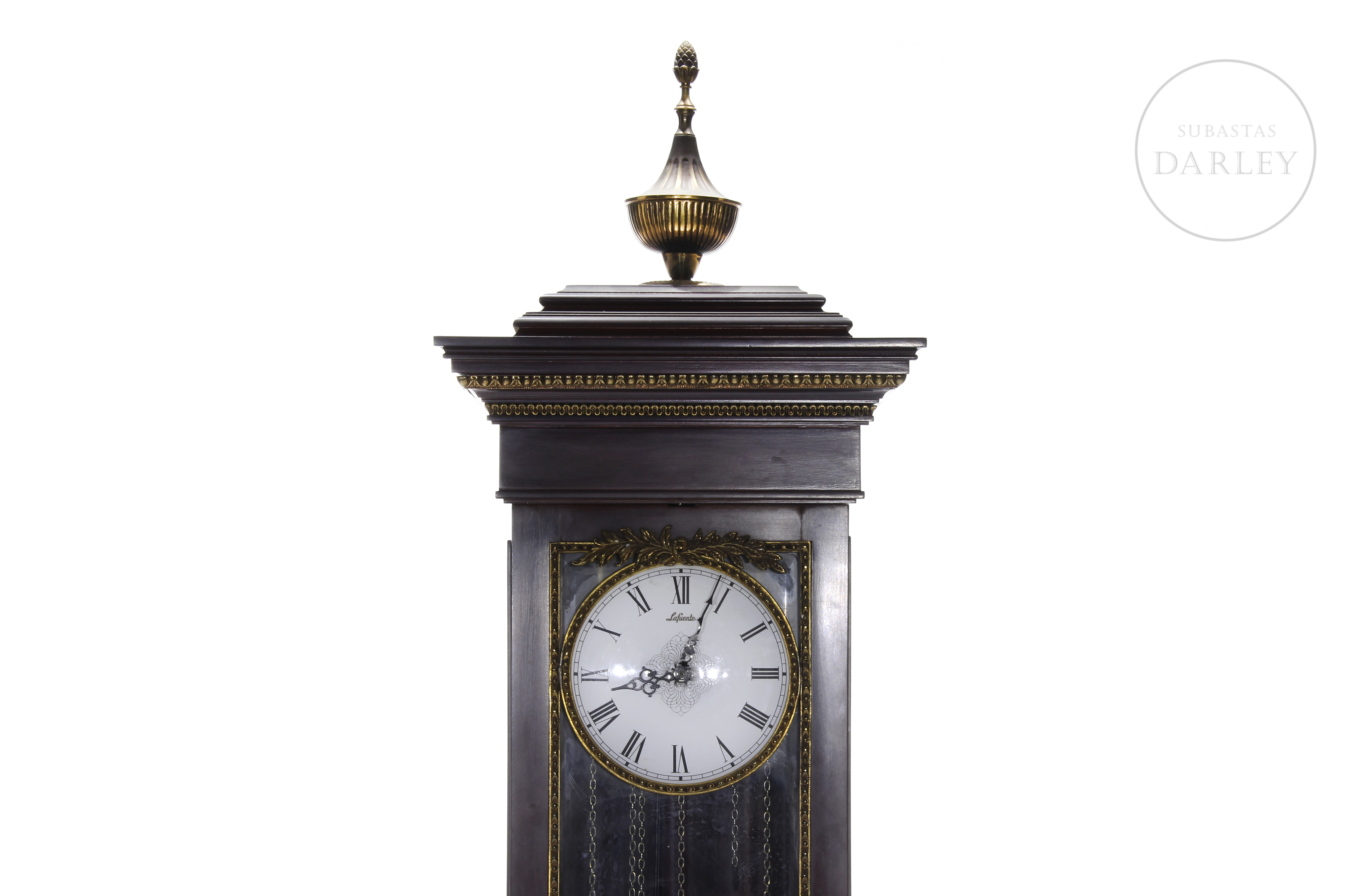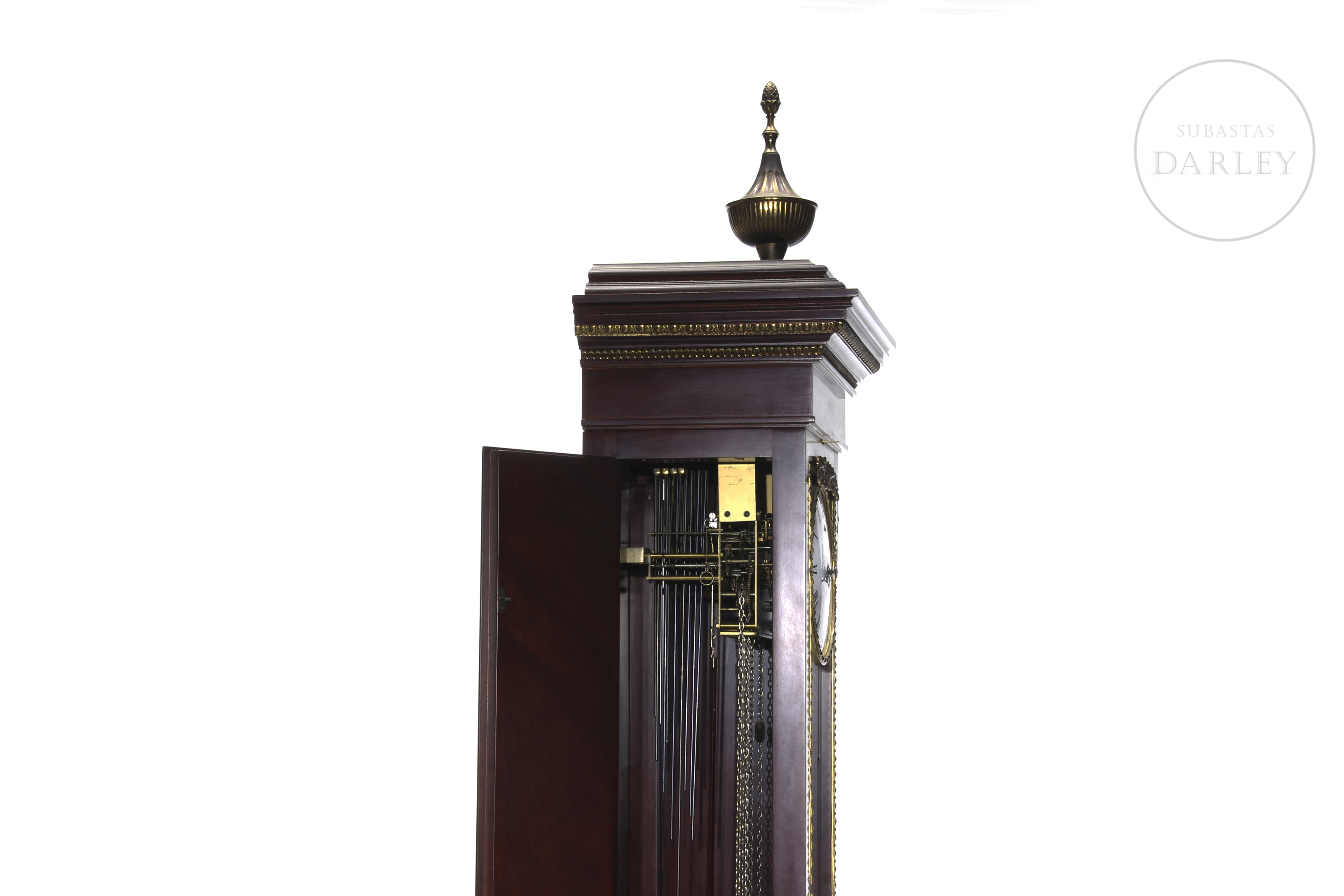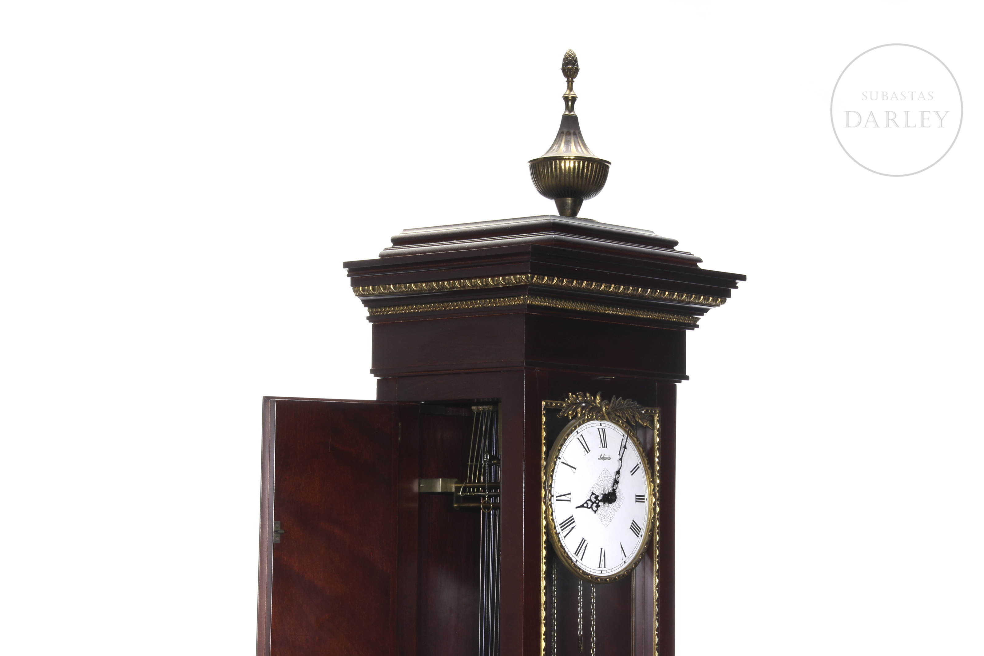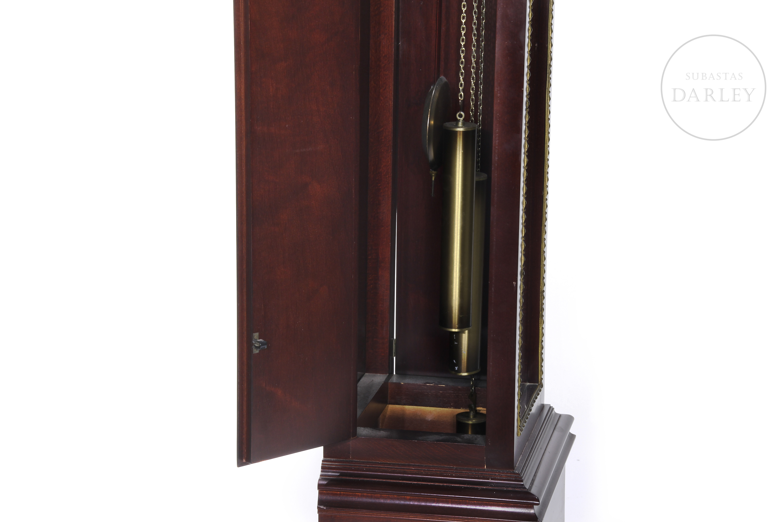 Reloj de cargas y péndulo con carillón. Caja realizada en madera chapeada. Esfera con numeración romana.