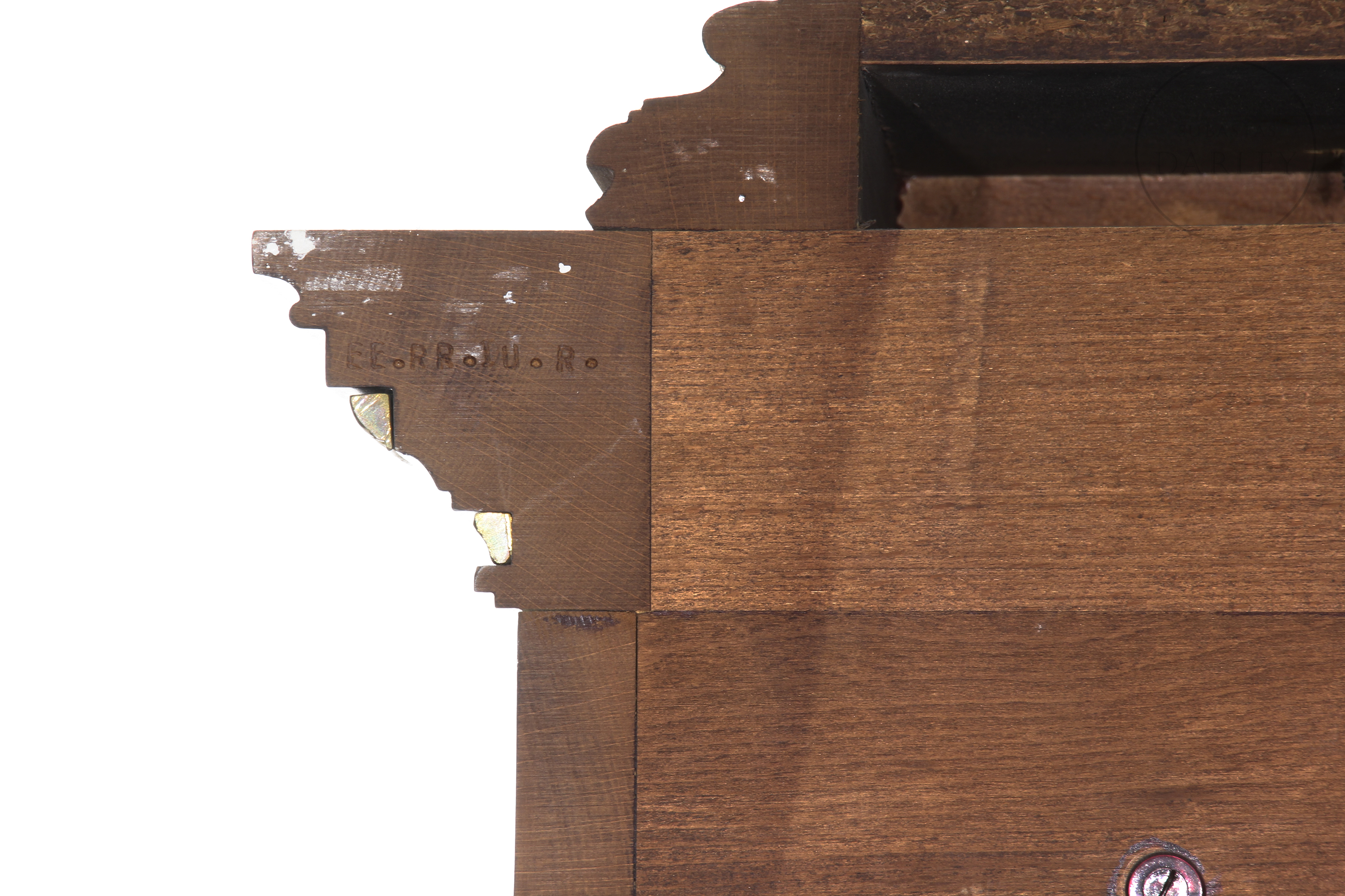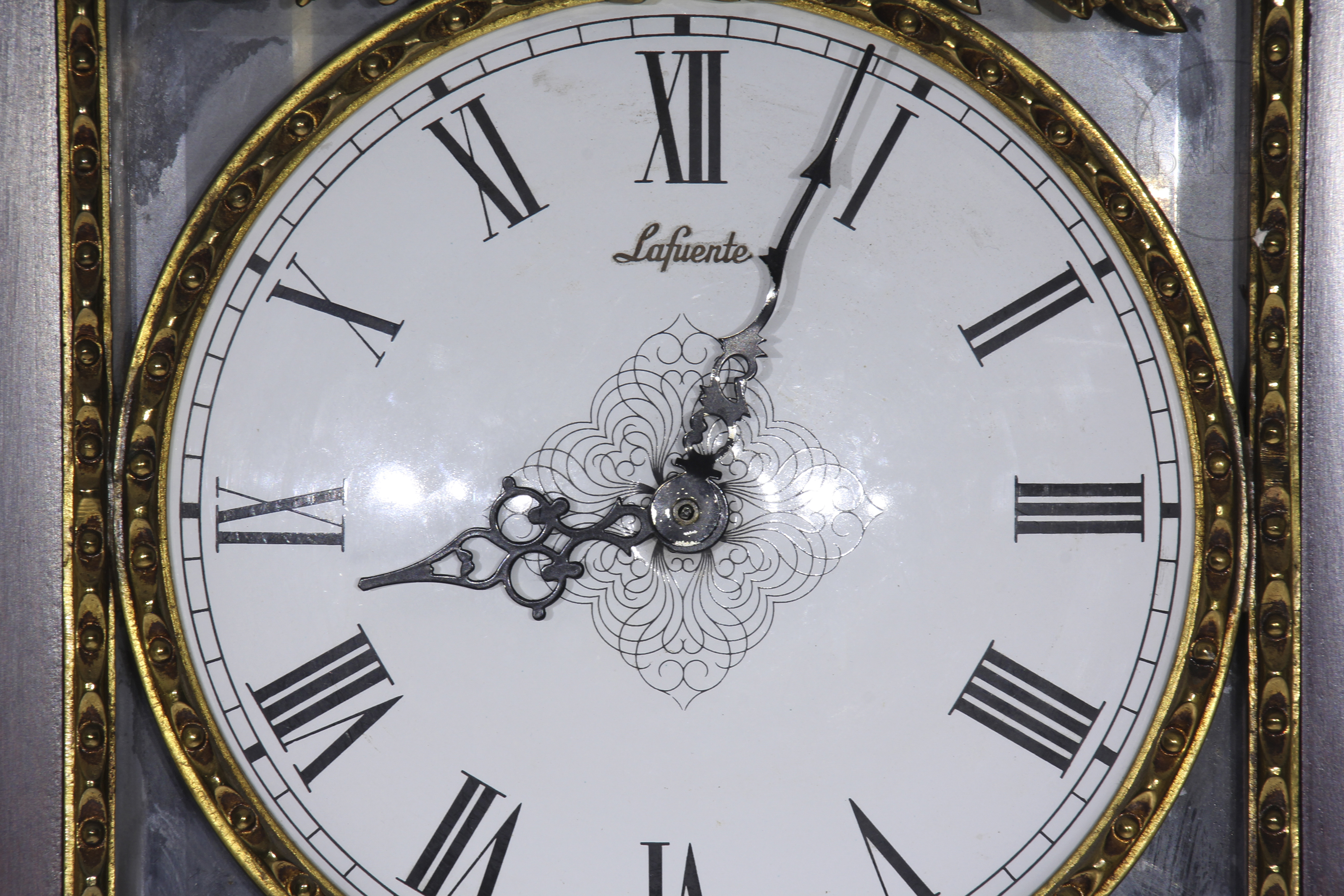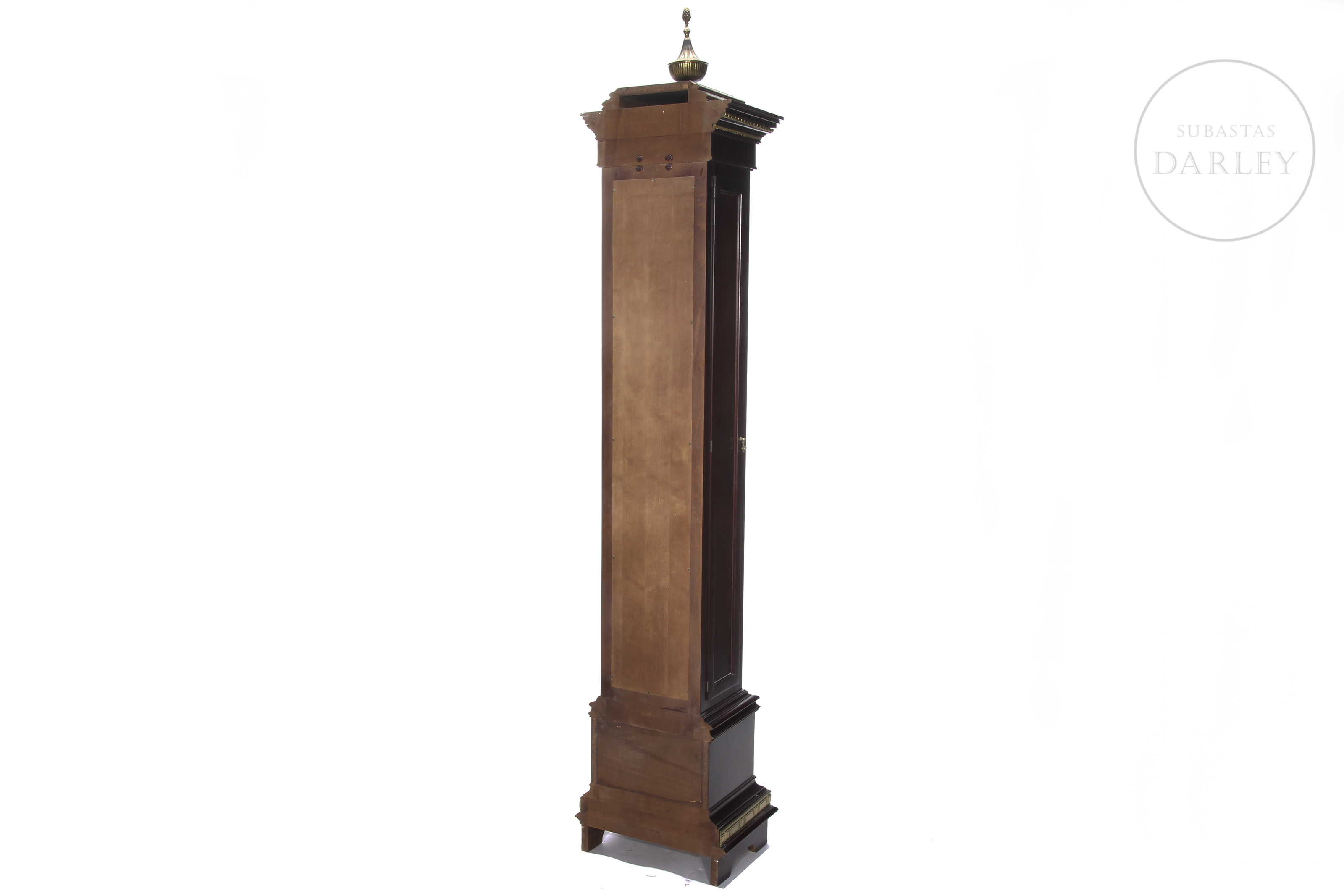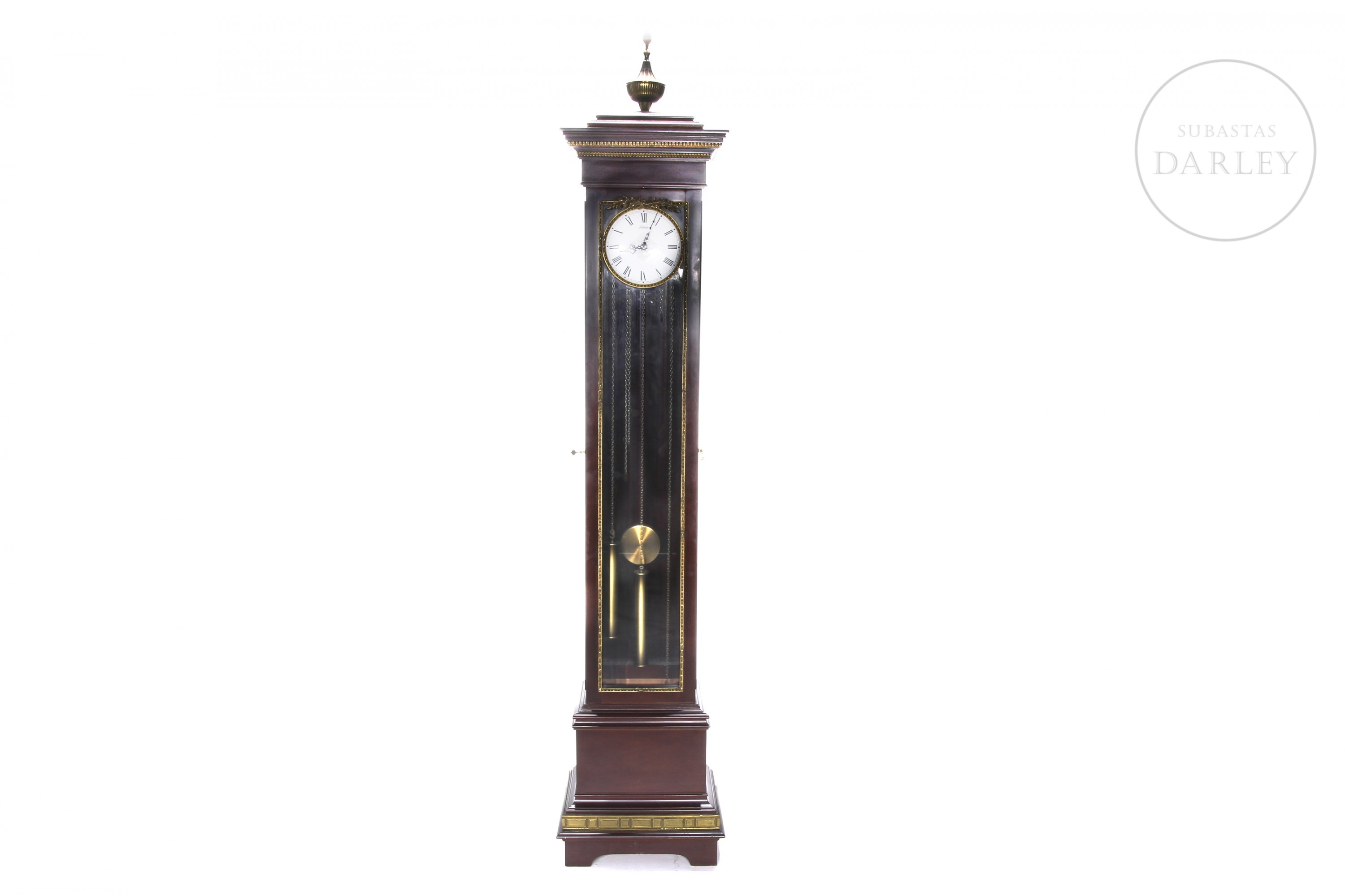 Reloj de cargas y péndulo con carillón. Caja realizada en madera chapeada. Esfera con numeración romana.