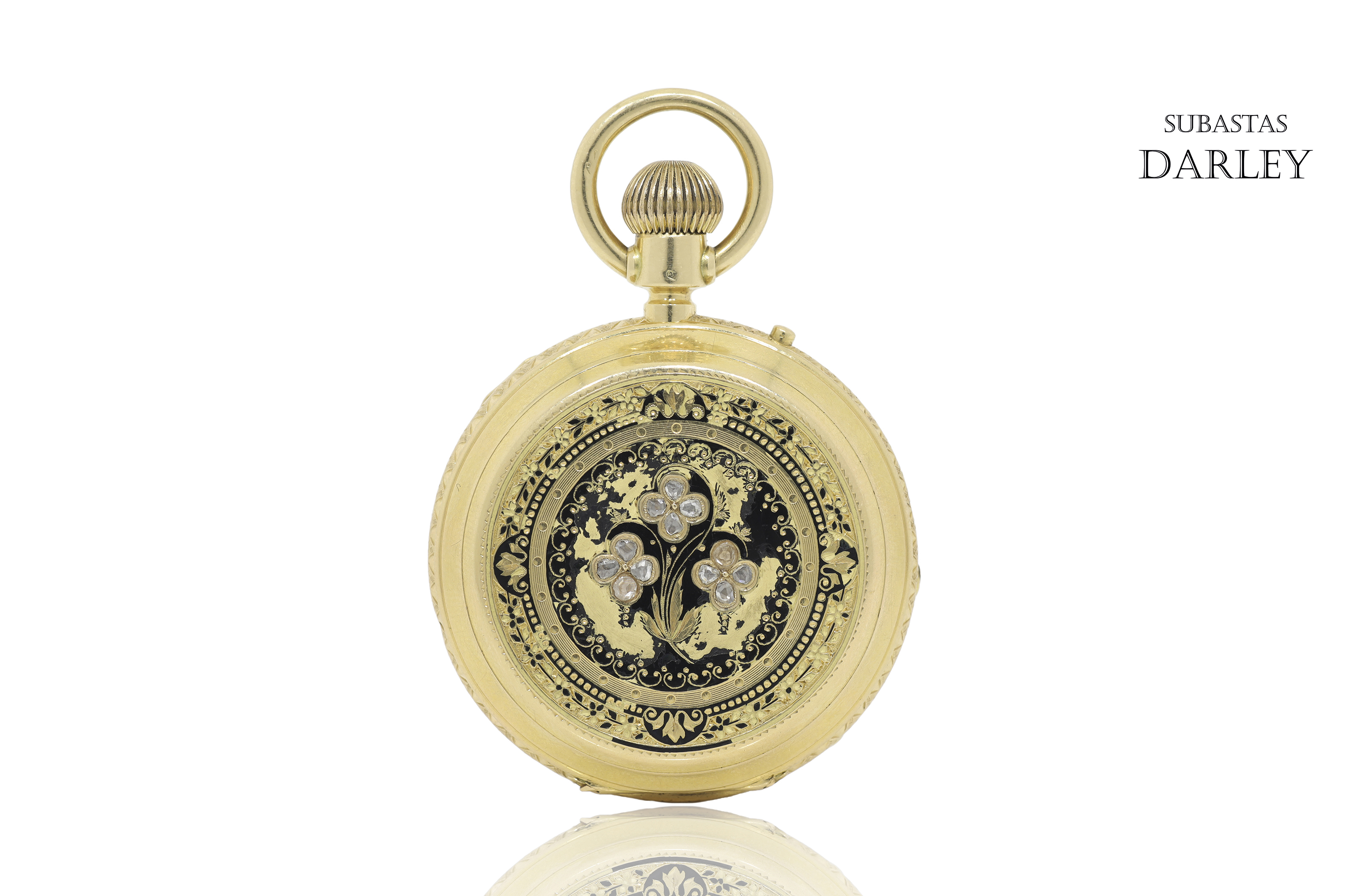 Reloj saboneta suizo marca "Montandon Fréres" con caja de oro amarillo de 18 k y mecanismo de cuerda "remontoire". Tapa exterior decorada con esmalte y 12 diamantes. En el reverso tiene un emblema grabado y muestra más detalles grabados en el lateral. Al abrir el reloj hay una esfera ginebrina con numeración romana, segundero a las seis y agujas tipo pera. En estado de marcha.