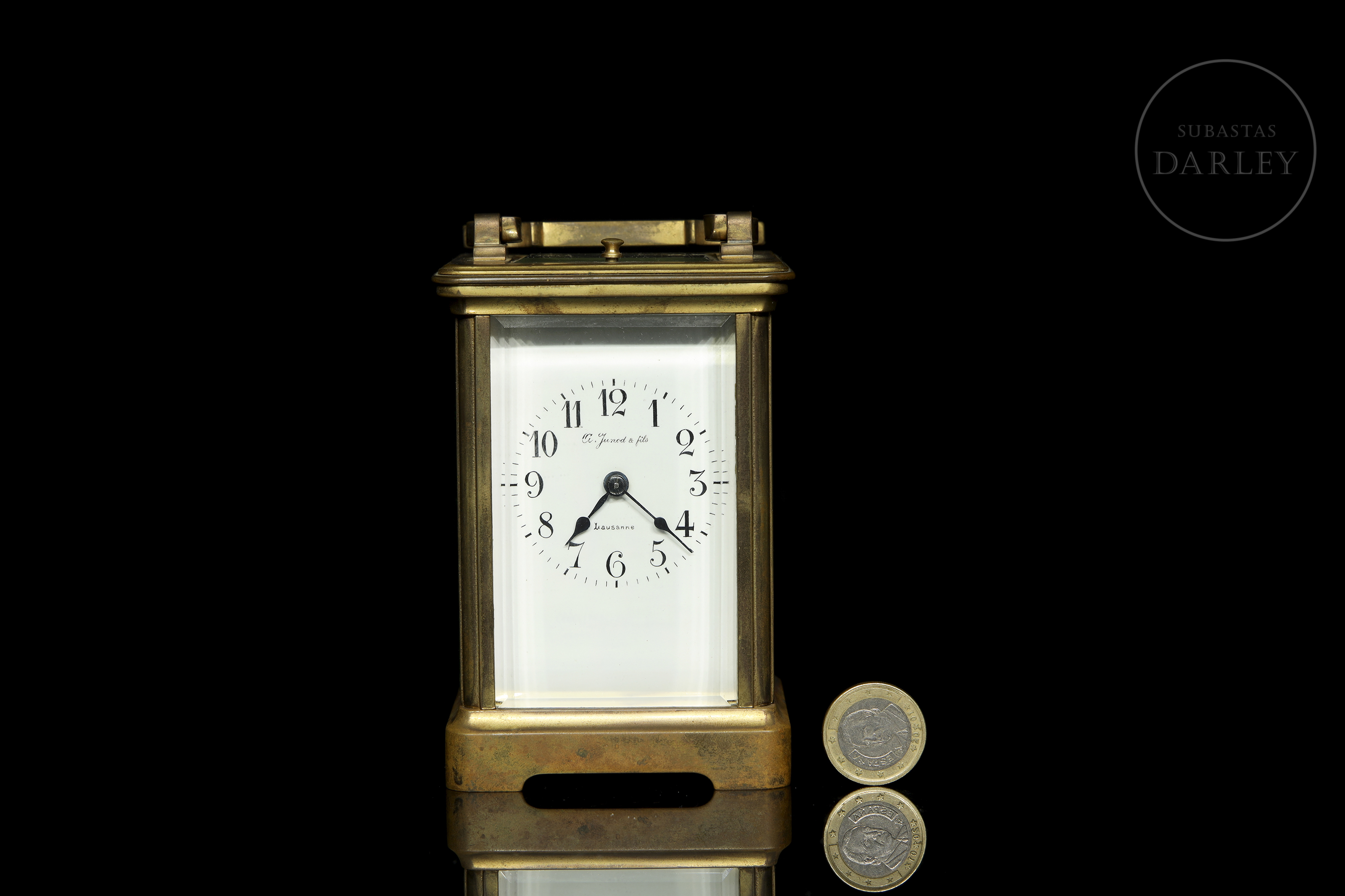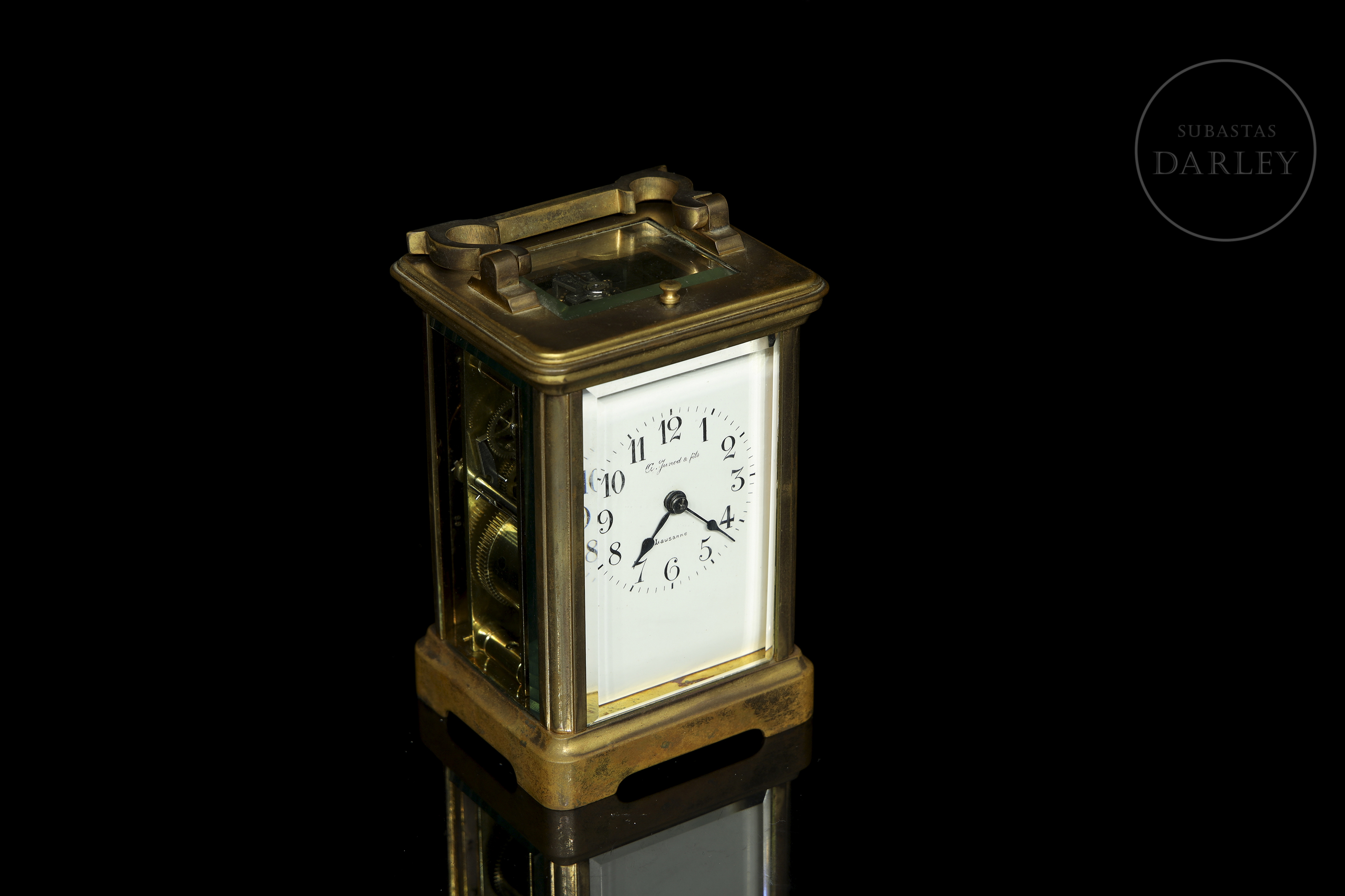 El reloj de viaje mostrado es de la reconocida casa relojeraA. Junod & Fils , una empresa histórica de relojería de Lausanne, suiza. La firma, establecida originalmente como "Ami Junod Pattus, Fabricant d'Horlogerie", abrió su taller en Sainte-Croix, Suiza, y más tarde una tienda en Lausana bajo el nombre de "A. Junod et fils" en 1889. Con llave.