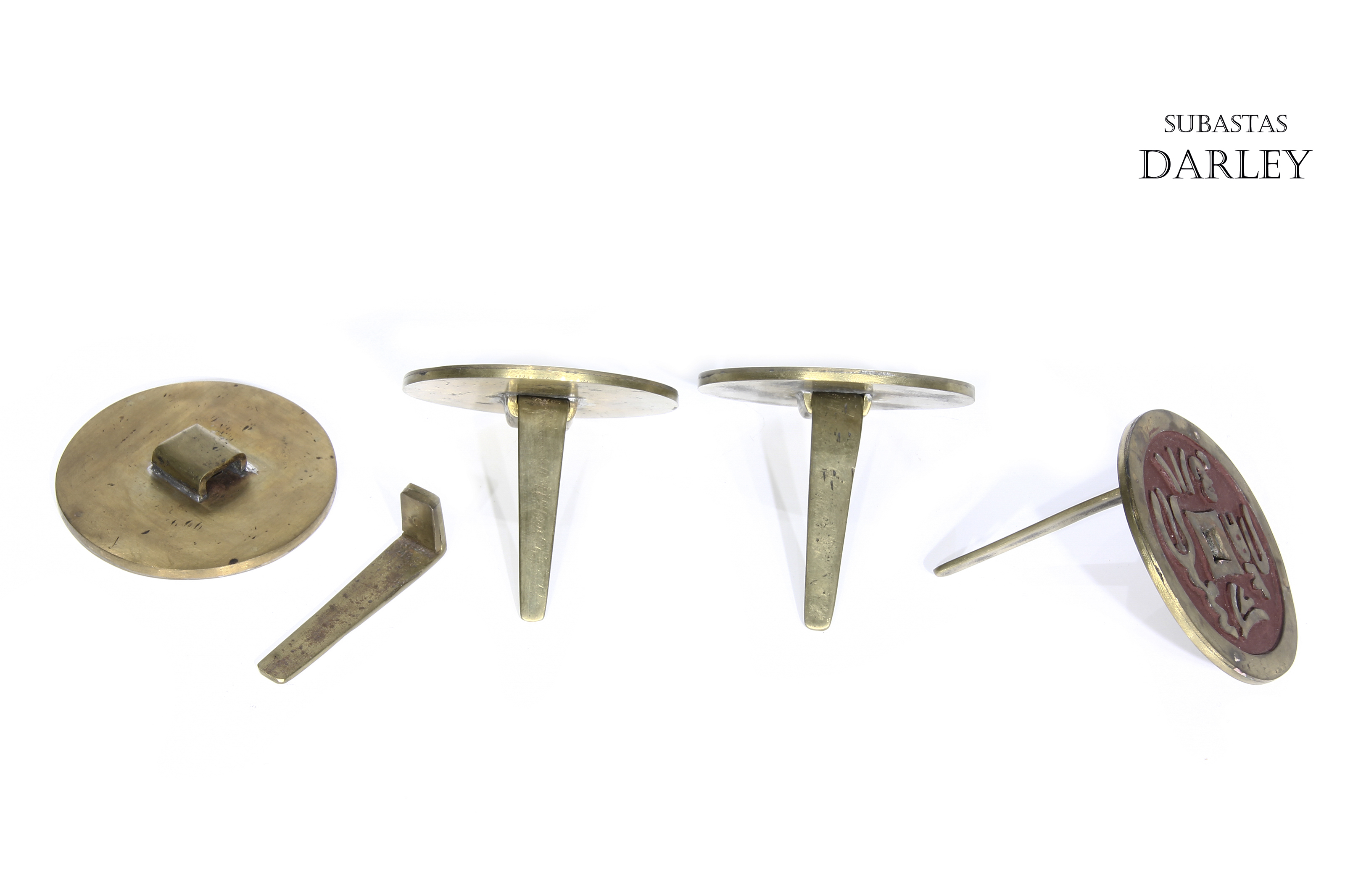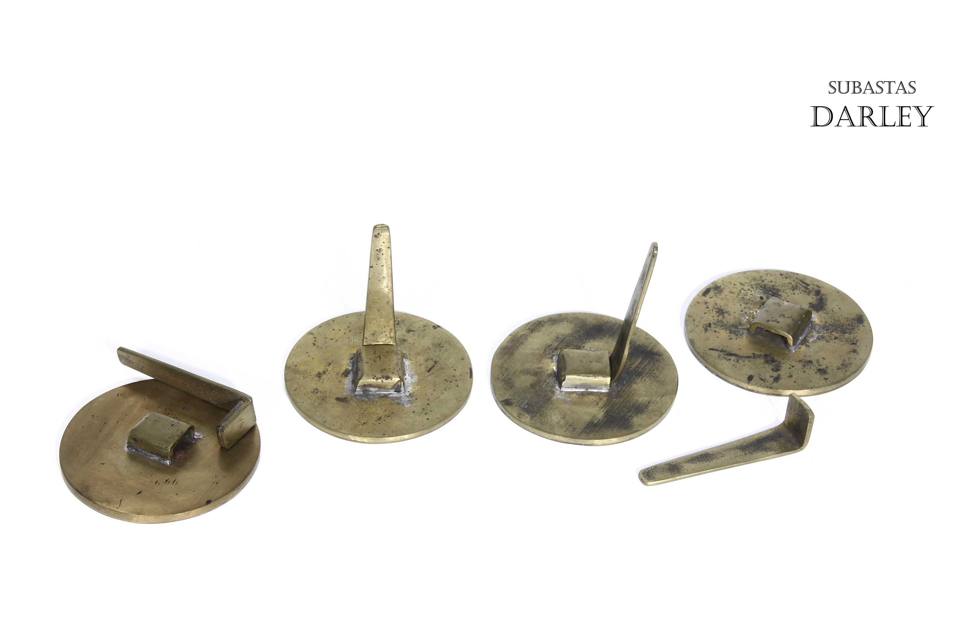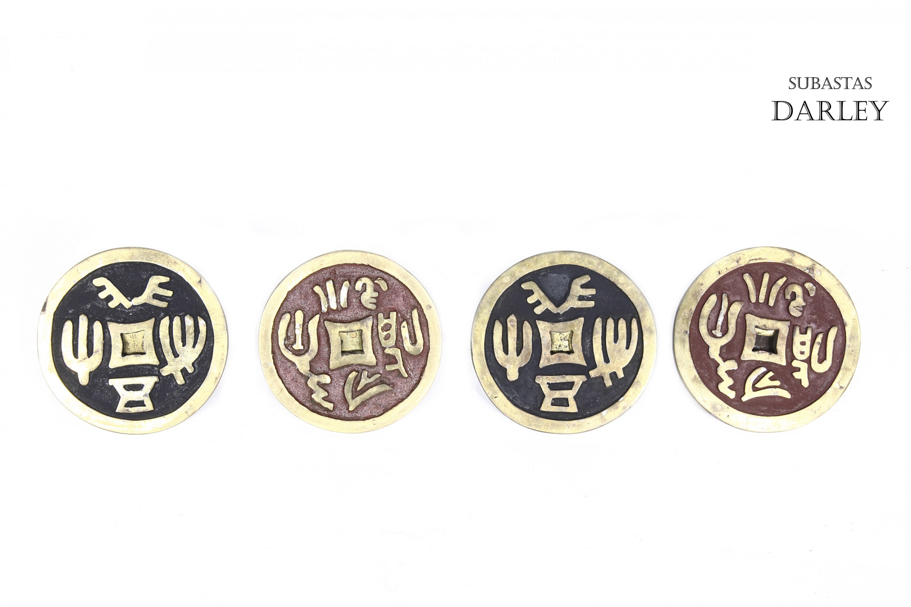 Cuatro monedas chinas decorativas con caracteres arcaicos realizadas en bronce. Policromadas en el interior en negro o rojo. En la parte trasera presentan un tipo de enganche.